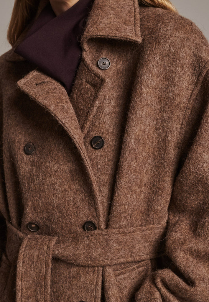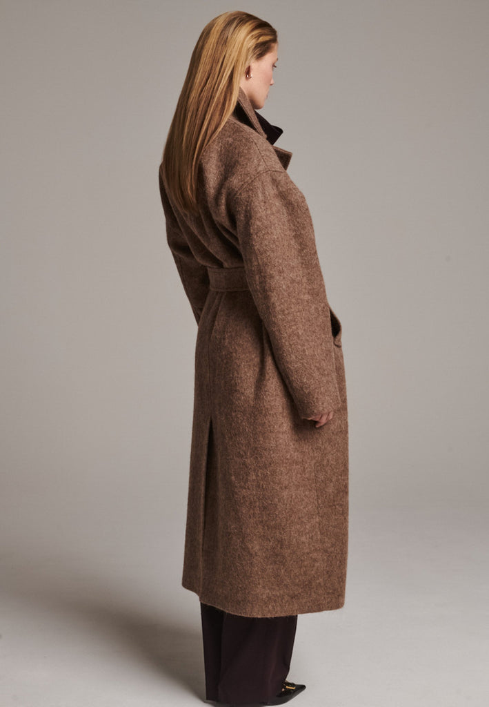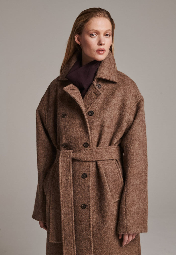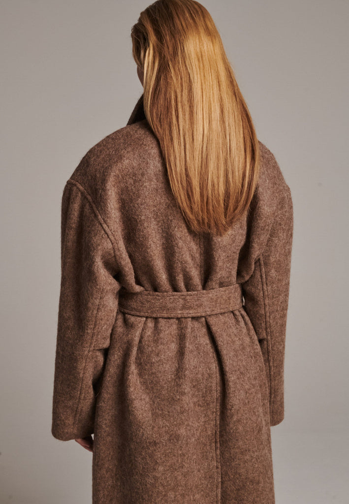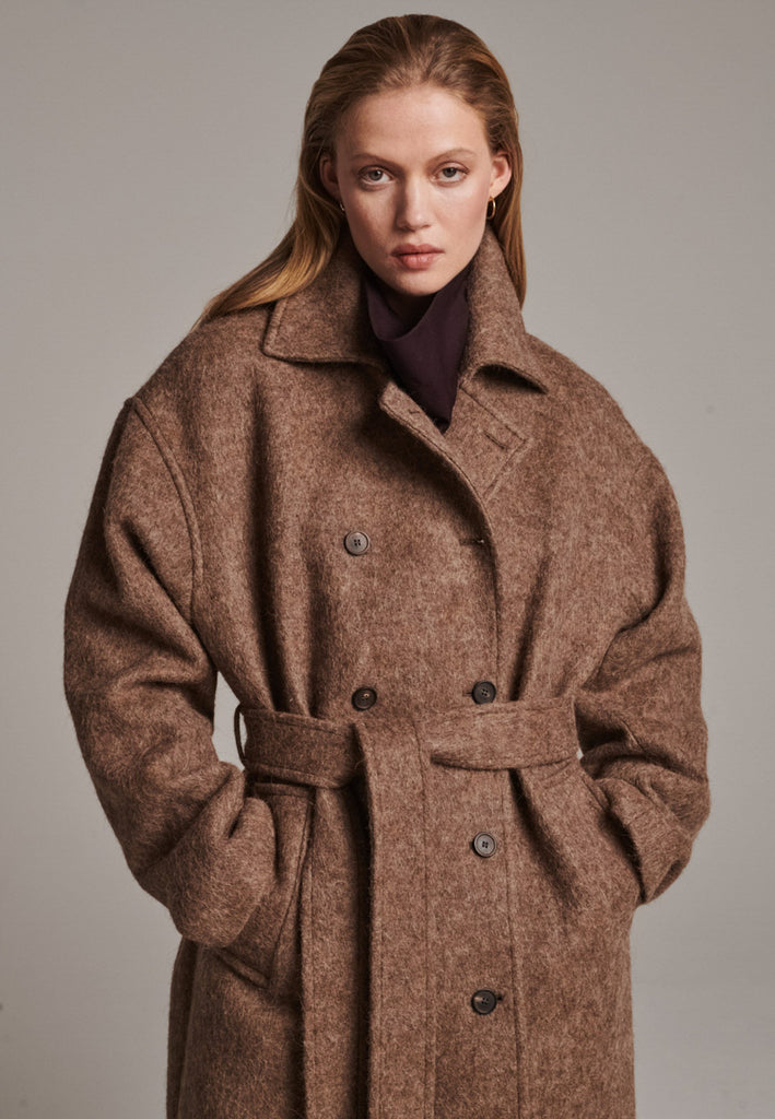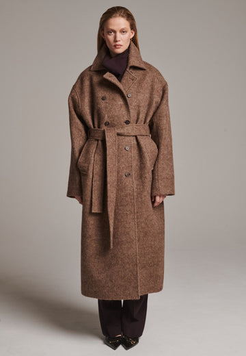 Oversized double-breasted coat in a cocooning silhouette. Crafted from soft brushed wool in camel, it features a sculptural high collar, dropped shoulders, and a double-breasted front. Cinched with a wide self-tie belt for structure and shape. Finished with tonal buttons and deep welt pockets. A bold yet timeless layer designed for effortless winter elegance.