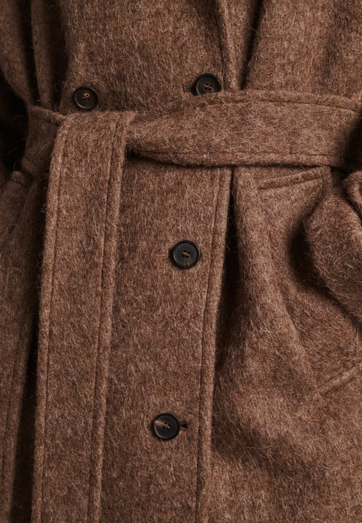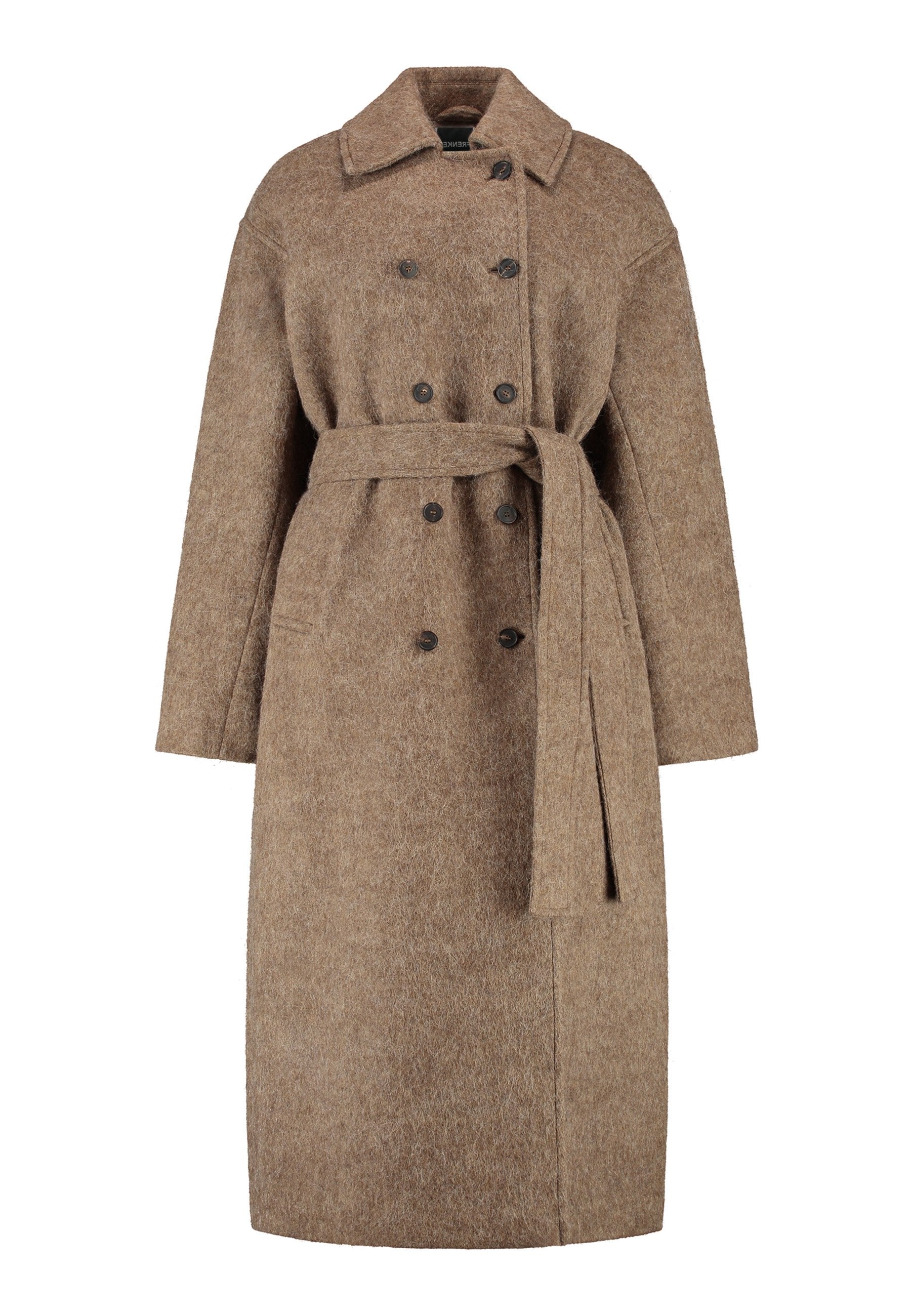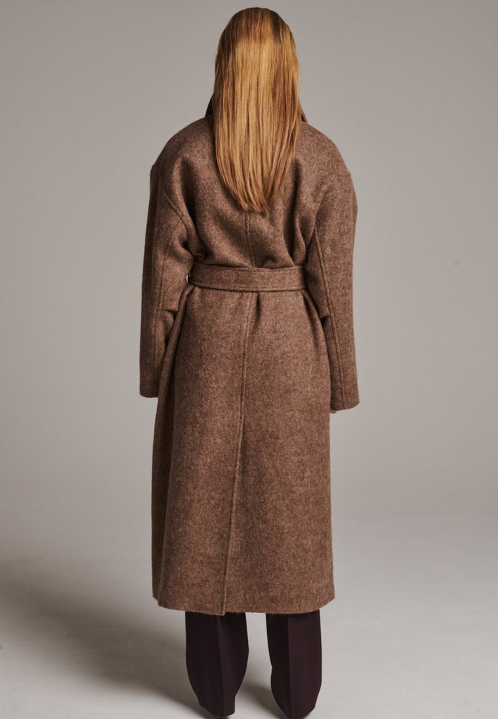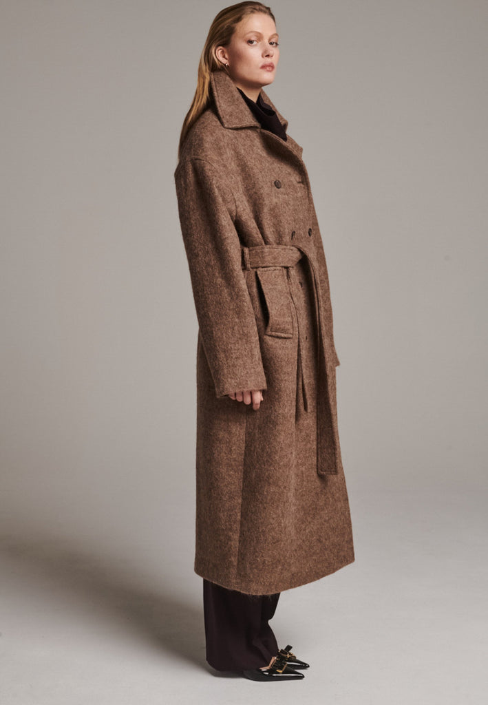 Oversized double-breasted coat in a cocooning silhouette. Crafted from soft brushed wool in camel, it features a sculptural high collar, dropped shoulders, and a double-breasted front. Cinched with a wide self-tie belt for structure and shape. Finished with tonal buttons and deep welt pockets. A bold yet timeless layer designed for effortless winter elegance.