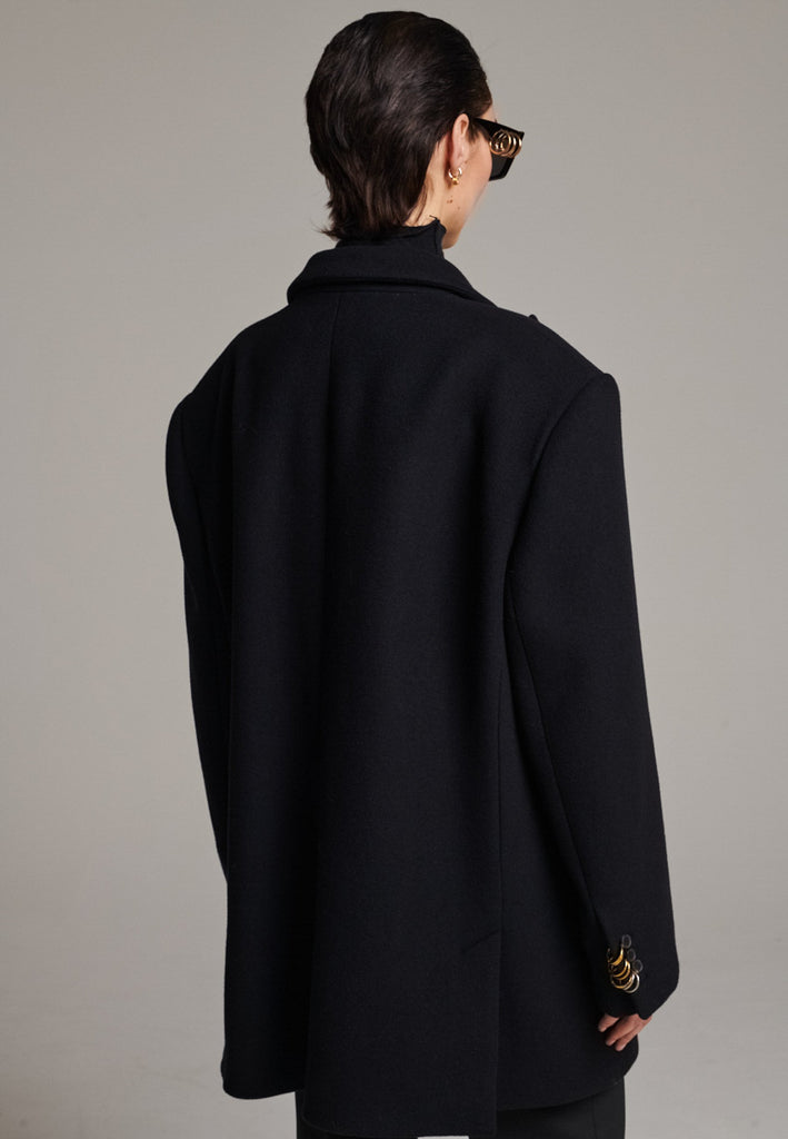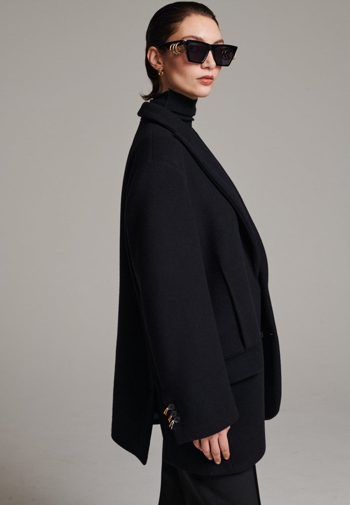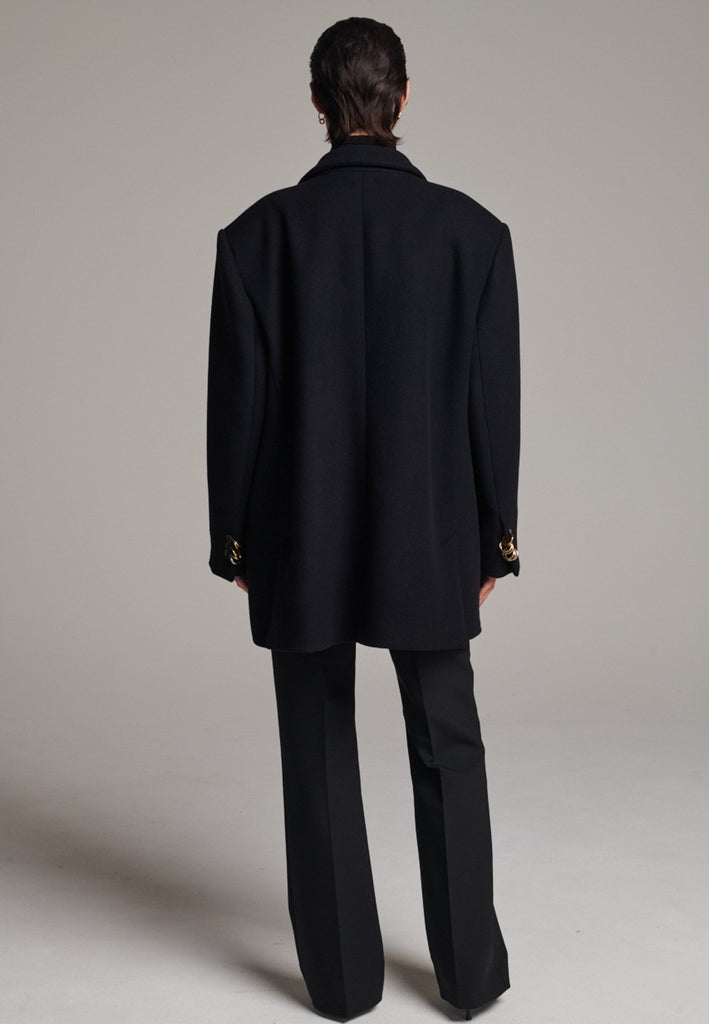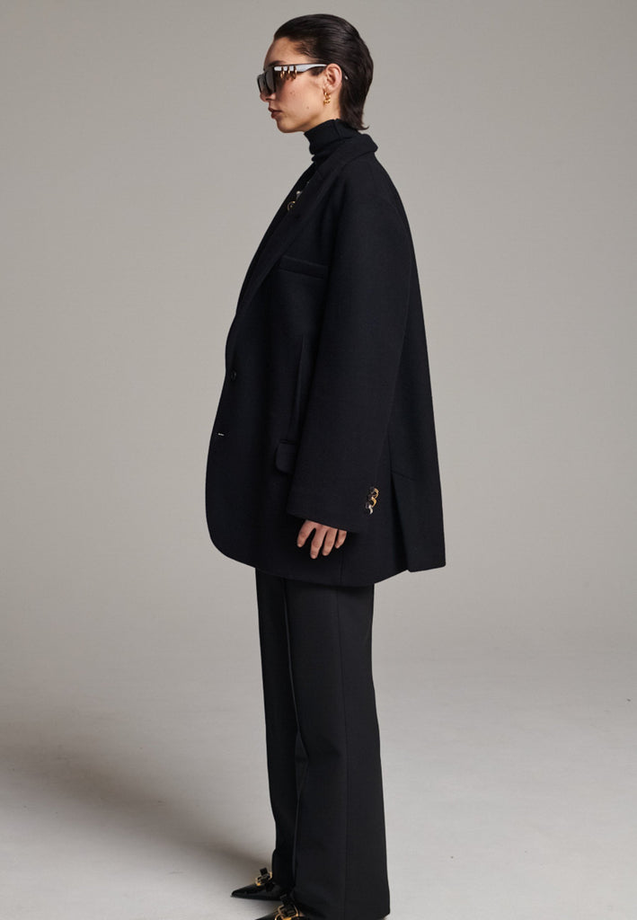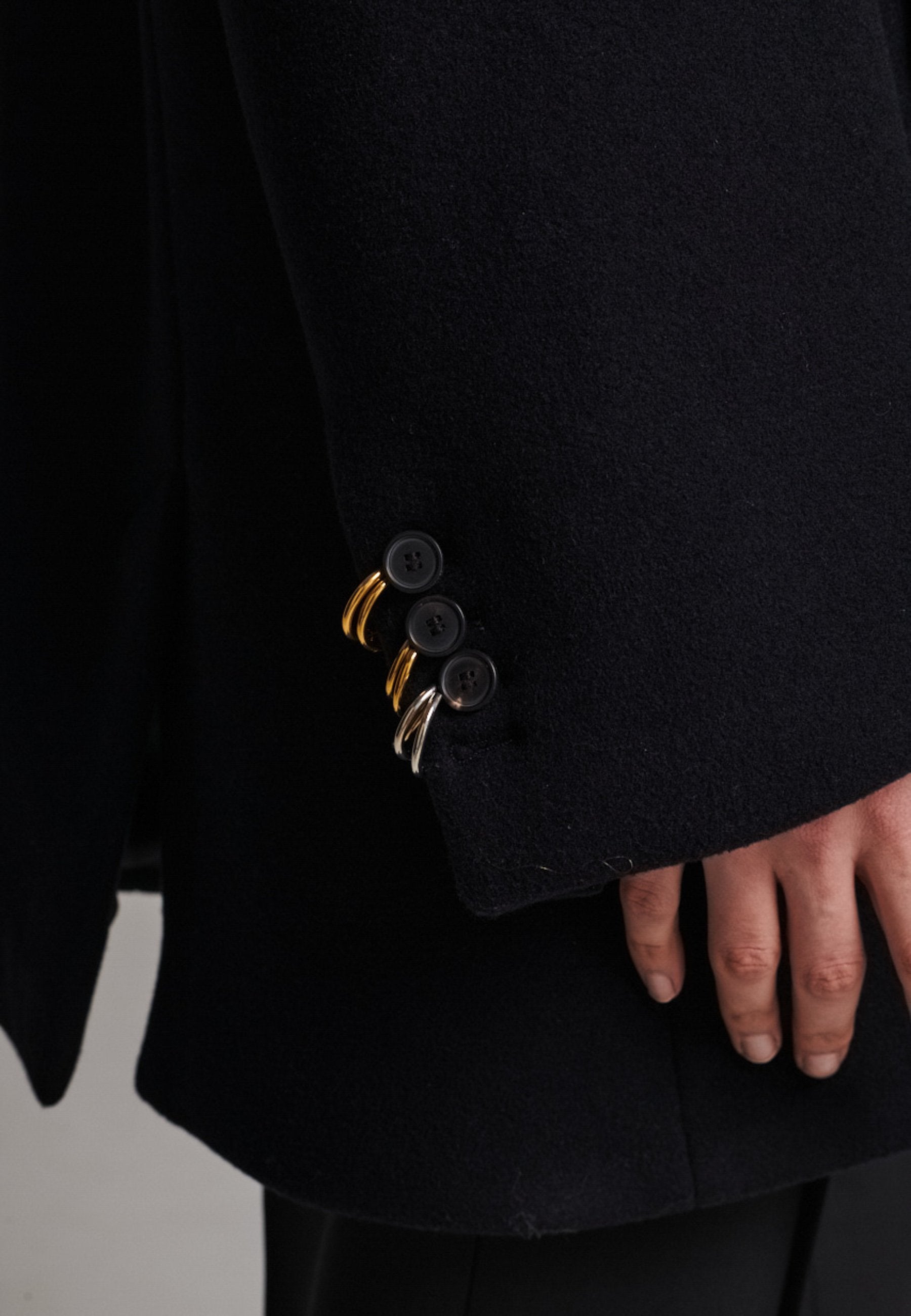 Oversized blazer coat in dense black felted wool, cut with a relaxed silhouette and strong tailoring lines. Features sharp notched lapels, single-breasted front, and discreet welt pockets. At the cuff, traditional buttons are reimagined, sharing their opening with silver and gold rings that catch the light. A balance of structure and softness, classic form and unexpected detail.