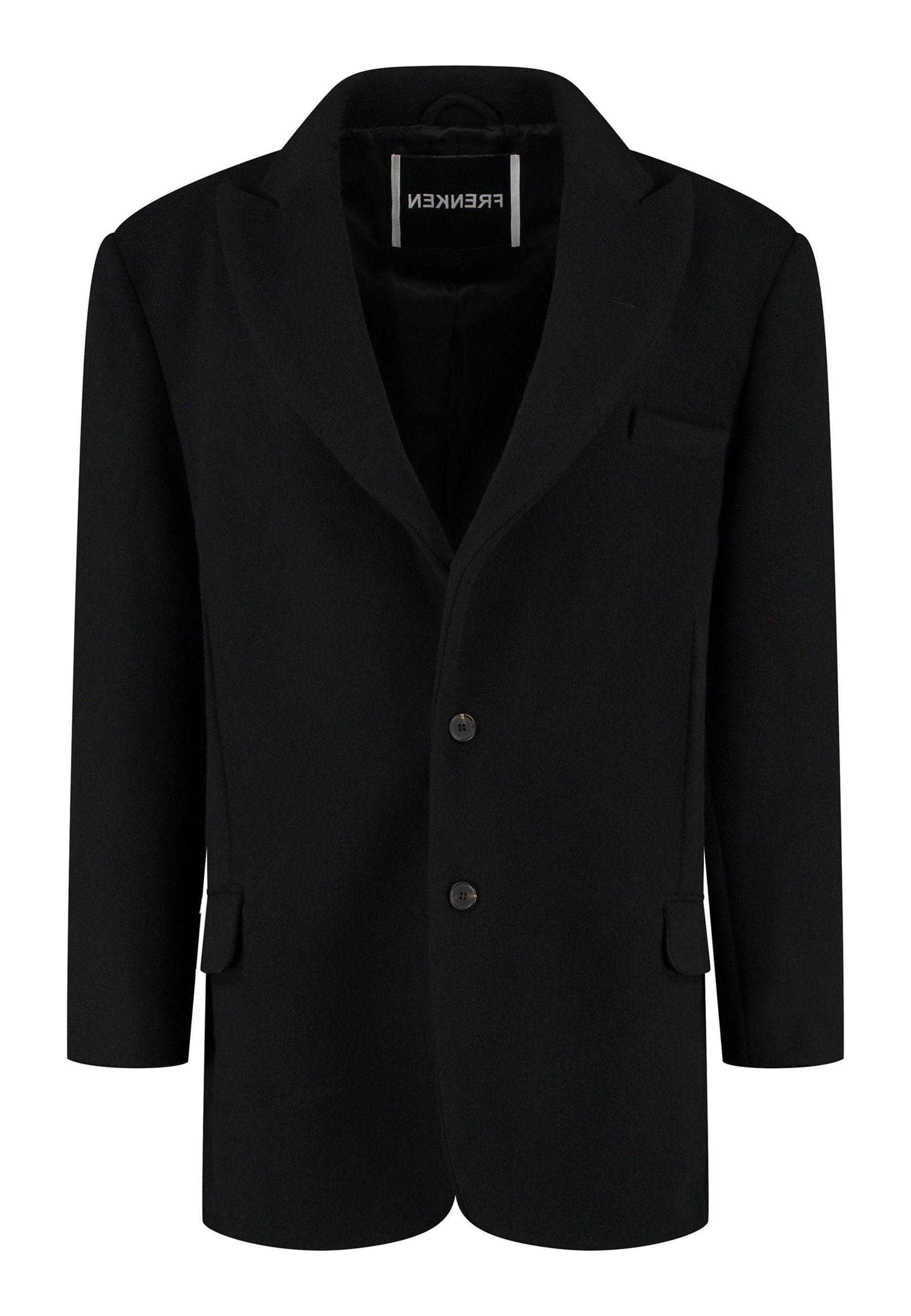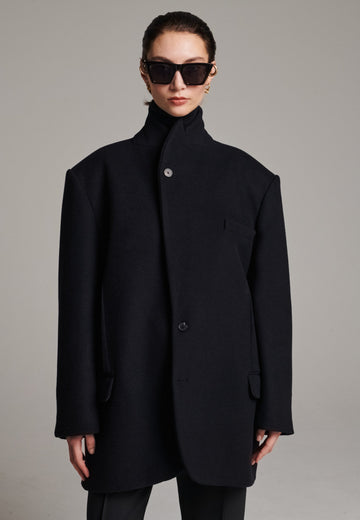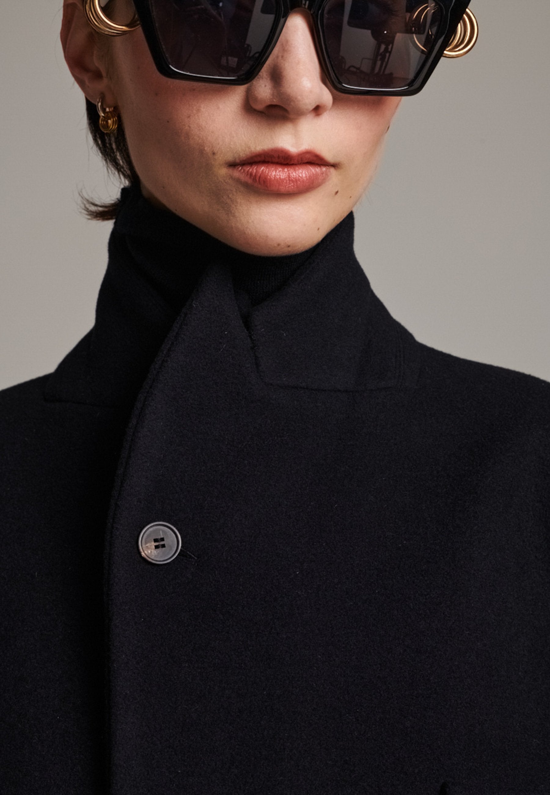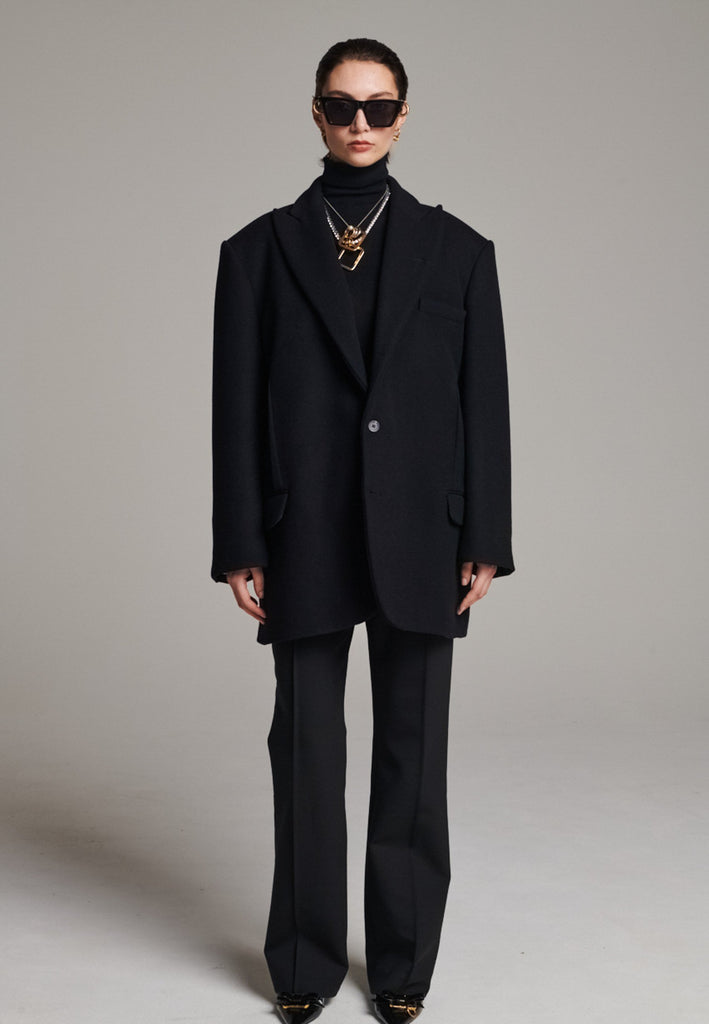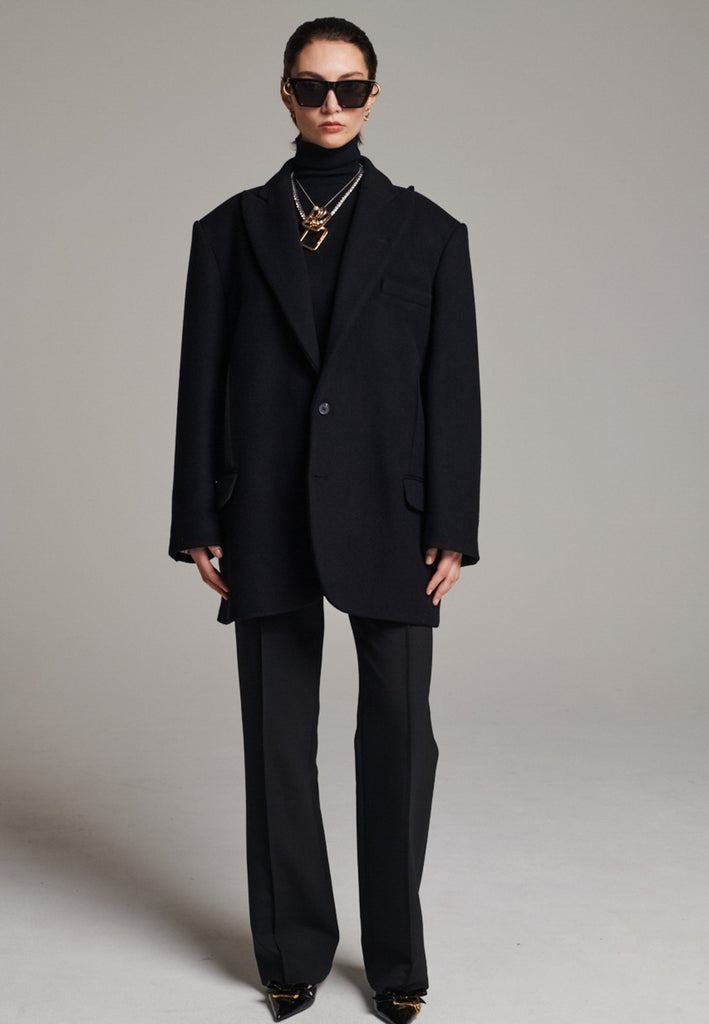 Oversized blazer coat in dense black felted wool, cut with a relaxed silhouette and strong tailoring lines. Features sharp notched lapels, single-breasted front, and discreet welt pockets. At the cuff, traditional buttons are reimagined, sharing their opening with silver and gold rings that catch the light. A balance of structure and softness, classic form and unexpected detail.
