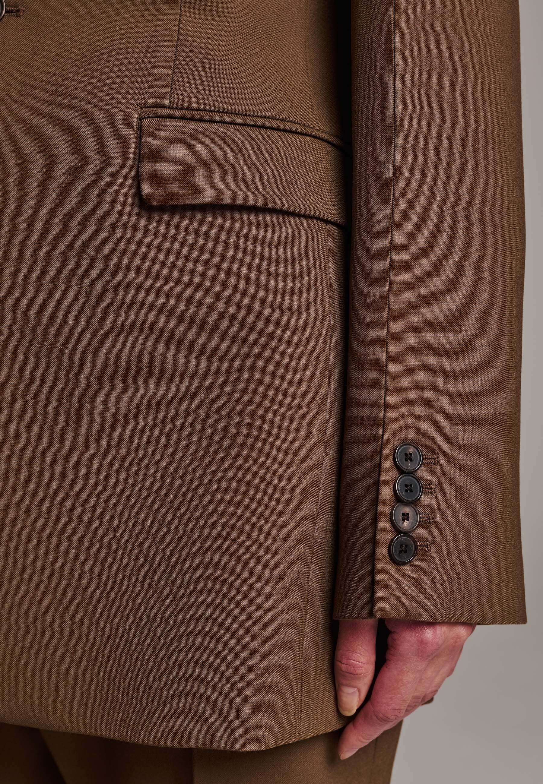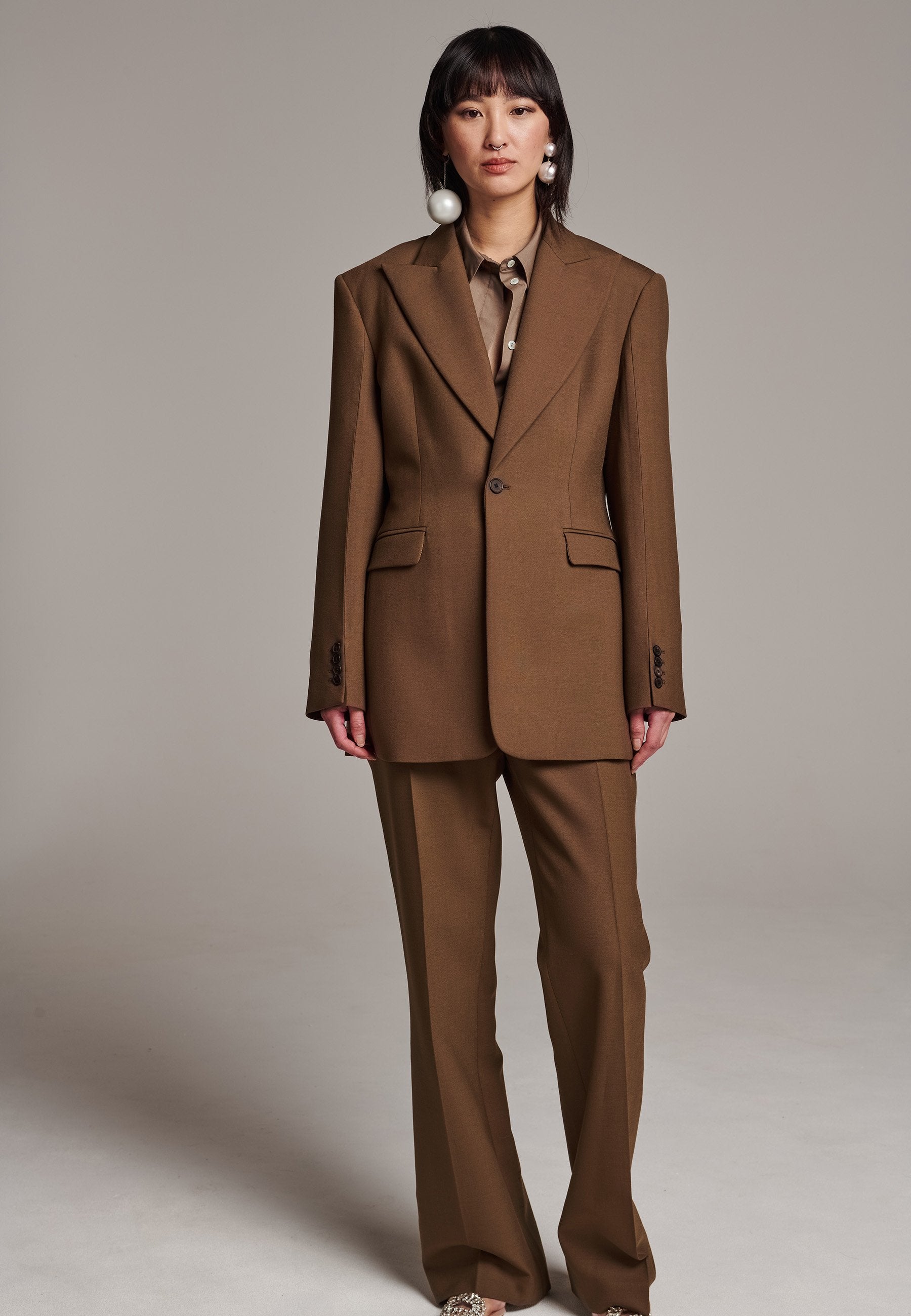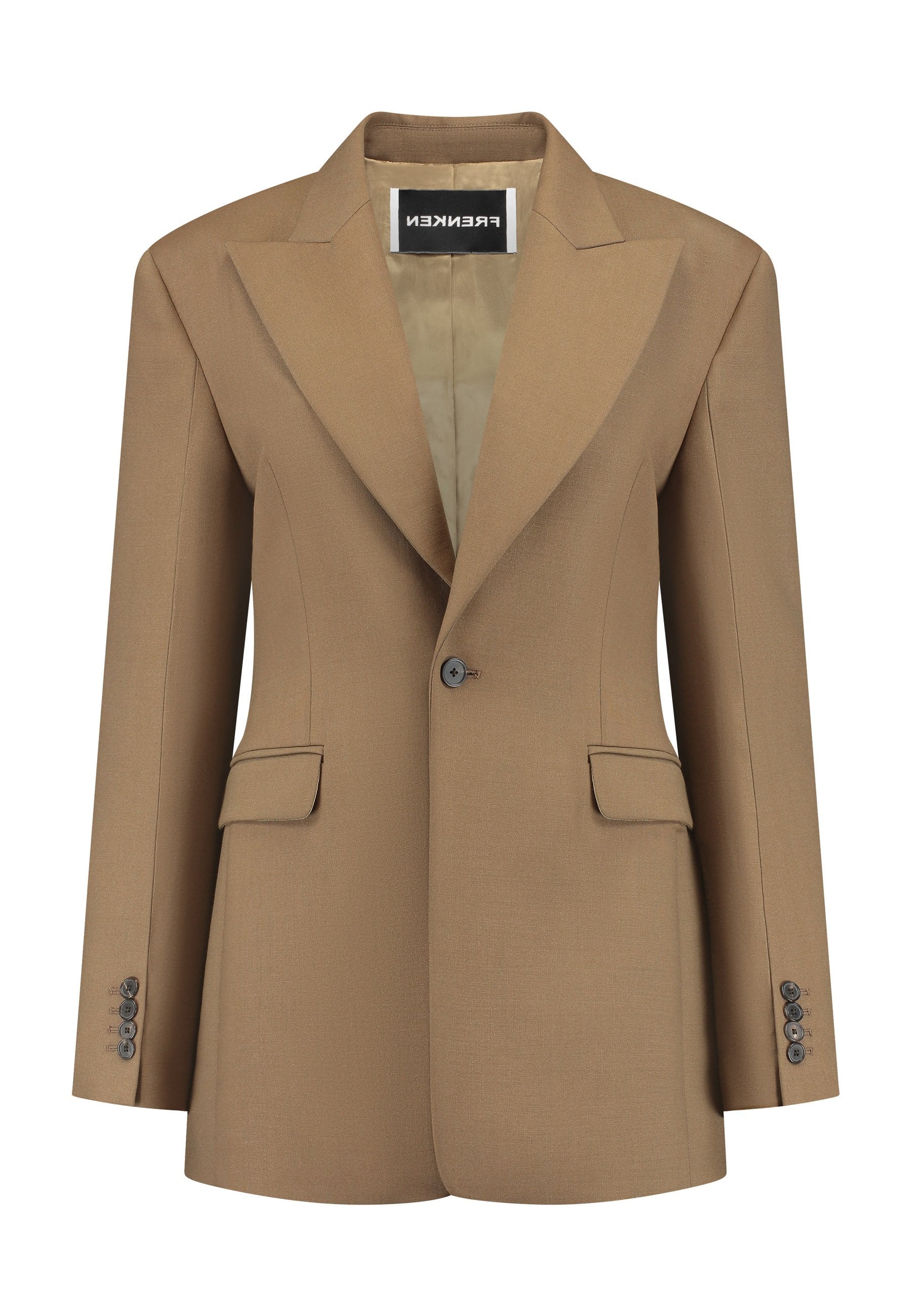 Experience flawless tailoring with this structured blazer, featuring sharp wide shoulders and a subtly cinched waist. Fully satin-lined for added luxury, it includes horn buttons and welt pockets with flaps, along with a back slit for ease of movement. Masterfully crafted in a versatile camel hue, this blazer seamlessly complements a range of colors, embodying precision and elegance.
