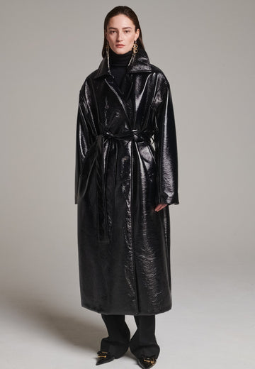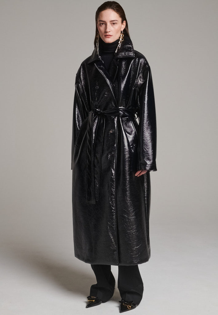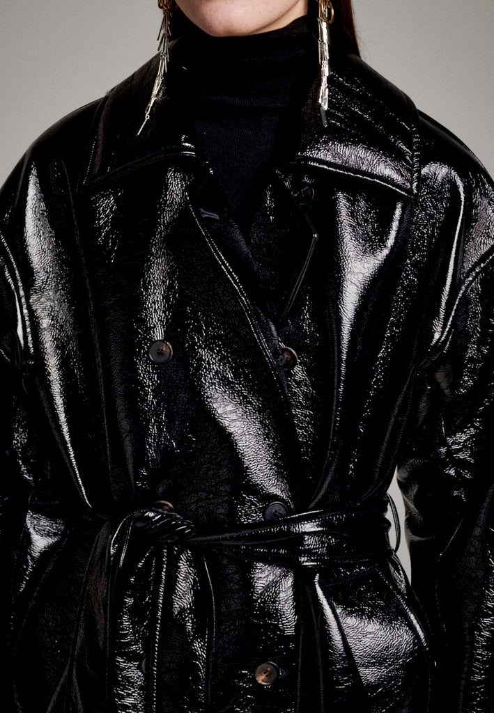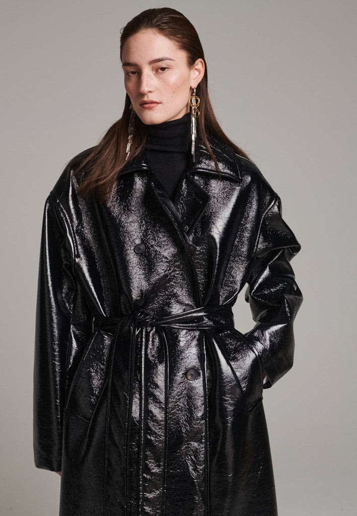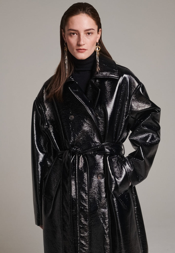 A modern take on the trench, this coat features a glossy, high-shine patent finish for a futuristic and bold look. It includes a double-breasted front, wide lapels, and a belt to accentuate the waist. Sleek and daring, it makes a powerful outerwear statement.