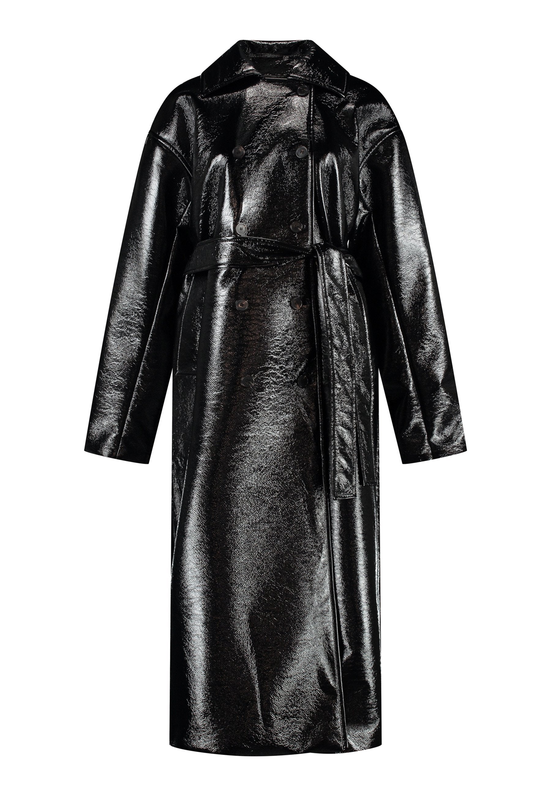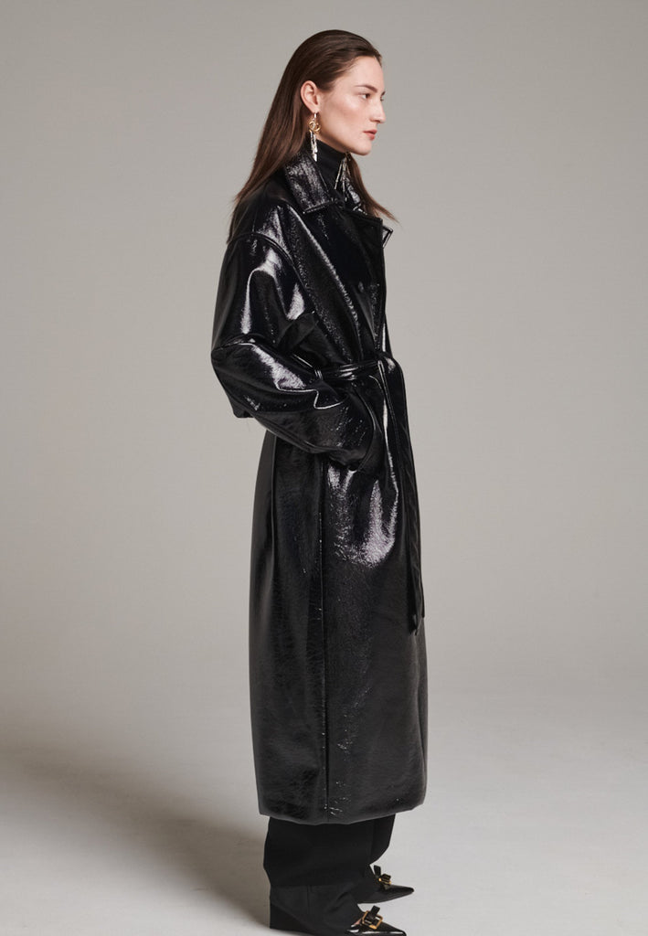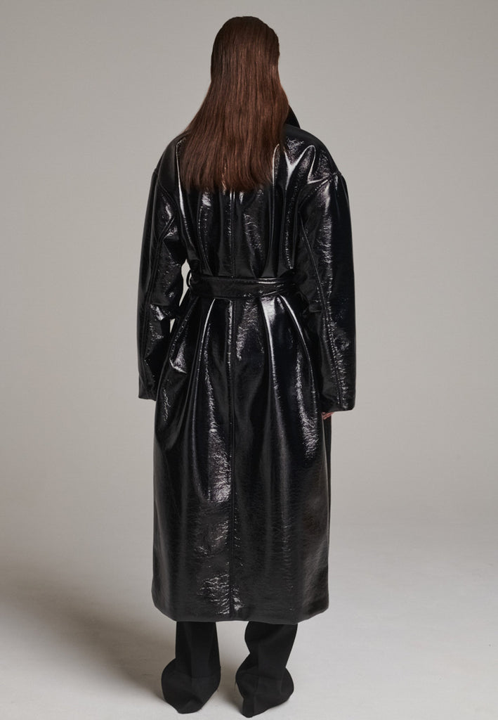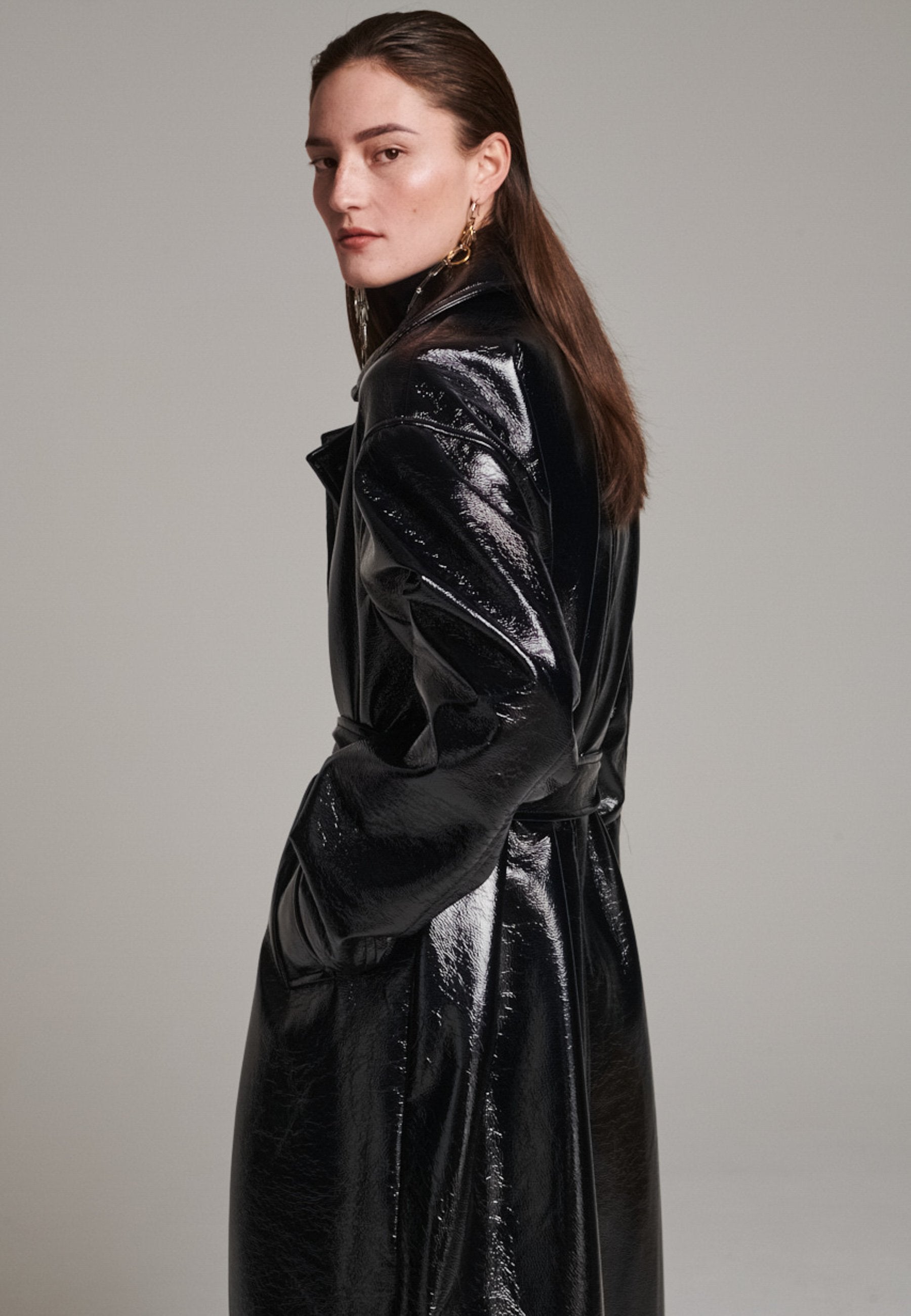 A modern take on the trench, this coat features a glossy, high-shine patent finish for a futuristic and bold look. It includes a double-breasted front, wide lapels, and a belt to accentuate the waist. Sleek and daring, it makes a powerful outerwear statement.
