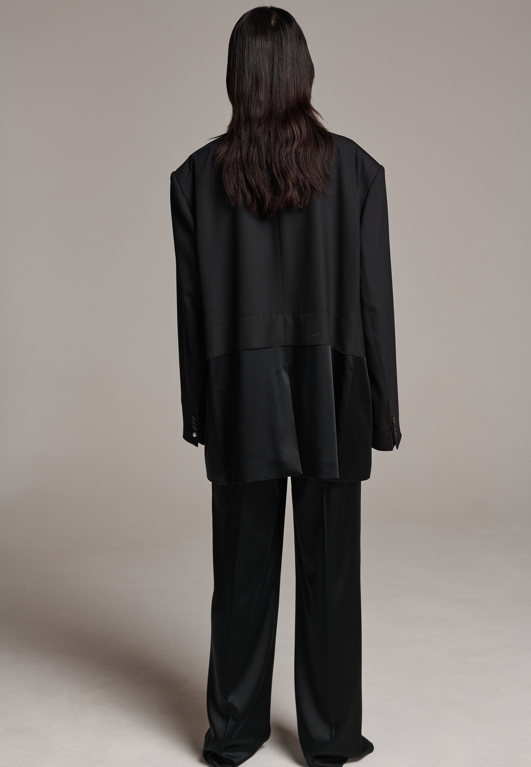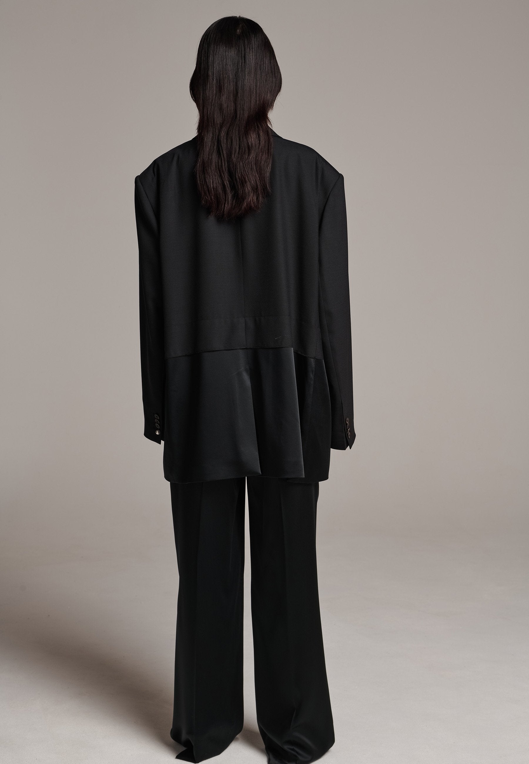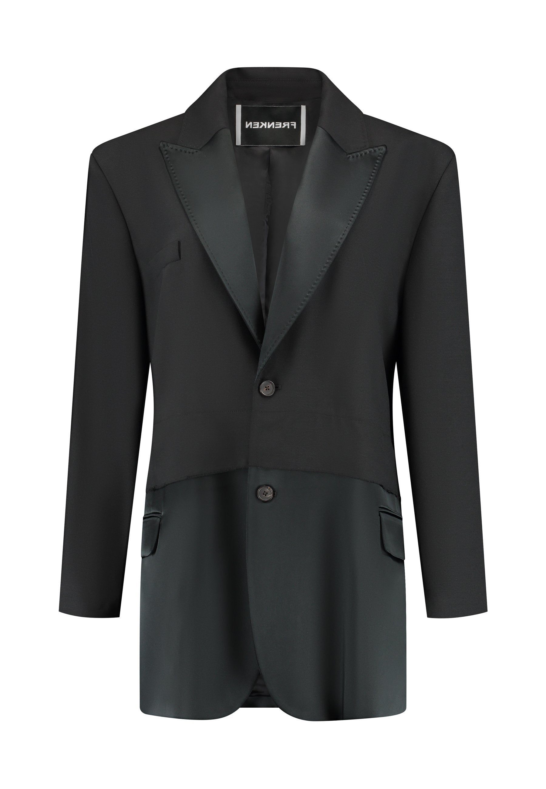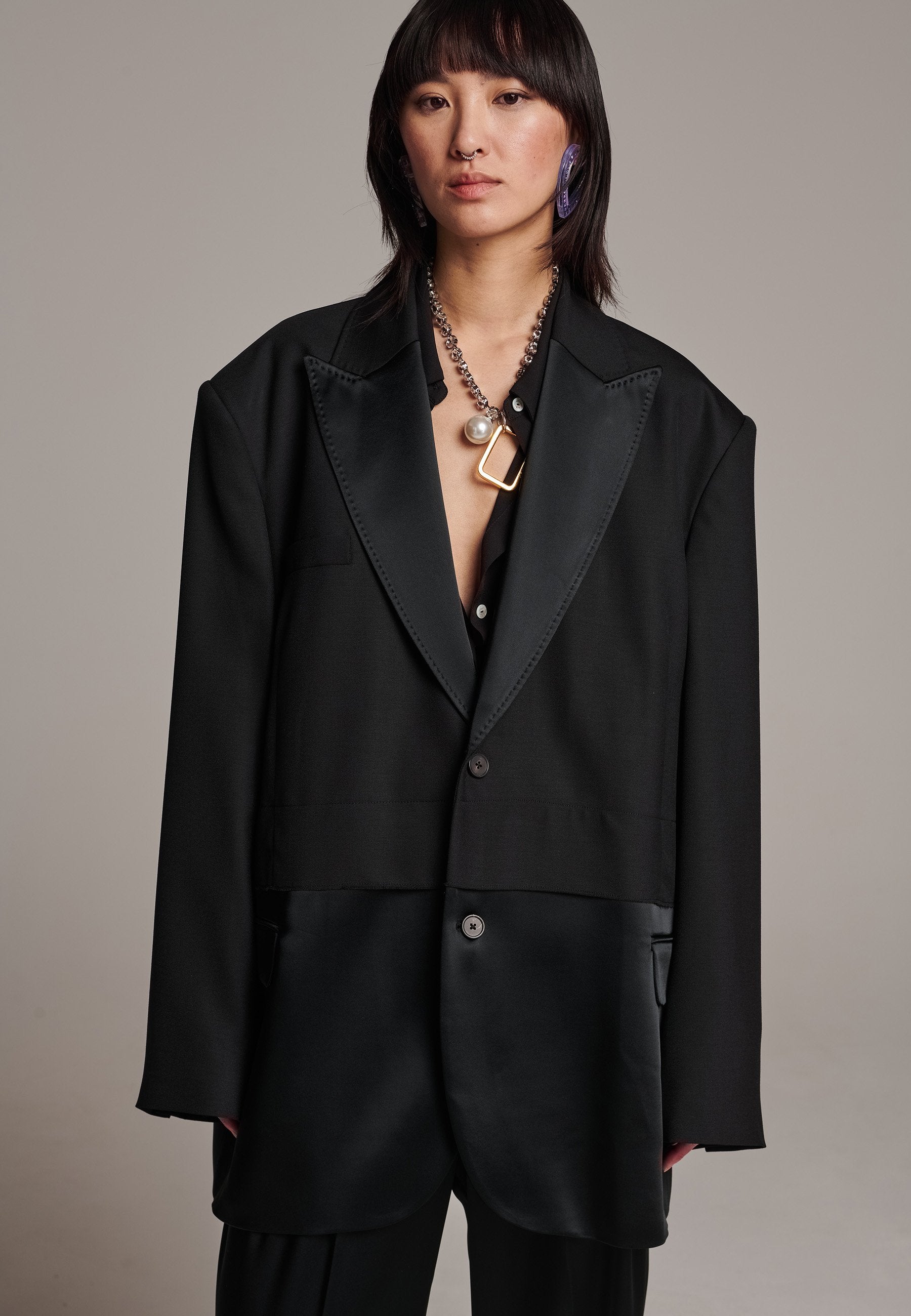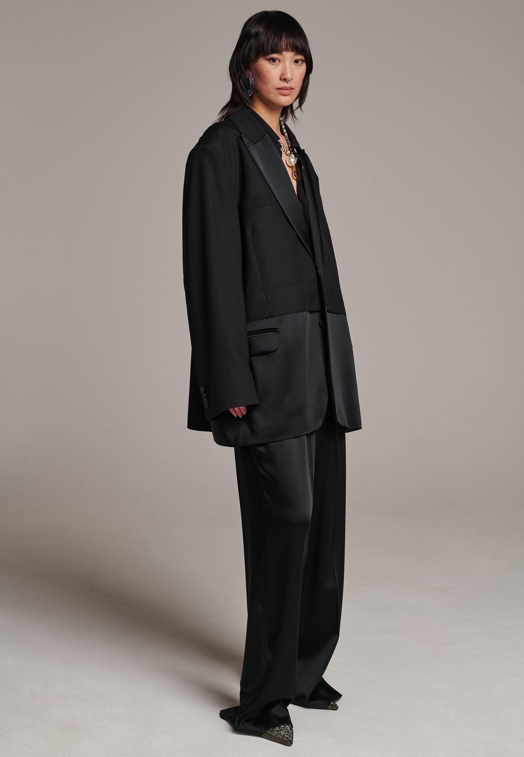 Creative Director Erik Frenken is a master of designing cool, oversized silhouettes, and this blazer is no exception. Precisely tailored with tuxedo-influenced satin lapels and needle point stitching. Full viscose satin lining, handy flap pockets. Horn square button fastenings. This piece will elevate every outfit to the next level, from jeans to dresses, and could easily become your everyday treasure.