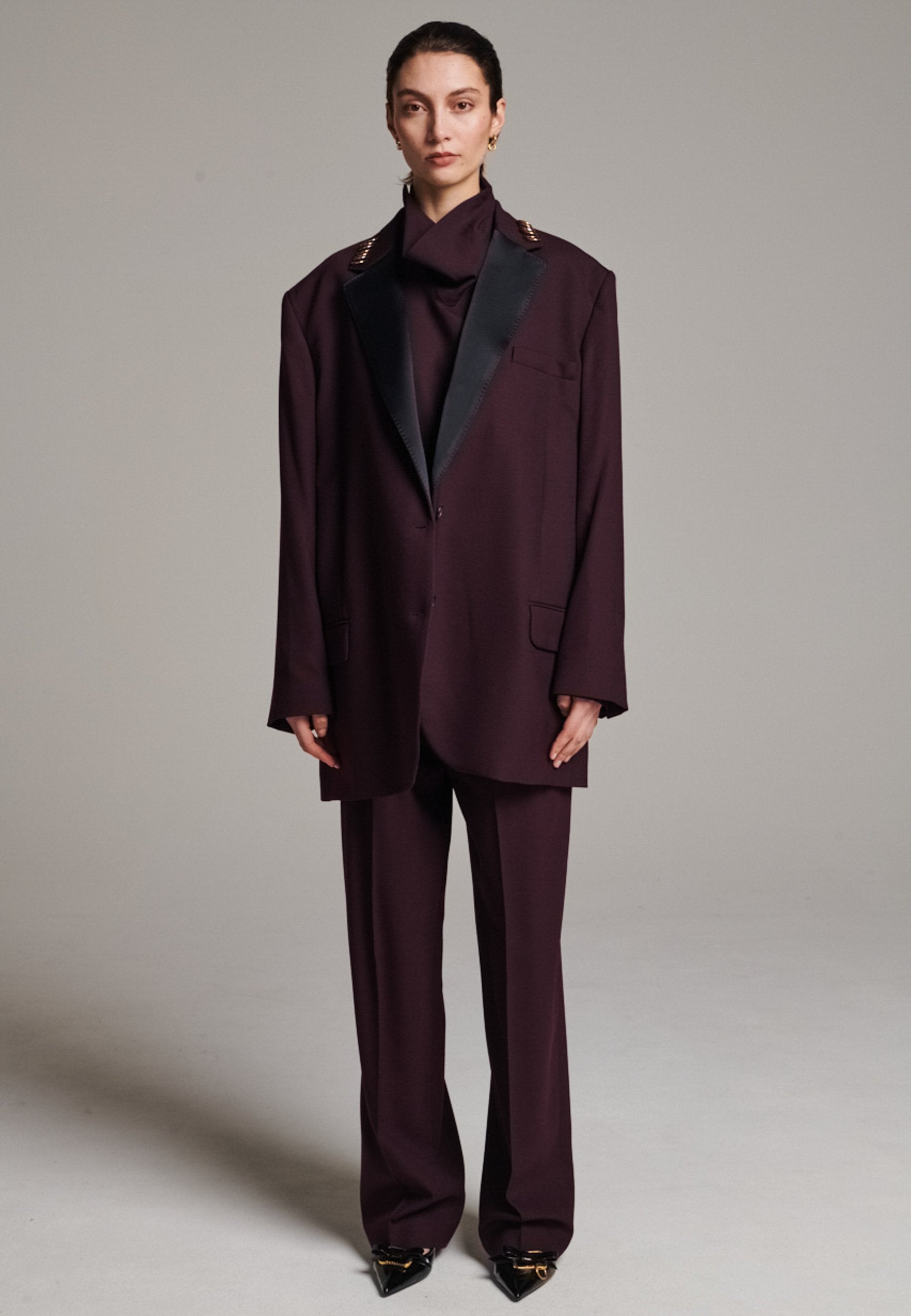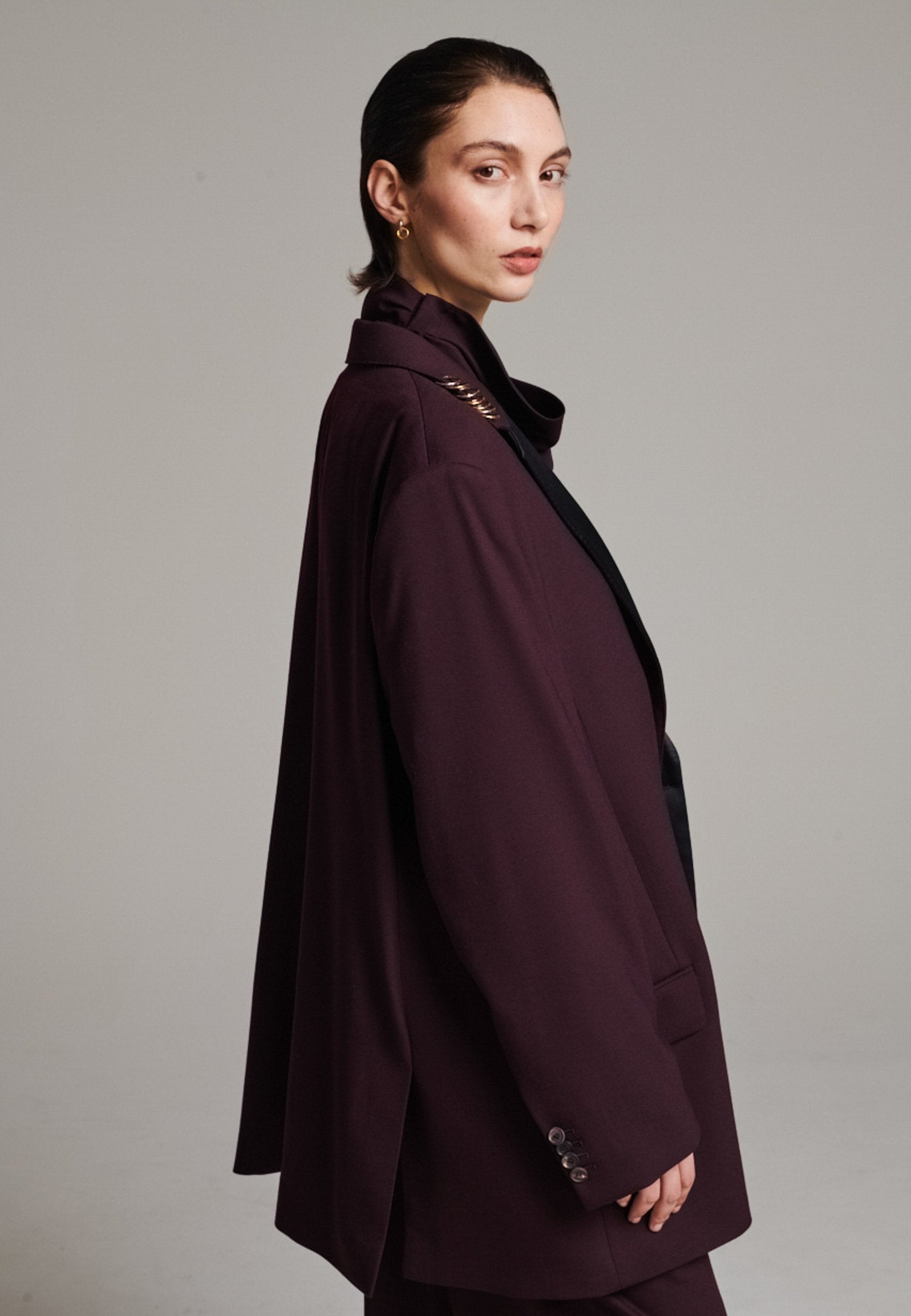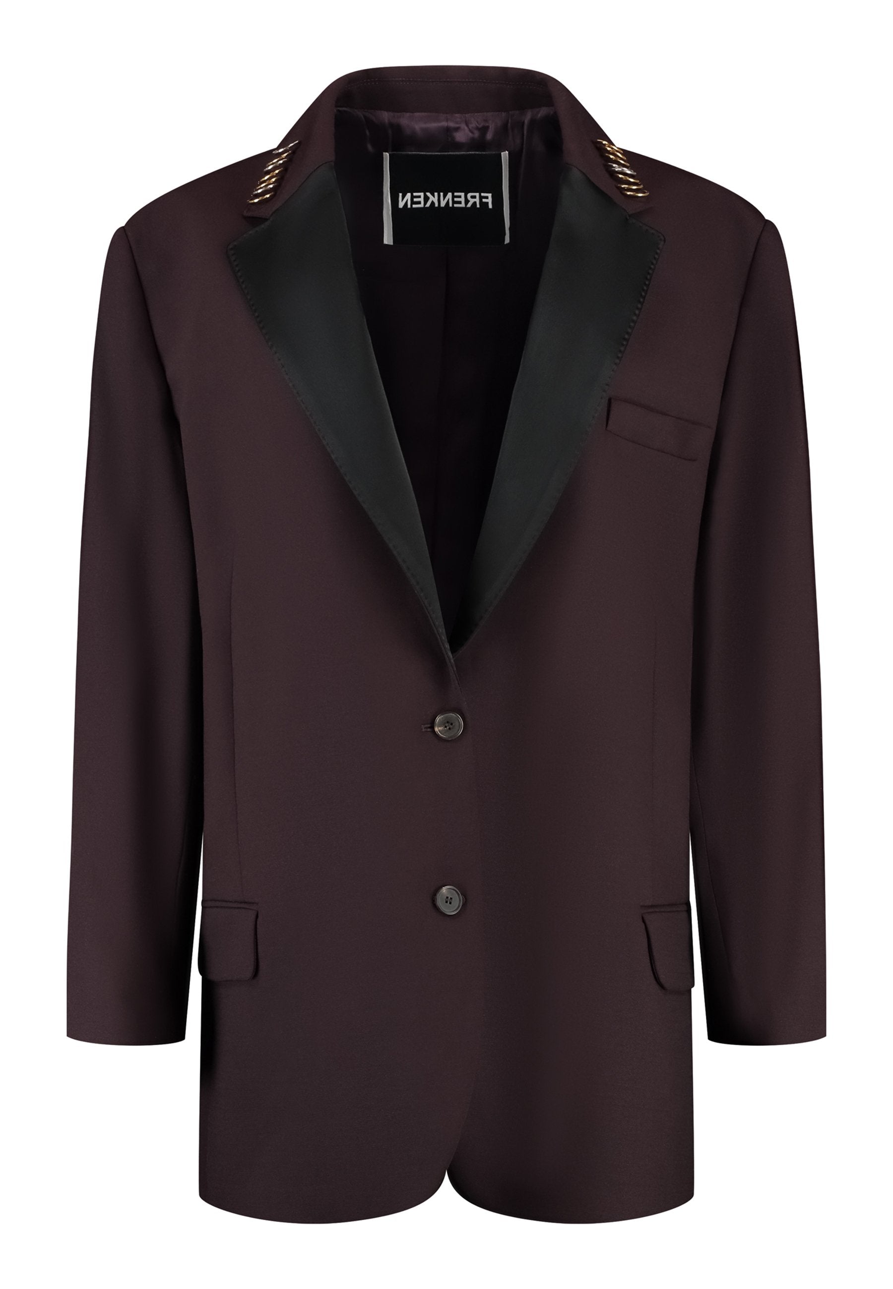 A classic yet oversized blazer, designed to make a bold statement while maintaining timeless appeal. The lower portion of the lapels is crafted from a contrasting shiny fabric, adding an unexpected touch of texture and luxury. The upper part of the collar area is beautifully embellished with gold and silver rings at the tips, offering a refined, modern twist. This piece combines traditional tailoring with avant-garde details, perfect for elevating any outfit with sophistication and edge.
