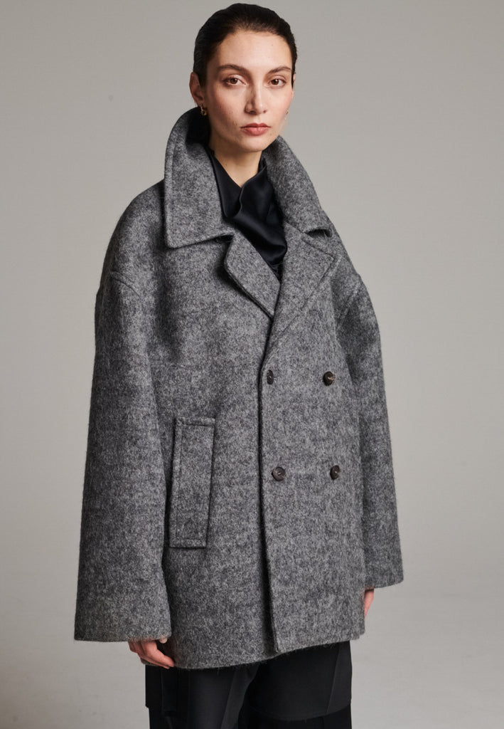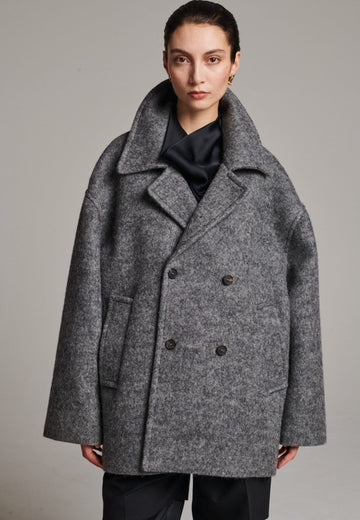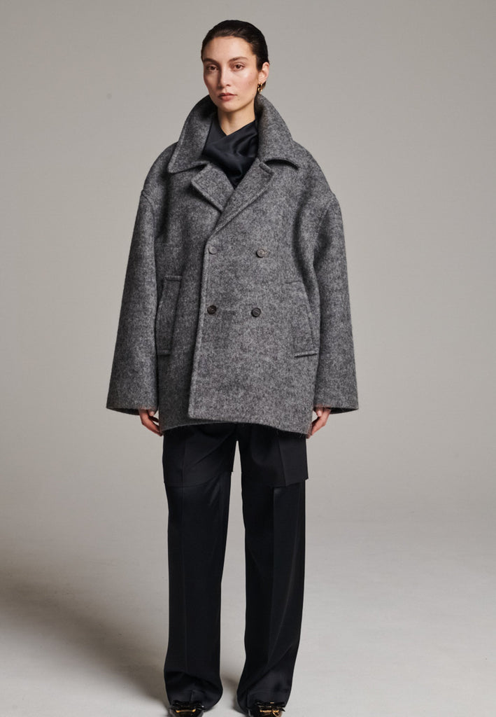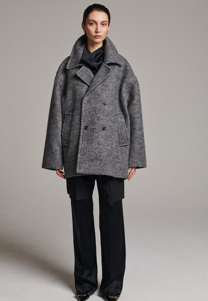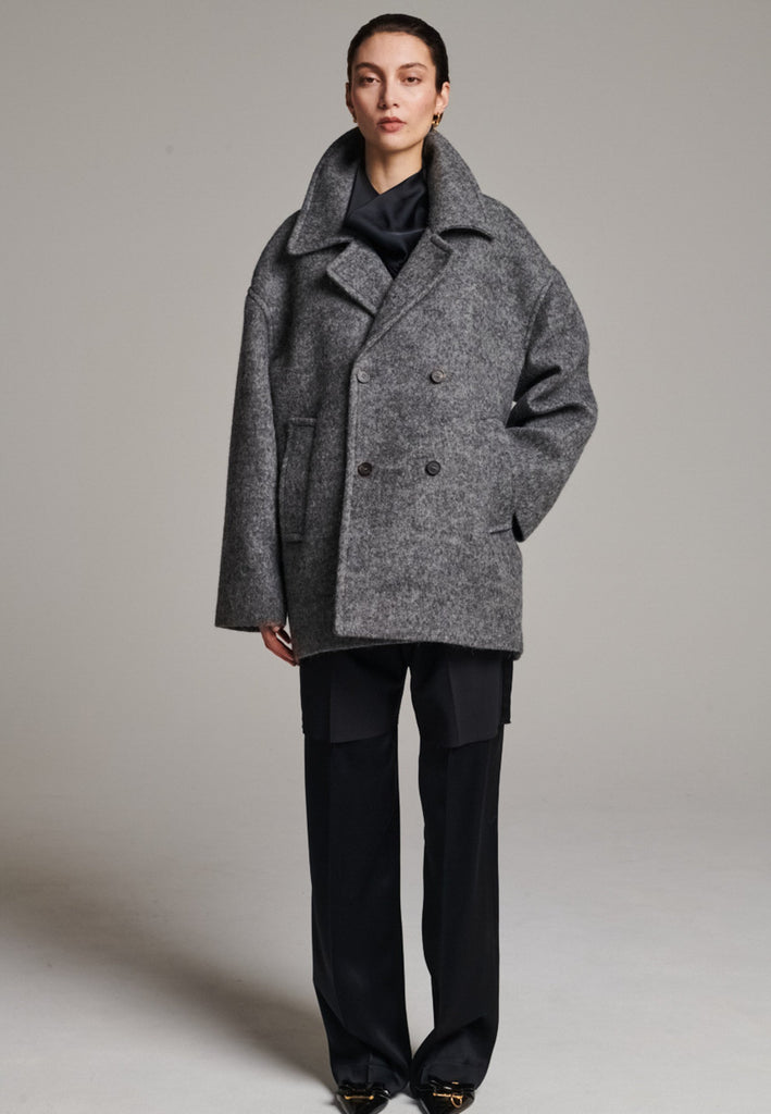 A contemporary take on the classic peacoat, this piece is crafted from a luxurious grey melange wool blend that offers both warmth and refined texture. Staying true to its naval-inspired roots, the structured silhouette features a double-breasted front and wide lapels, reimagined here in an oversized fit for a modern, relaxed feel. The soft melange tones elevate the timeless grey hue, adding subtle depth and sophistication.