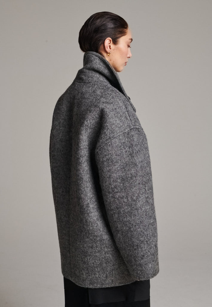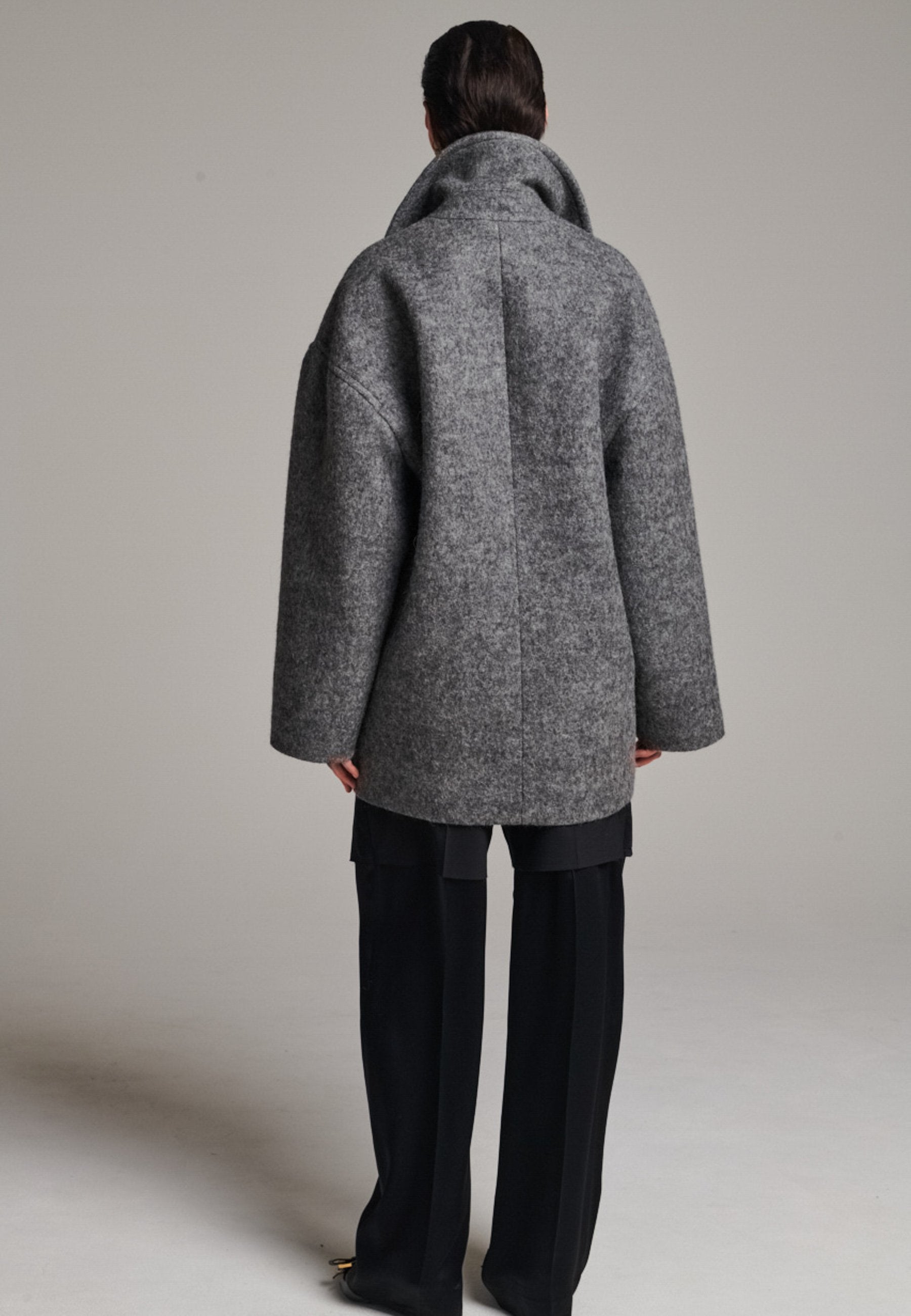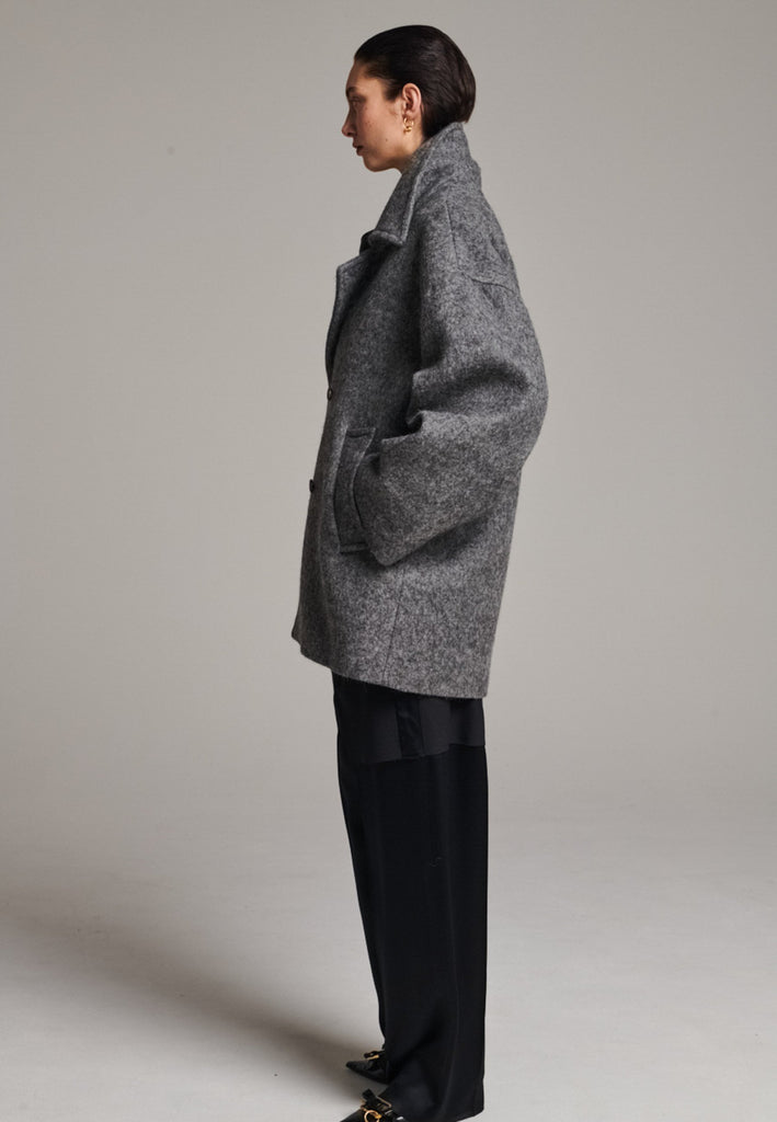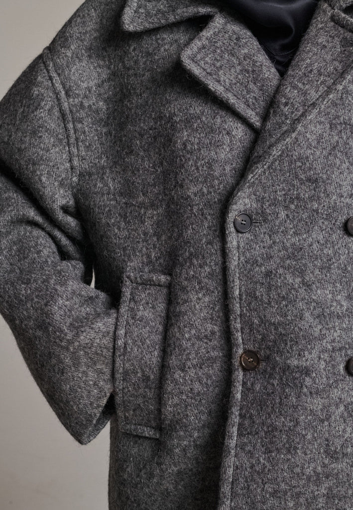 A contemporary take on the classic peacoat, this piece is crafted from a luxurious grey melange wool blend that offers both warmth and refined texture. Staying true to its naval-inspired roots, the structured silhouette features a double-breasted front and wide lapels, reimagined here in an oversized fit for a modern, relaxed feel. The soft melange tones elevate the timeless grey hue, adding subtle depth and sophistication.