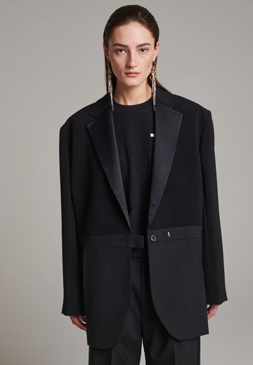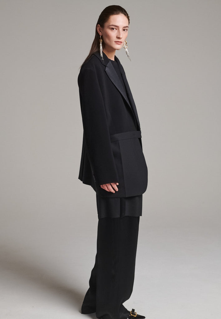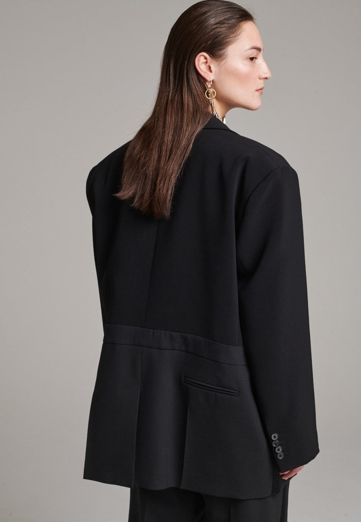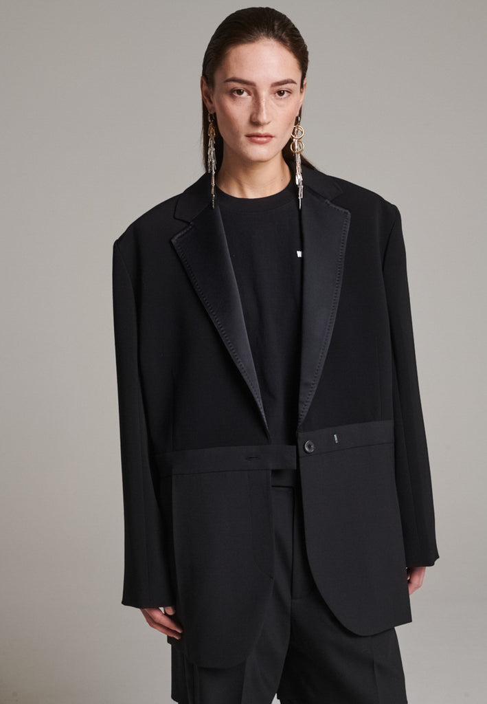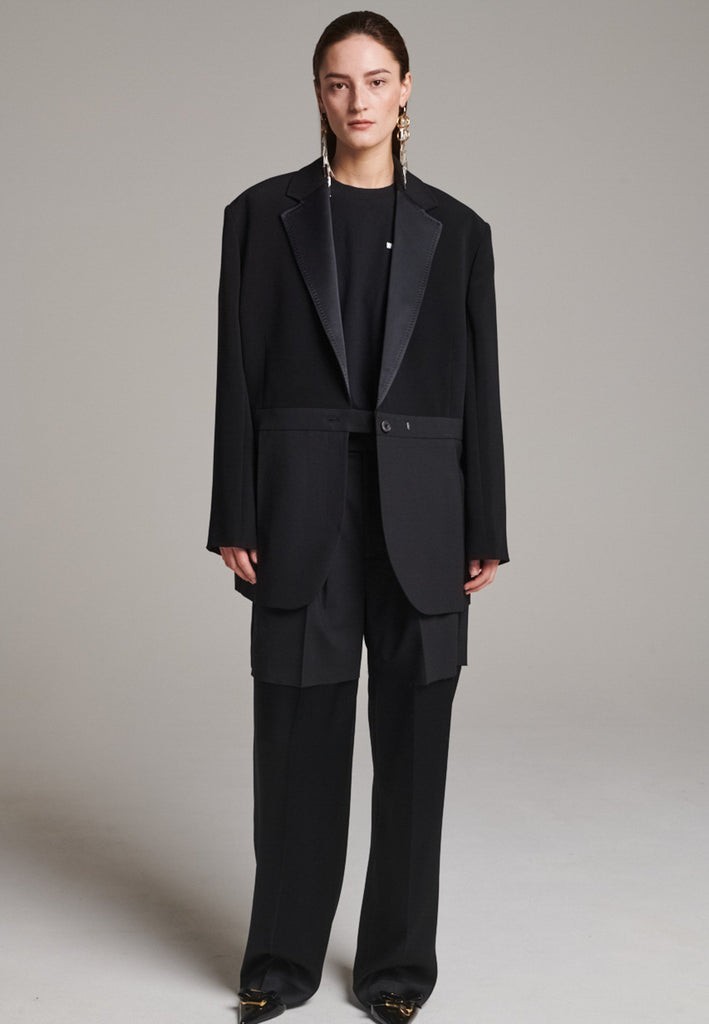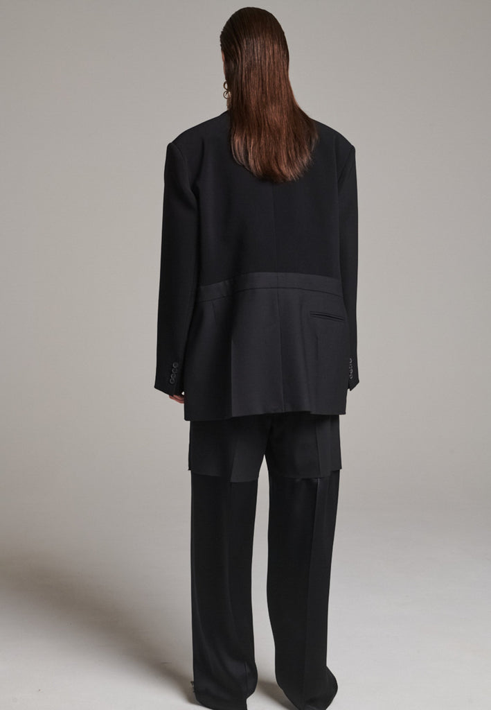 Bold and unconventional, this blazer reimagines classic tailoring through a modern, deconstructed lens. Designed with broad shoulders and an oversized silhouette, it plays with texture and tone using three distinct black fabrics. The upper section features a deep matte black, contrasted by sleek, subtly glossy lapels. The lower part of the blazer shifts to a slightly lighter black, separated by a structured waistband detail inspired by classic trousers. This unexpected element adds definition and architectural interest, creating a layered, tonal look.