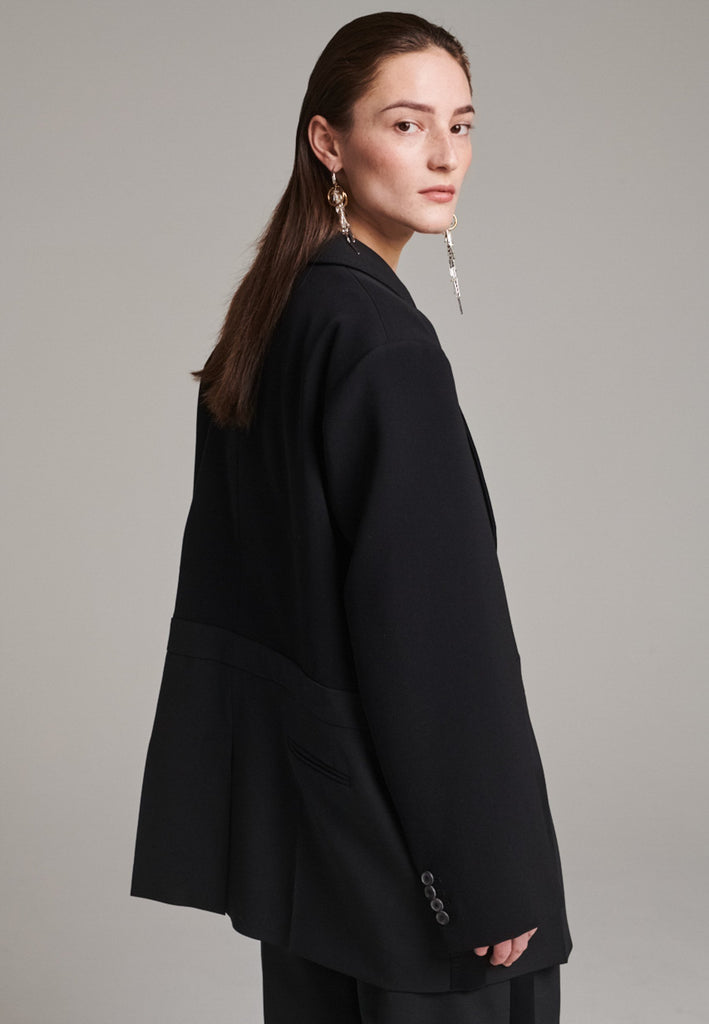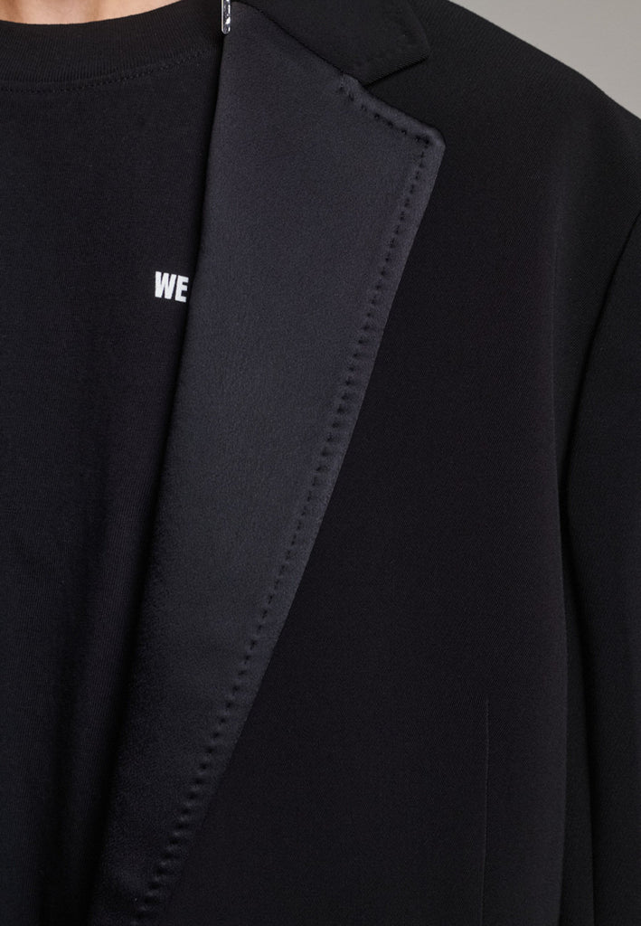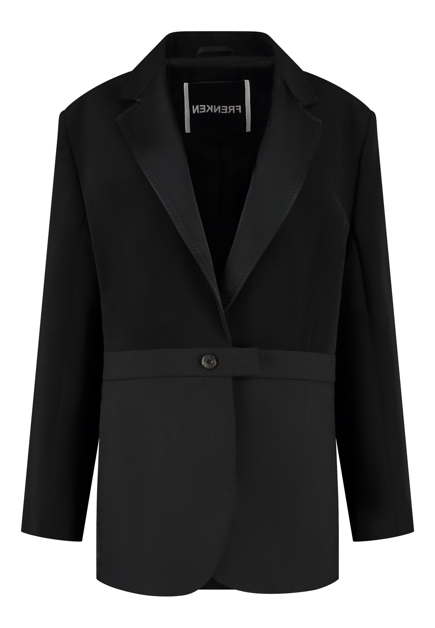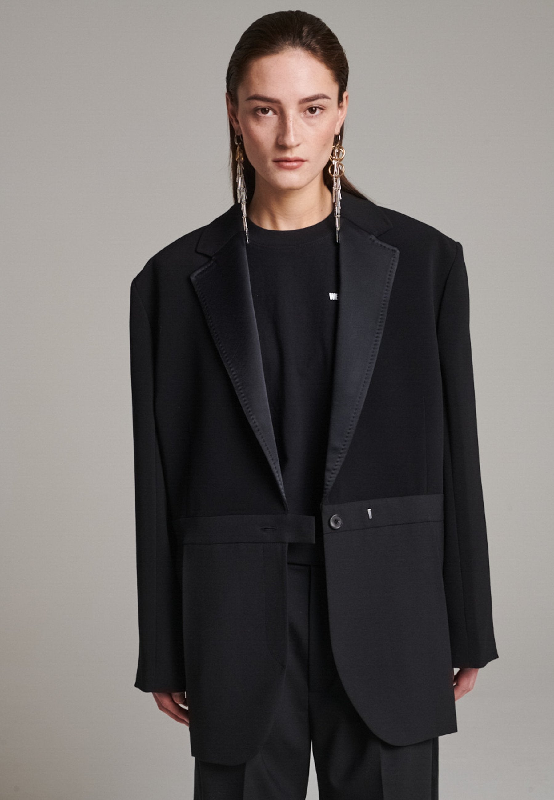 Bold and unconventional, this blazer reimagines classic tailoring through a modern, deconstructed lens. Designed with broad shoulders and an oversized silhouette, it plays with texture and tone using three distinct black fabrics. The upper section features a deep matte black, contrasted by sleek, subtly glossy lapels. The lower part of the blazer shifts to a slightly lighter black, separated by a structured waistband detail inspired by classic trousers. This unexpected element adds definition and architectural interest, creating a layered, tonal look.