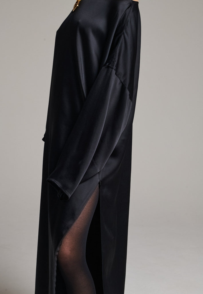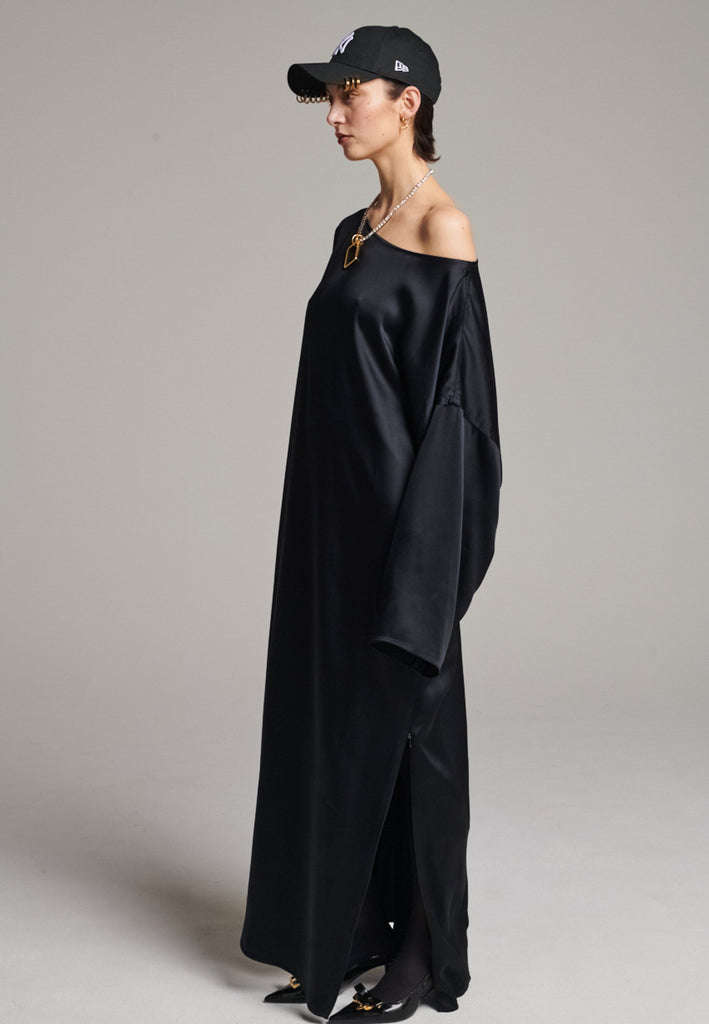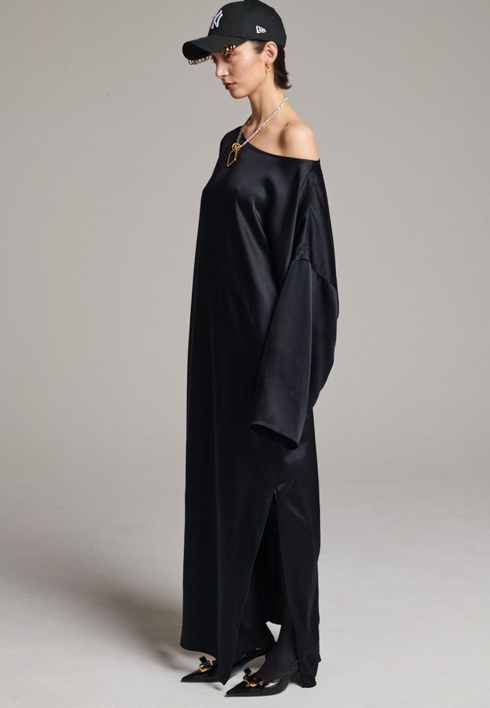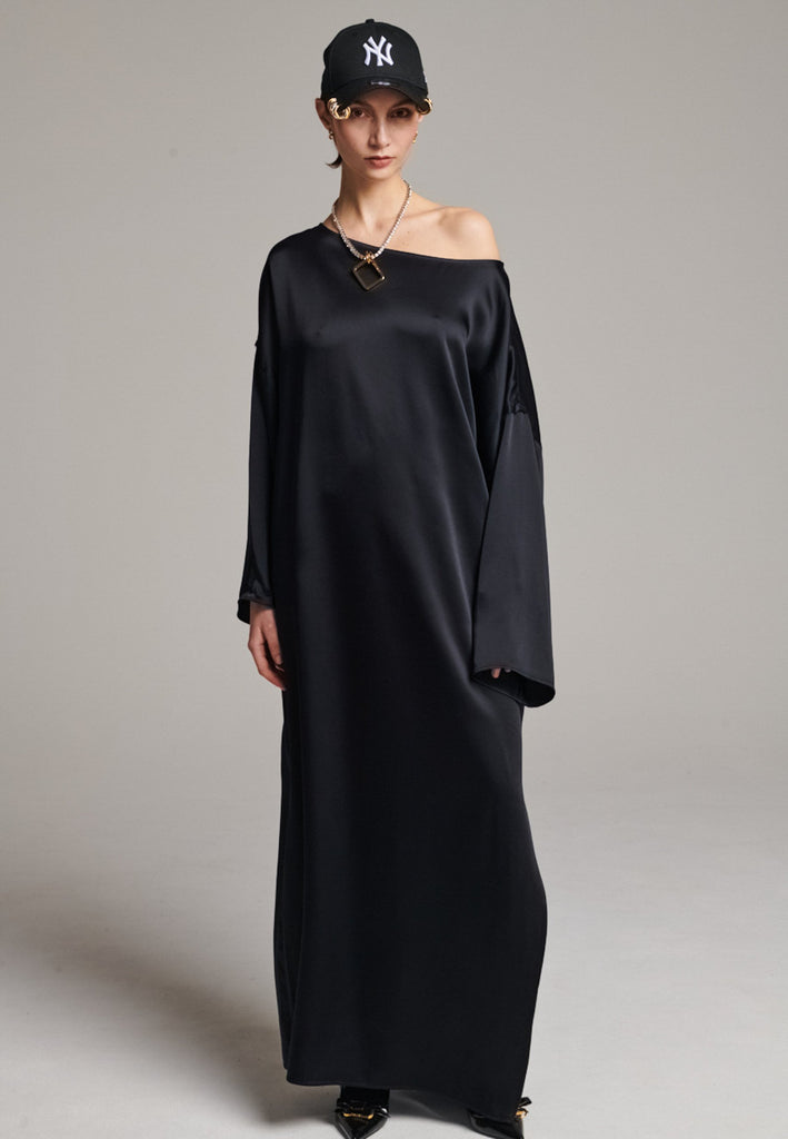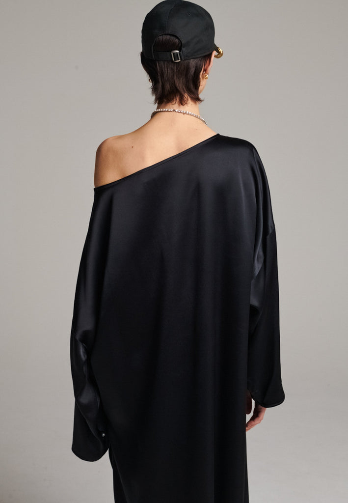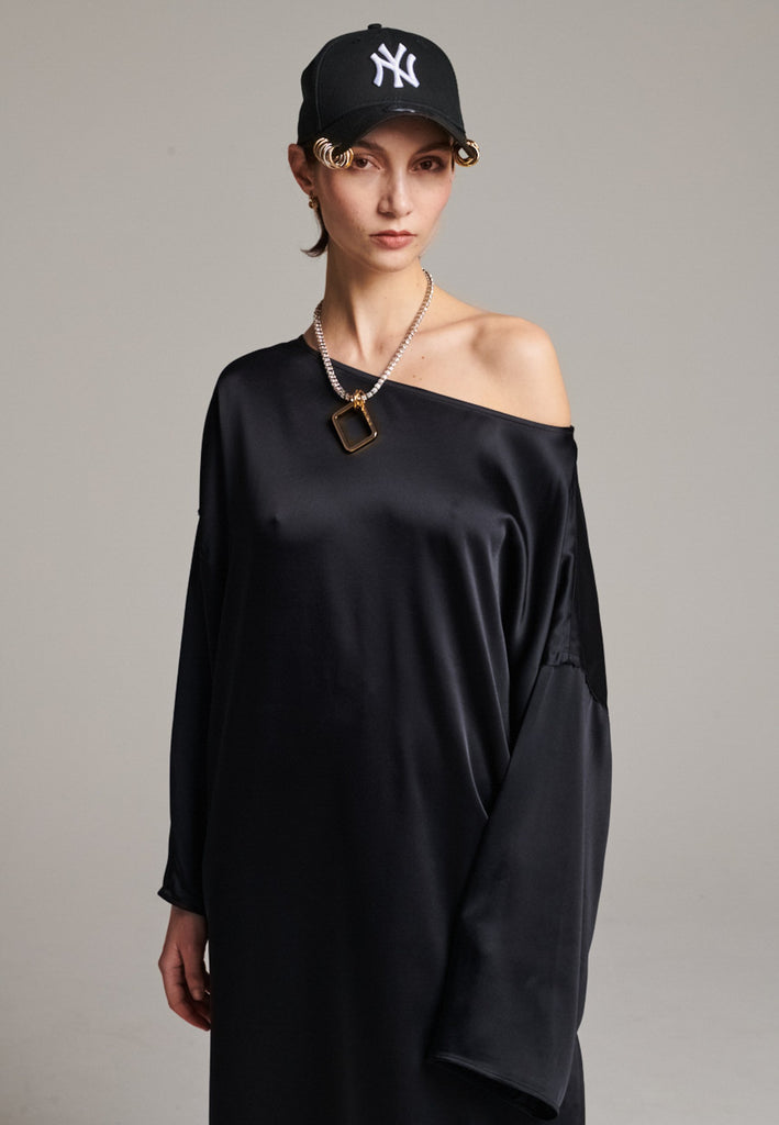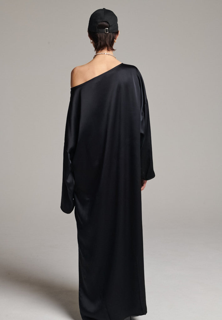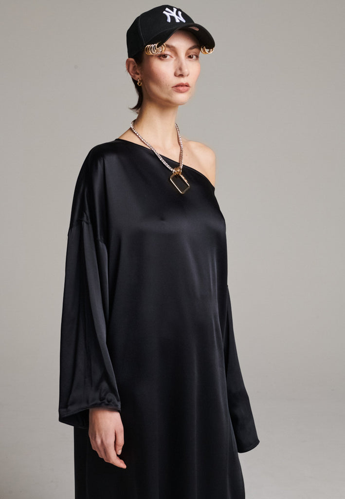 Presenting a loose, flowing piece crafted from soft satin with a graceful drape. Its oversized design offers freedom of movement and an effortlessly elegant look. Featuring dropped shoulders for a relaxed, contemporary silhouette, the dress also has a wide neckline that allows for versatile styling. The satin’s gentle sheen adds a touch of luxury, making it perfect for both special occasions and elevated everyday wear.