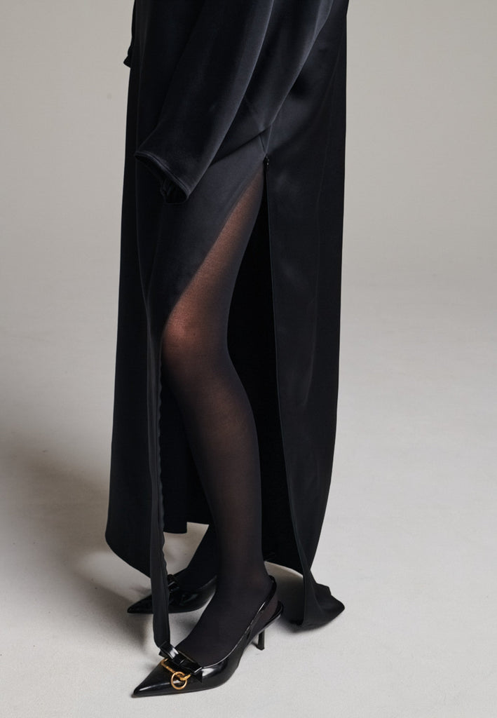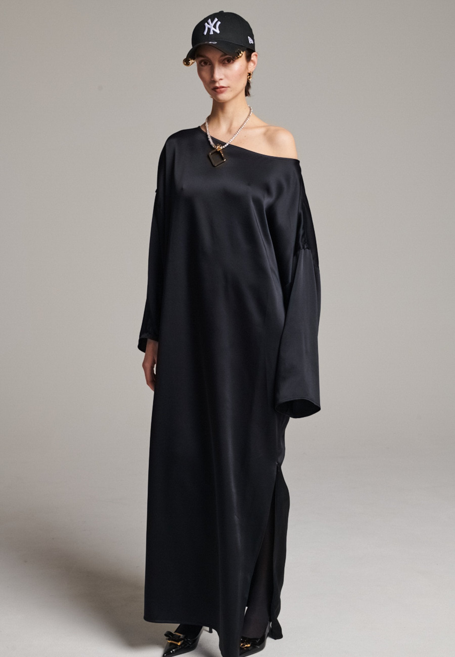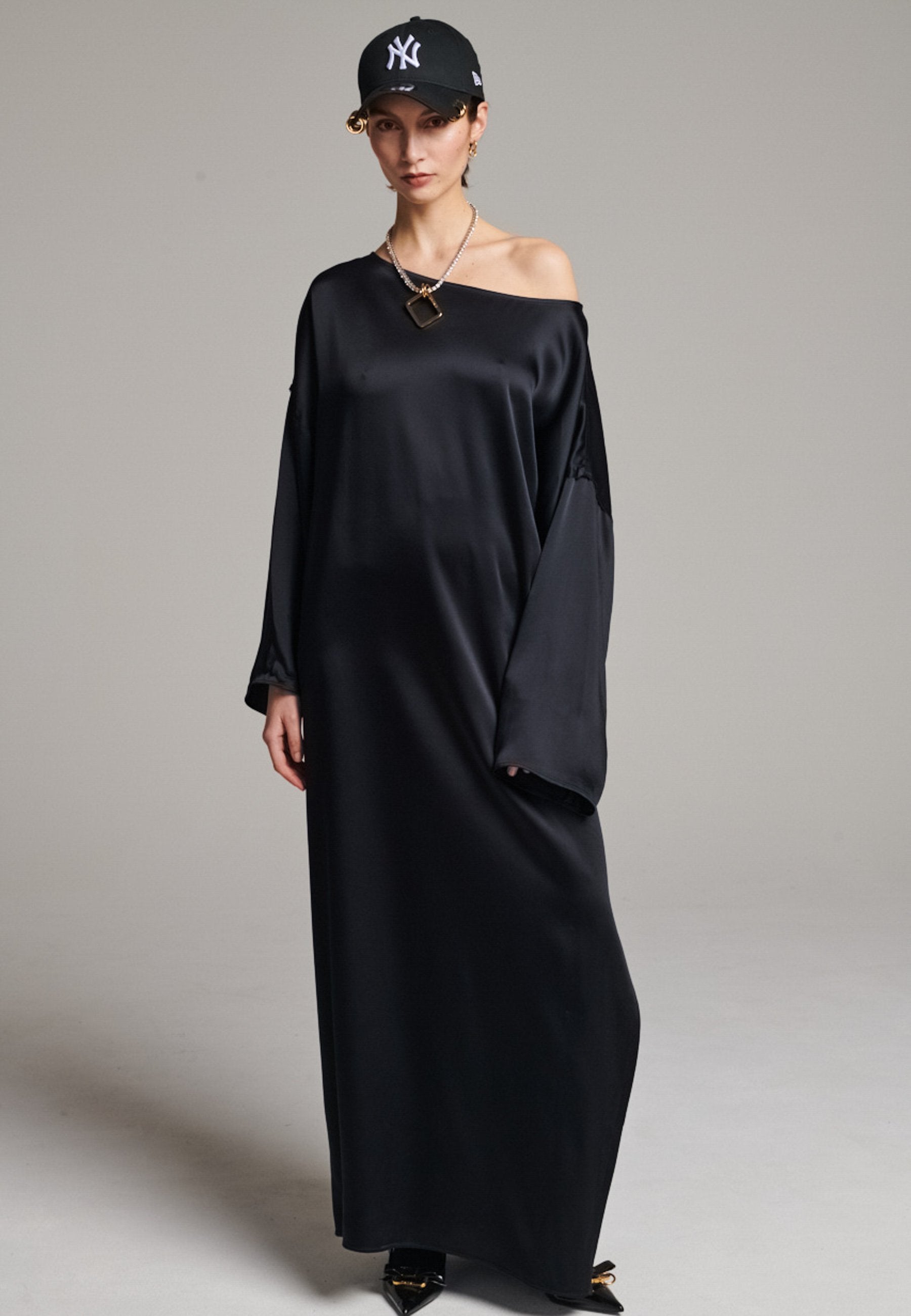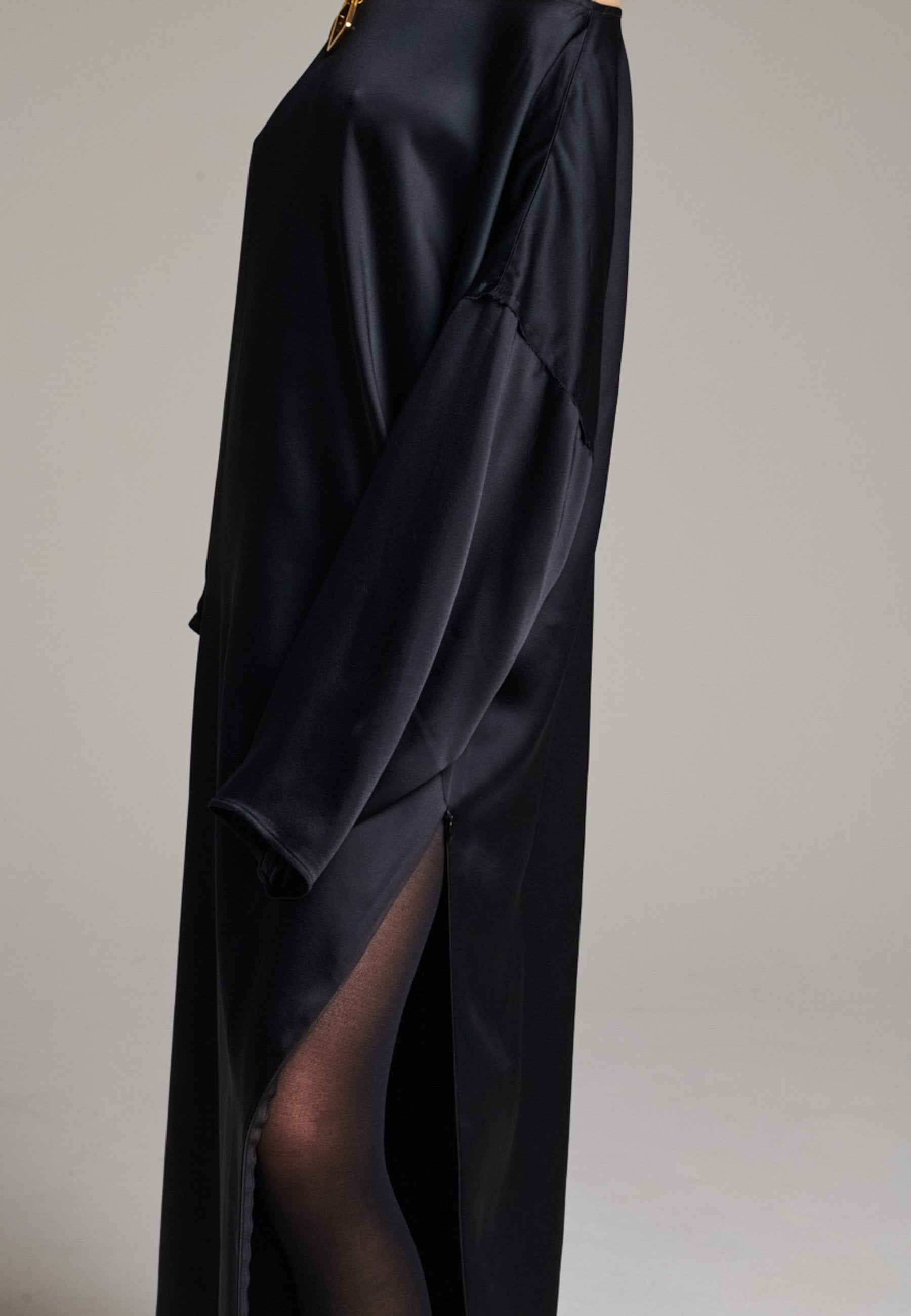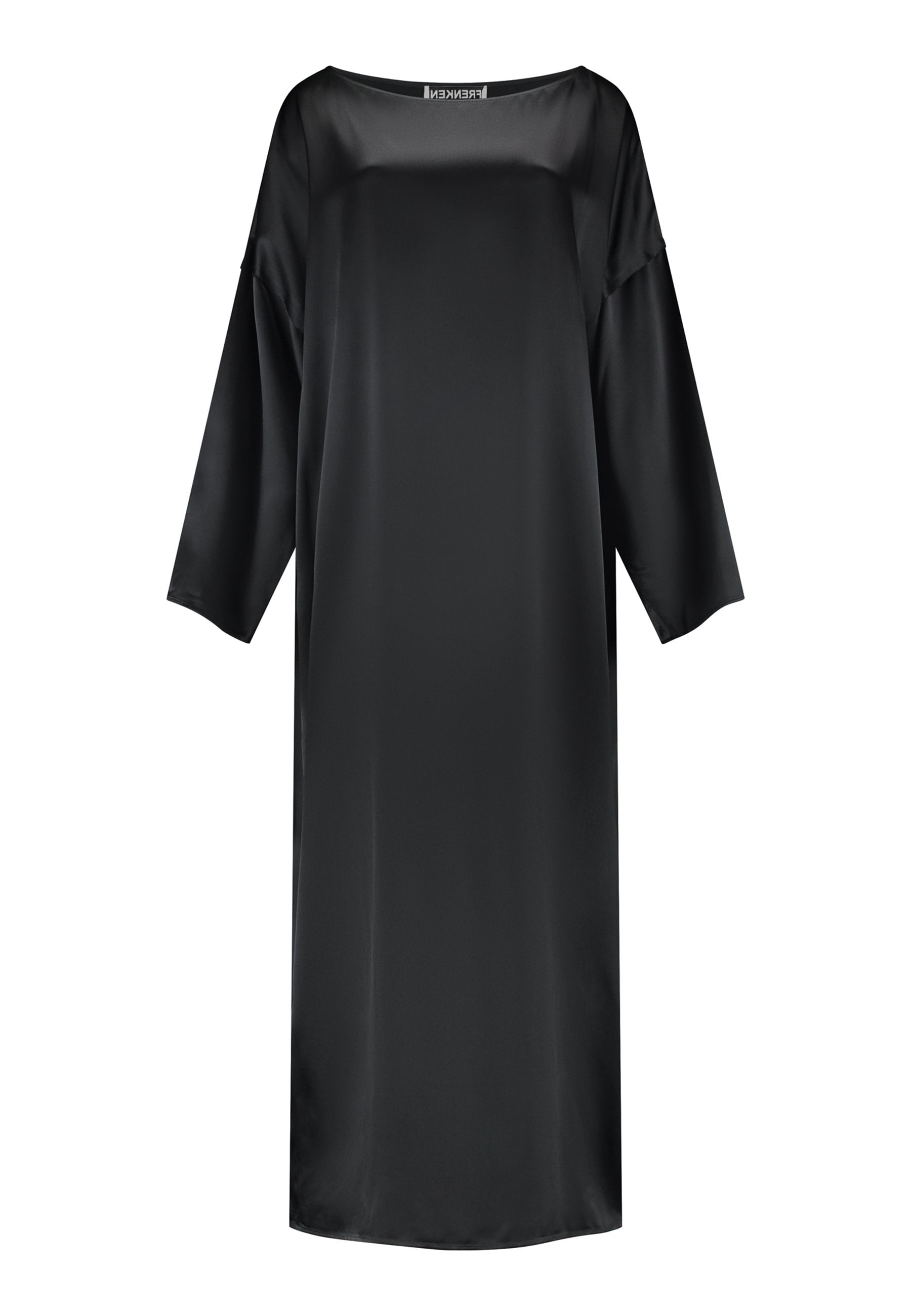 Presenting a loose, flowing piece crafted from soft satin with a graceful drape. Its oversized design offers freedom of movement and an effortlessly elegant look. Featuring dropped shoulders for a relaxed, contemporary silhouette, the dress also has a wide neckline that allows for versatile styling. The satin’s gentle sheen adds a touch of luxury, making it perfect for both special occasions and elevated everyday wear.