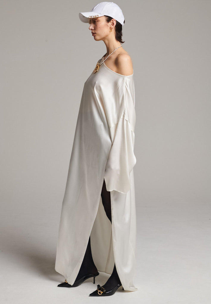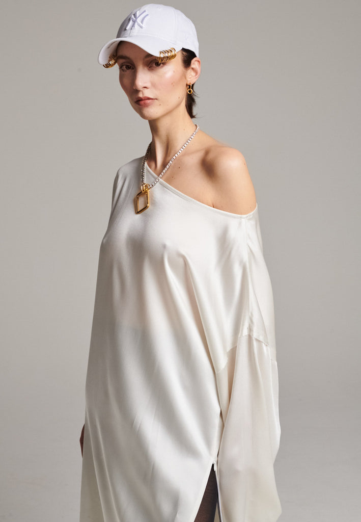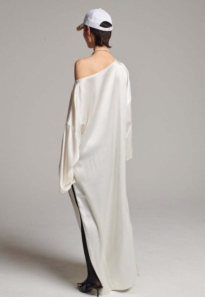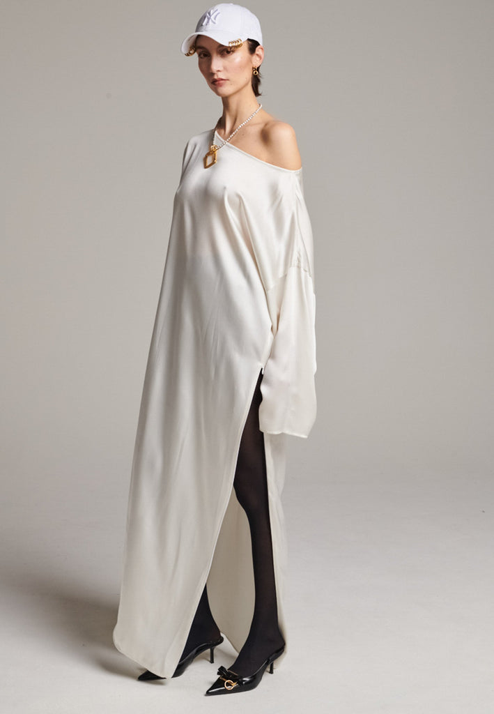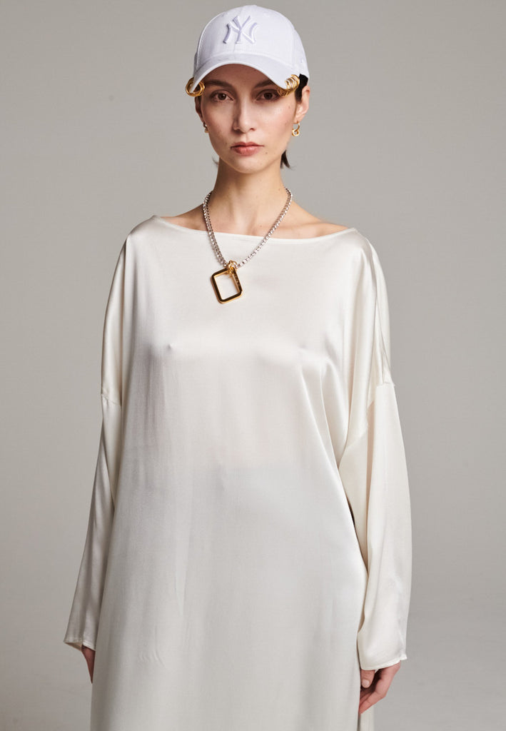 Presenting a loose, flowing piece crafted from soft satin with a graceful drape. Its oversized design offers freedom of movement and an effortlessly elegant look. Featuring dropped shoulders for a relaxed, contemporary silhouette, the dress also has a wide neckline that allows for versatile styling. The satin’s gentle sheen adds a touch of luxury, making it perfect for both special occasions and elevated everyday wear.