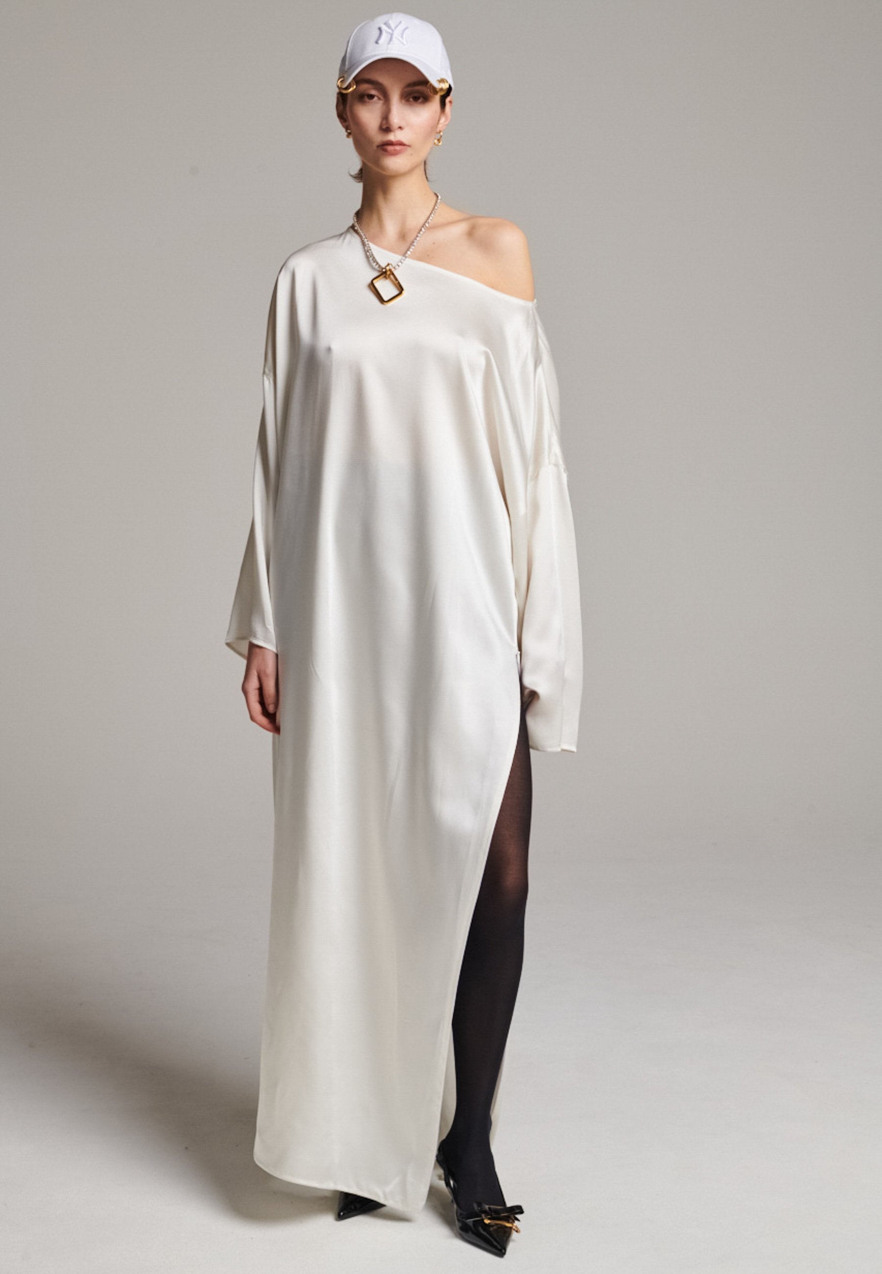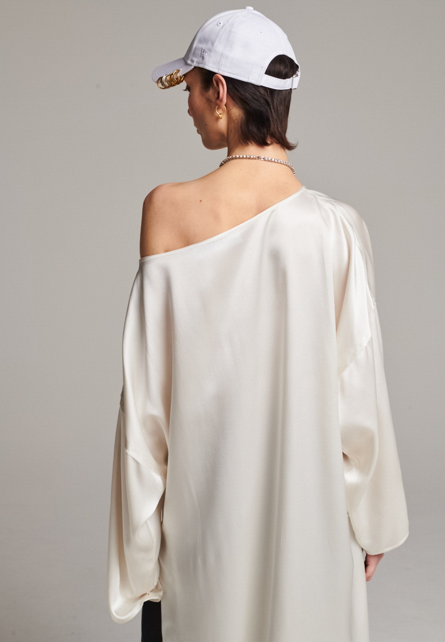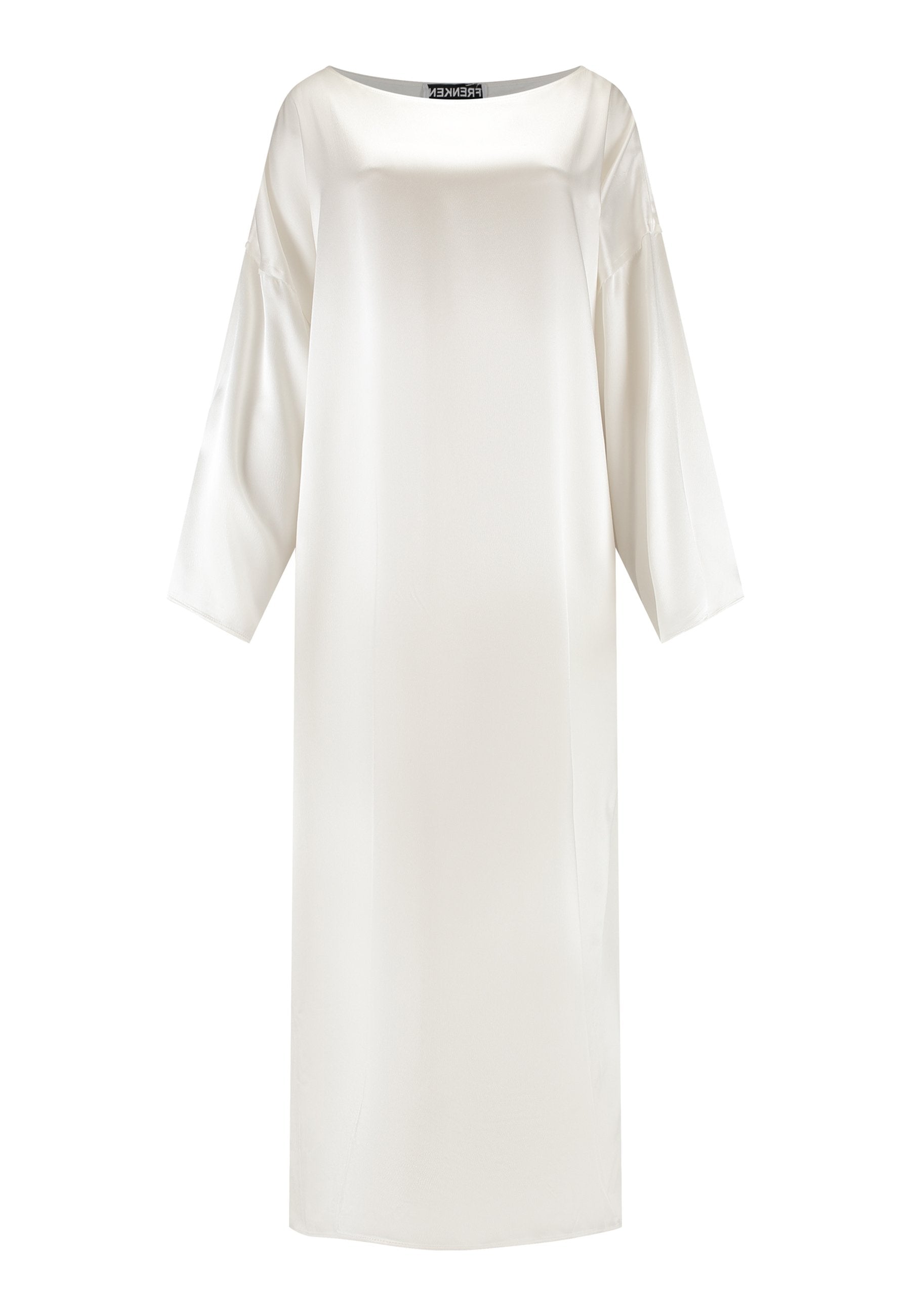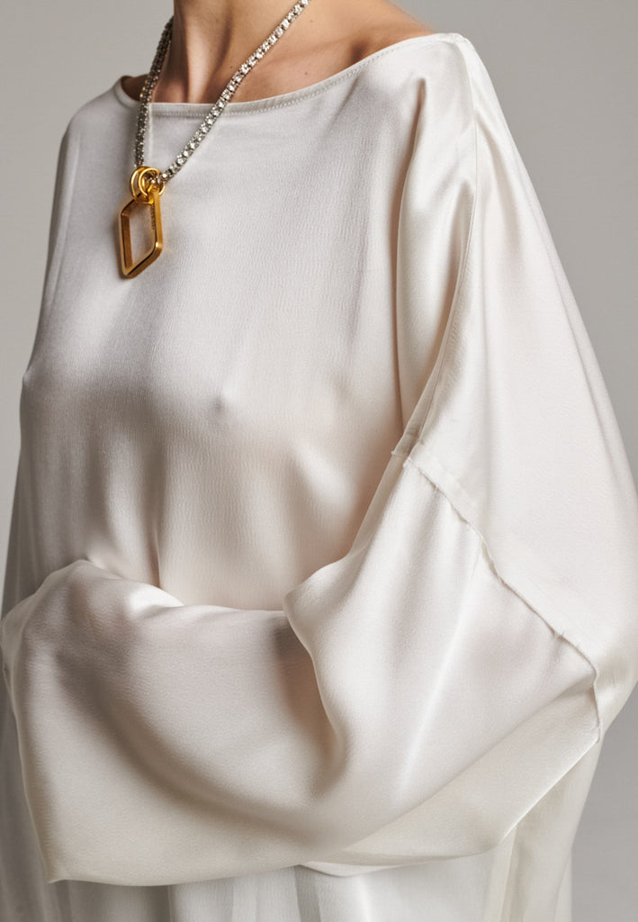 Presenting a loose, flowing piece crafted from soft satin with a graceful drape. Its oversized design offers freedom of movement and an effortlessly elegant look. Featuring dropped shoulders for a relaxed, contemporary silhouette, the dress also has a wide neckline that allows for versatile styling. The satin’s gentle sheen adds a touch of luxury, making it perfect for both special occasions and elevated everyday wear.