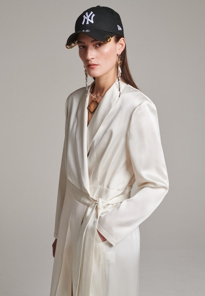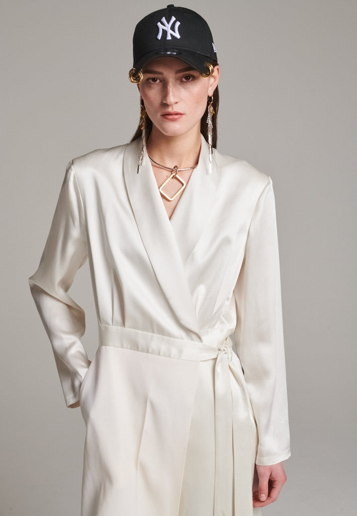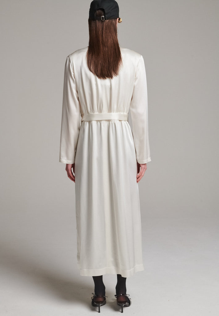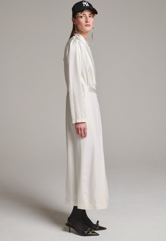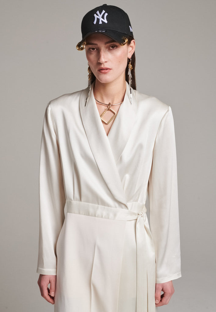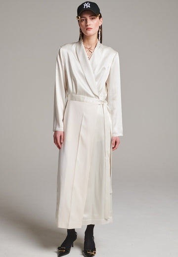 Crafted from a lightweight, glossy fabric, this wrap-style dress echoes the relaxed elegance of a robe. Designed with a fluid silhouette and an adjustable tie at the waist, it drapes effortlessly on the body. One of the front panels is in a contrasting fabric, introducing a subtle break in the visual rhythm.