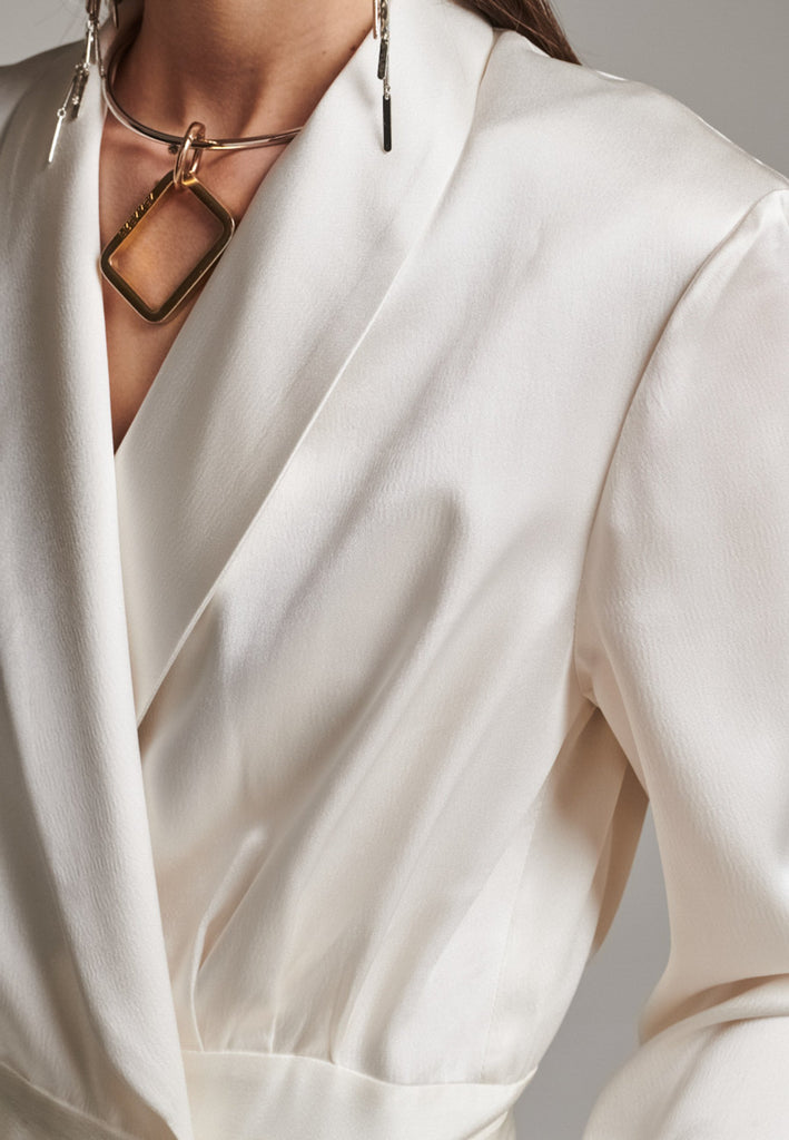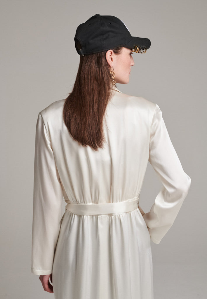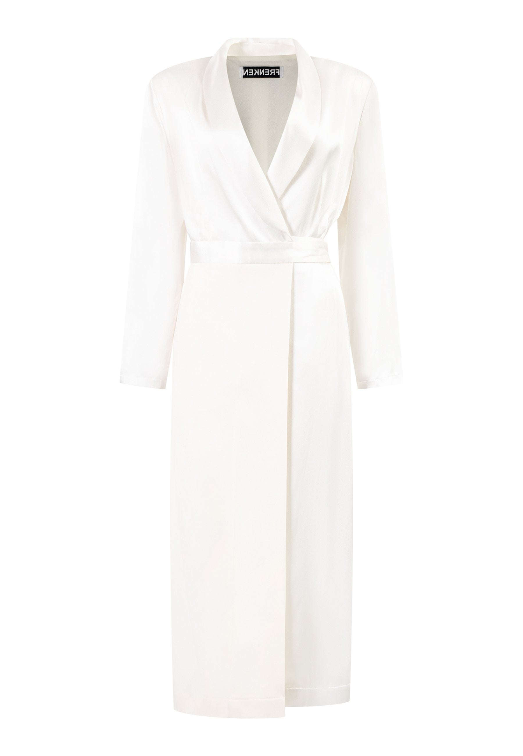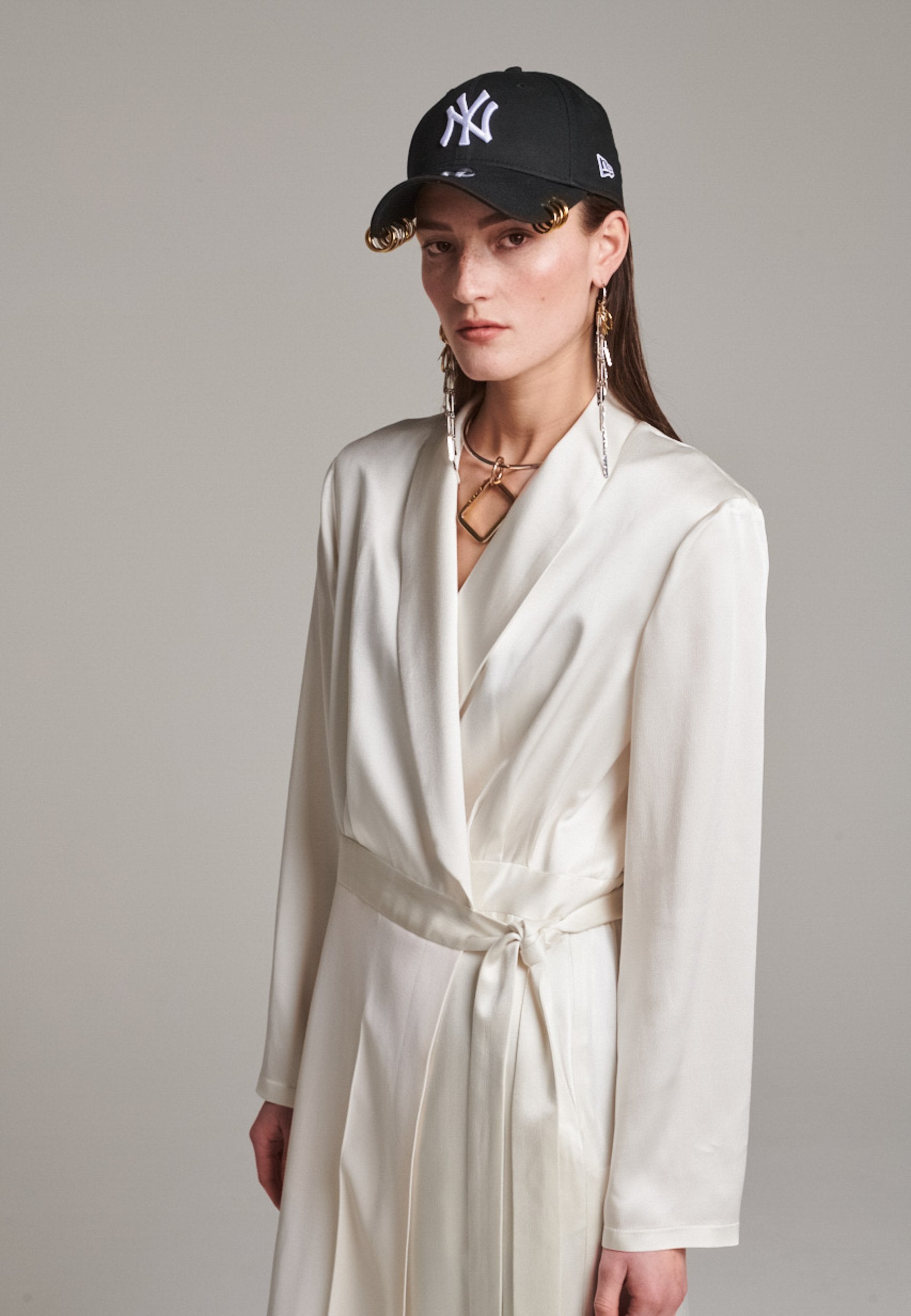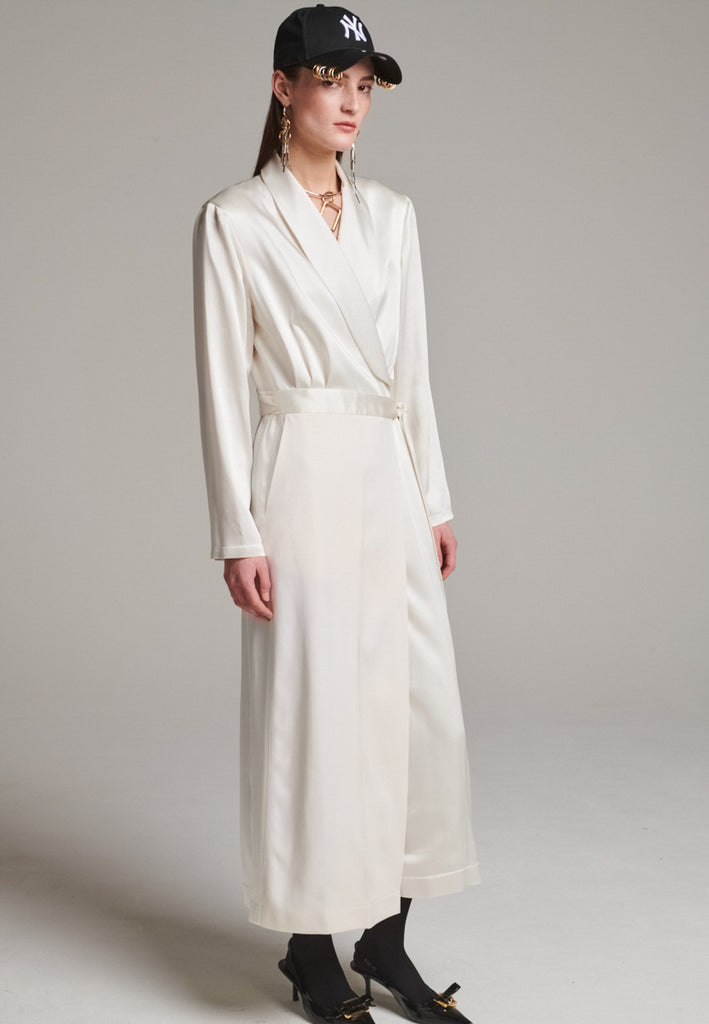 Crafted from a lightweight, glossy fabric, this wrap-style dress echoes the relaxed elegance of a robe. Designed with a fluid silhouette and an adjustable tie at the waist, it drapes effortlessly on the body. One of the front panels is in a contrasting fabric, introducing a subtle break in the visual rhythm.