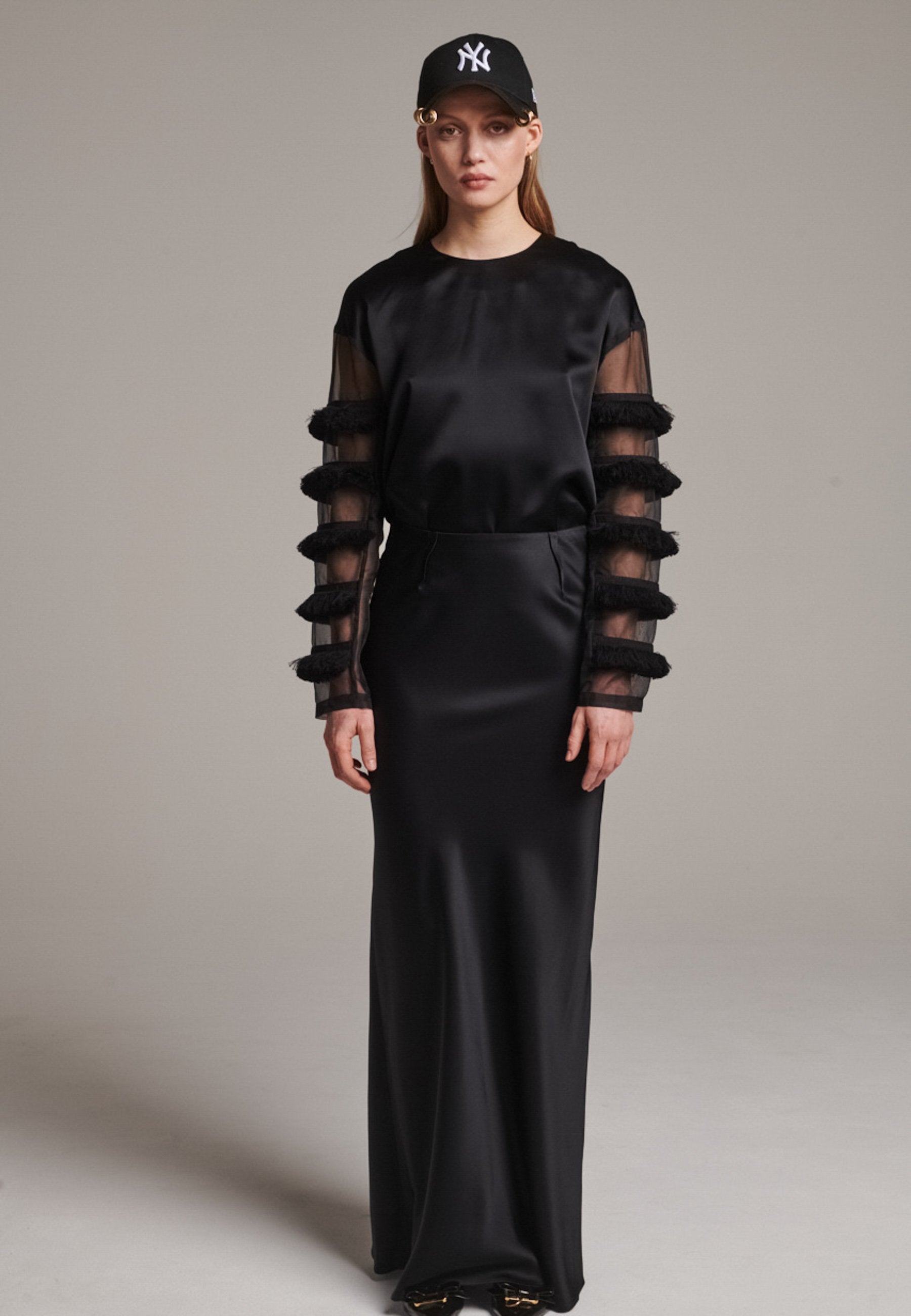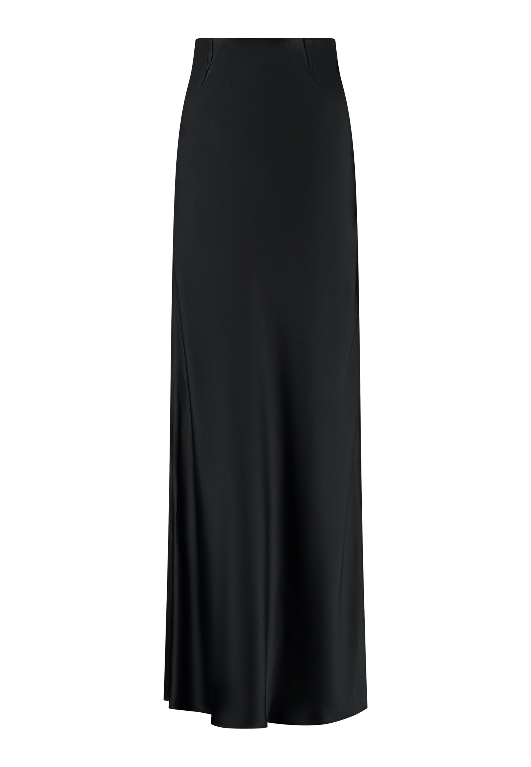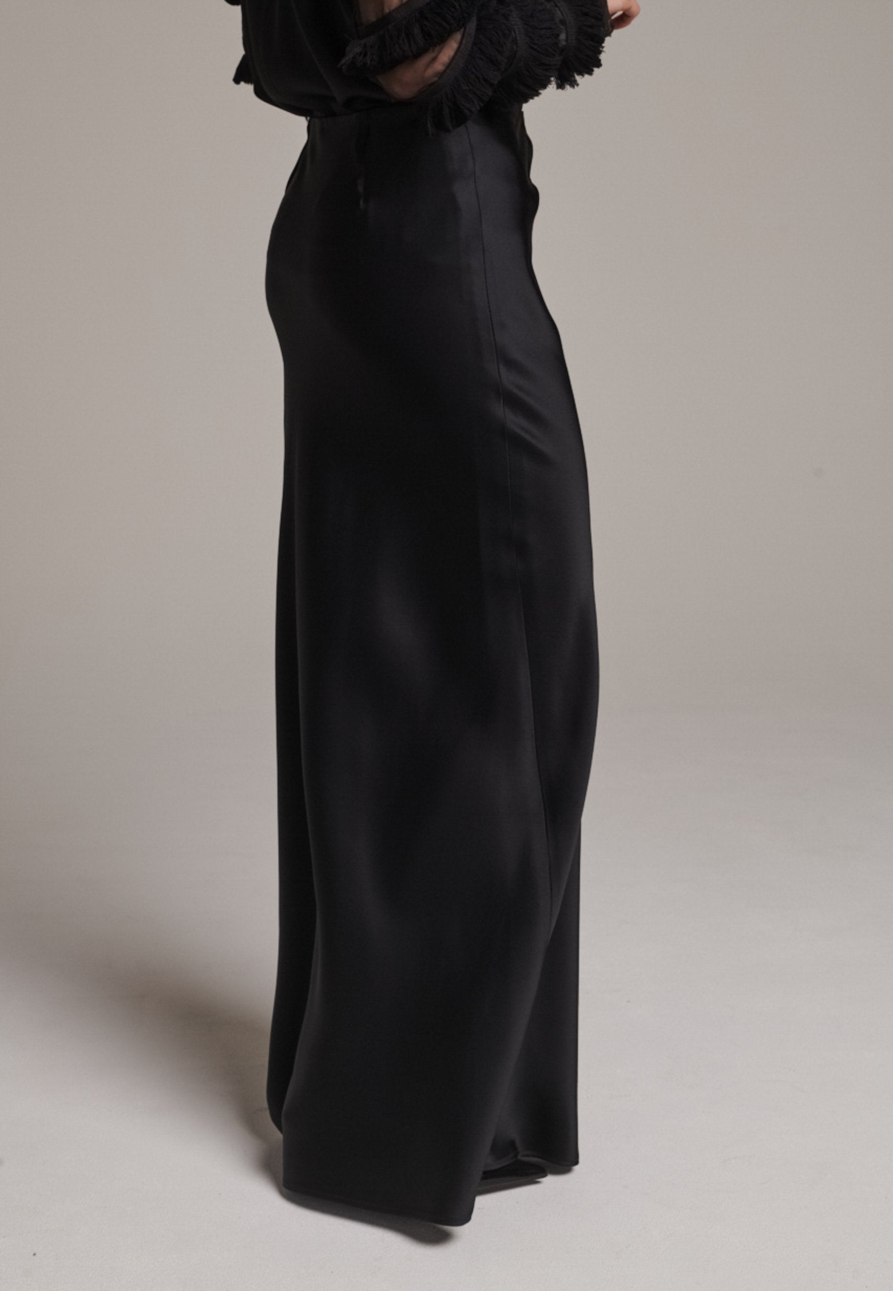 Flowy black skirt with a refined, elongated silhouette. Crafted from lightweight fabric with soft movement and an elegant drape. Front and back darts are intentionally exposed, adding subtle structure and a tailored finish to the fluid shape. A quiet statement piece, effortlessly balancing form and flow.