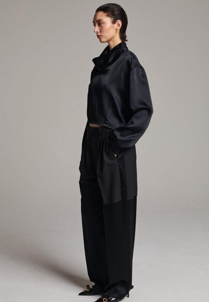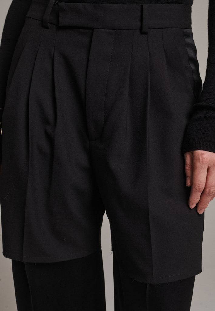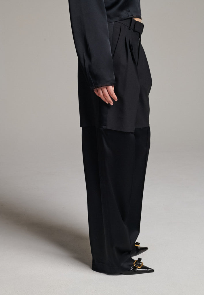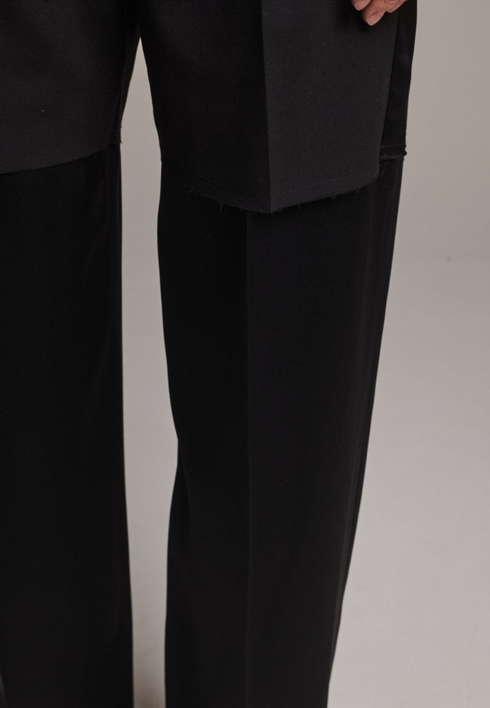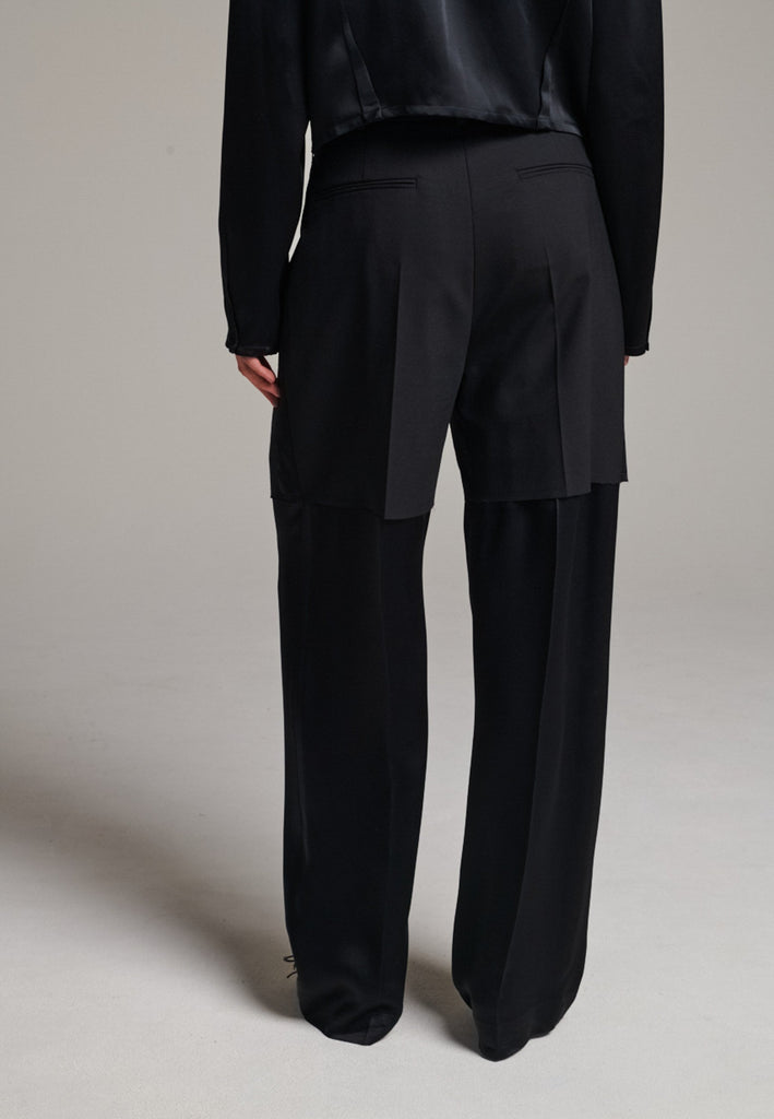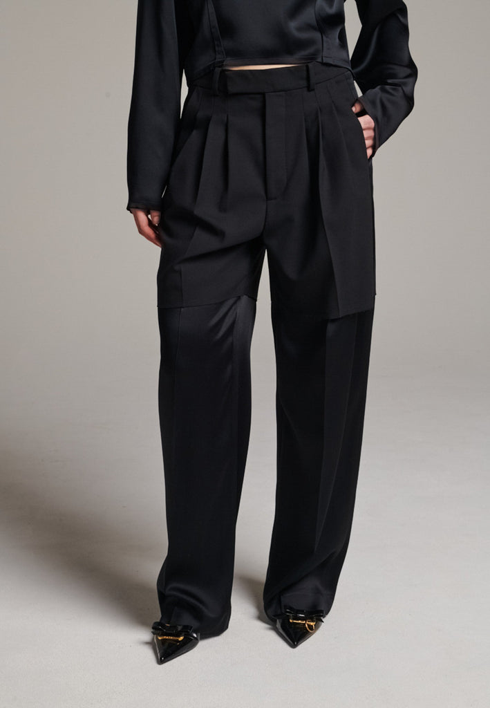 Designed with a bold take on contemporary tailoring, these trousers feature a color-blocked construction that creates a striking visual contrast. The upper section, is rendered in one tone, while the lower portion appears in a second, complementary color. The division between the two is created through the raw-edged overlap of the top fabric over the bottom. A sleek satin stripe runs along the side seams, adding a refined touch of shine and elongating the silhouette. With their wide-leg cut and clean button-and-zip closure, these trousers reinterpret classic tailoring with an avant-garde twist.