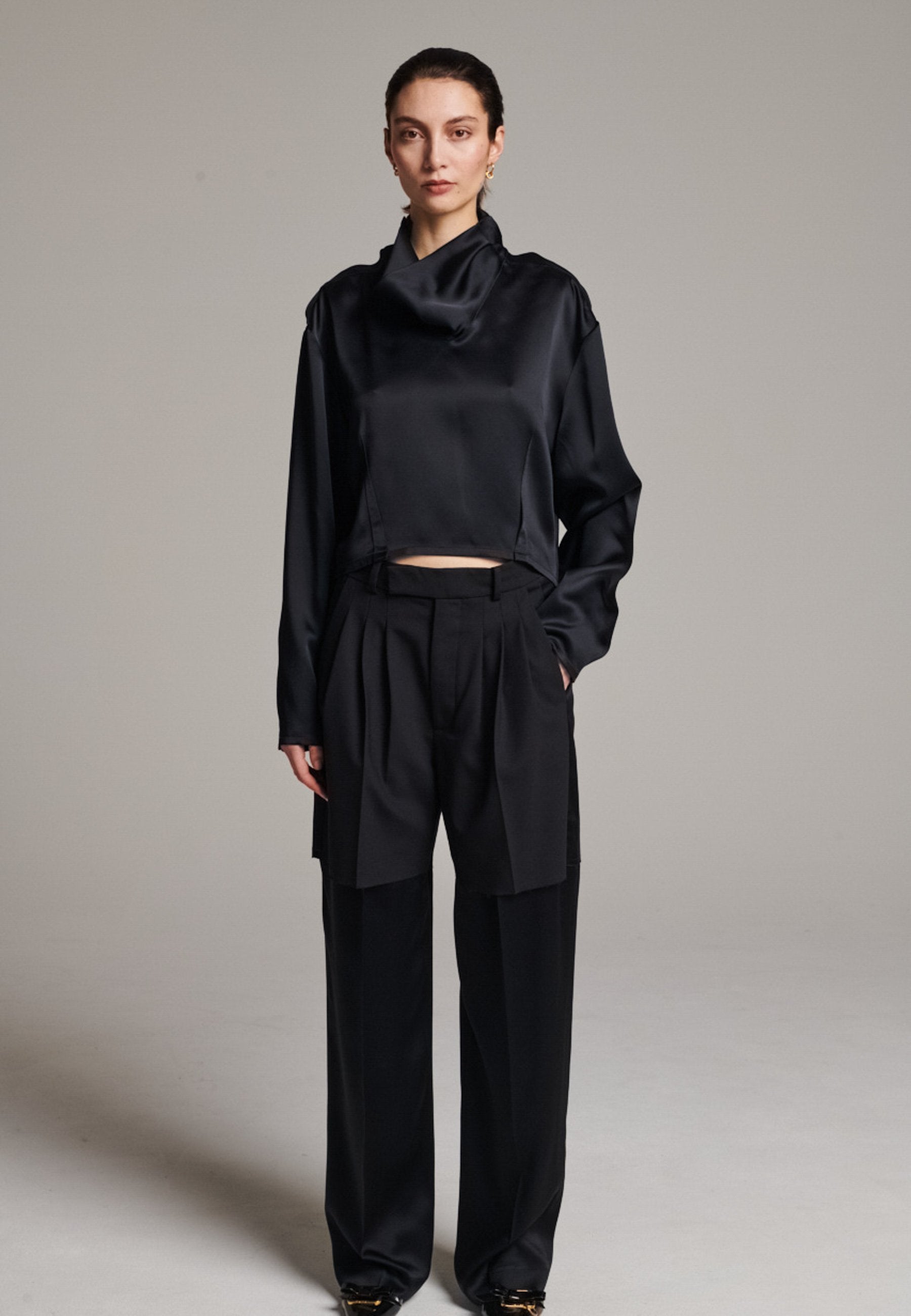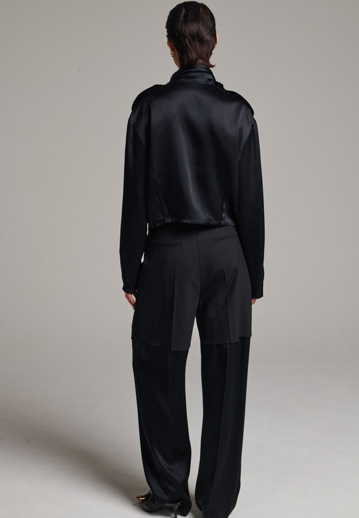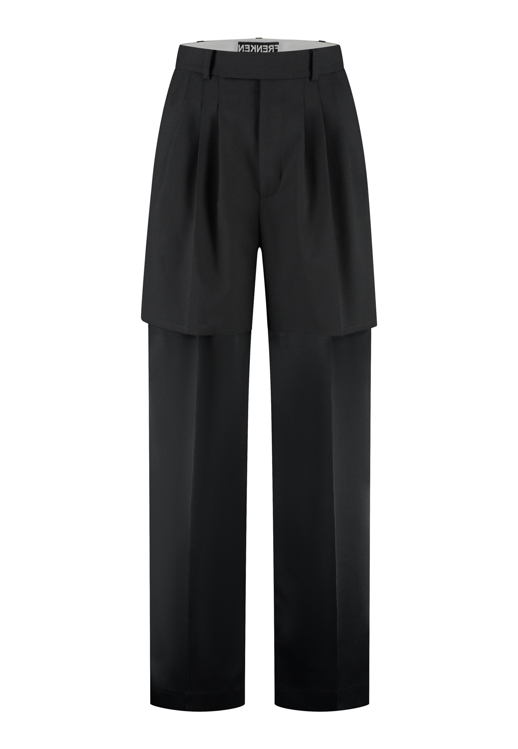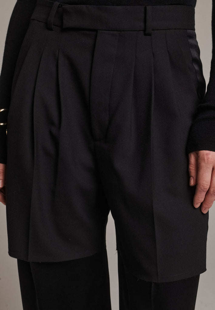 Designed with a bold take on contemporary tailoring, these trousers feature a color-blocked construction that creates a striking visual contrast. The upper section, is rendered in one tone, while the lower portion appears in a second, complementary color. The division between the two is created through the raw-edged overlap of the top fabric over the bottom. A sleek satin stripe runs along the side seams, adding a refined touch of shine and elongating the silhouette. With their wide-leg cut and clean button-and-zip closure, these trousers reinterpret classic tailoring with an avant-garde twist.