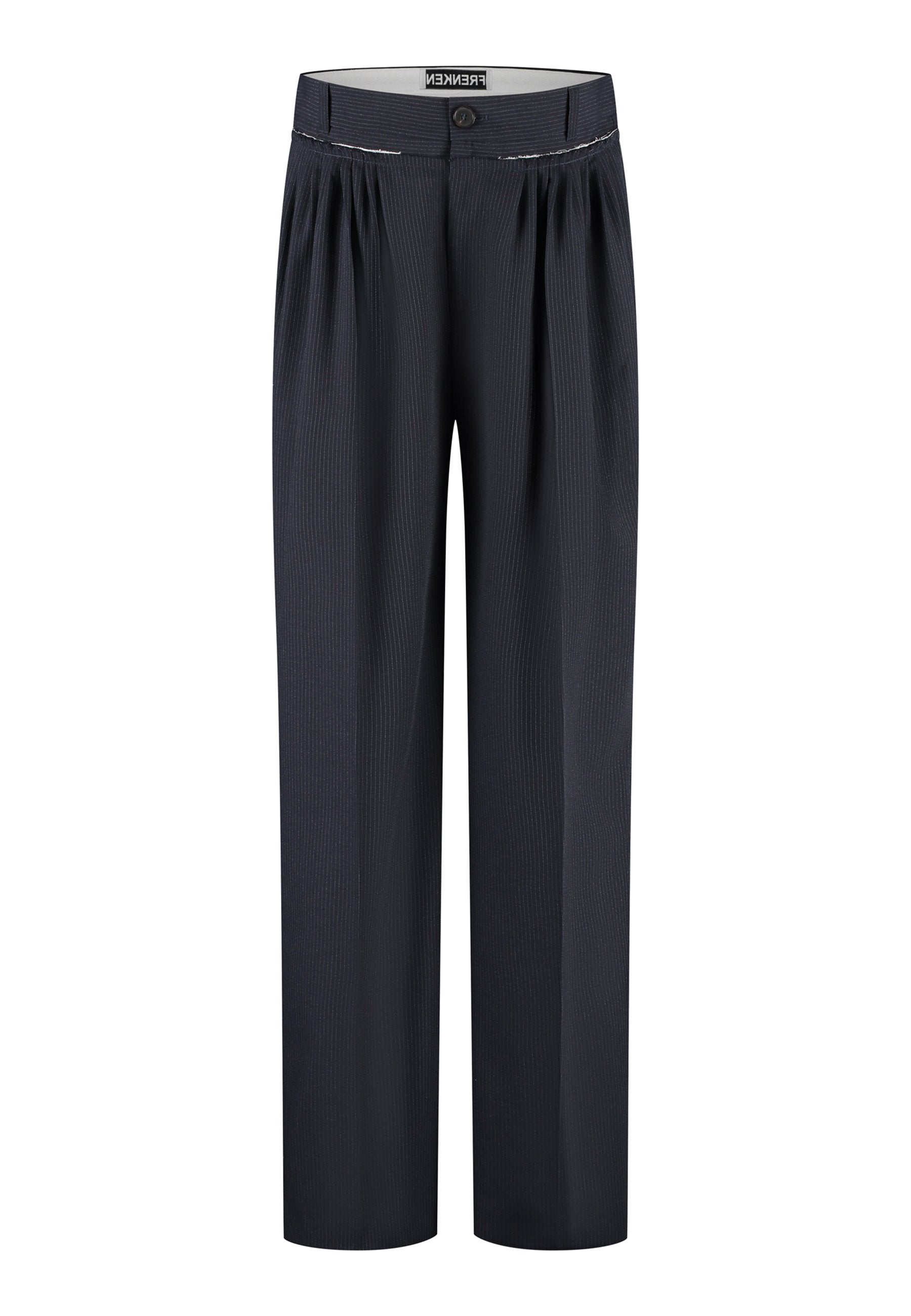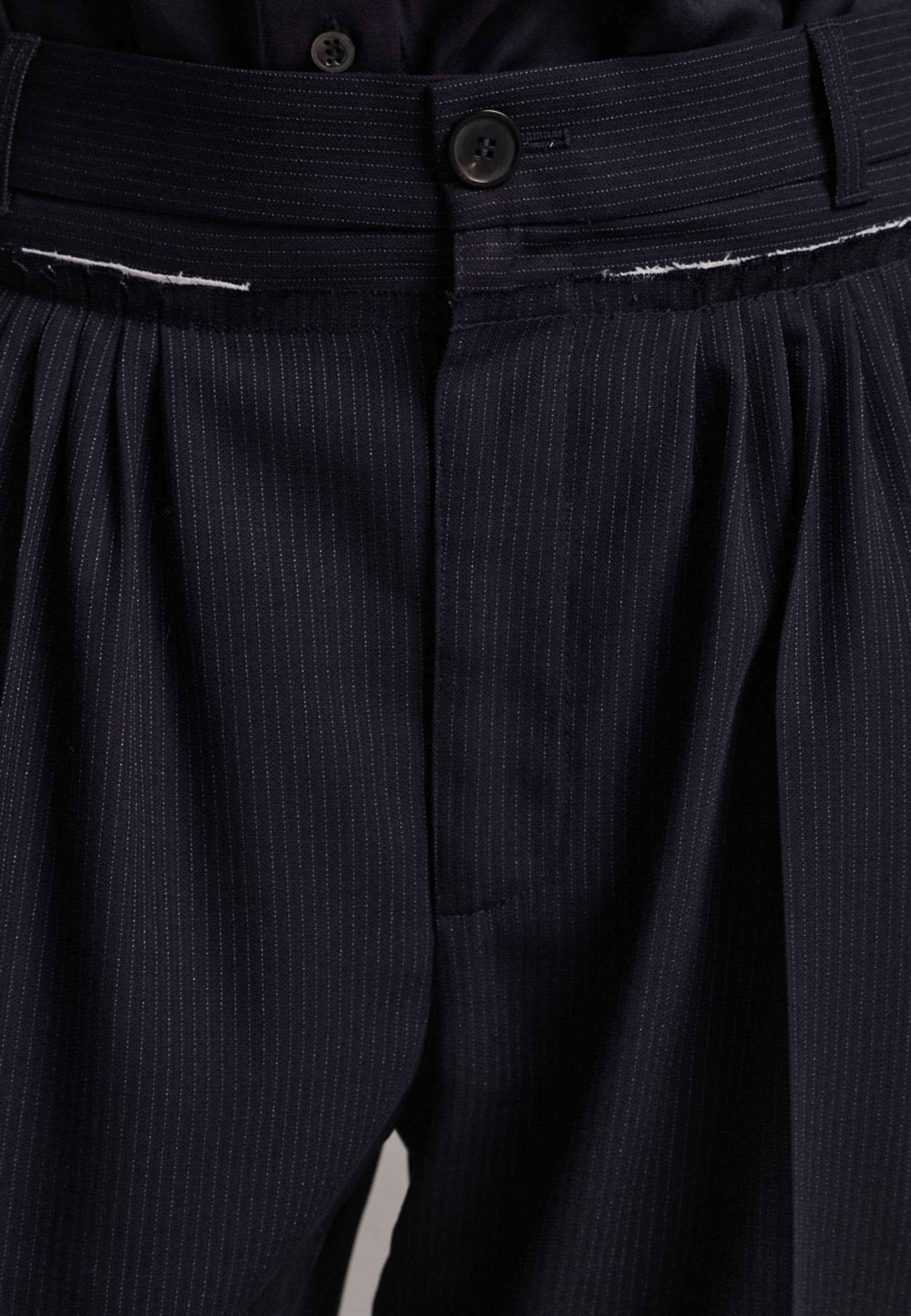 Straight-leg trousers with a classic cut, elevated by subtle yet striking details. The unfinished waistband adds a raw, intentional edge, contrasting with the otherwise clean silhouette. Glossy black fabric stripe runs down the side seams, bringing a touch of texture and definition to the navy pinstripe base. A refined everyday piece with a modern, deconstructed twist.