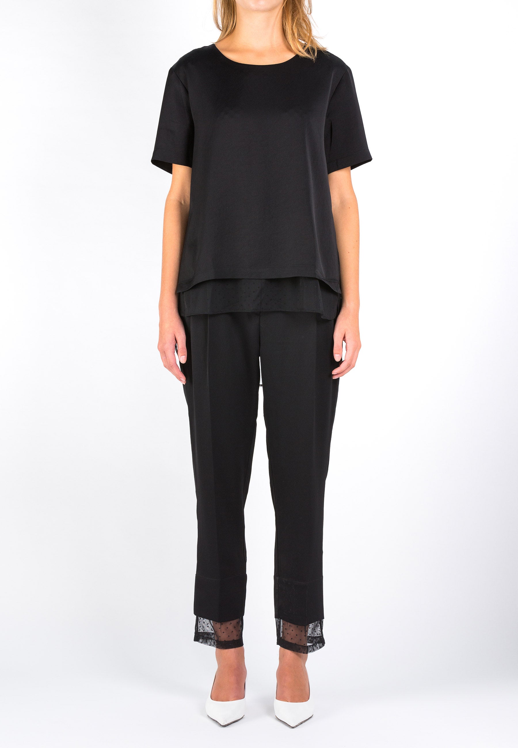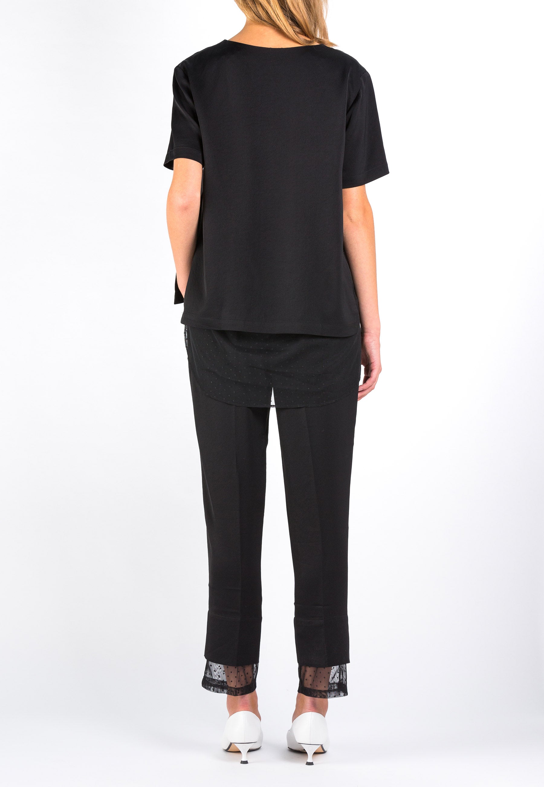 Cut from soft satin, Parallel is a black tailored pant with a twist. Pleated around the waistline with pressed creases along the leg line, this pant has a double-layered hem made by a second shell of polkadot tulle. Pair it with the matching top Overcast. Model wears a size 36.
