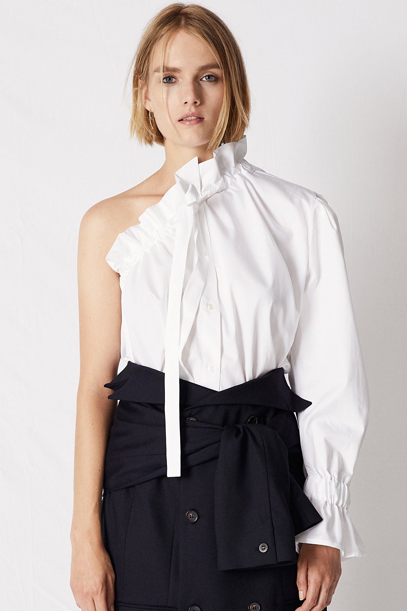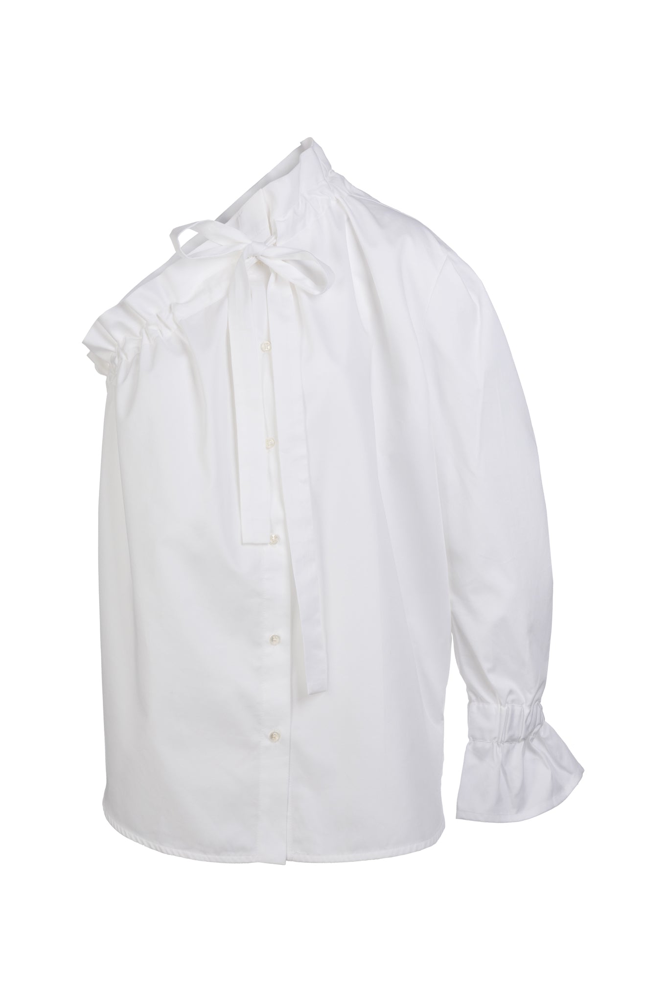 Asymmetric ruffle shirt. Shaped with a single balloon sleeve. Made from crispy cotton poplin. Model wears a size 36
