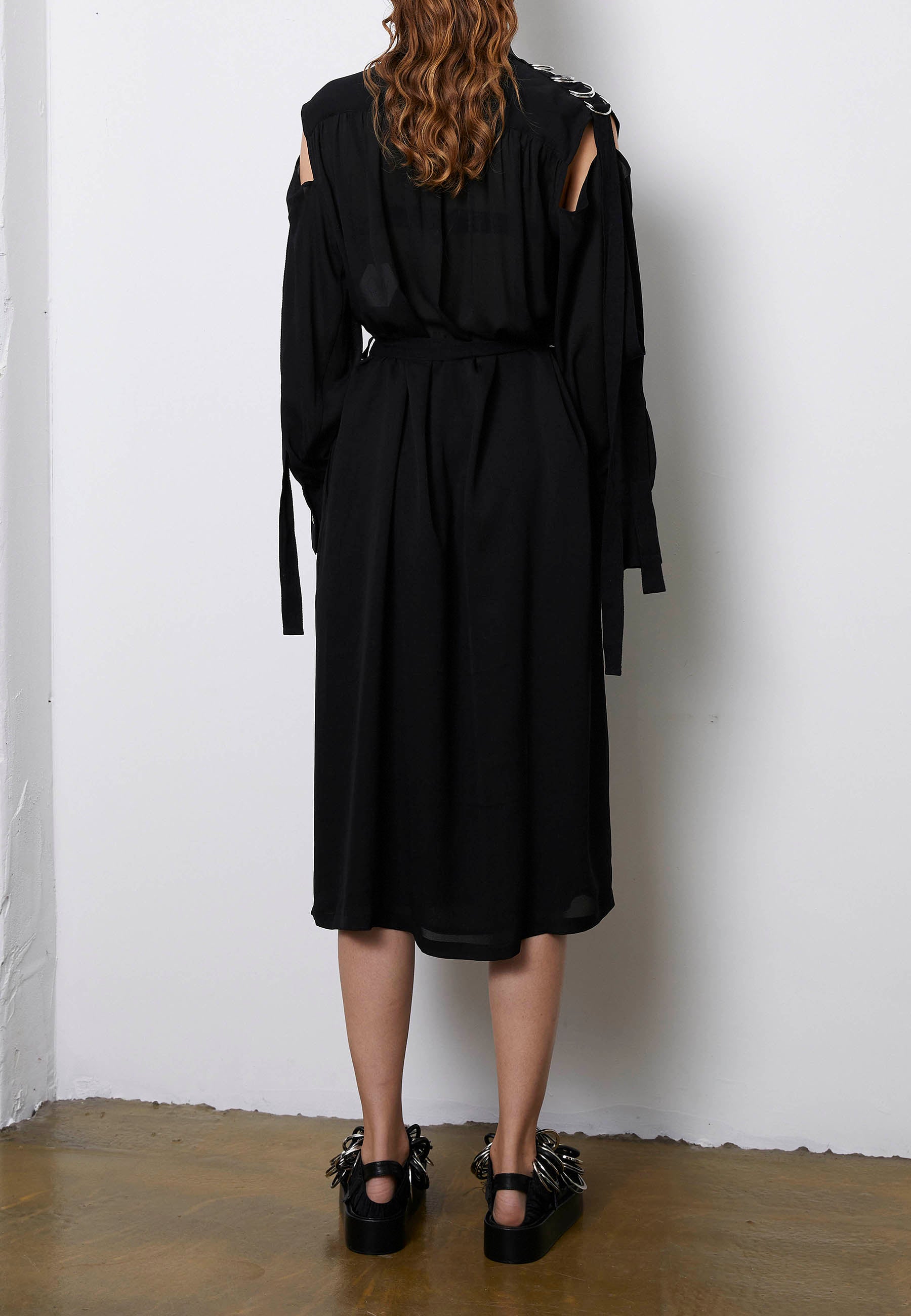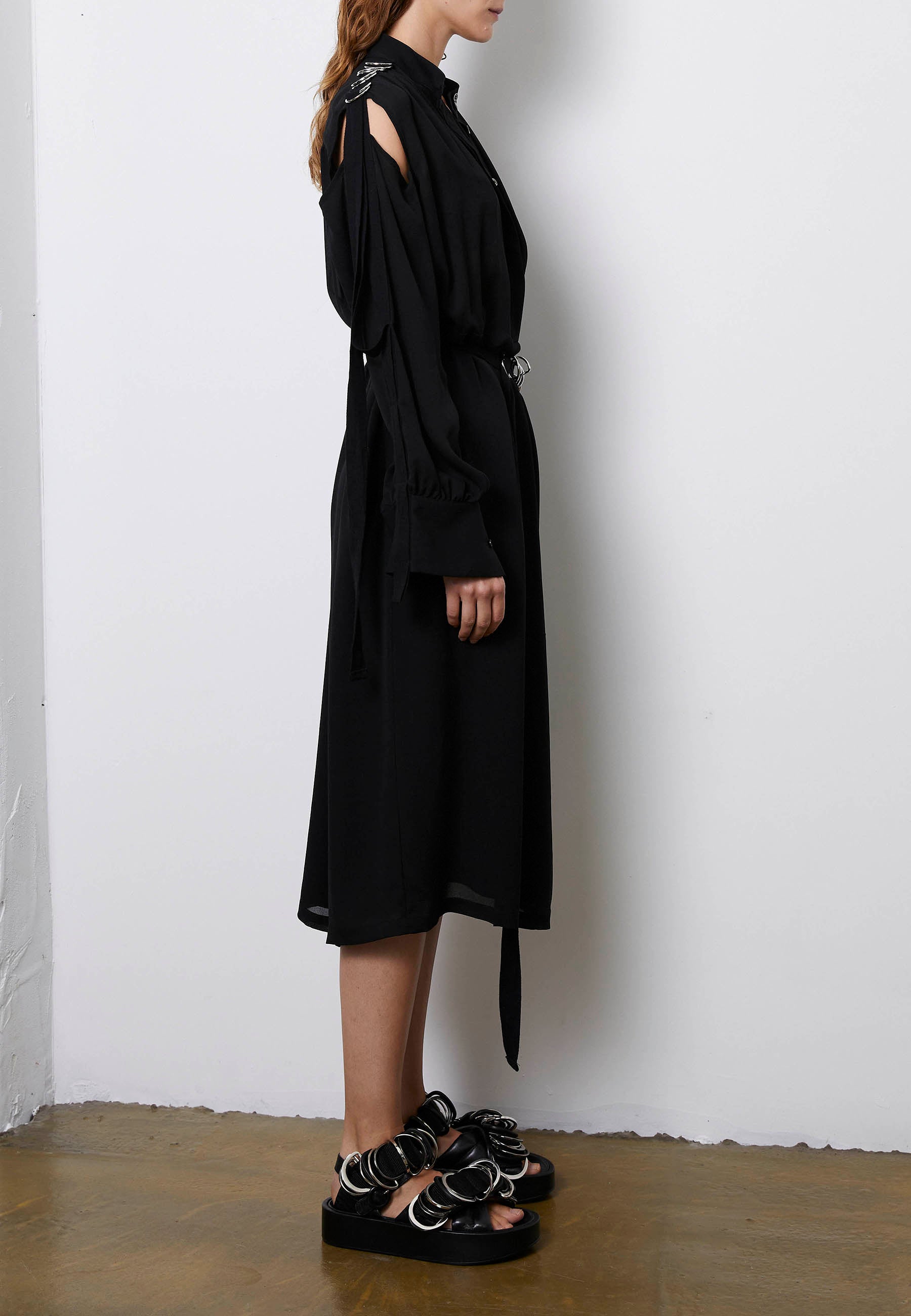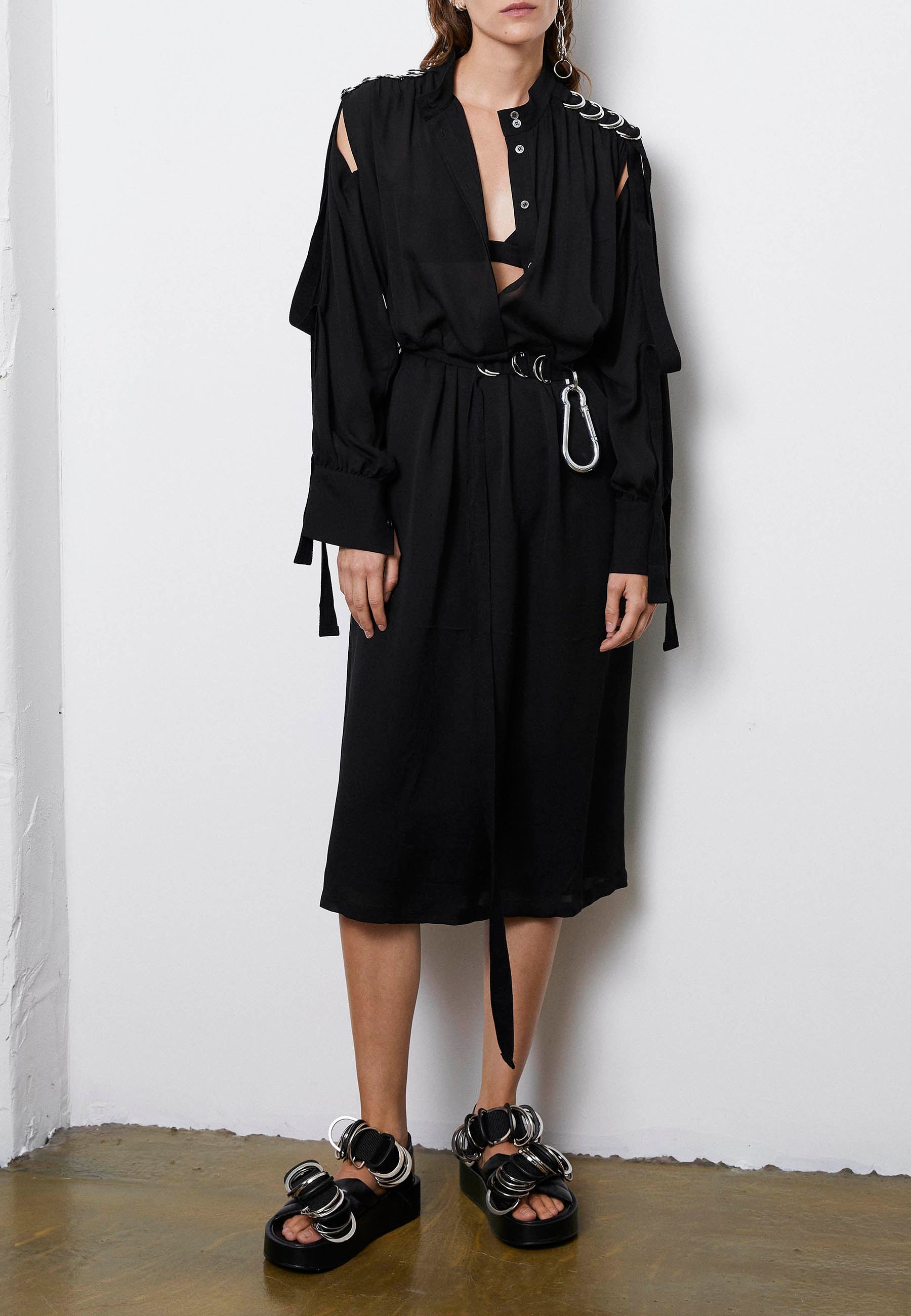 Cut from the finest crepe the chine silk, Course is a shirt dress, detailed with a slit at the shoulders and elegant straps adorned with metal D-rings that define the shoulder line. To achieve the most elegant figure it also comes with a belt made of a cotton grosgrain and finished with the metallic D-rings joining the unexpected and the perfect fitting with the richest materials. For a sense of ease, this style has pockets at the side seam. Also available in off-white.