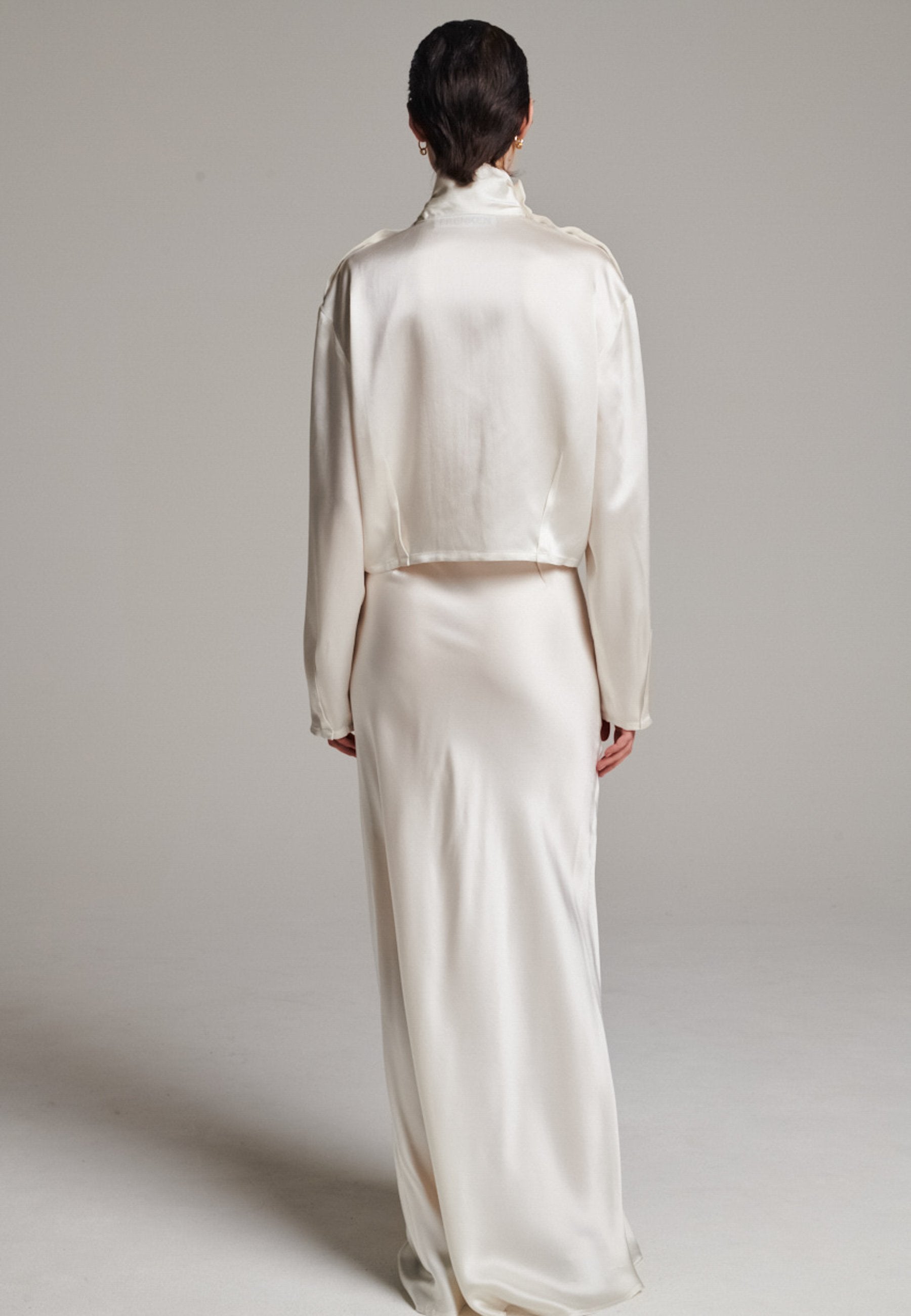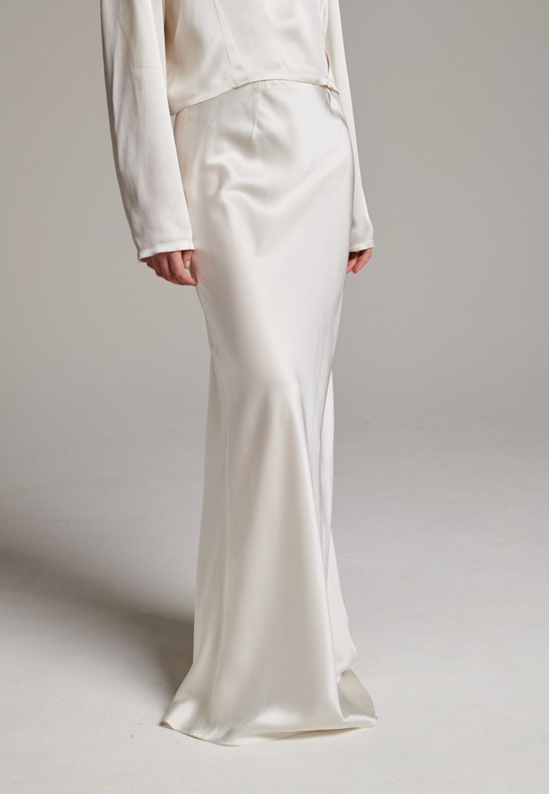 Flowy ivory skirt with a refined, elongated silhouette. Crafted from lightweight fabric with soft movement and an elegant drape. Front and back darts are intentionally exposed, adding subtle structure and a tailored finish to the fluid shape. A quiet statement piece, effortlessly balancing form and flow.