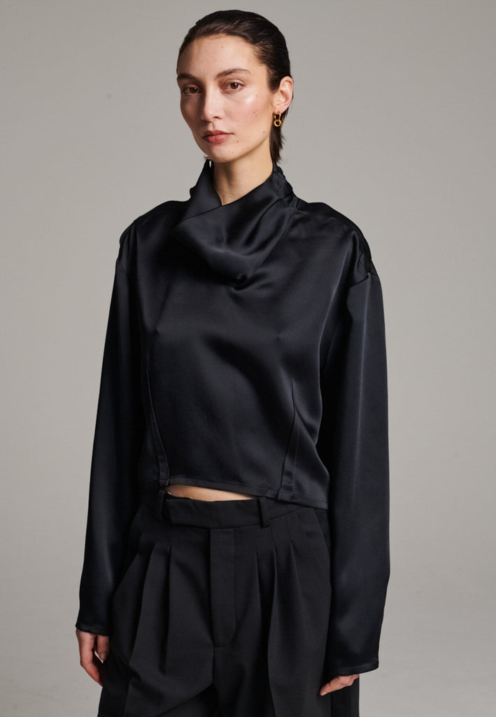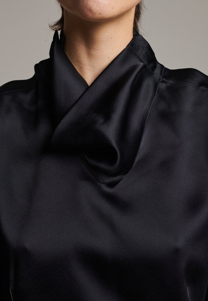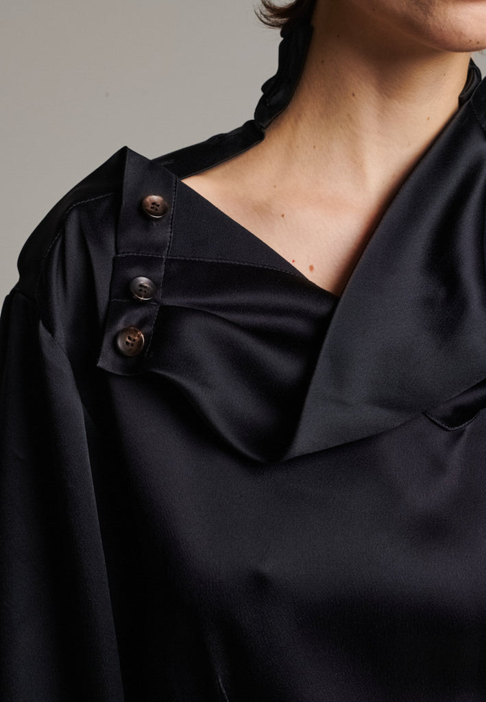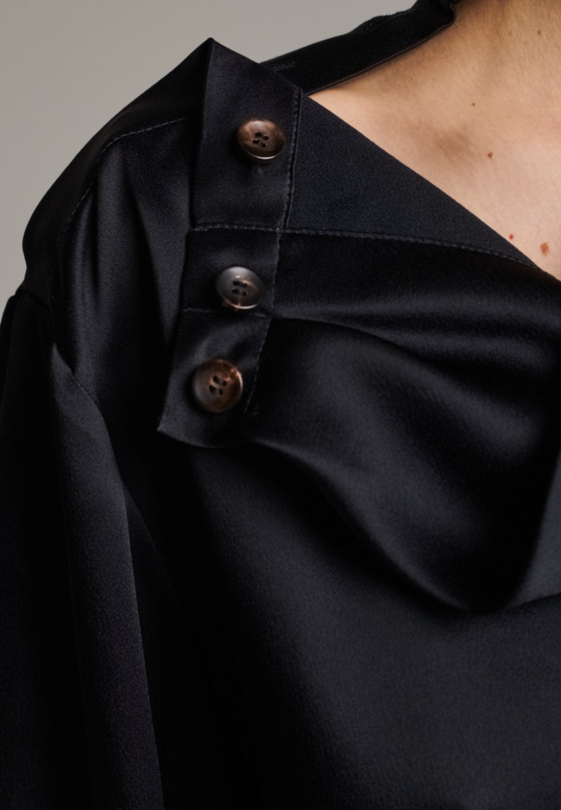 Elevate your wardrobe with this top, a refined and elegant piece crafted from lustrous satin for a smooth, fluid drape. Featuring a black hue, this top is designed with a unique draped neckline that can be styled open or secured with chic tonal buttons at the shoulder for a modern twist. The long sleeves and relaxed silhouette offer effortless sophistication, making it perfect for both polished daywear and elevated evening looks.