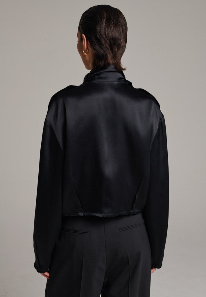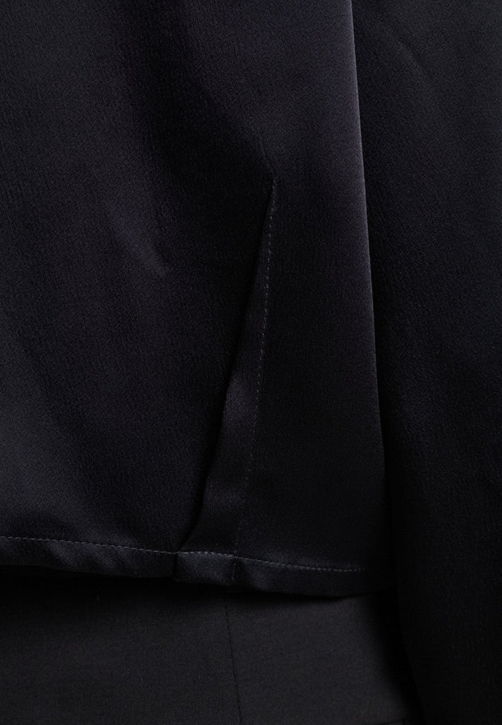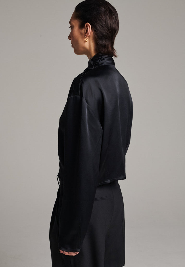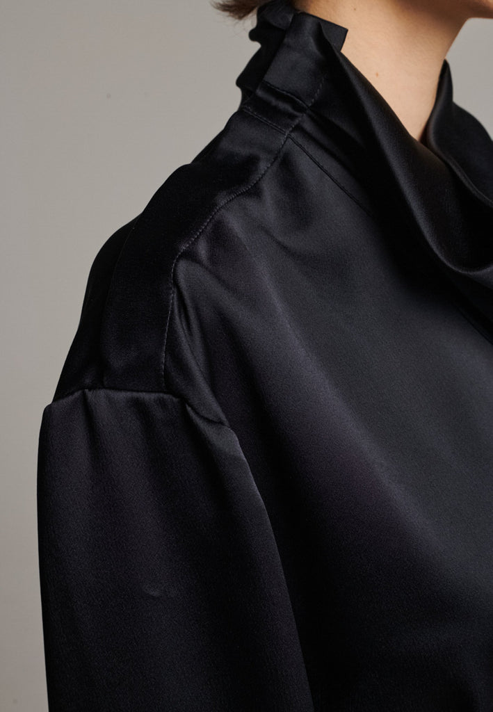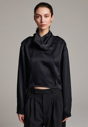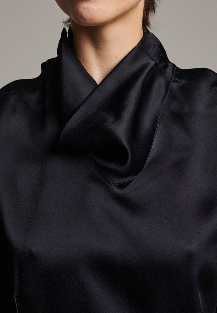 Elevate your wardrobe with this top, a refined and elegant piece crafted from lustrous satin for a smooth, fluid drape. Featuring a black hue, this top is designed with a unique draped neckline that can be styled open or secured with chic tonal buttons at the shoulder for a modern twist. The long sleeves and relaxed silhouette offer effortless sophistication, making it perfect for both polished daywear and elevated evening looks.