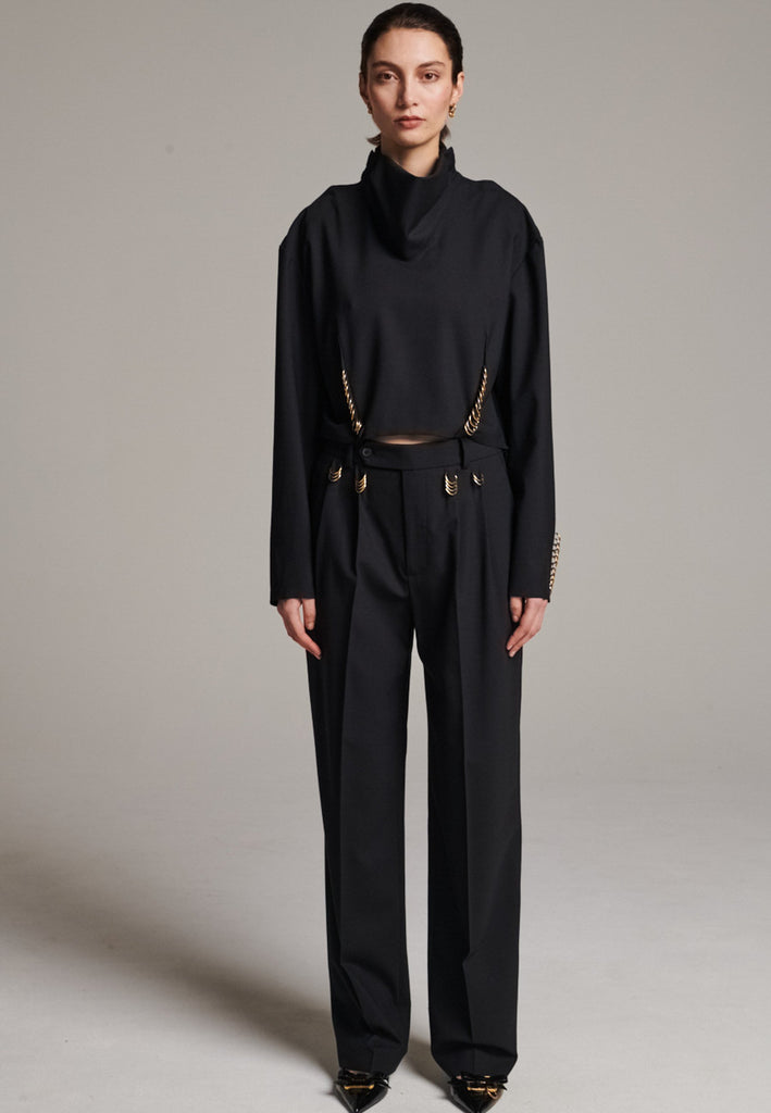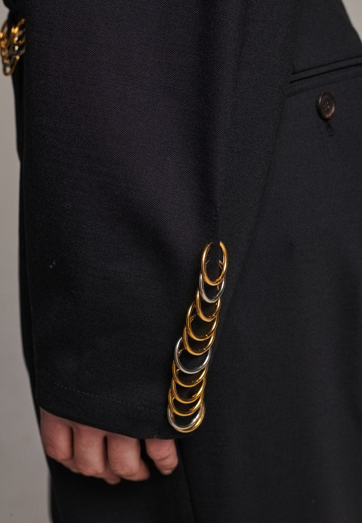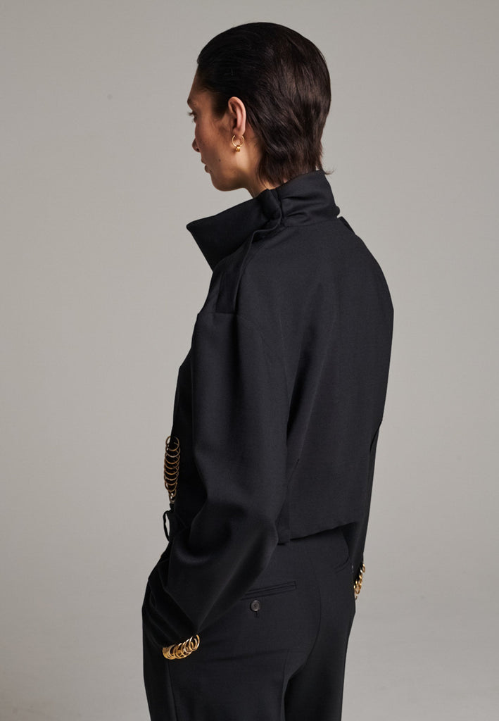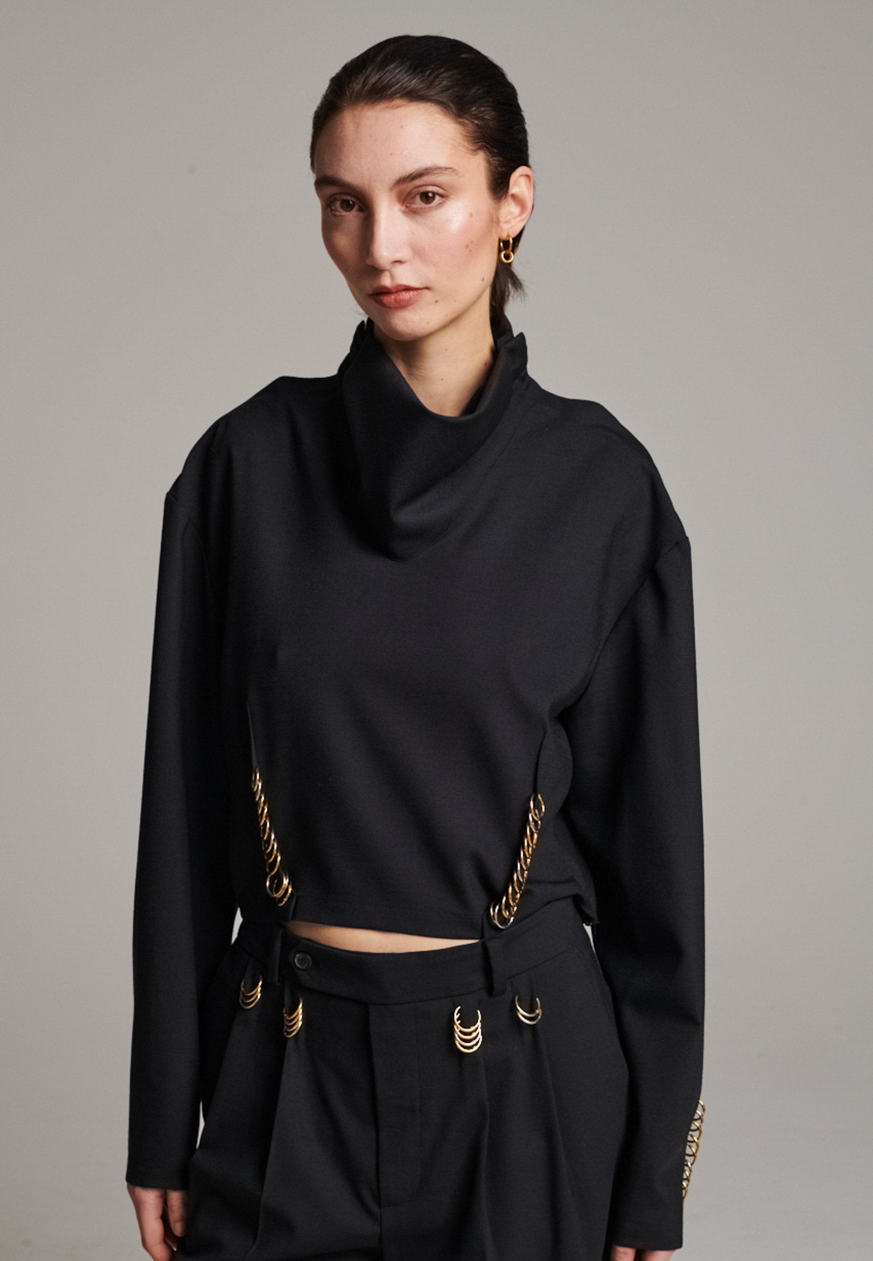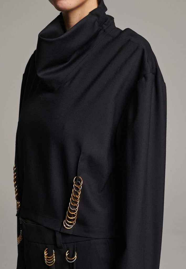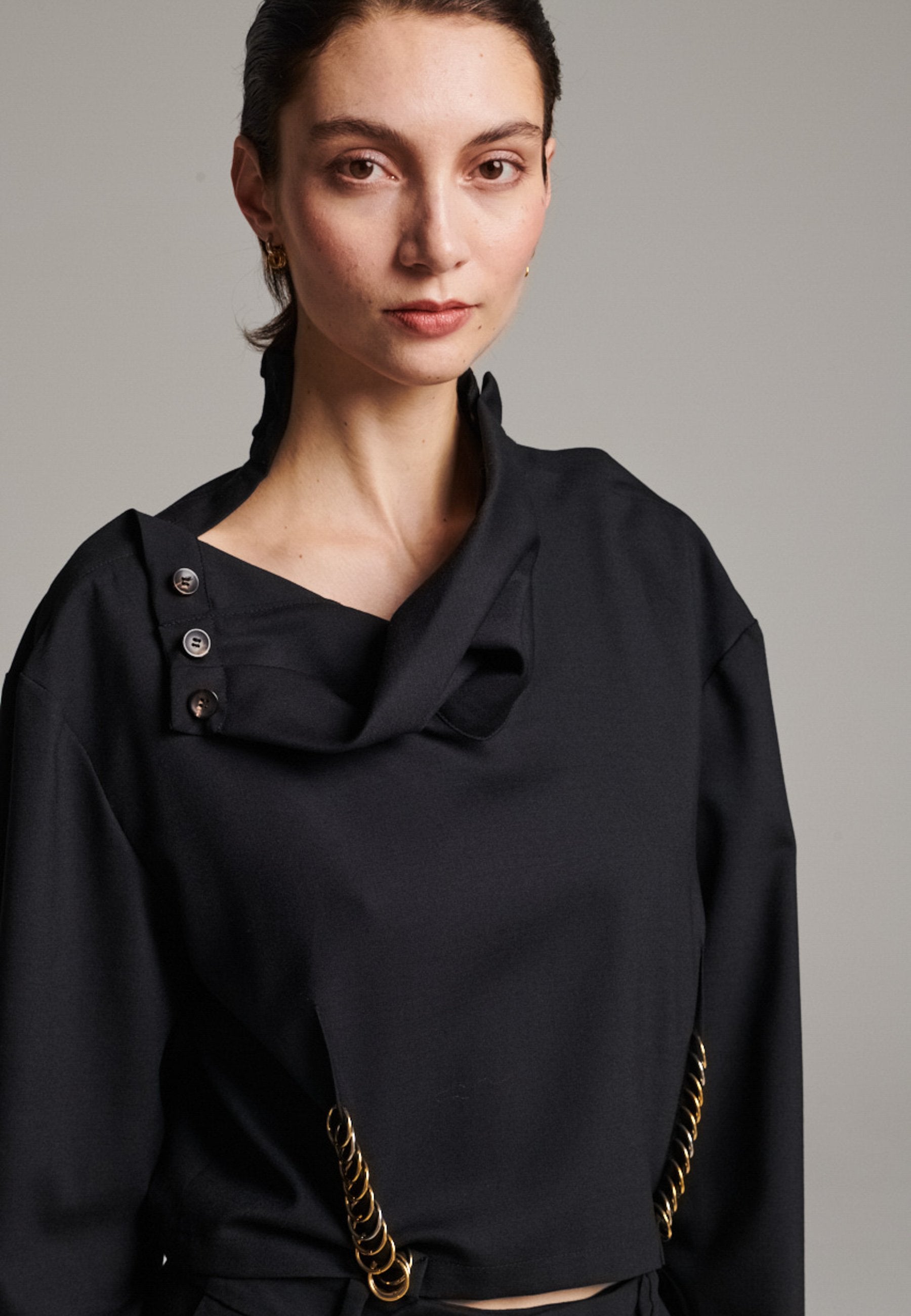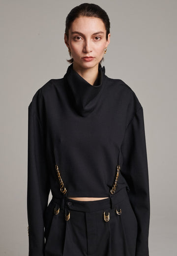 A statement piece blending sculptural tailoring with subversive detail. Crafted from blend wool, it features a draped high neckline and a cropped silhouette that plays with proportion. Bold gold chain hooks anchor the design at the sides, adding a touch of industrial edge to its refined form.