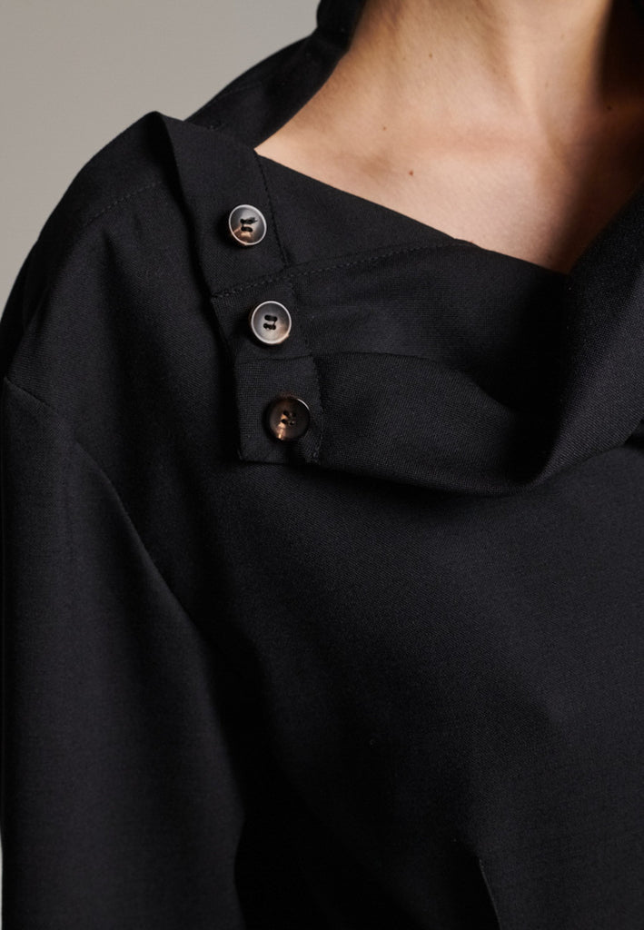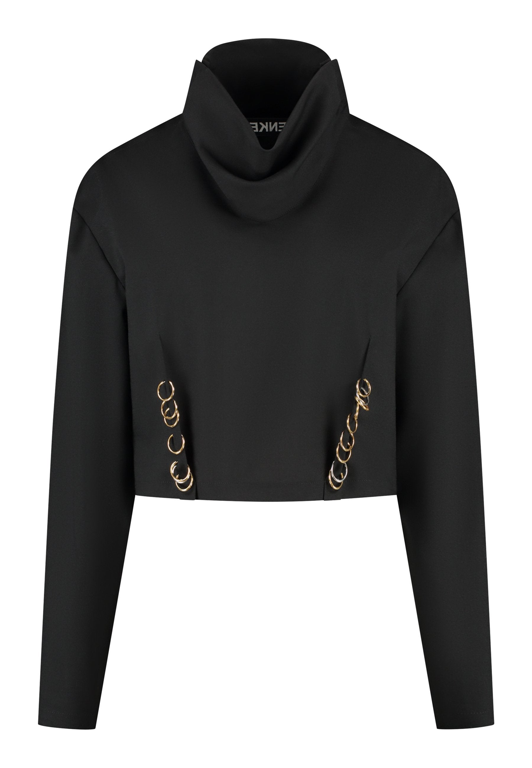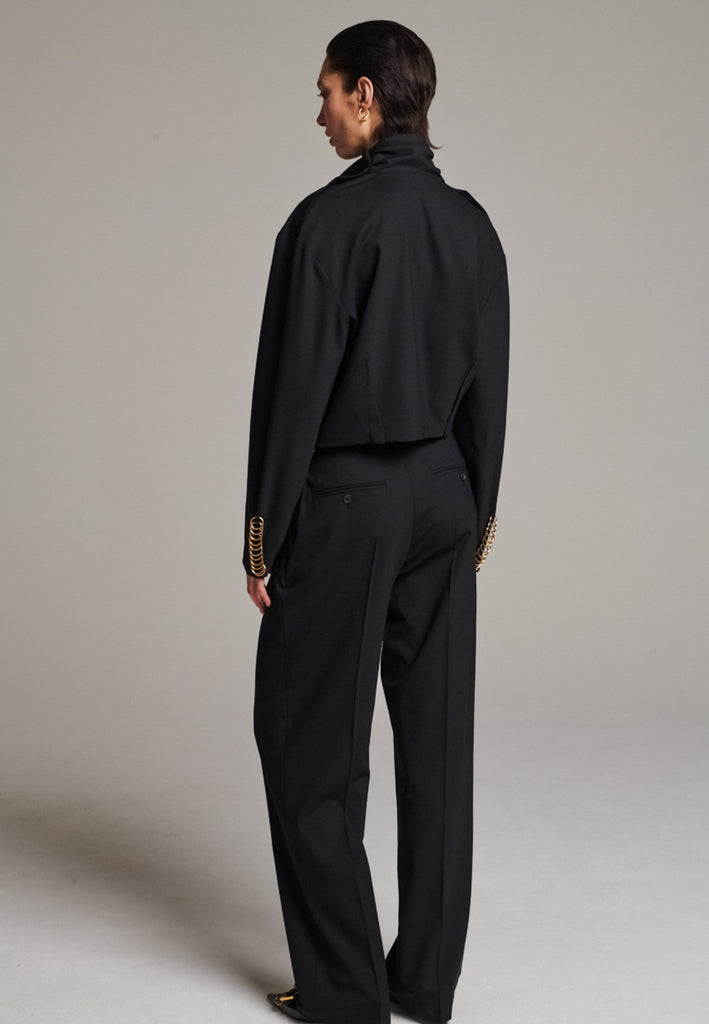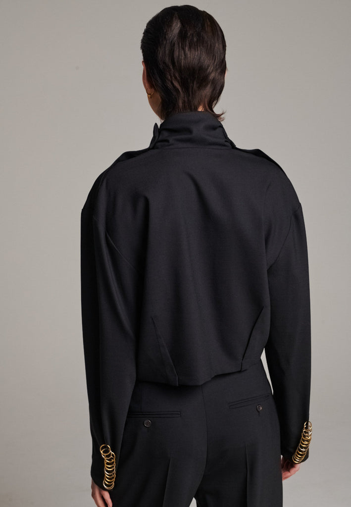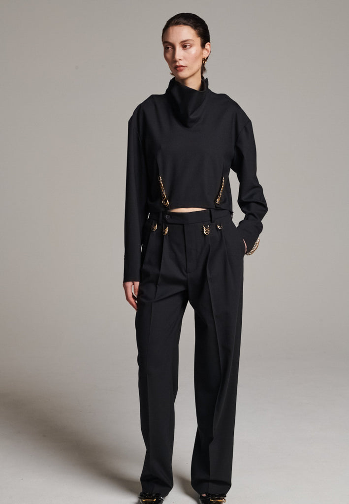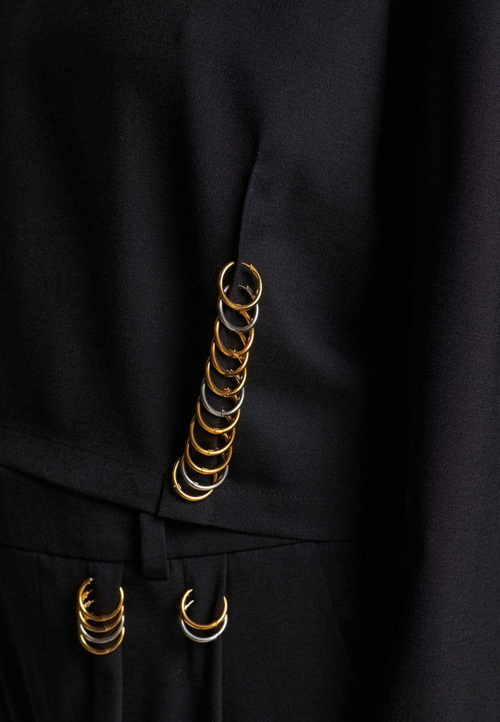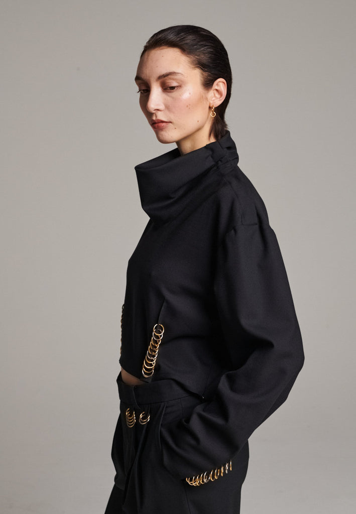 A statement piece blending sculptural tailoring with subversive detail. Crafted from blend wool, it features a draped high neckline and a cropped silhouette that plays with proportion. Bold gold chain hooks anchor the design at the sides, adding a touch of industrial edge to its refined form.