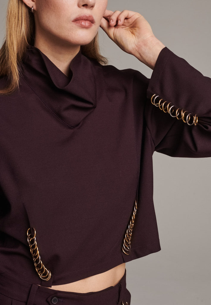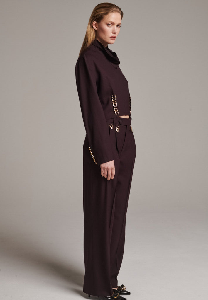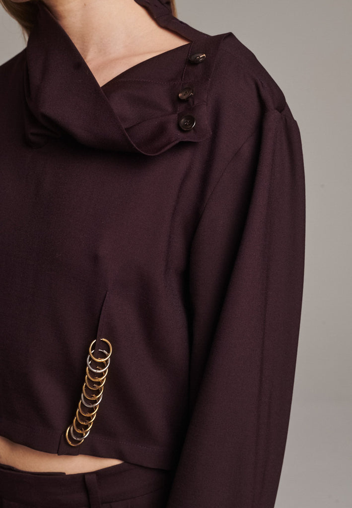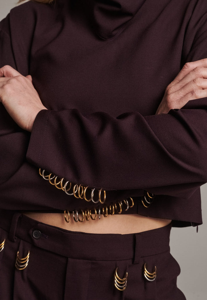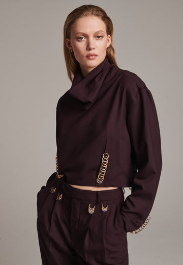 A statement piece blending sculptural tailoring with subversive detail. Crafted from blend wool, it features a draped high neckline and a cropped silhouette that plays with proportion. Bold gold chain hooks anchor the design at the sides, adding a touch of industrial edge to its refined form.