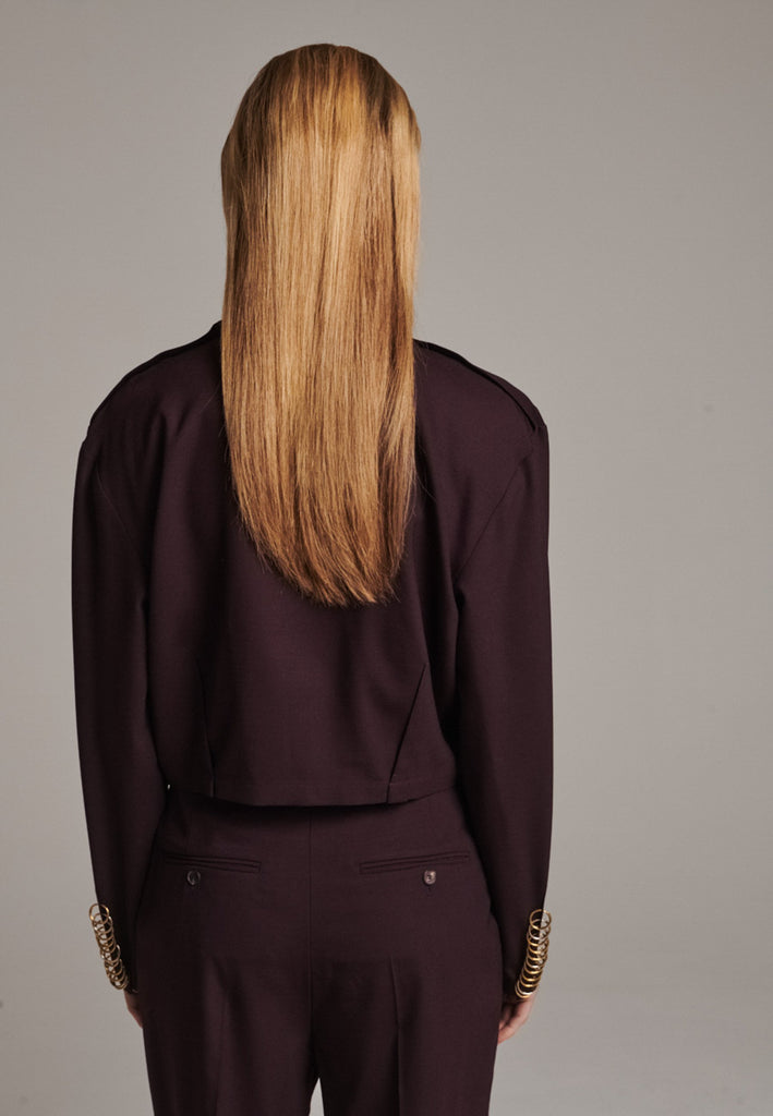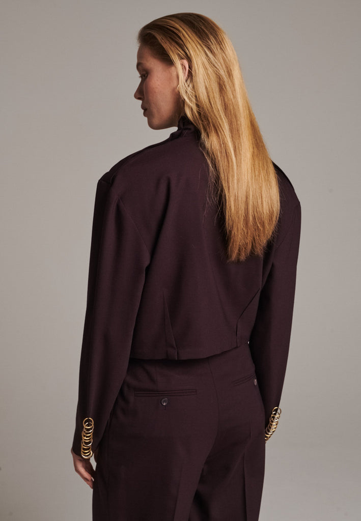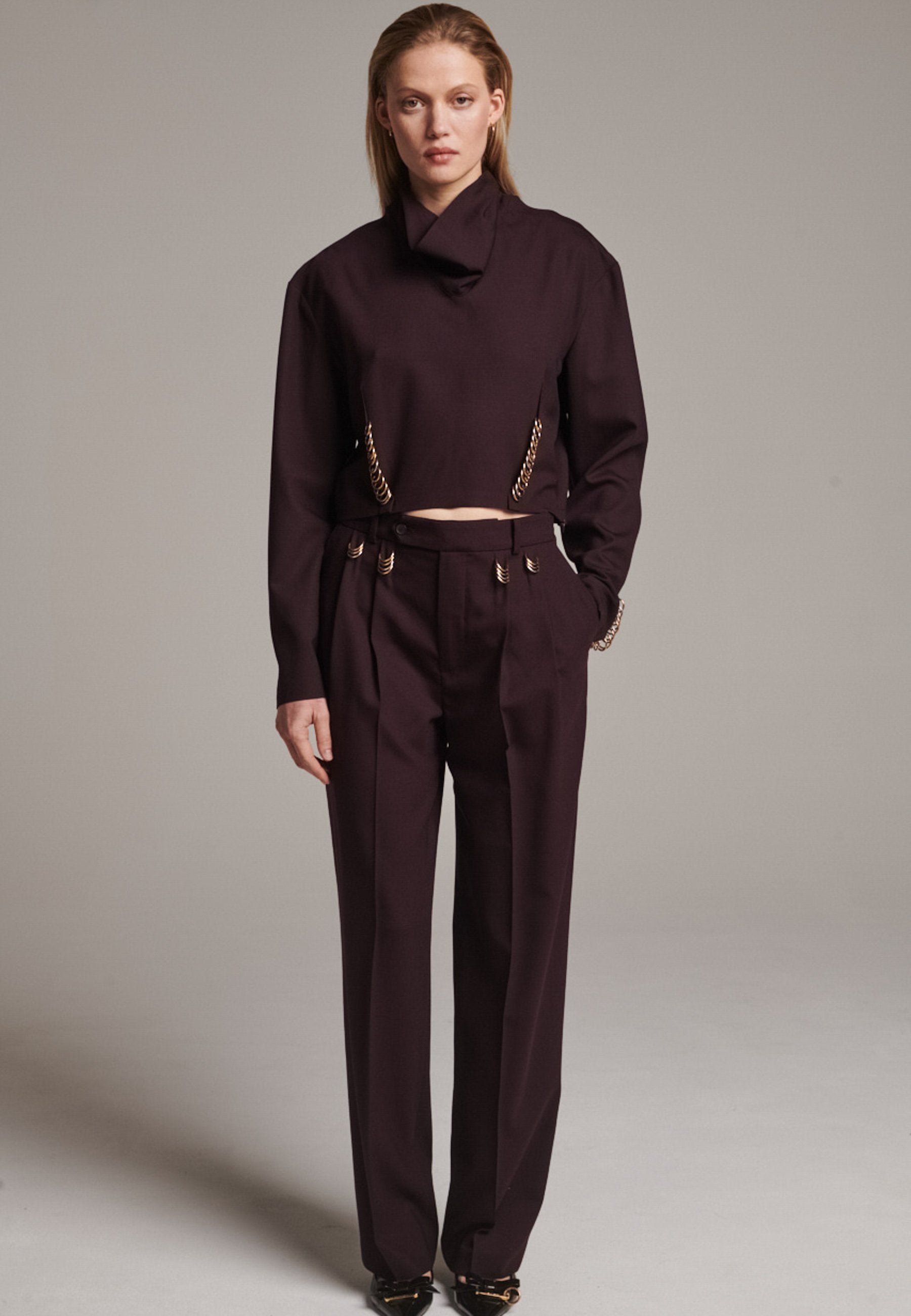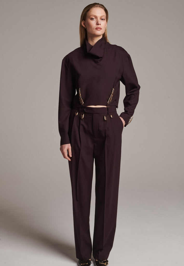 A statement piece blending sculptural tailoring with subversive detail. Crafted from blend wool, it features a draped high neckline and a cropped silhouette that plays with proportion. Bold gold chain hooks anchor the design at the sides, adding a touch of industrial edge to its refined form.