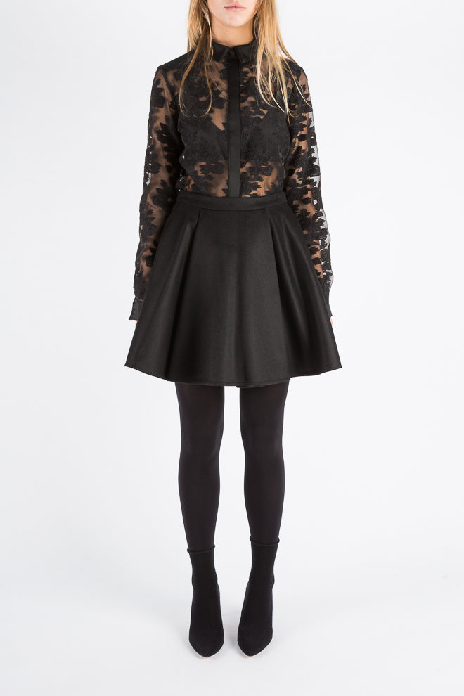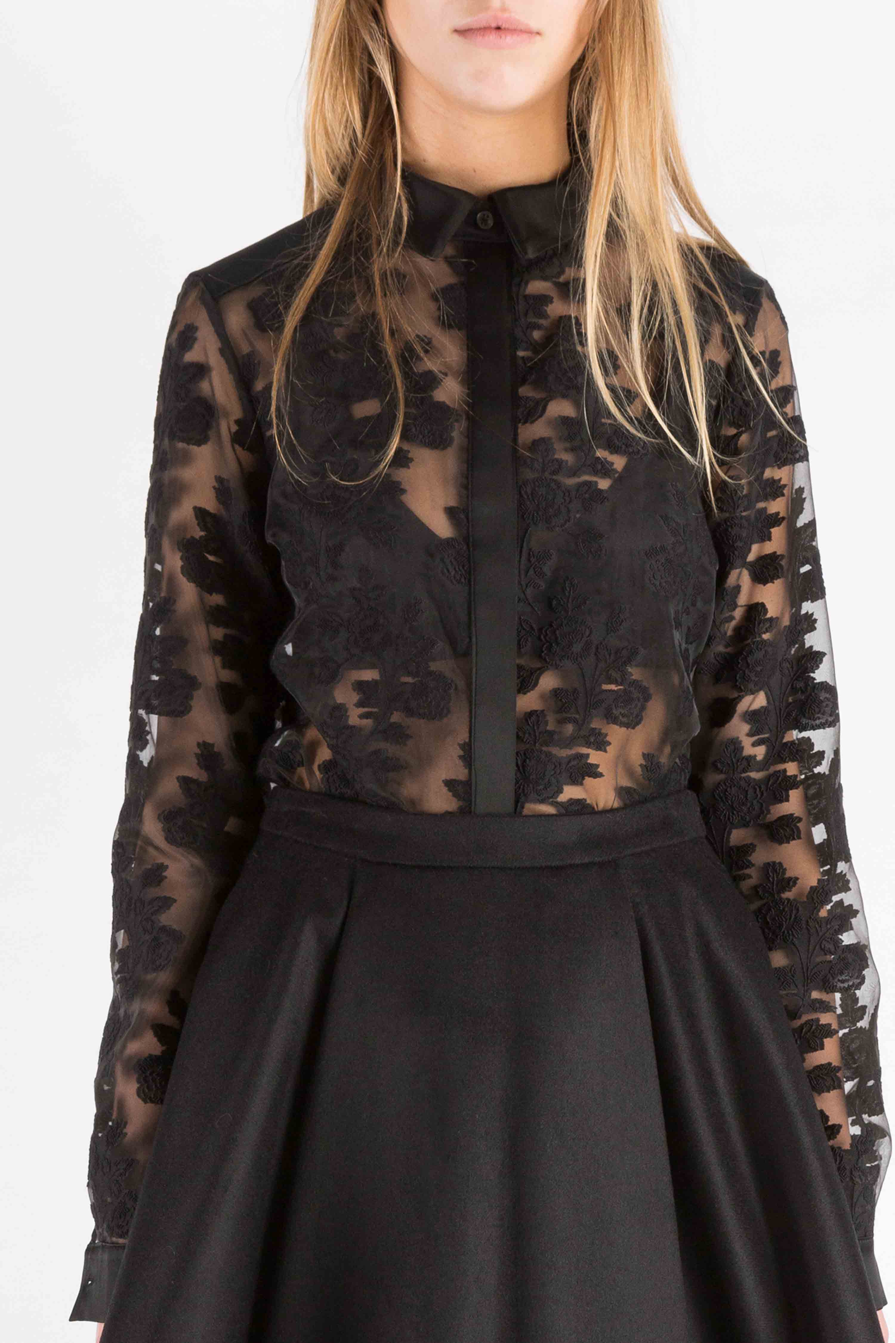Fitted shirt in jacquard/fille coupe with satin collar, cuffs and joke. Fitted, model wears 36.