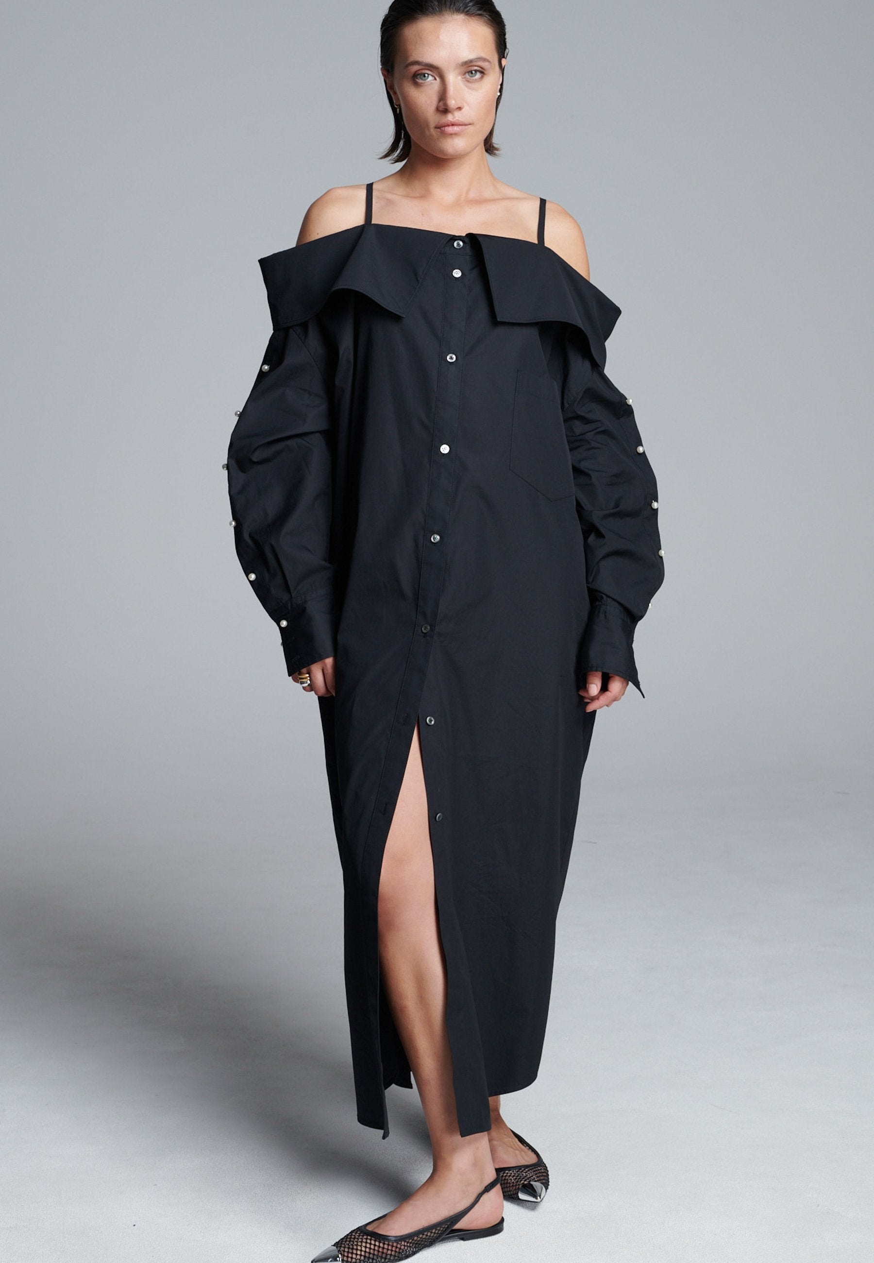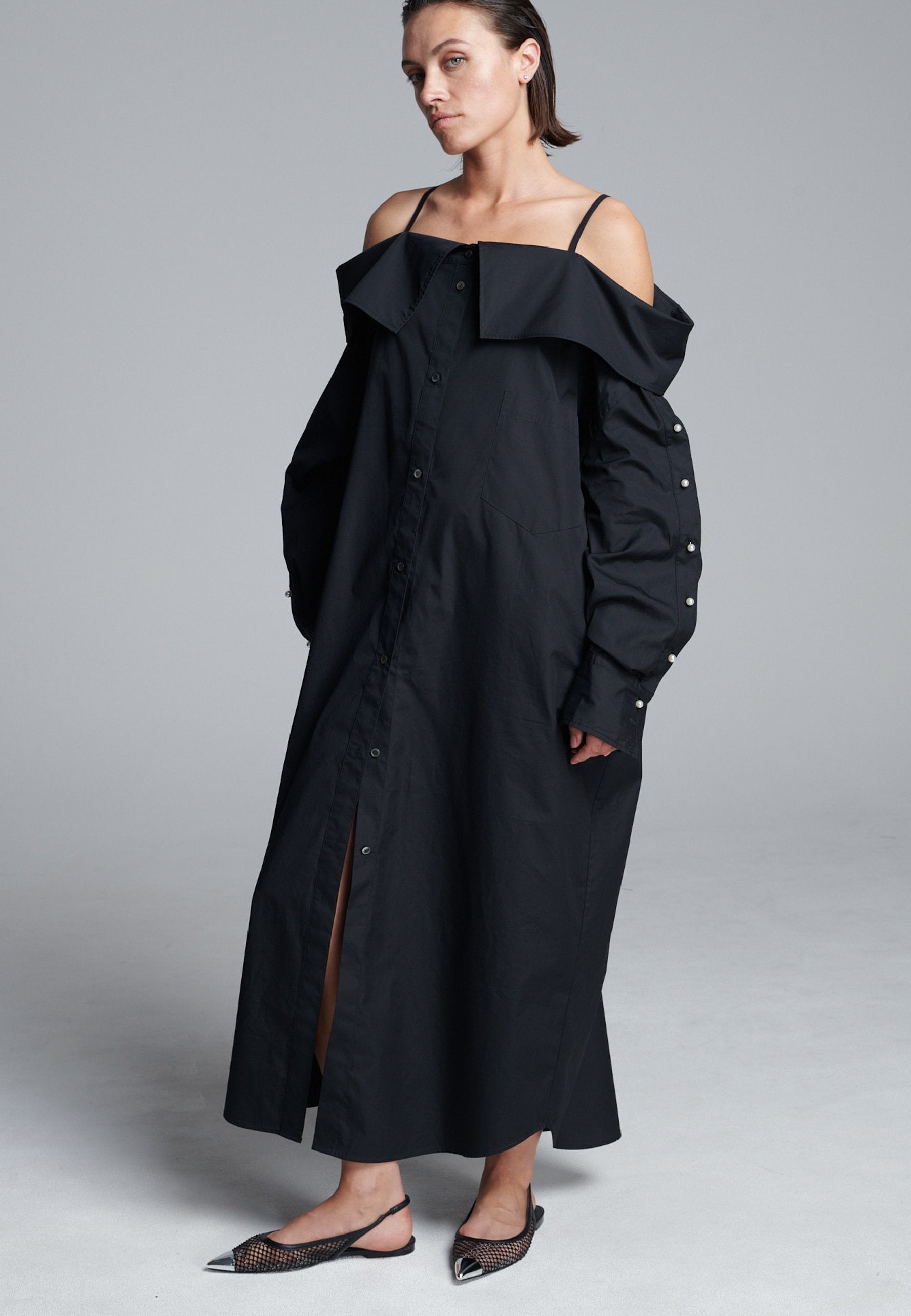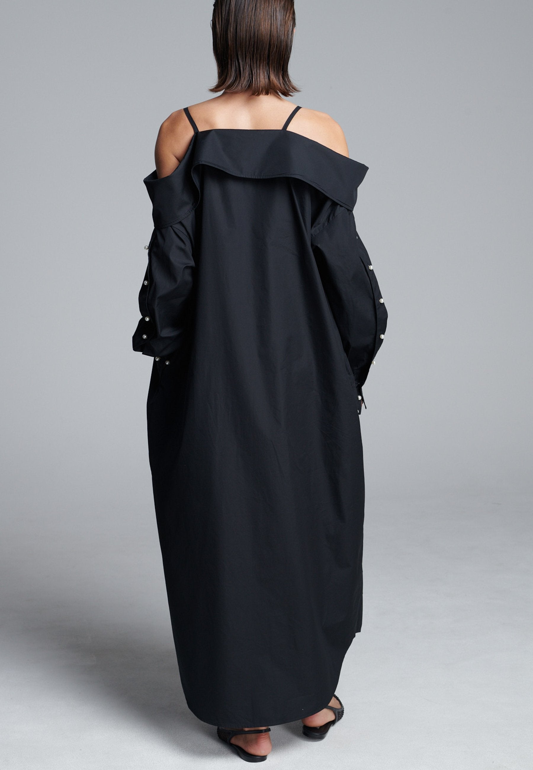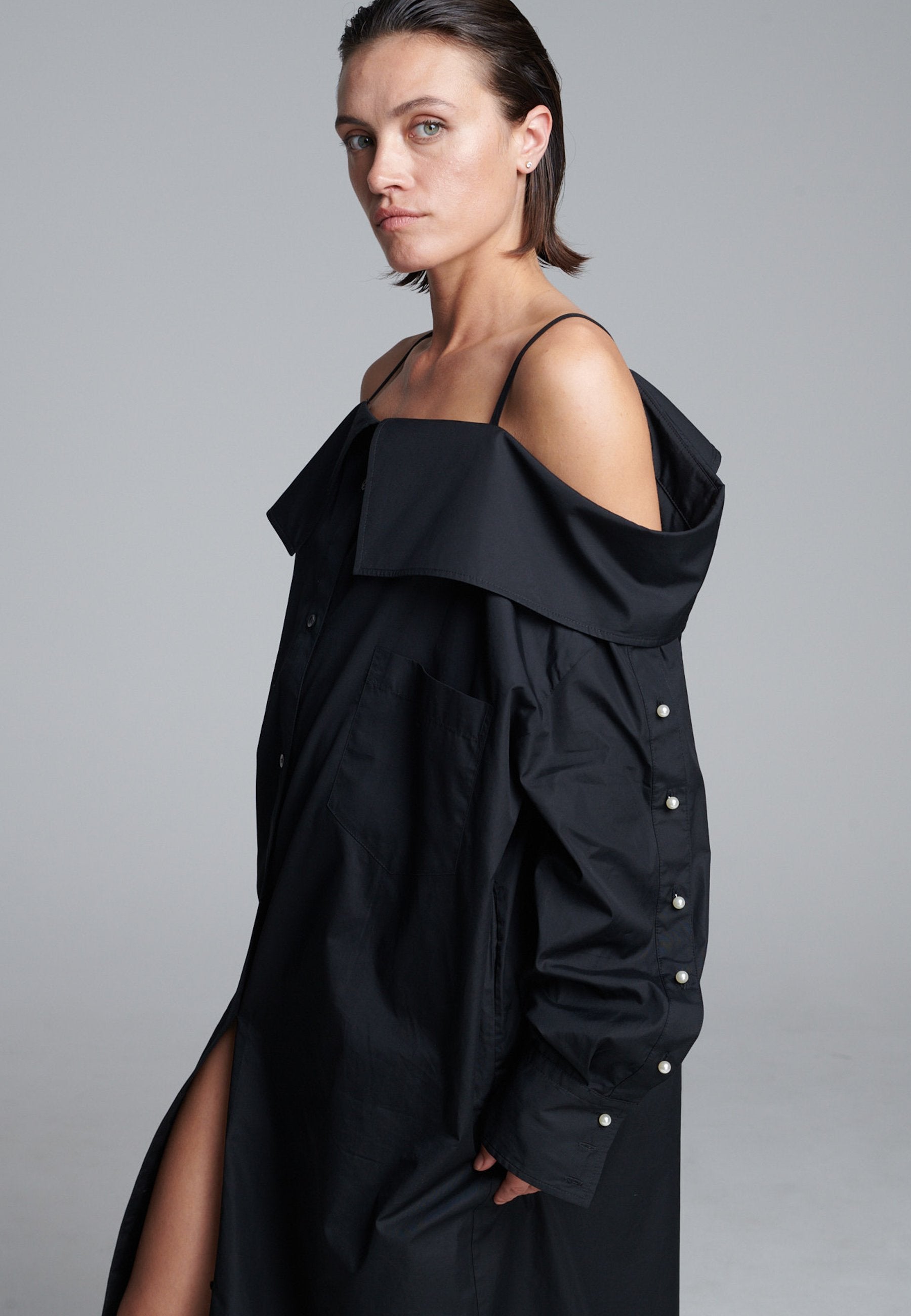 Um decote ombro a ombro emoldurado por alças finas confere a este vestido-camiseiro uma presença marcante e escultural. Cortado em tecido preto nítido, tem uma silhueta alongada e fluida, com fecho de botões à frente e uma fenda lateral alta que adiciona movimento. As mangas oversized, com botões tom sobre tom, introduzem um toque de desconstrução, equilibrando estrutura com fluidez. Perfeito para usar sozinho ou em camadas para um visual mais vanguardista.