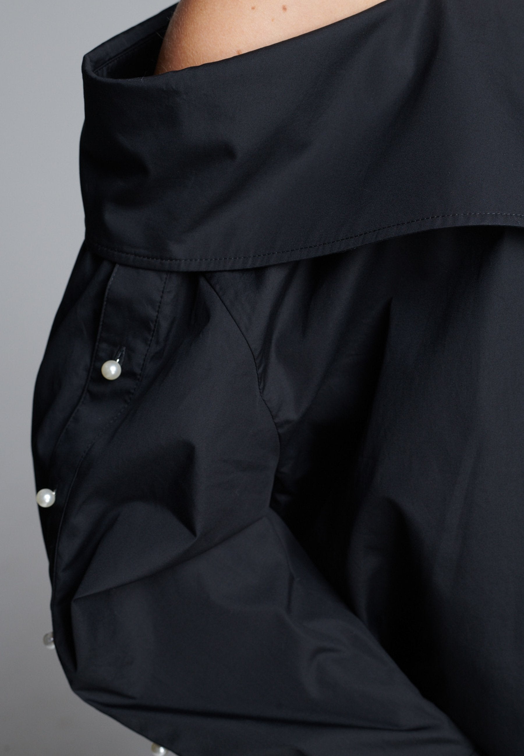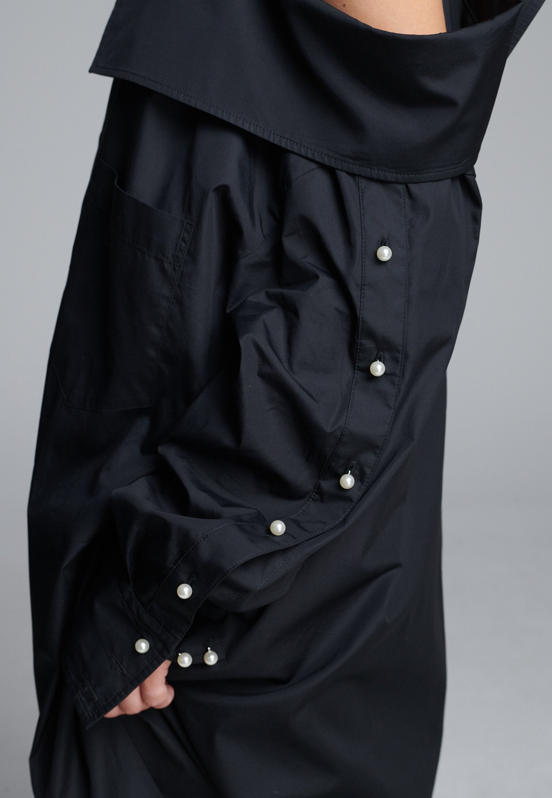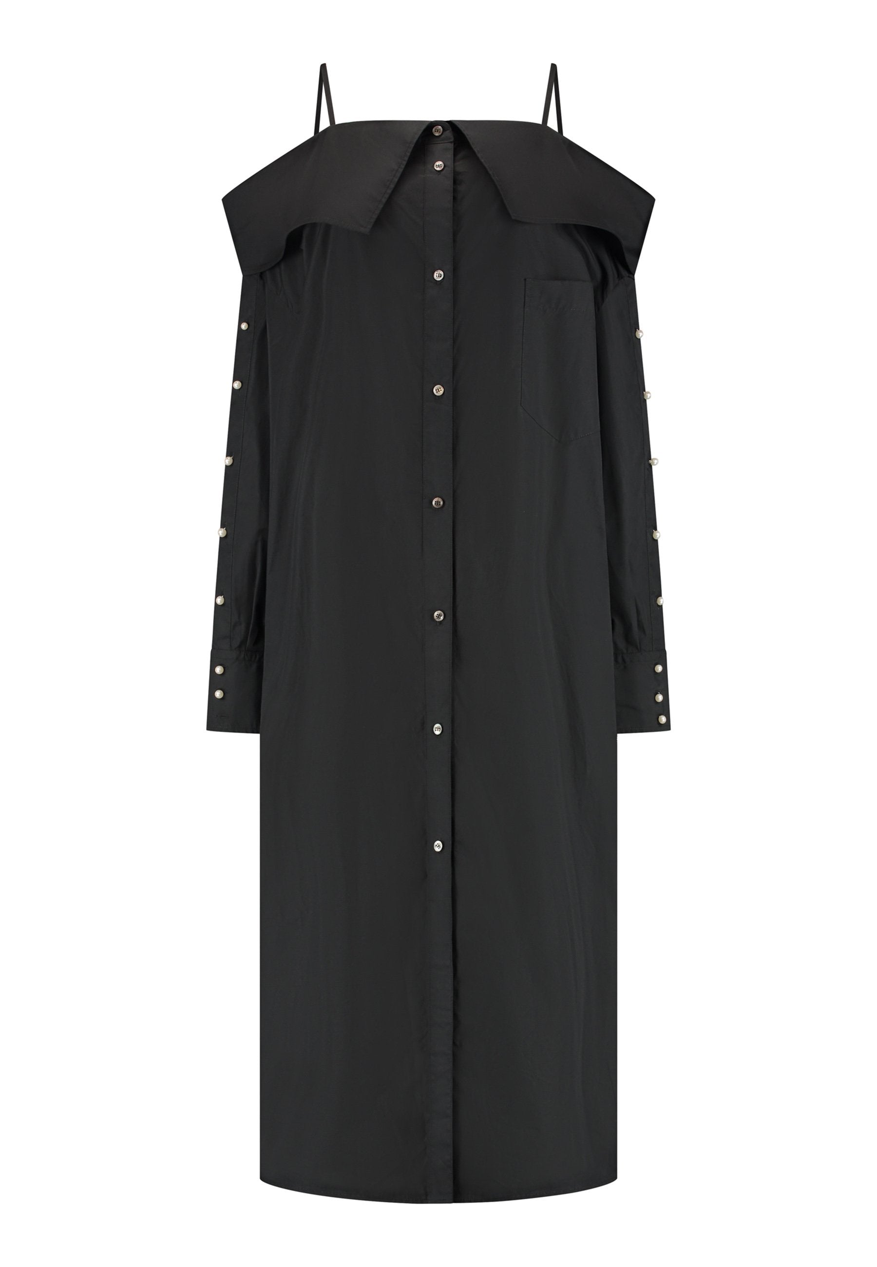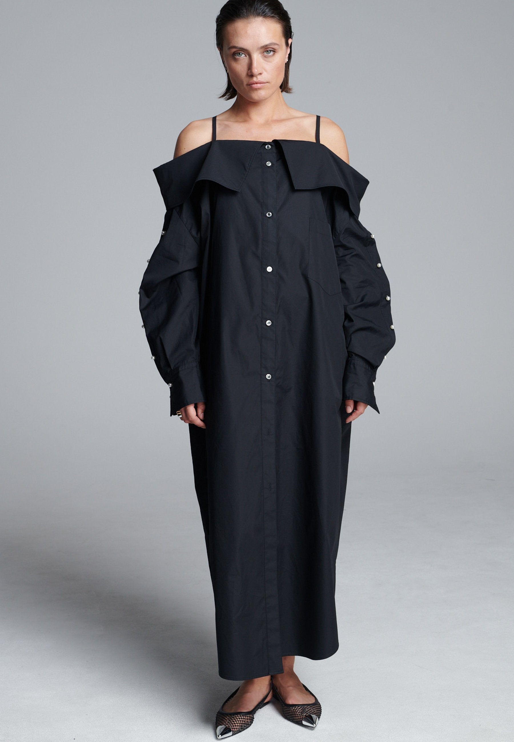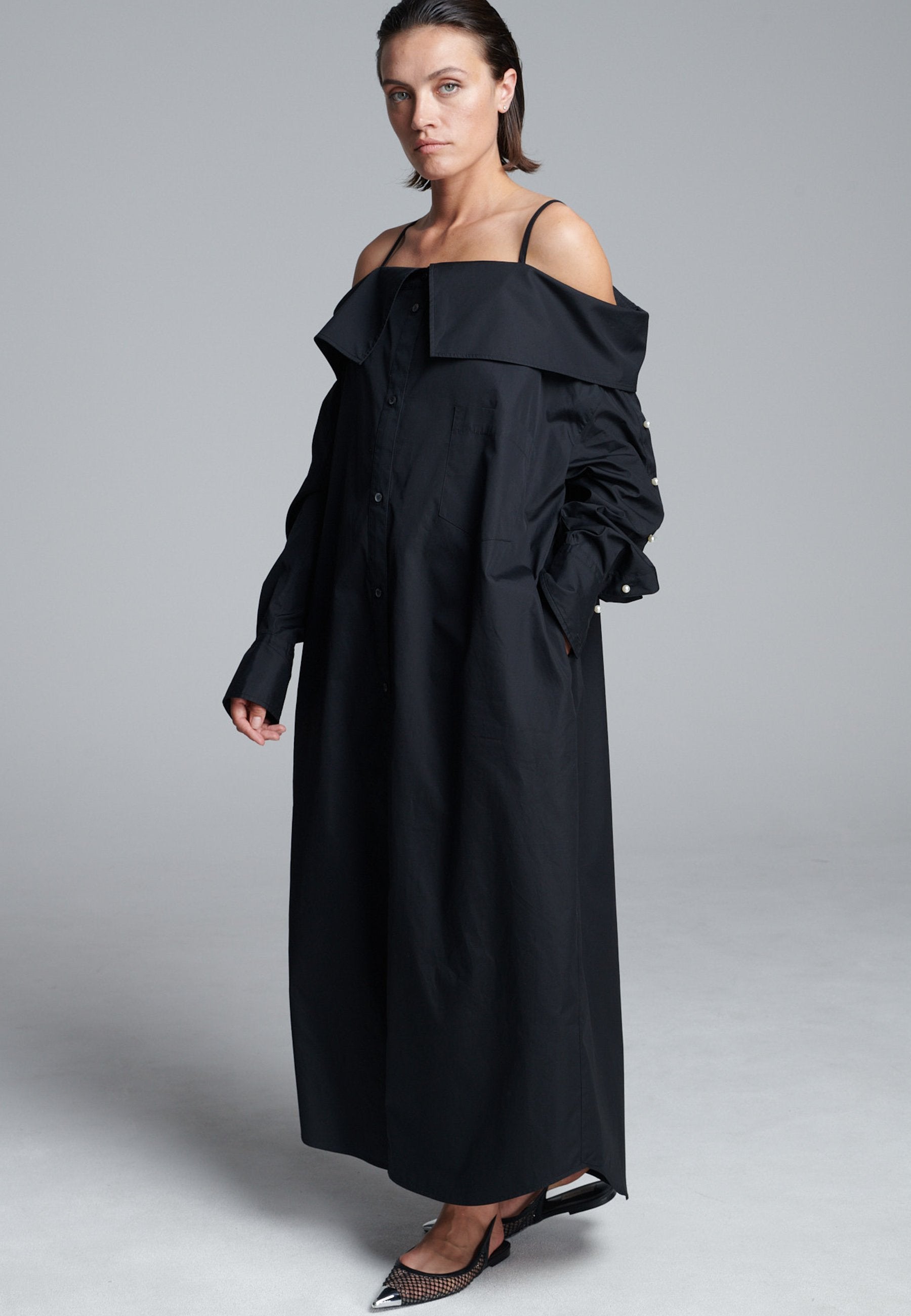 Um decote ombro a ombro emoldurado por alças finas confere a este vestido-camiseiro uma presença marcante e escultural. Cortado em tecido preto nítido, tem uma silhueta alongada e fluida, com fecho de botões à frente e uma fenda lateral alta que adiciona movimento. As mangas oversized, com botões tom sobre tom, introduzem um toque de desconstrução, equilibrando estrutura com fluidez. Perfeito para usar sozinho ou em camadas para um visual mais vanguardista.