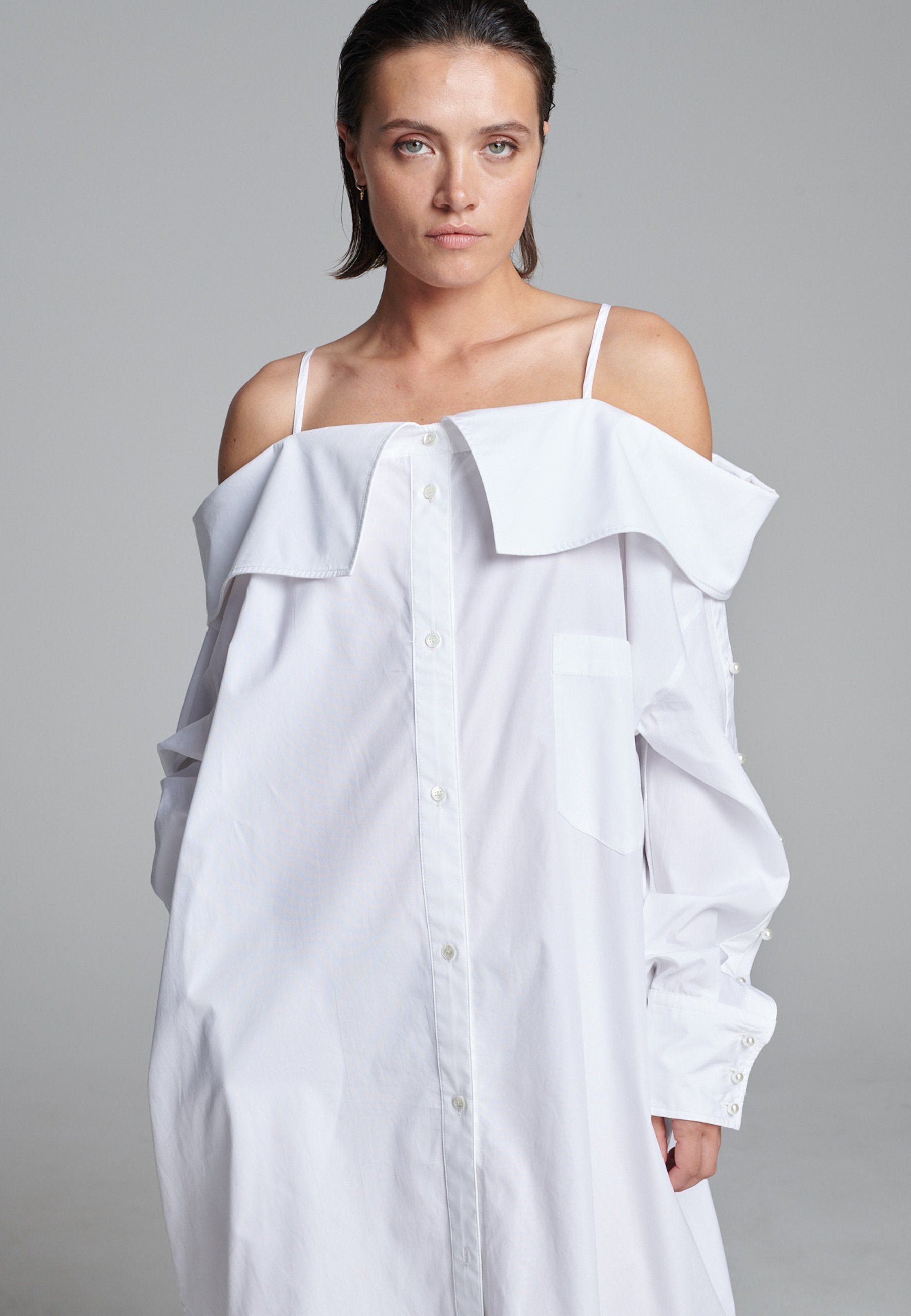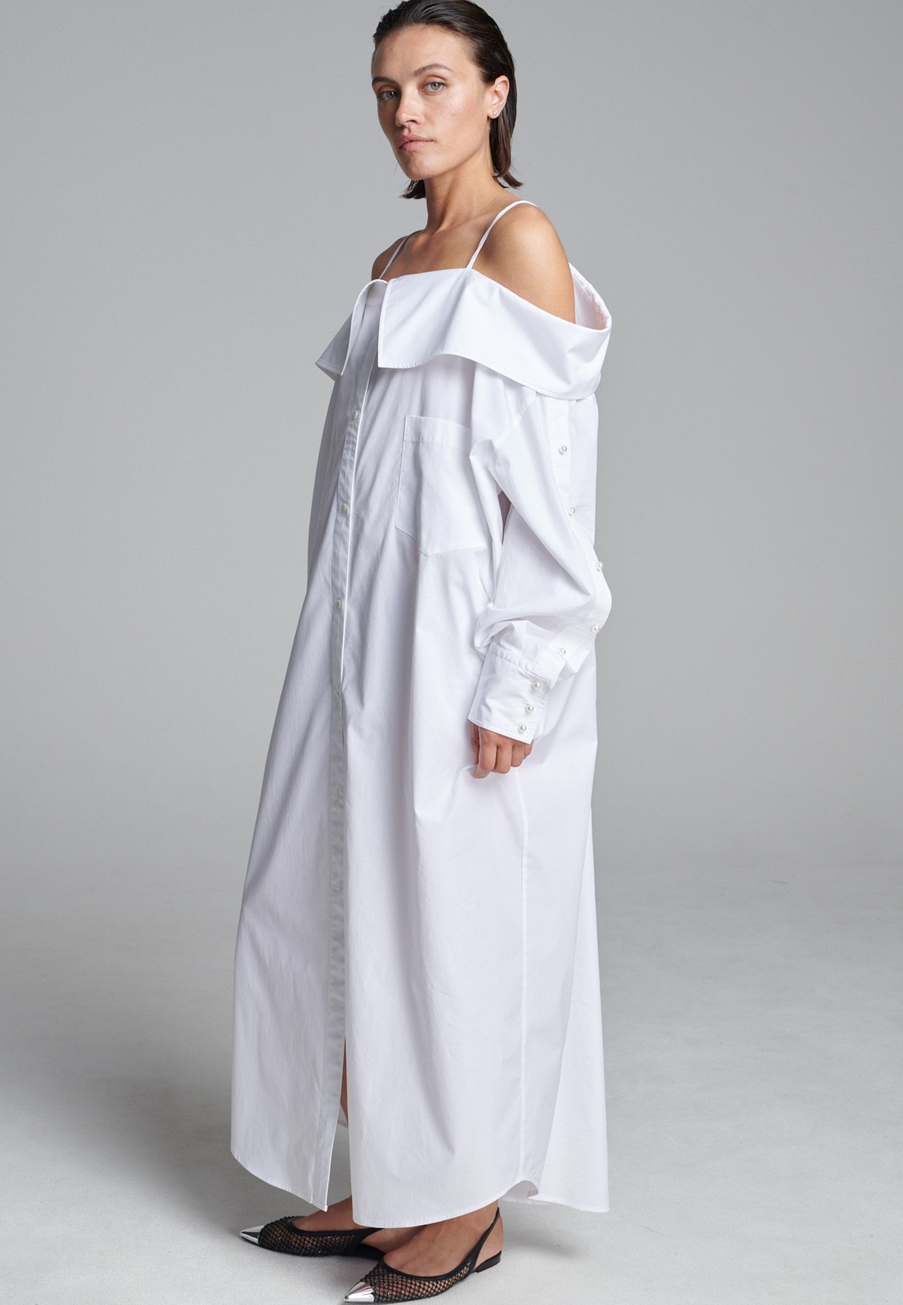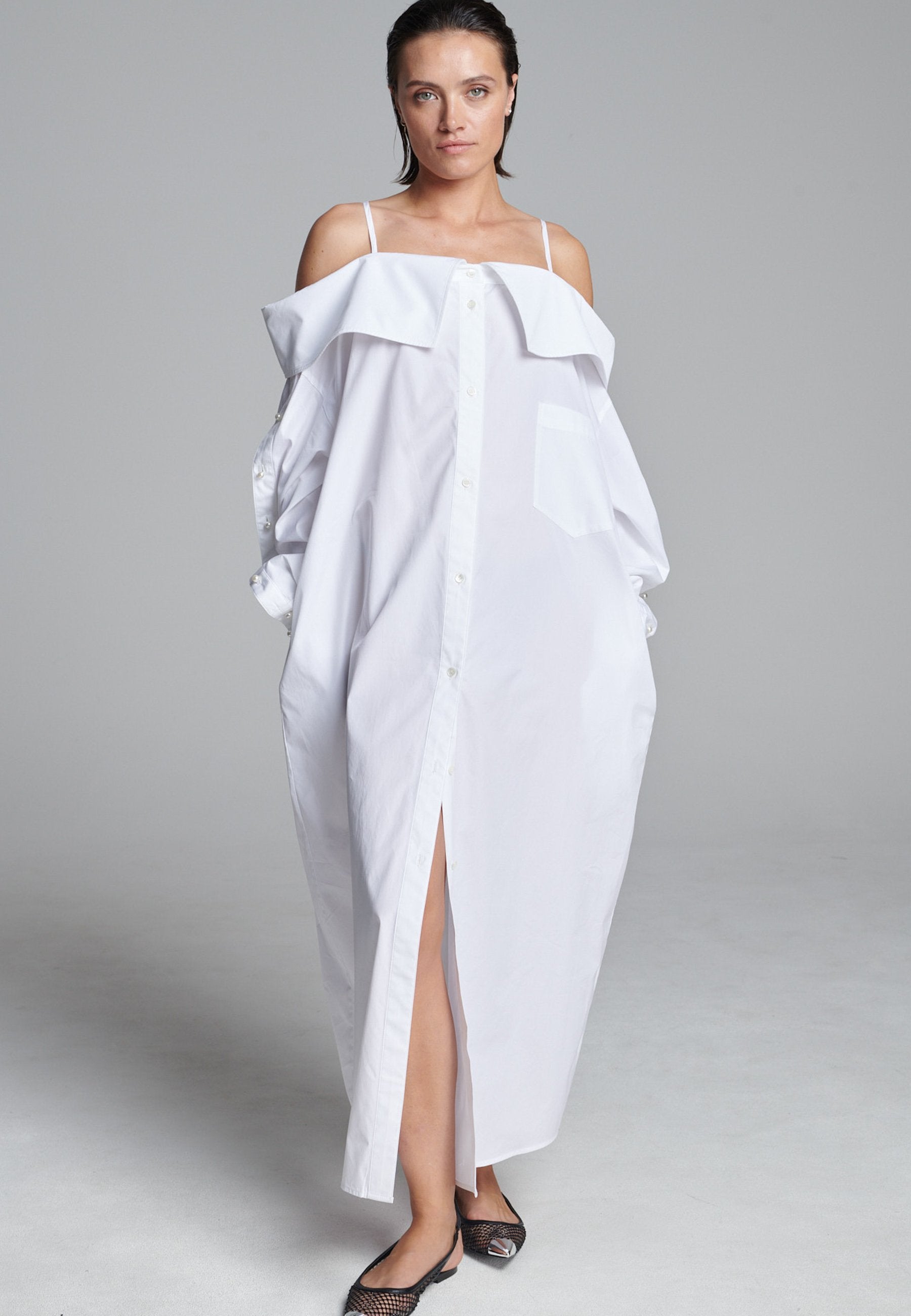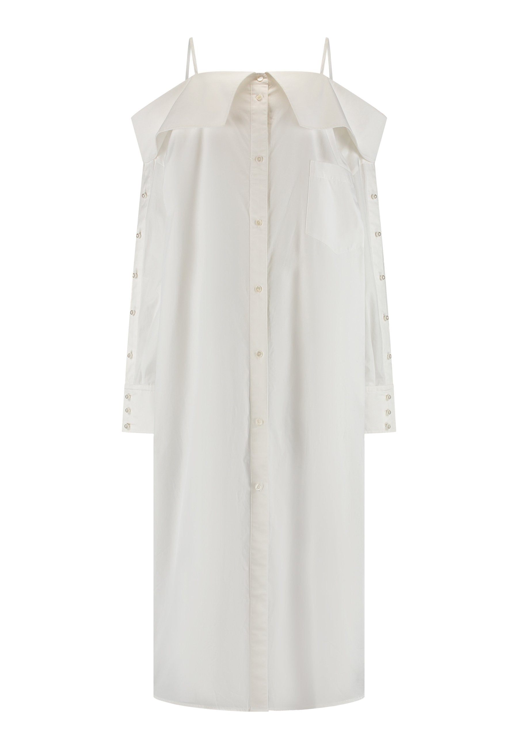 Um decote ombro a ombro emoldurado por alças finas confere a este vestido-camiseiro uma presença marcante e escultural. Confeccionado em tecido branco e fresco, assume uma silhueta alongada e fluida com abotoamento frontal e uma fenda lateral alta que adiciona movimento. Mangas oversized com botões tom sobre tom introduzem um toque de desconstrução, equilibrando estrutura com fluidez. Perfeito para usar sozinho ou em camadas para um look mais arrojado.