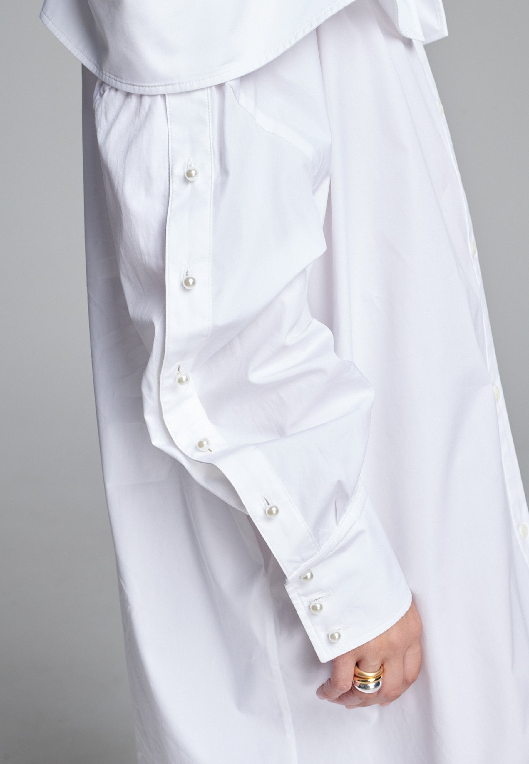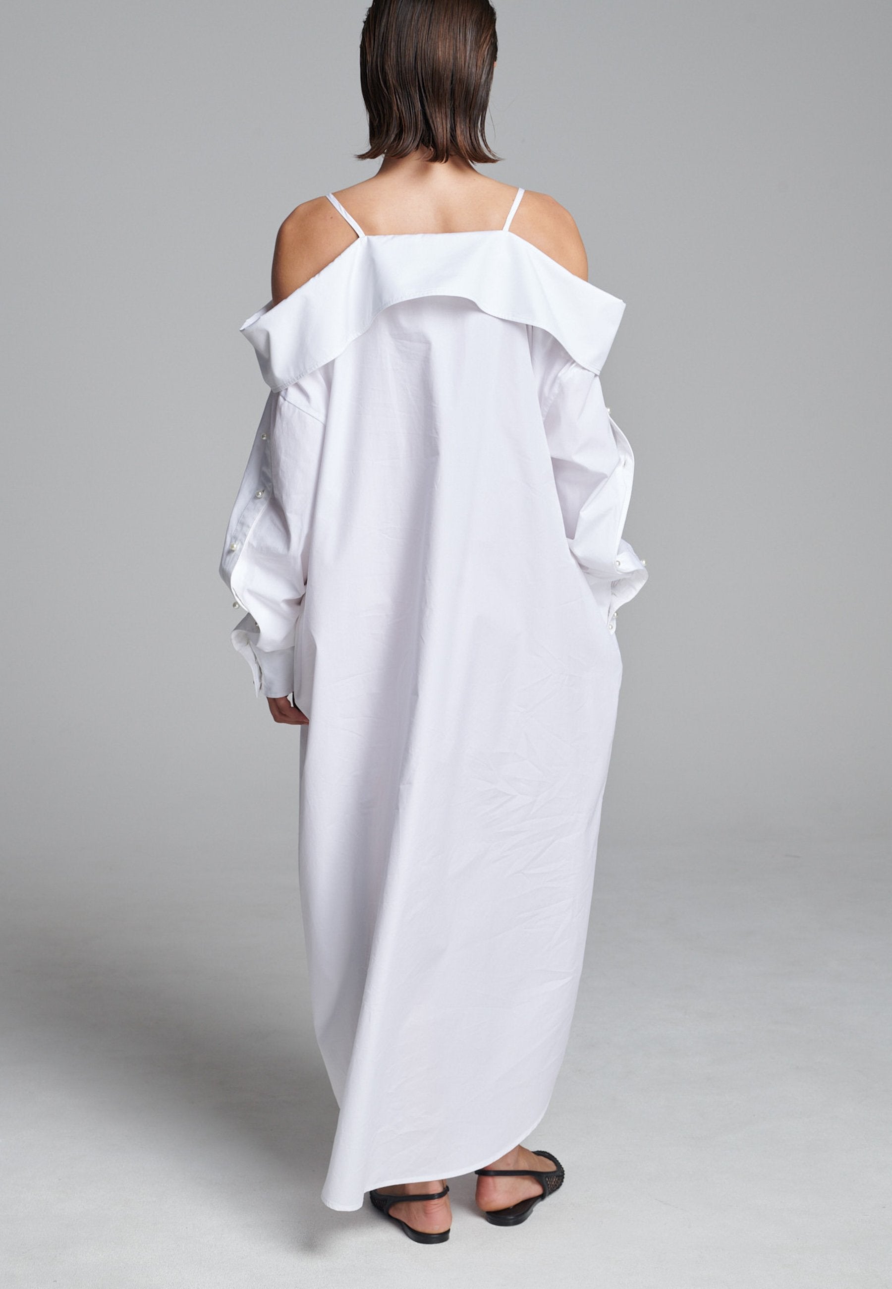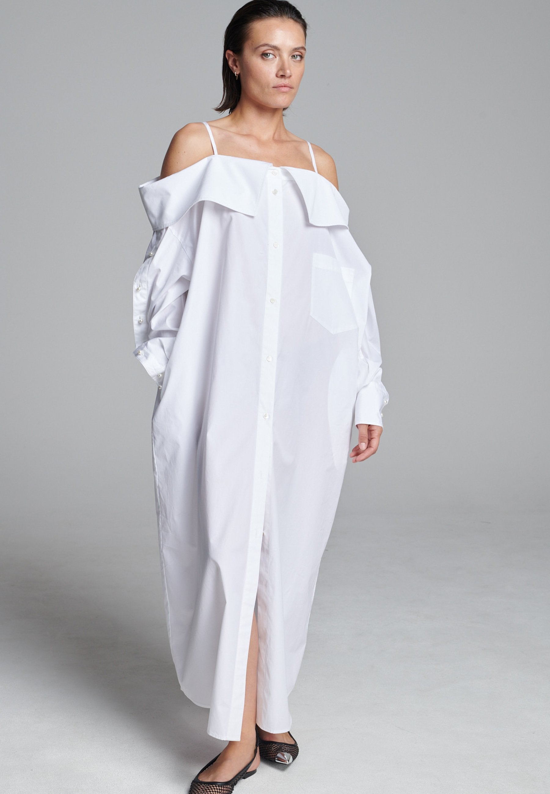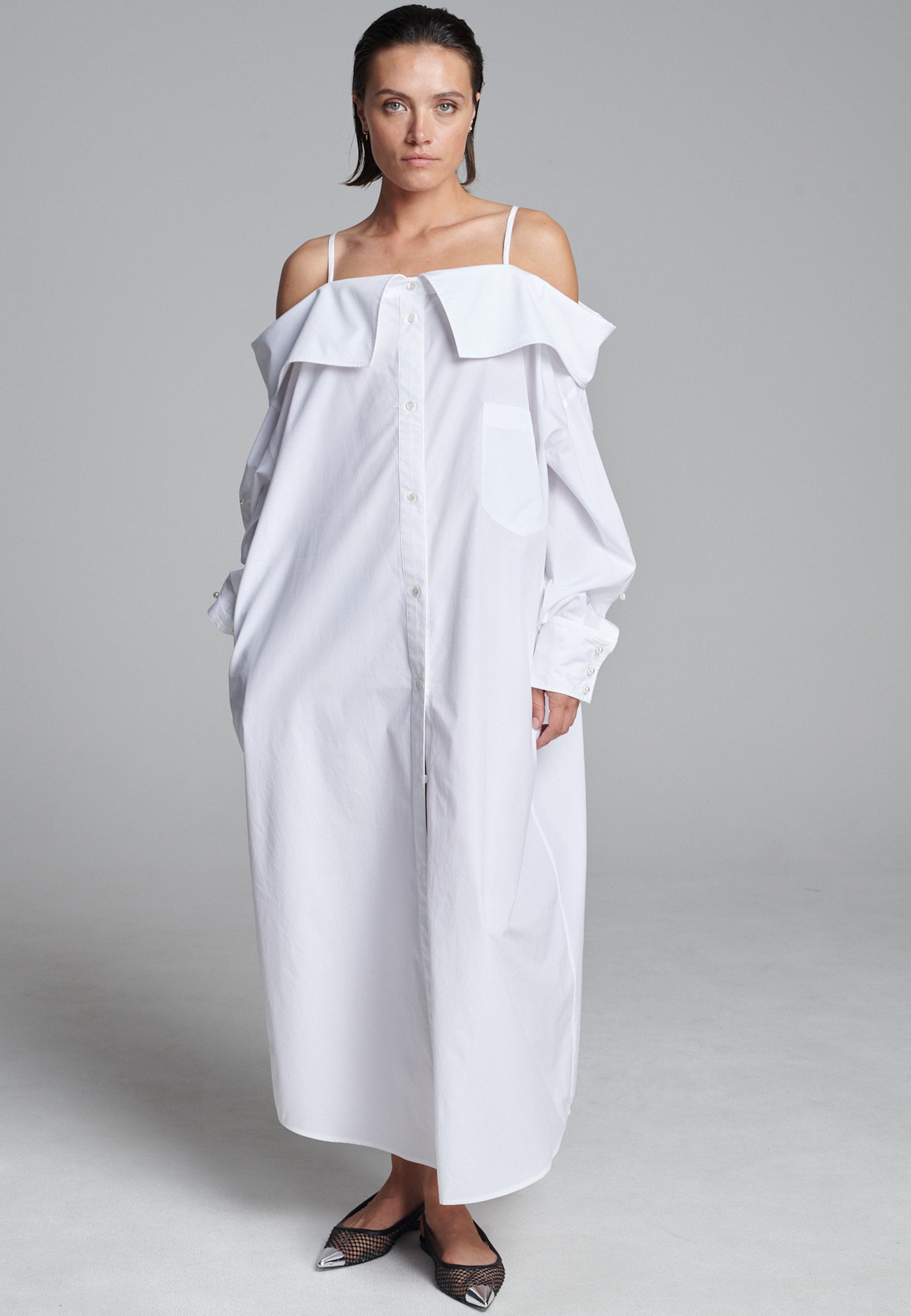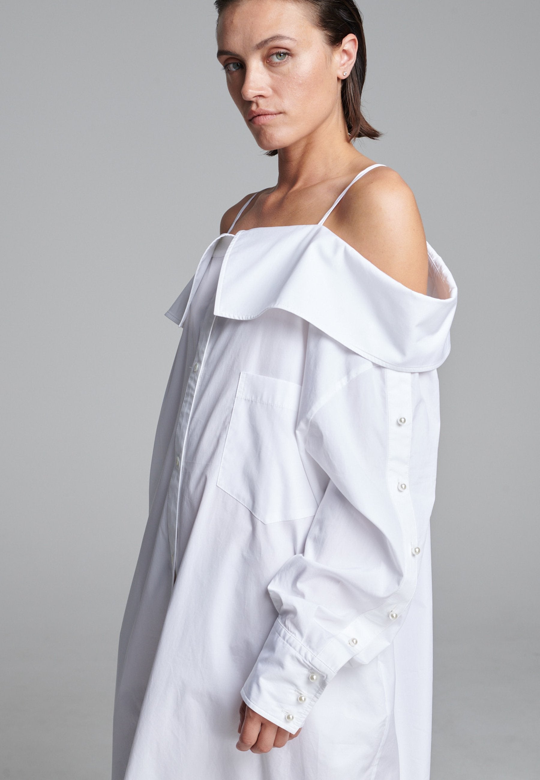Um decote ombro a ombro emoldurado por alças finas confere a este vestido-camiseiro uma presença marcante e escultural. Confeccionado em tecido branco e fresco, assume uma silhueta alongada e fluida com abotoamento frontal e uma fenda lateral alta que adiciona movimento. Mangas oversized com botões tom sobre tom introduzem um toque de desconstrução, equilibrando estrutura com fluidez. Perfeito para usar sozinho ou em camadas para um look mais arrojado.