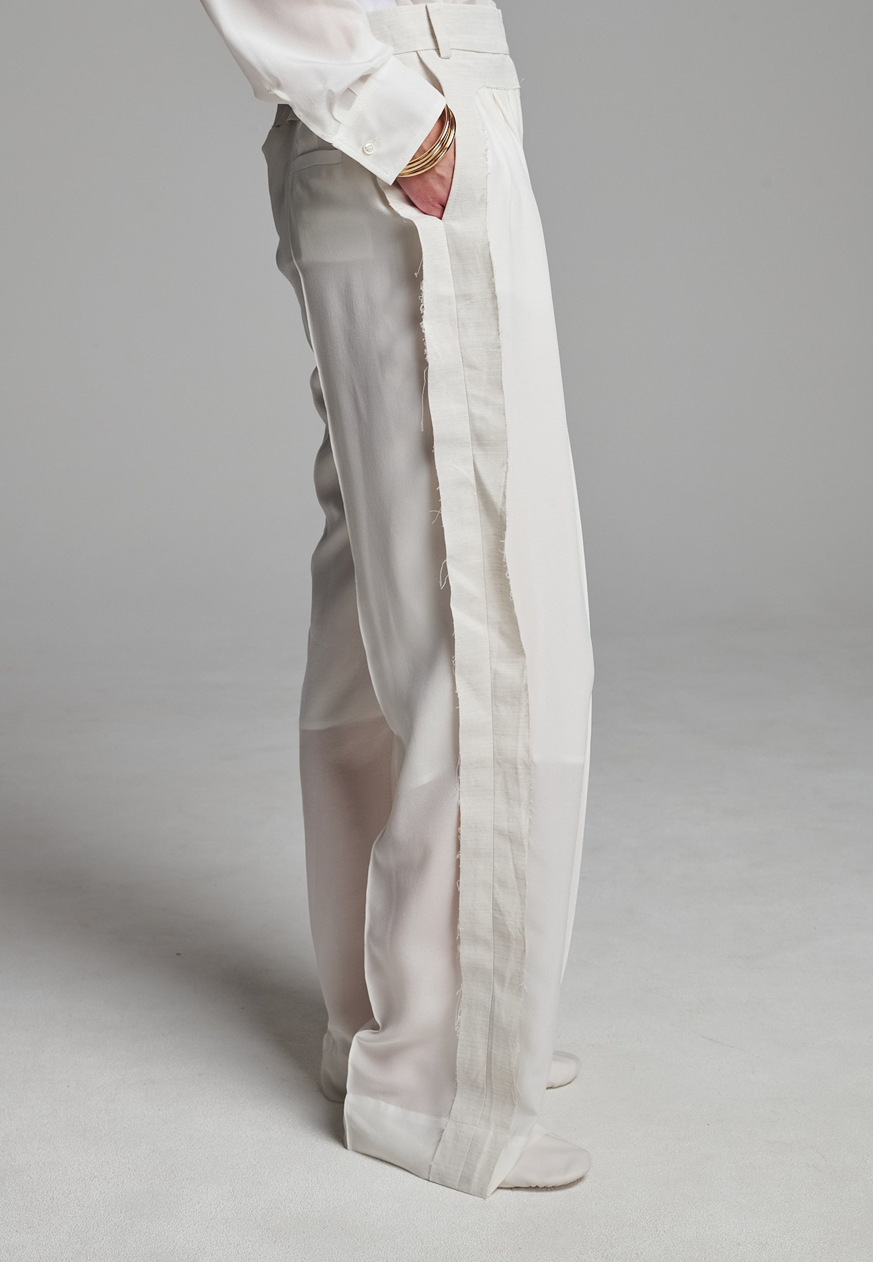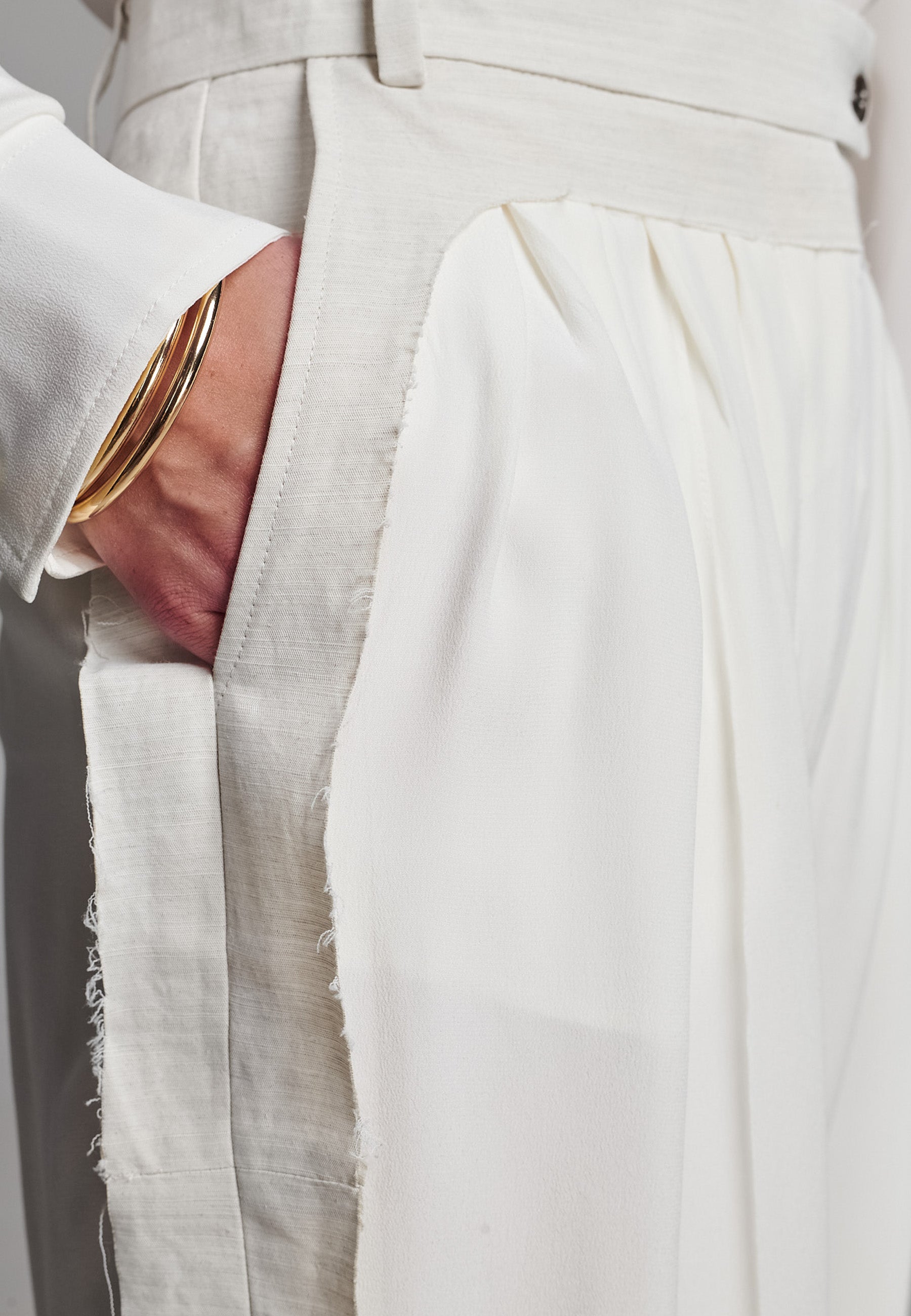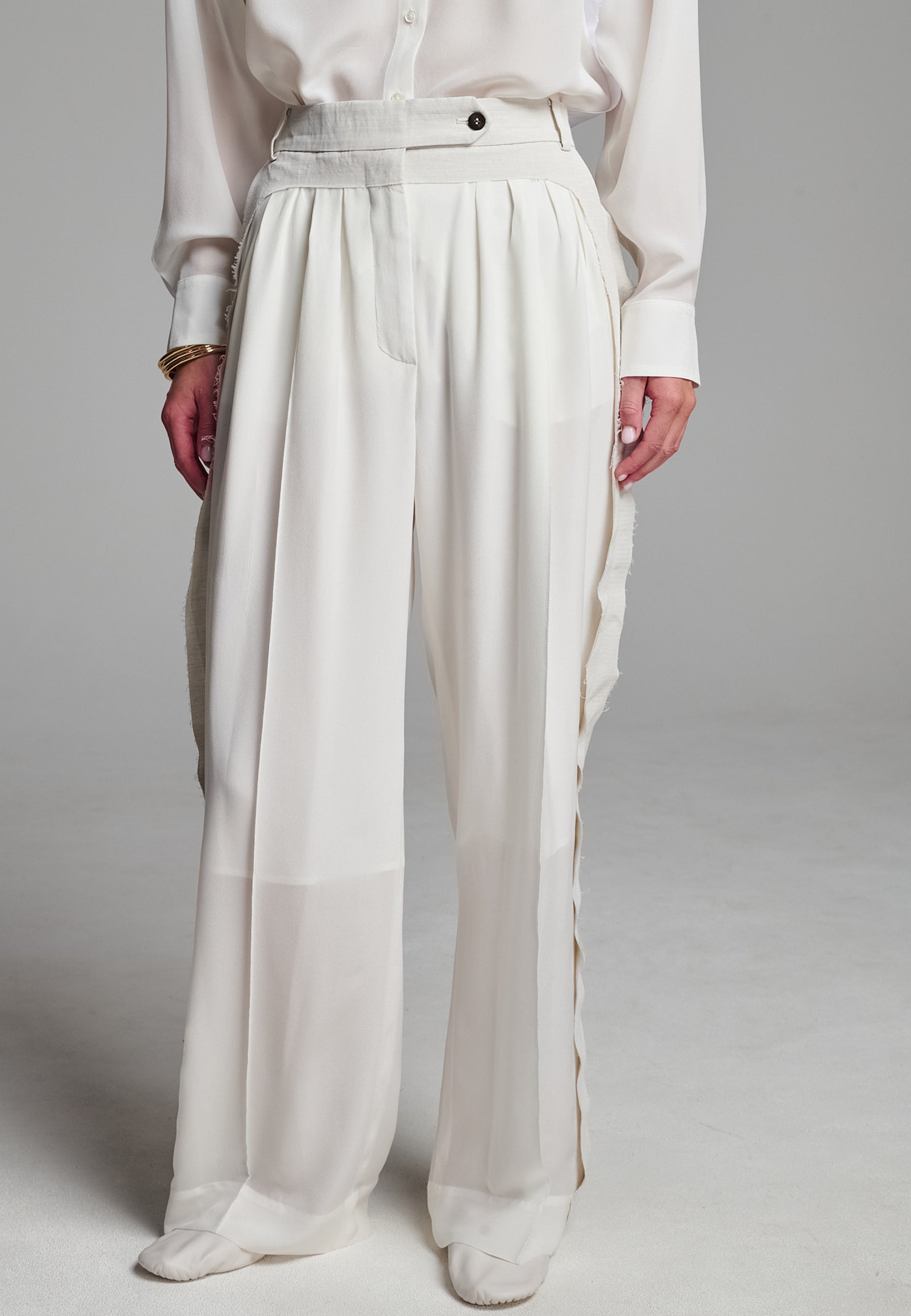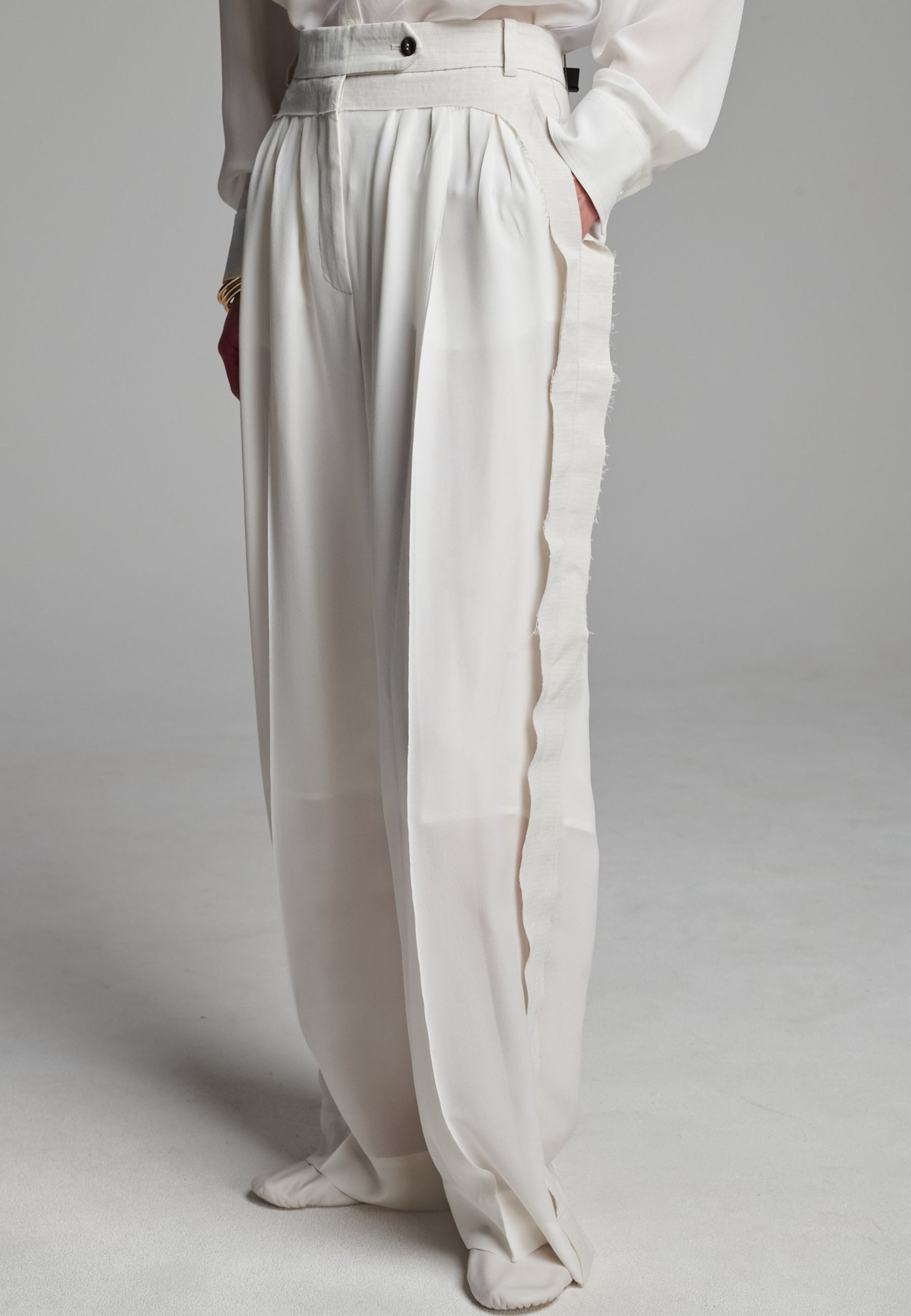 Linhas fluidas e uma estrutura suave definem estas calças franzidas em marfim. Confecionadas em seda luxuosa, com forro 3/4. A perna descontraída tem um caimento fácil, enquanto a cintura larga e desconstruída confere um contraste subtil de textura e tom. Pregas delicadas adicionam volume sem peso, criando uma silhueta que se move sem esforço. Acabamento com detalhes laterais em bainha desfiada para um toque de requinte descontraído.