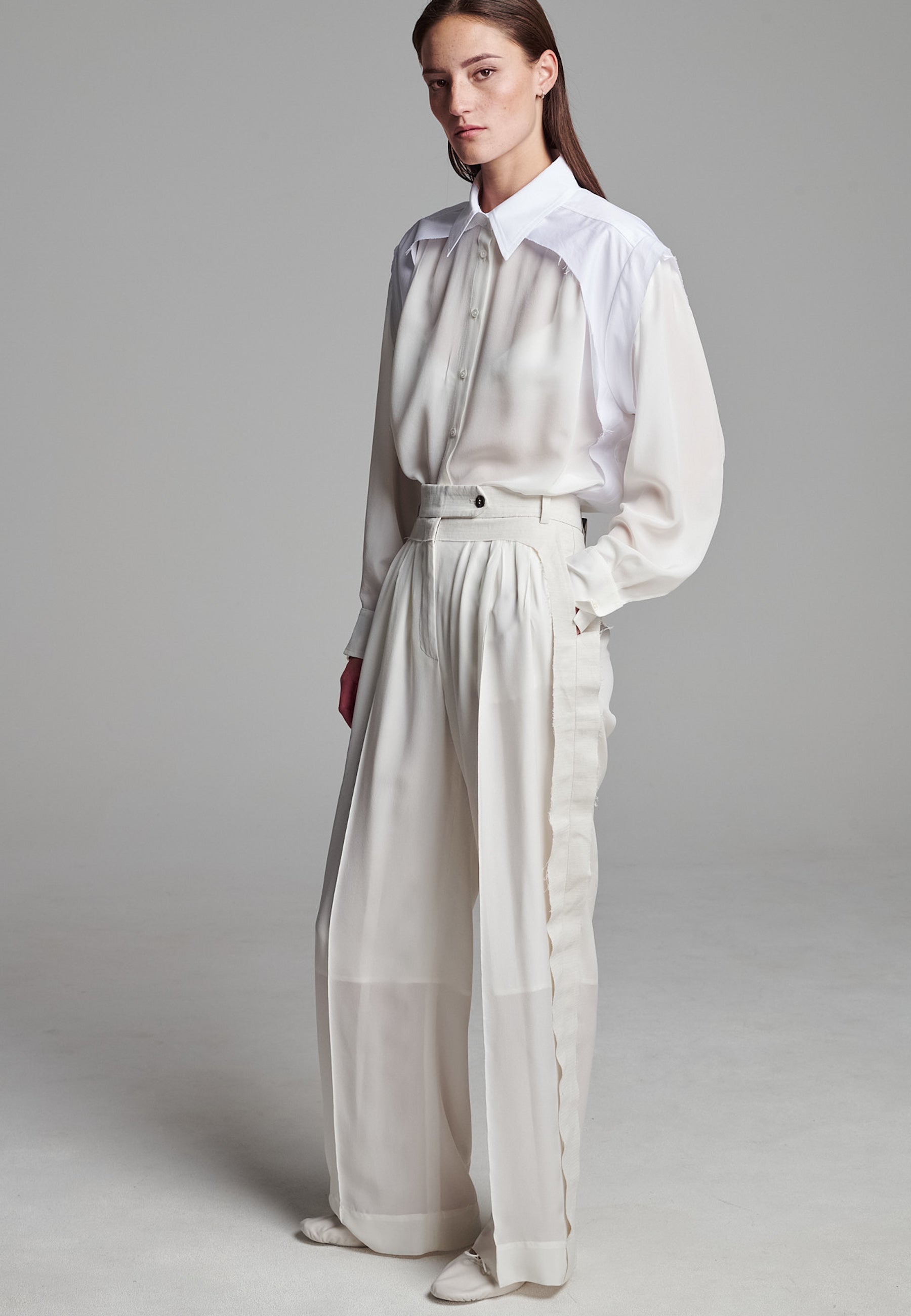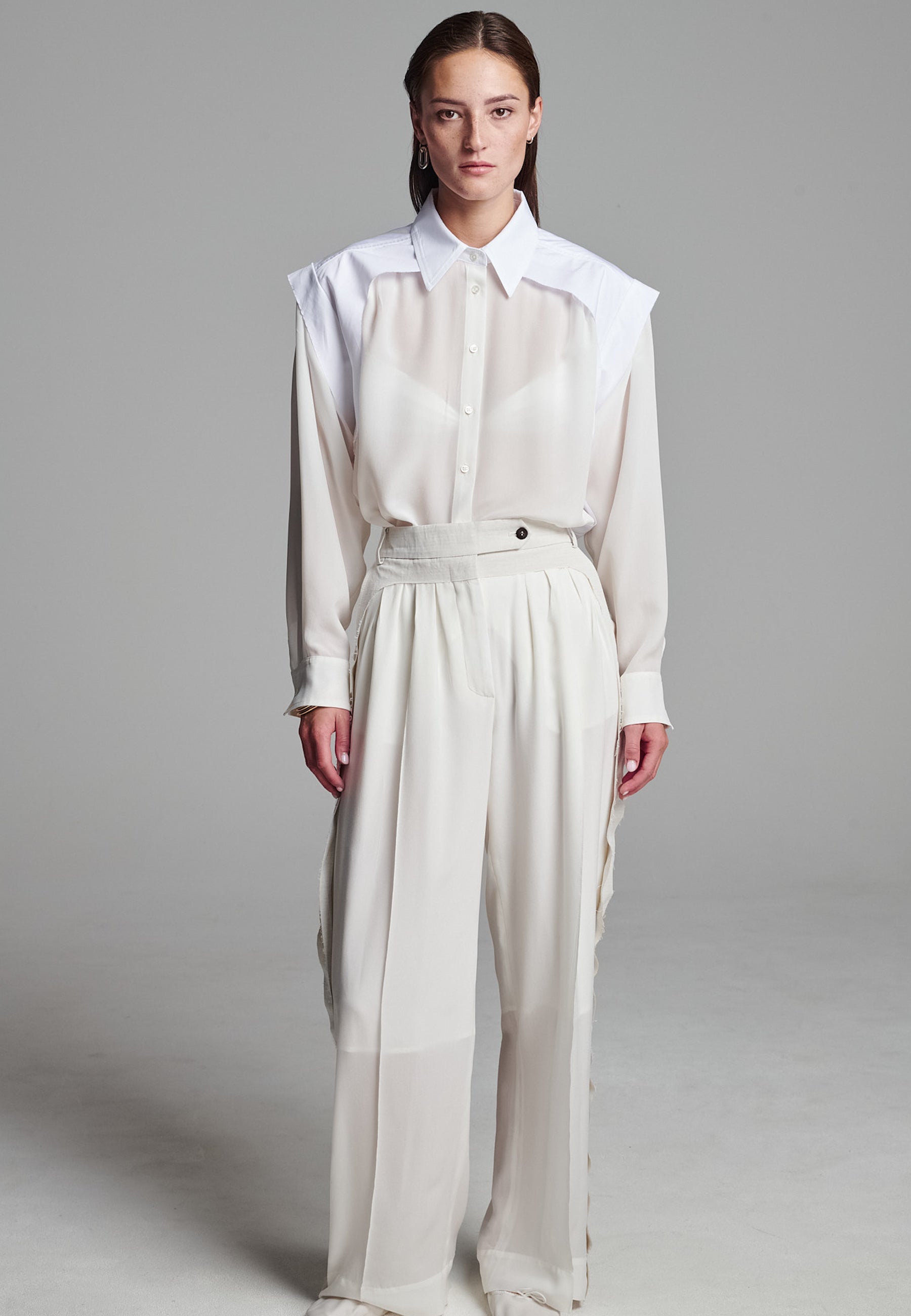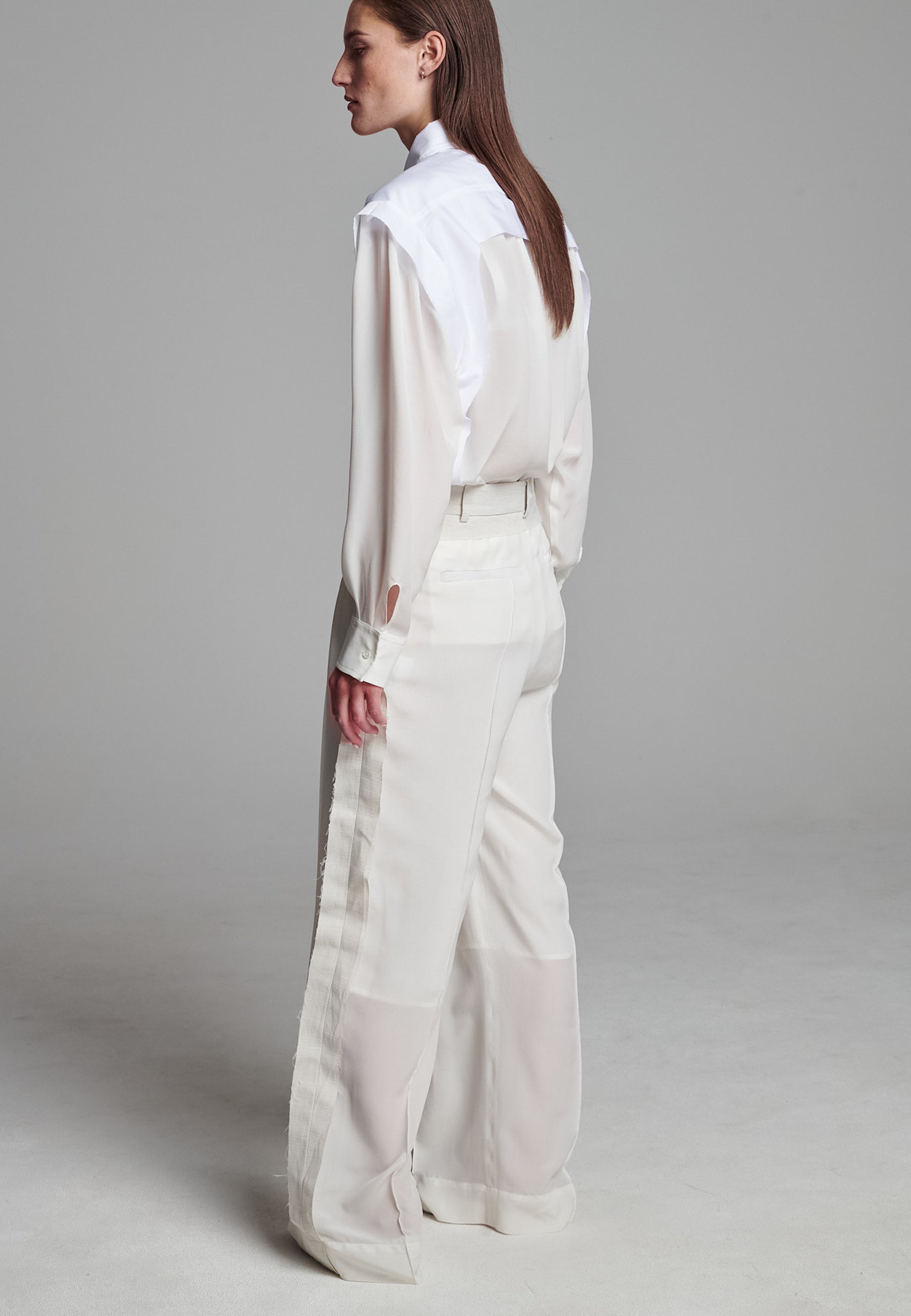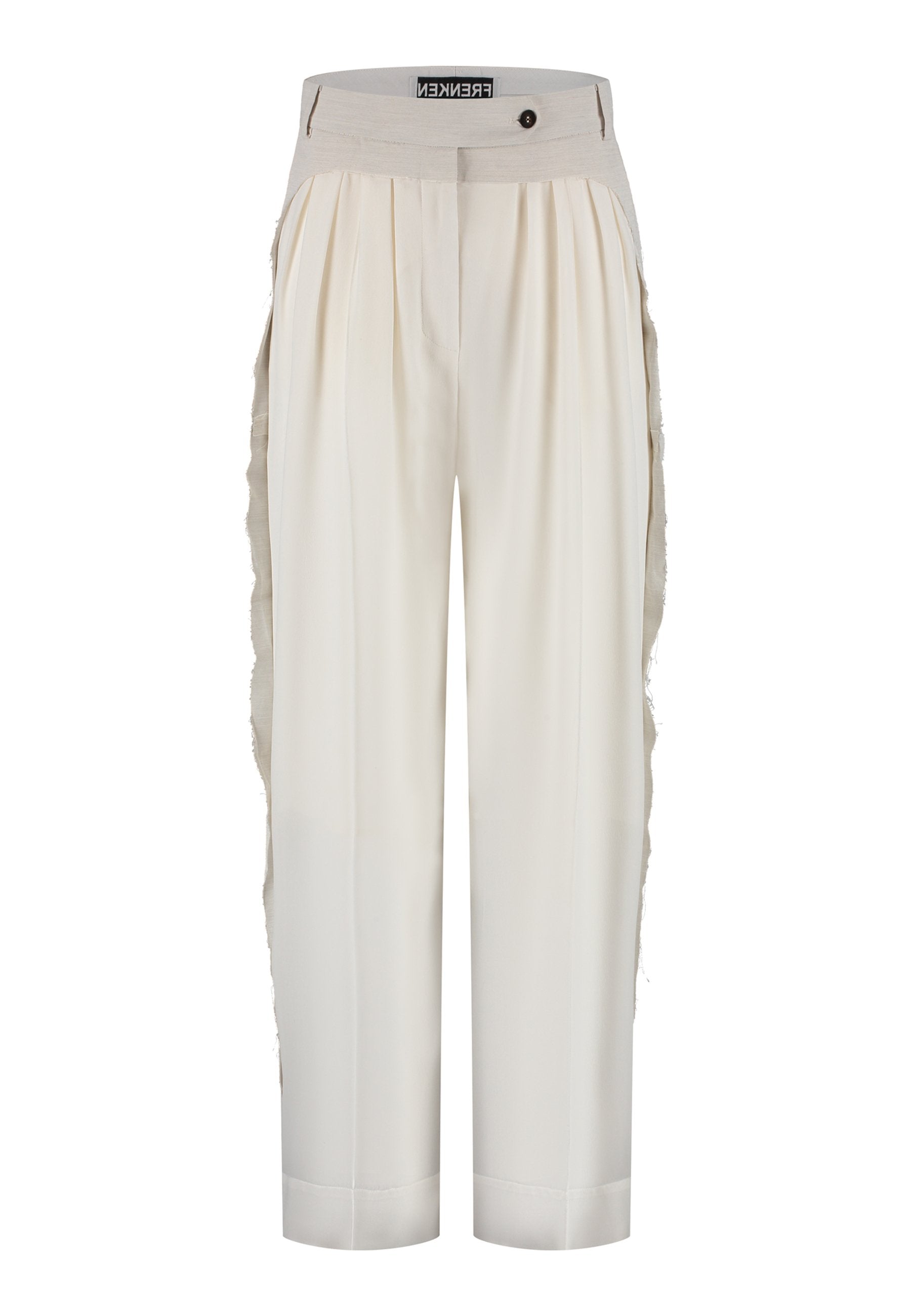 Linhas fluidas e uma estrutura suave definem estas calças franzidas em marfim. Confecionadas em seda luxuosa, com forro 3/4. A perna descontraída tem um caimento fácil, enquanto a cintura larga e desconstruída confere um contraste subtil de textura e tom. Pregas delicadas adicionam volume sem peso, criando uma silhueta que se move sem esforço. Acabamento com detalhes laterais em bainha desfiada para um toque de requinte descontraído.