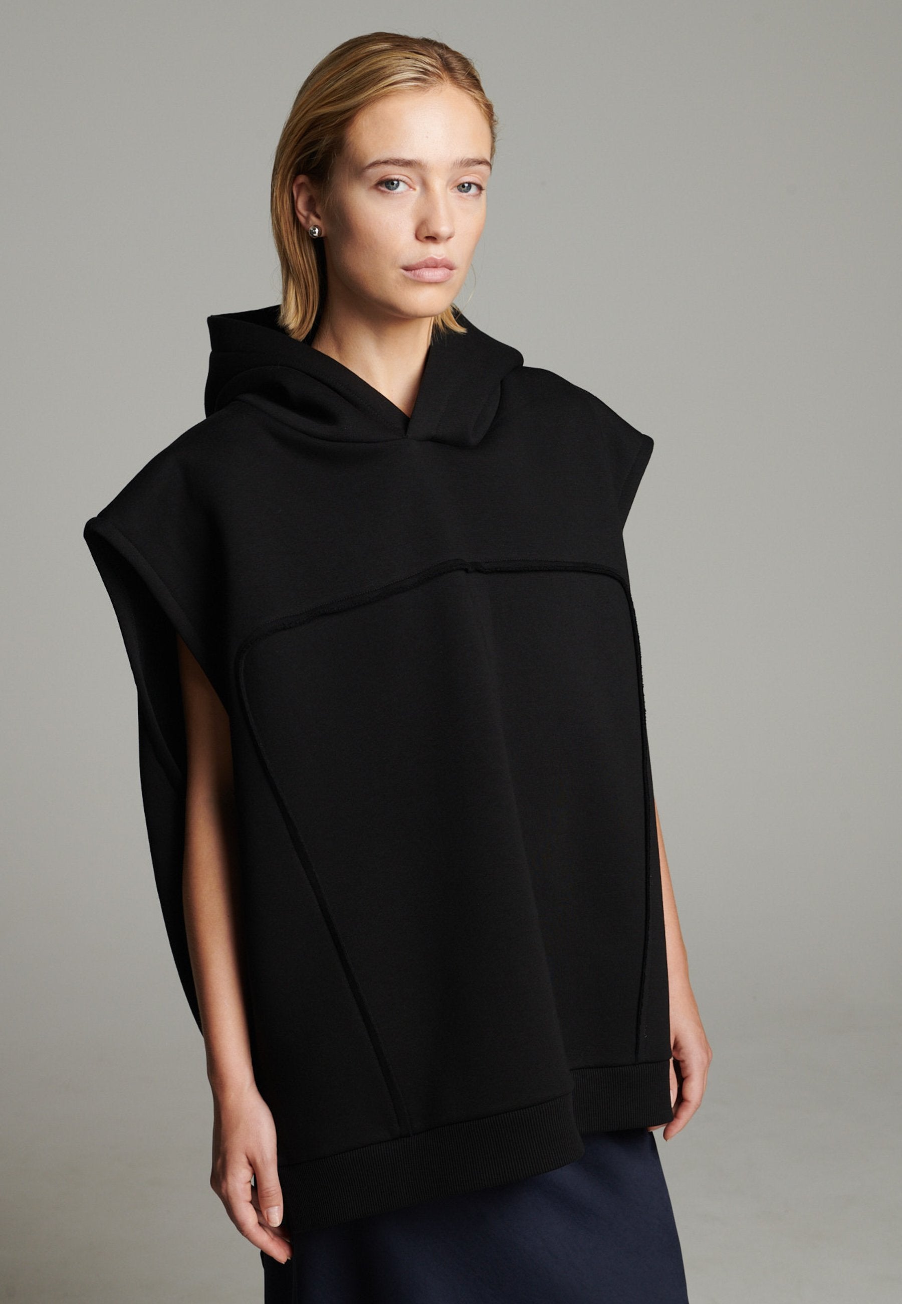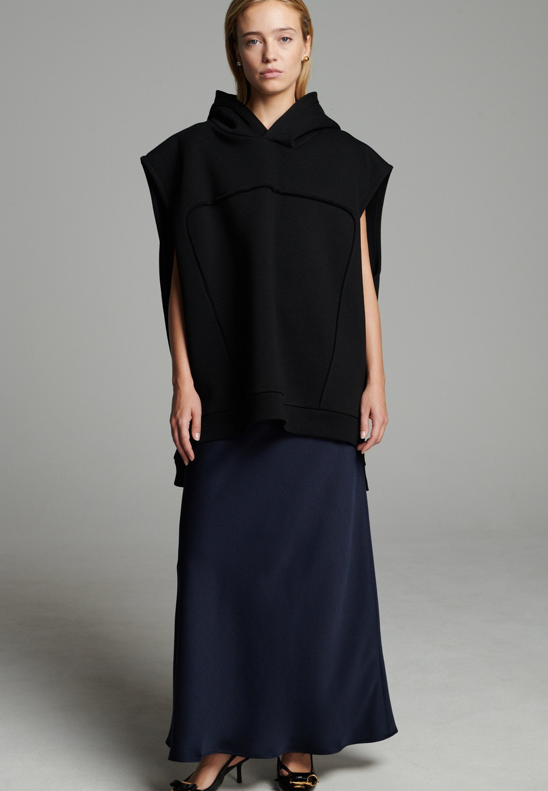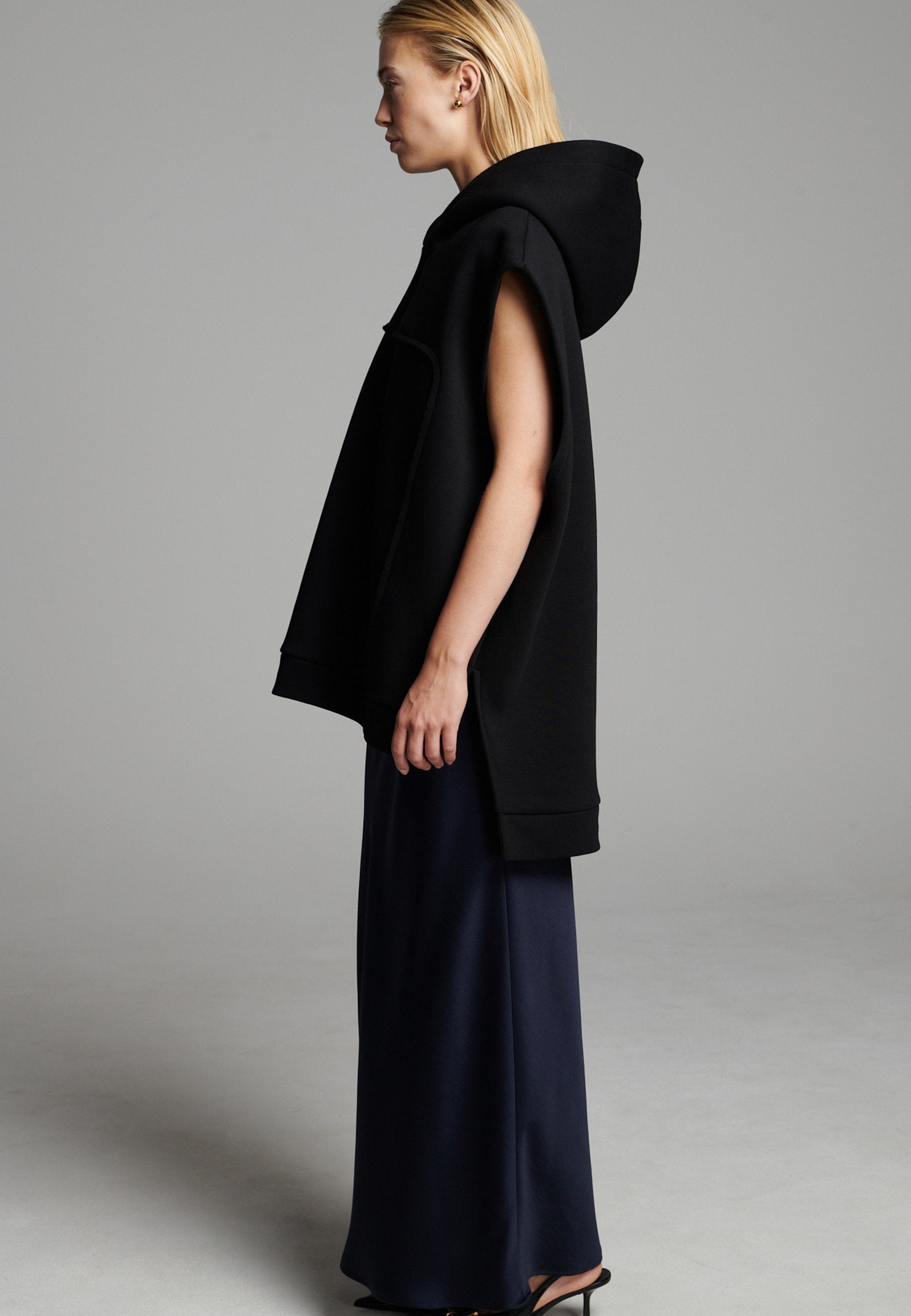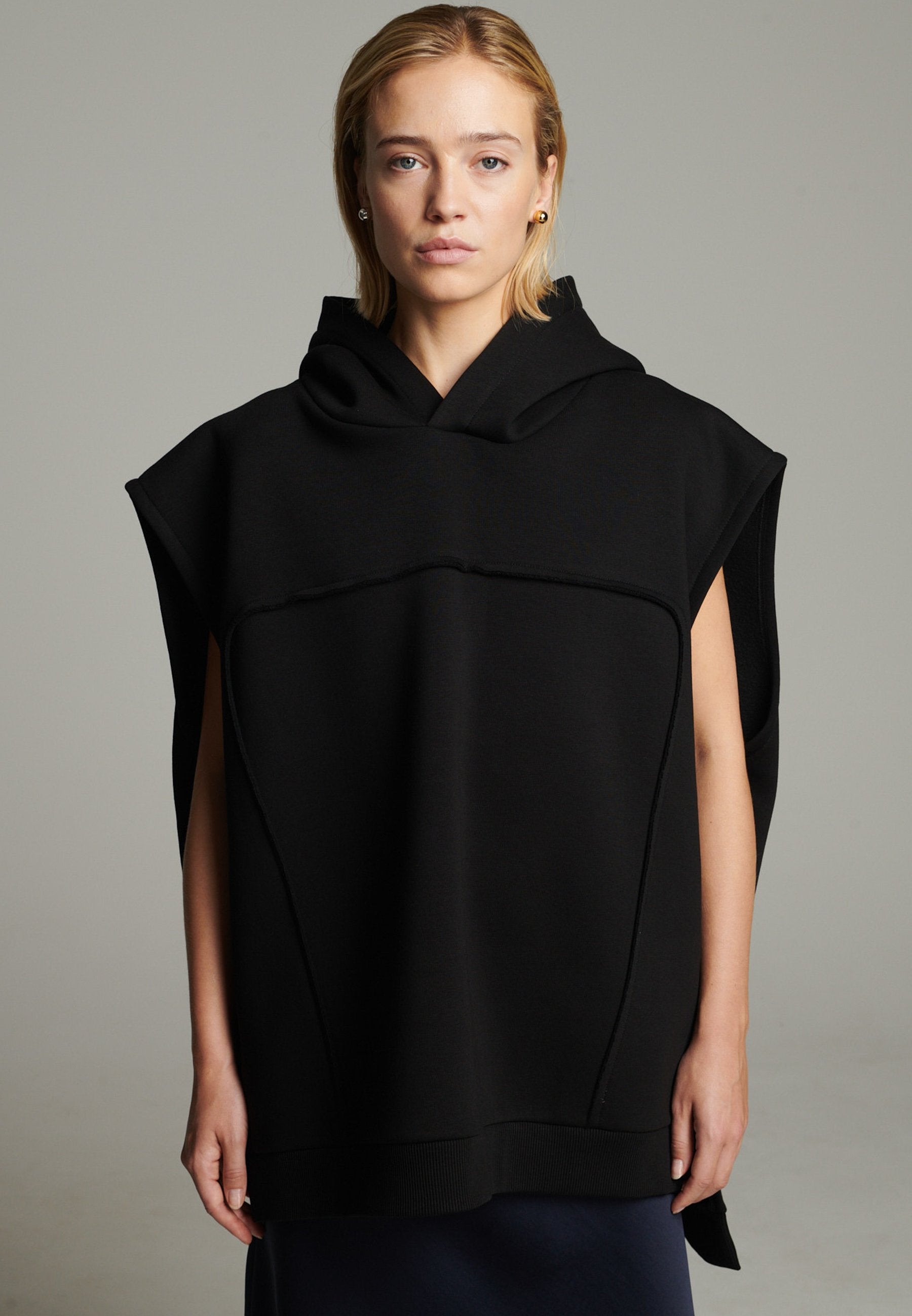 A estrutura suave e a facilidade moderna unem-se nesta camisola com capuz sem mangas. Cortada em jersey preto profundo com um drapeado limpo e escultural, apresenta costuras curvas que adicionam uma dimensão subtil sem perturbar a silhueta minimalista. O capuz espaçoso introduz um toque descontraído e contemporâneo, enquanto as cavas abertas mantêm a forma leve e fluida. Discreta, versátil e refinada na sua simplicidade.