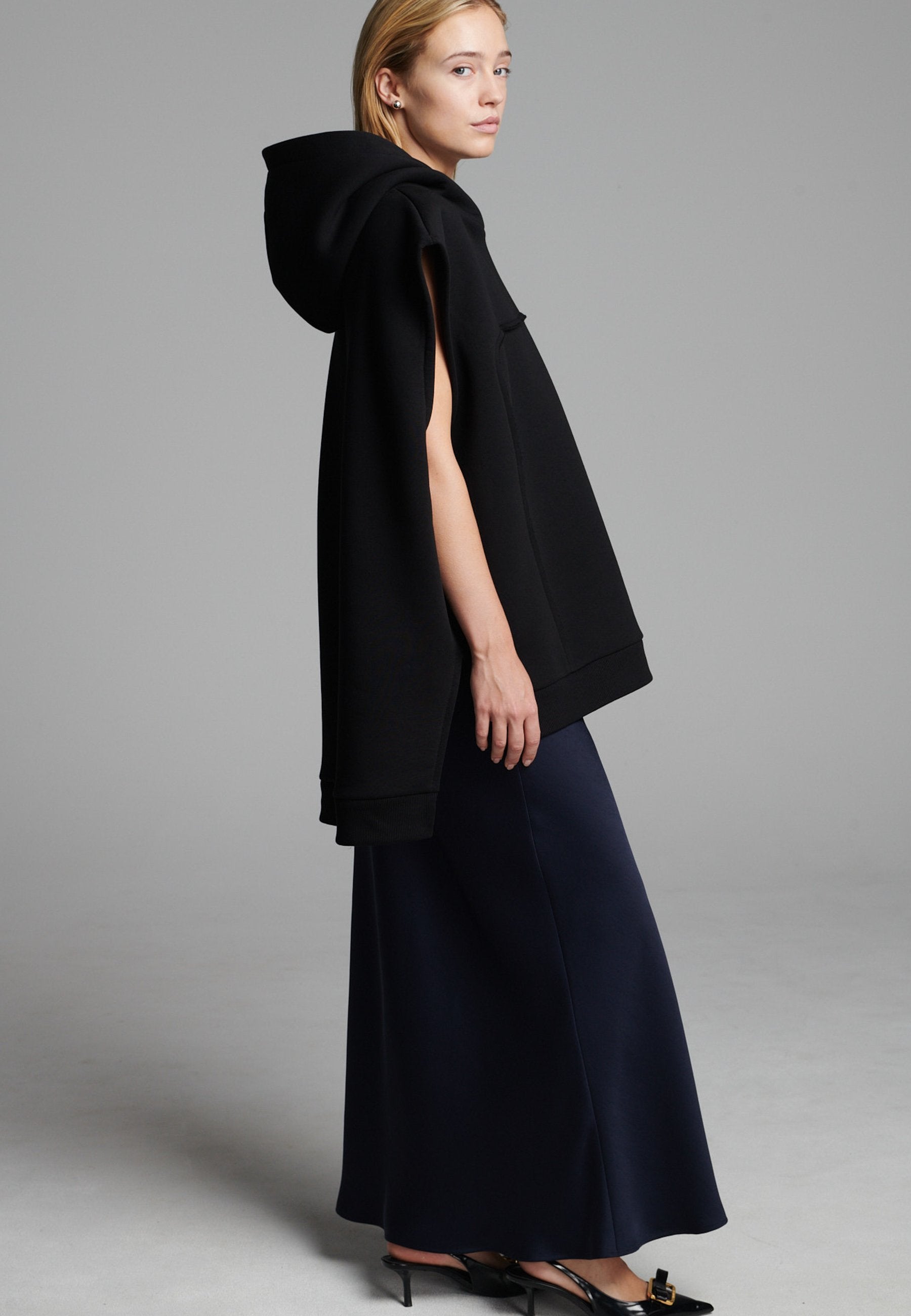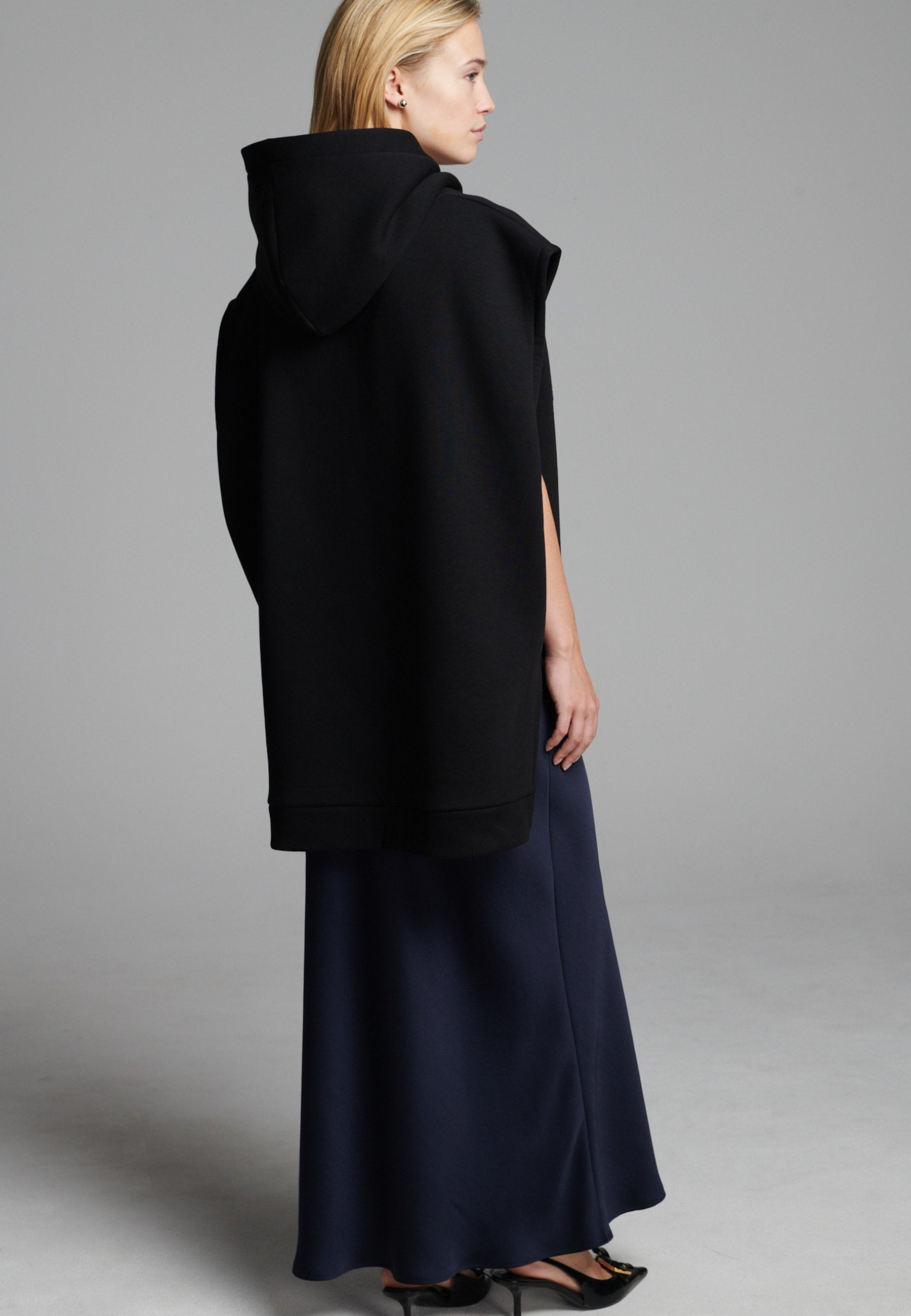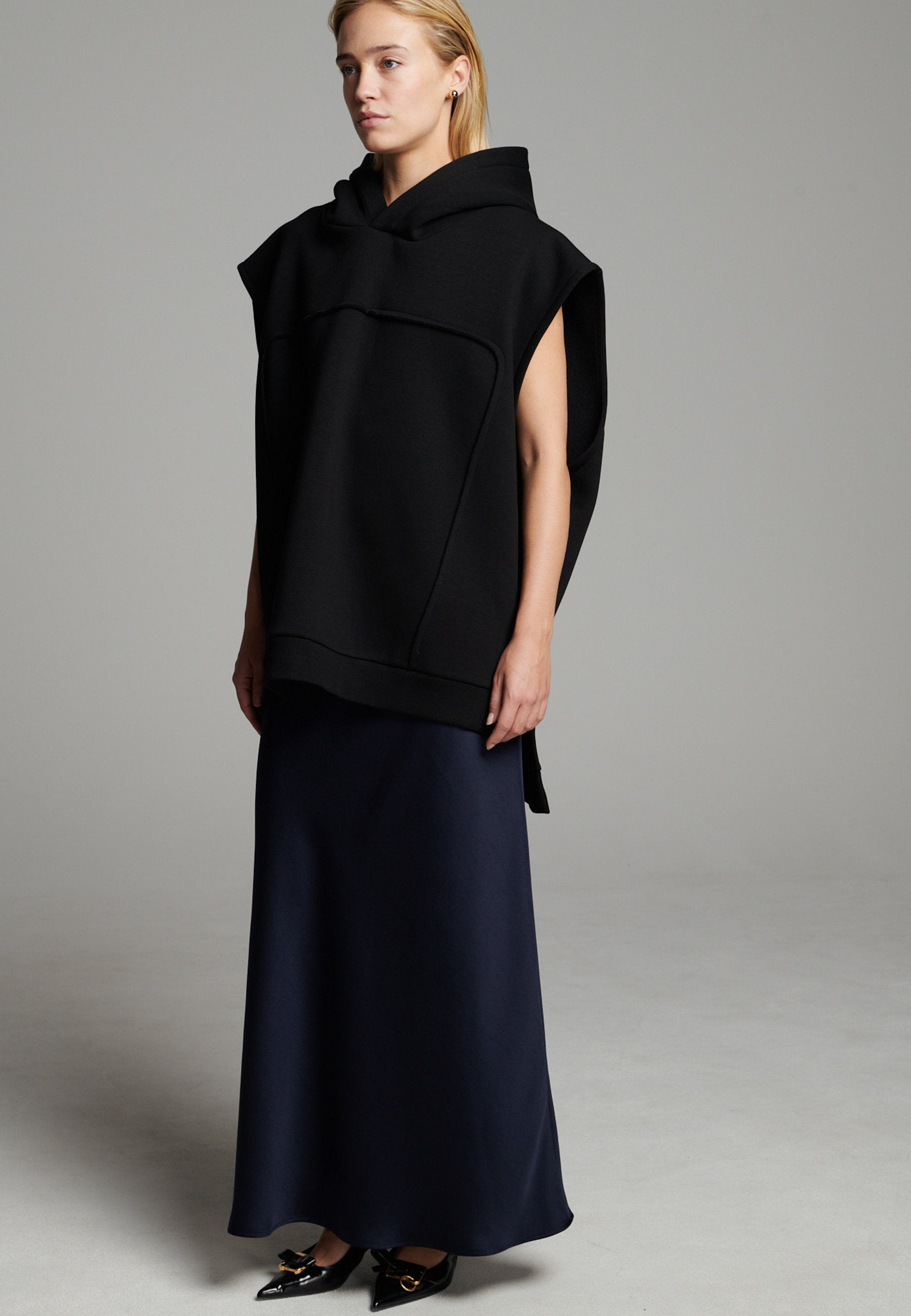 A estrutura suave e a facilidade moderna unem-se nesta camisola com capuz sem mangas. Cortada em jersey preto profundo com um drapeado limpo e escultural, apresenta costuras curvas que adicionam uma dimensão subtil sem perturbar a silhueta minimalista. O capuz espaçoso introduz um toque descontraído e contemporâneo, enquanto as cavas abertas mantêm a forma leve e fluida. Discreta, versátil e refinada na sua simplicidade.