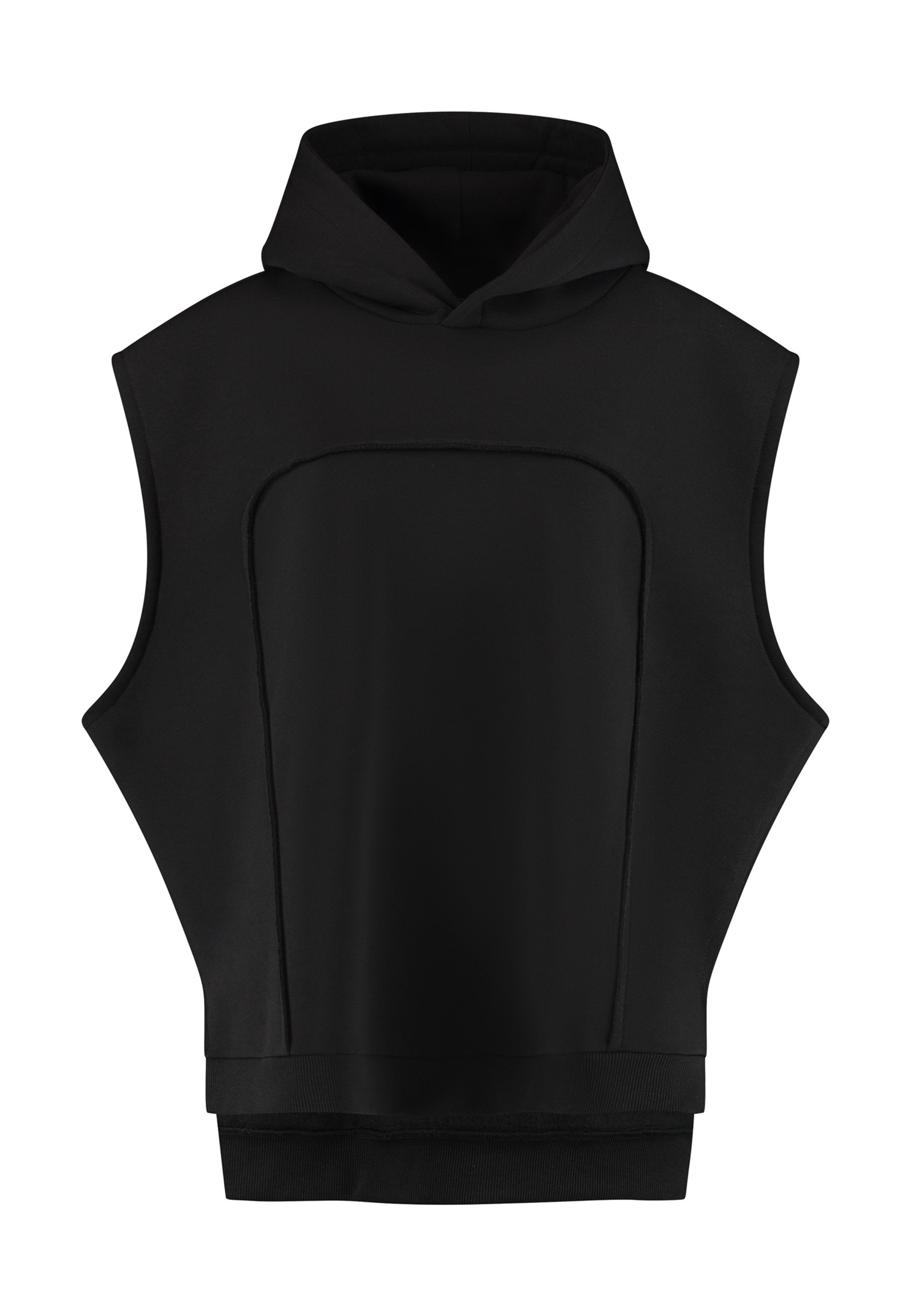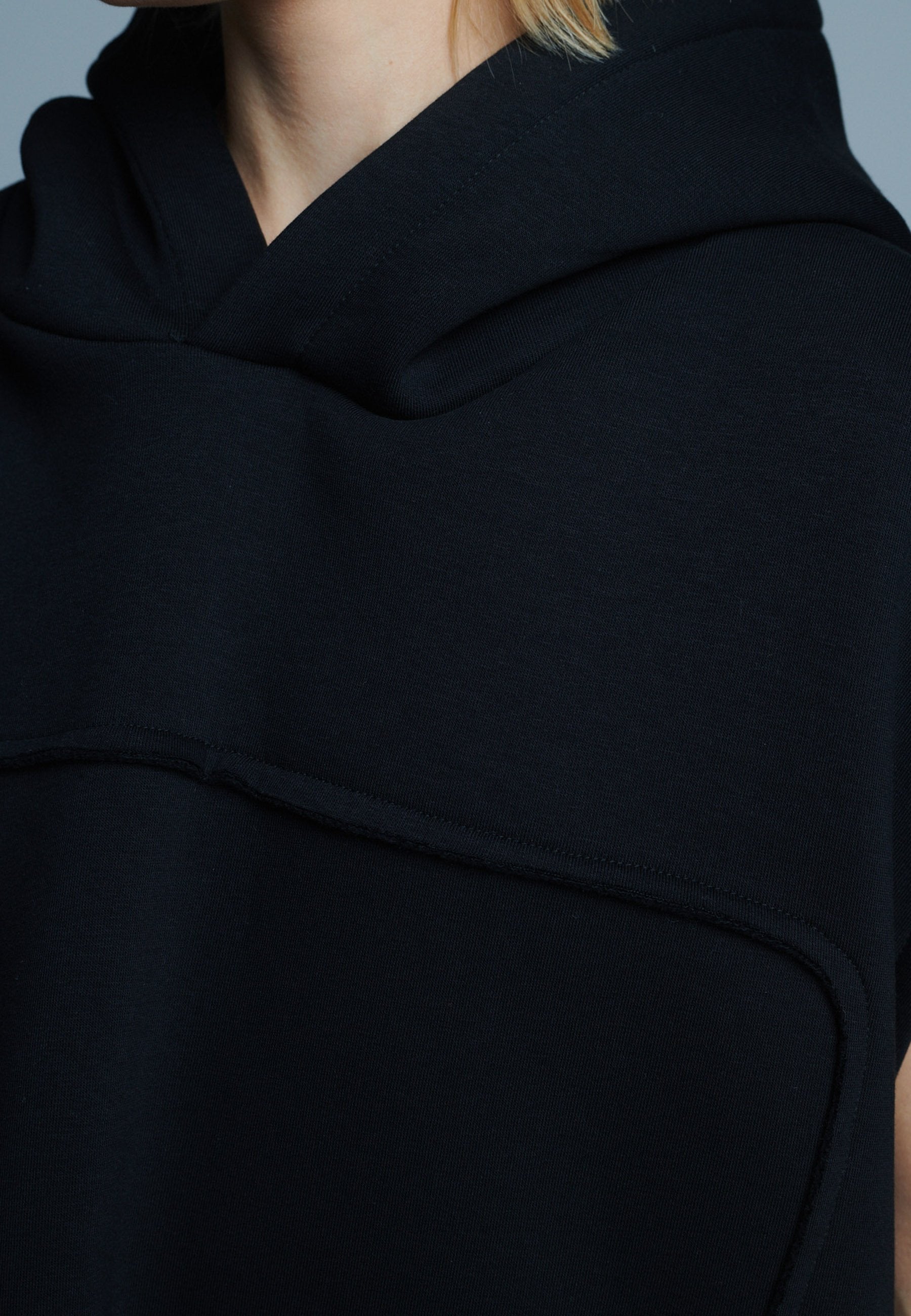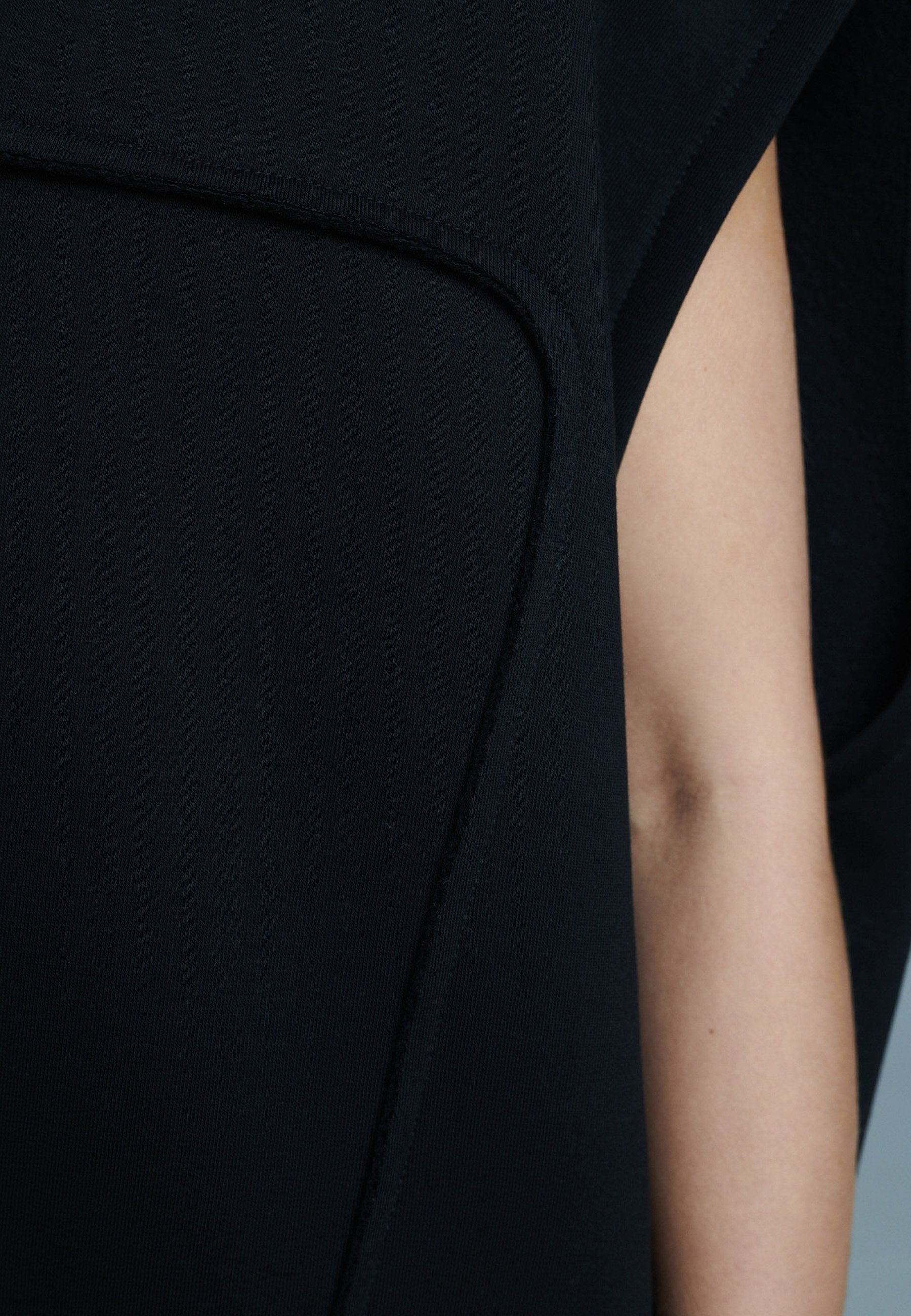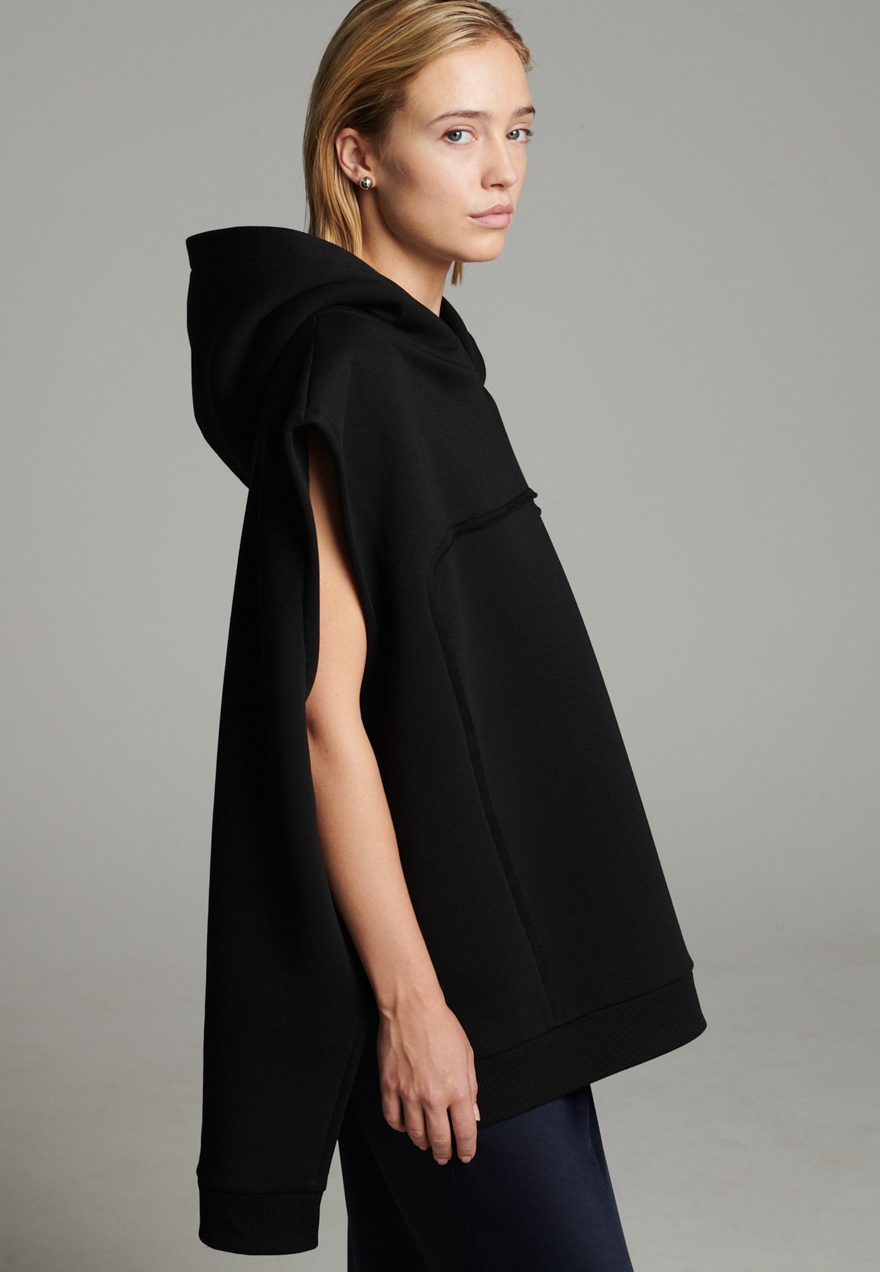 A estrutura suave e a facilidade moderna unem-se nesta camisola com capuz sem mangas. Cortada em jersey preto profundo com um drapeado limpo e escultural, apresenta costuras curvas que adicionam uma dimensão subtil sem perturbar a silhueta minimalista. O capuz espaçoso introduz um toque descontraído e contemporâneo, enquanto as cavas abertas mantêm a forma leve e fluida. Discreta, versátil e refinada na sua simplicidade.