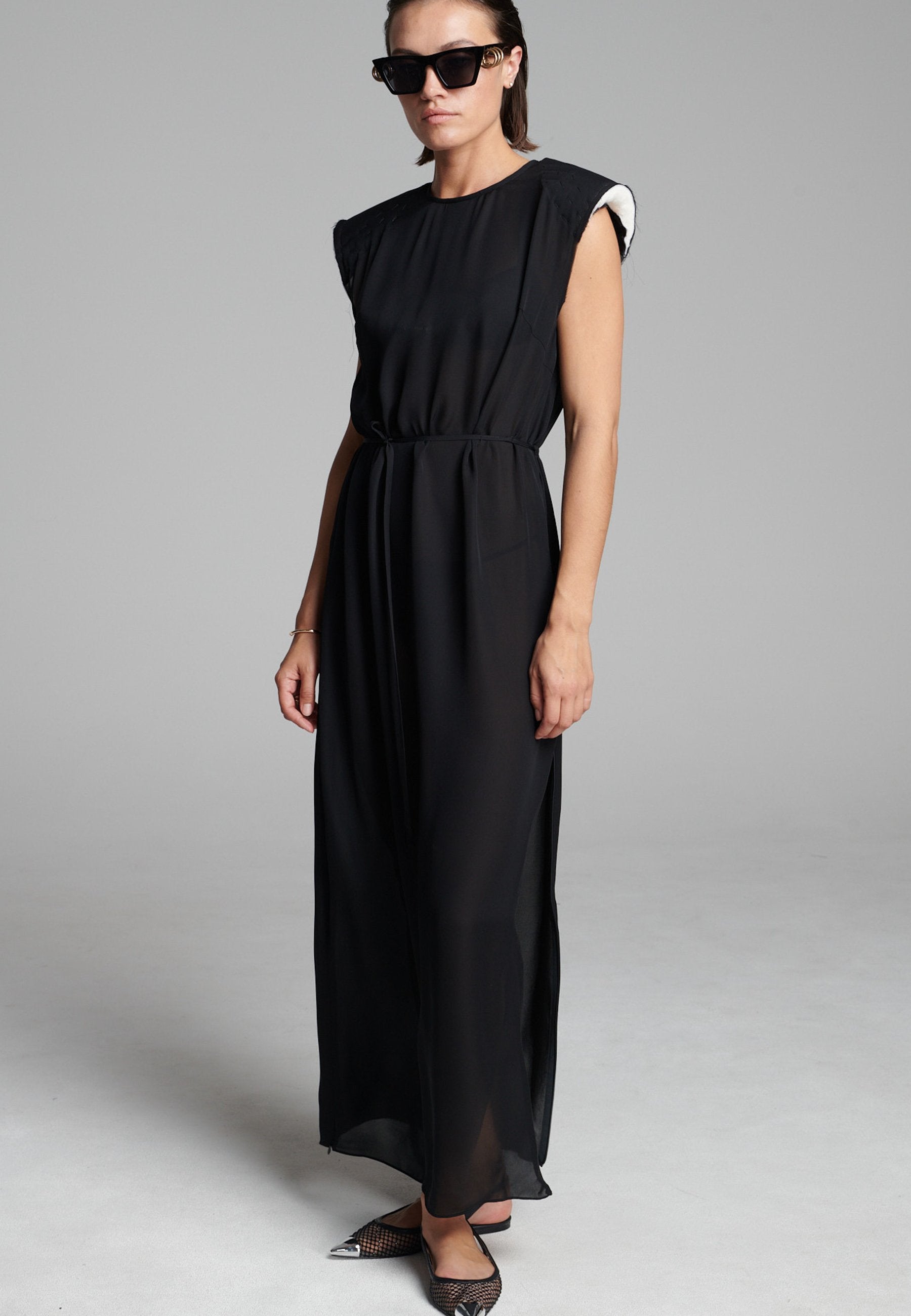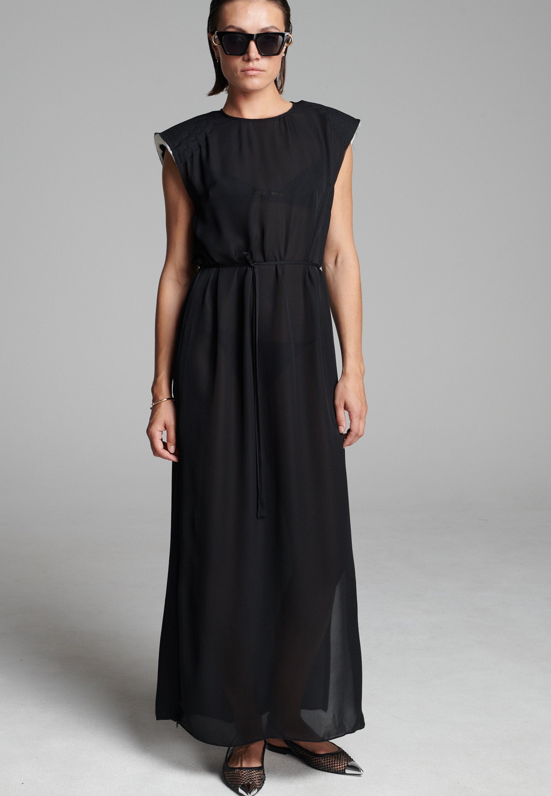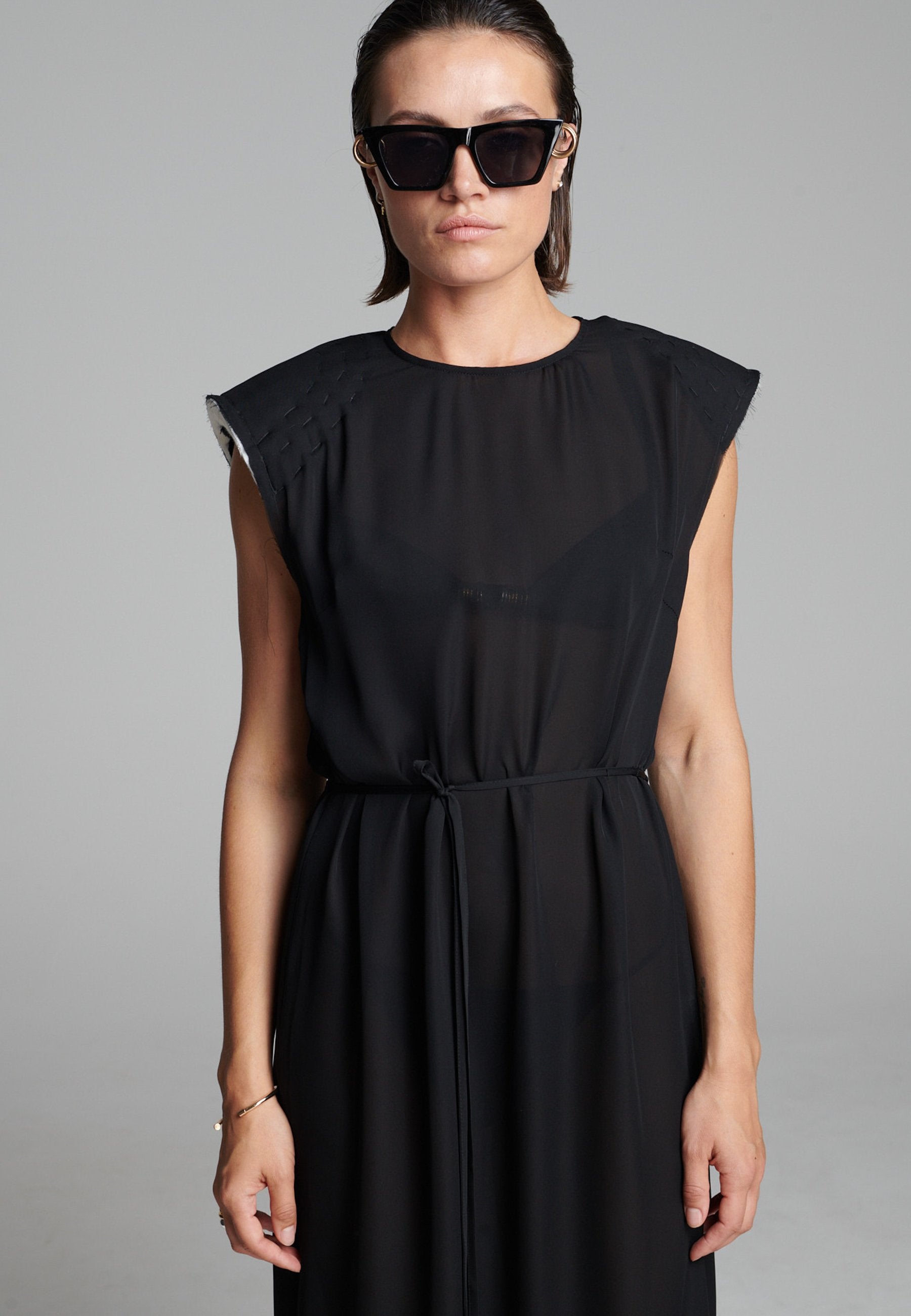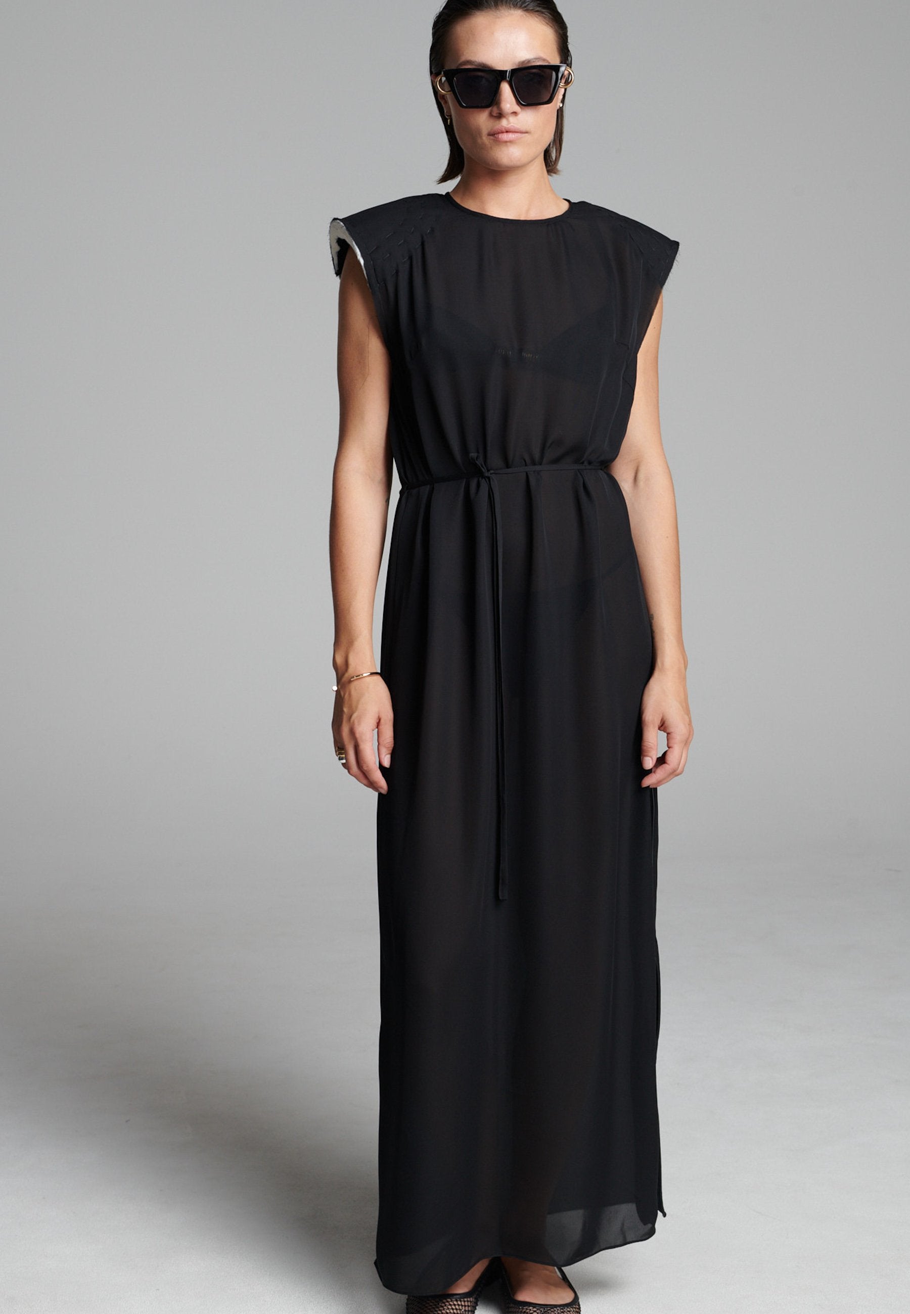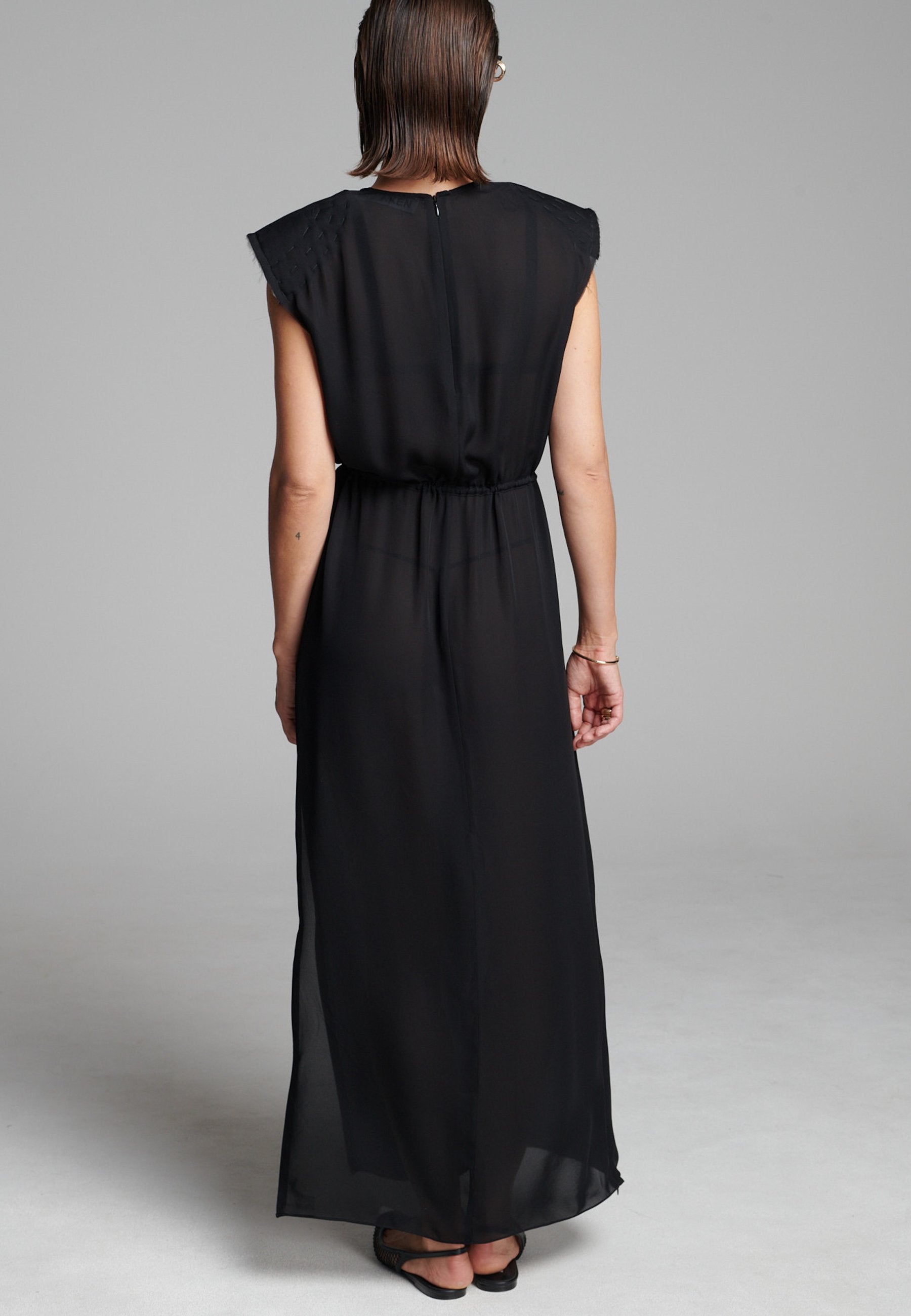 O georgette leve drapeia-se numa linha longa e fluida, com um acabamento suave e semitransparente que se move sem esforço. Os detalhes dos ombros costurados à mão acrescentam textura, enquanto a bainha interior crua confere um toque subtil e desconstruído. Um laço fino define suavemente a cintura sem quebrar a simplicidade da silhueta.