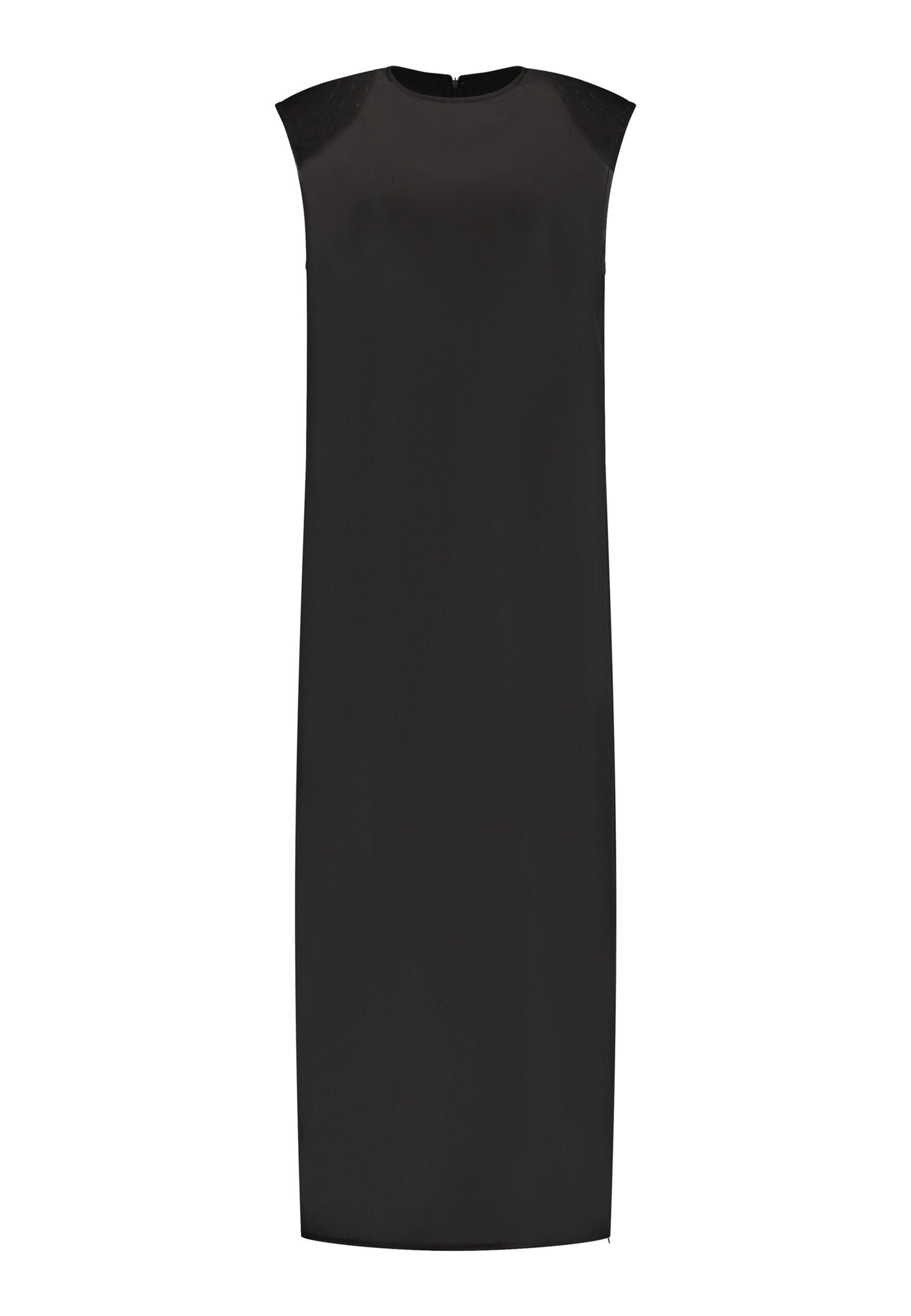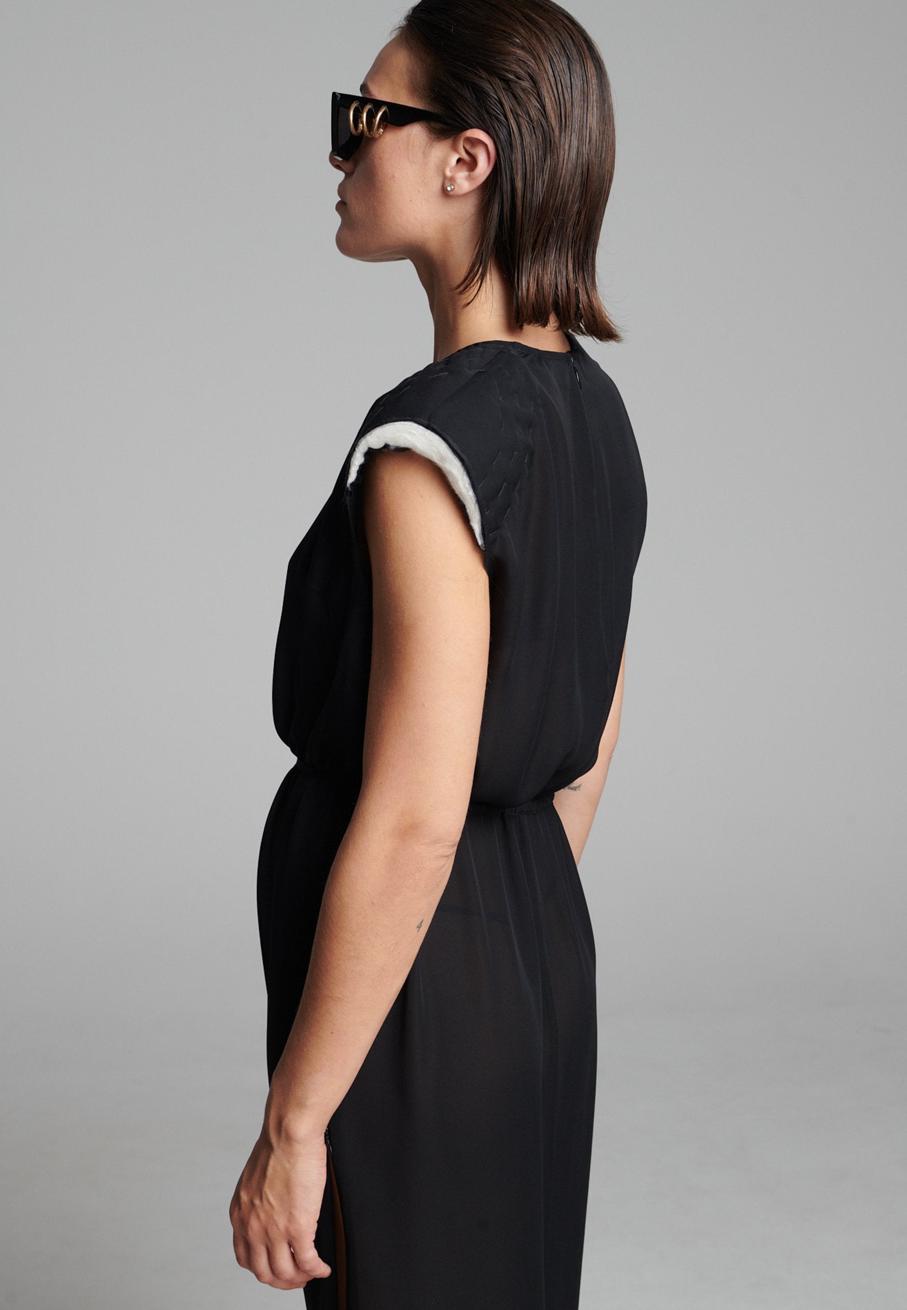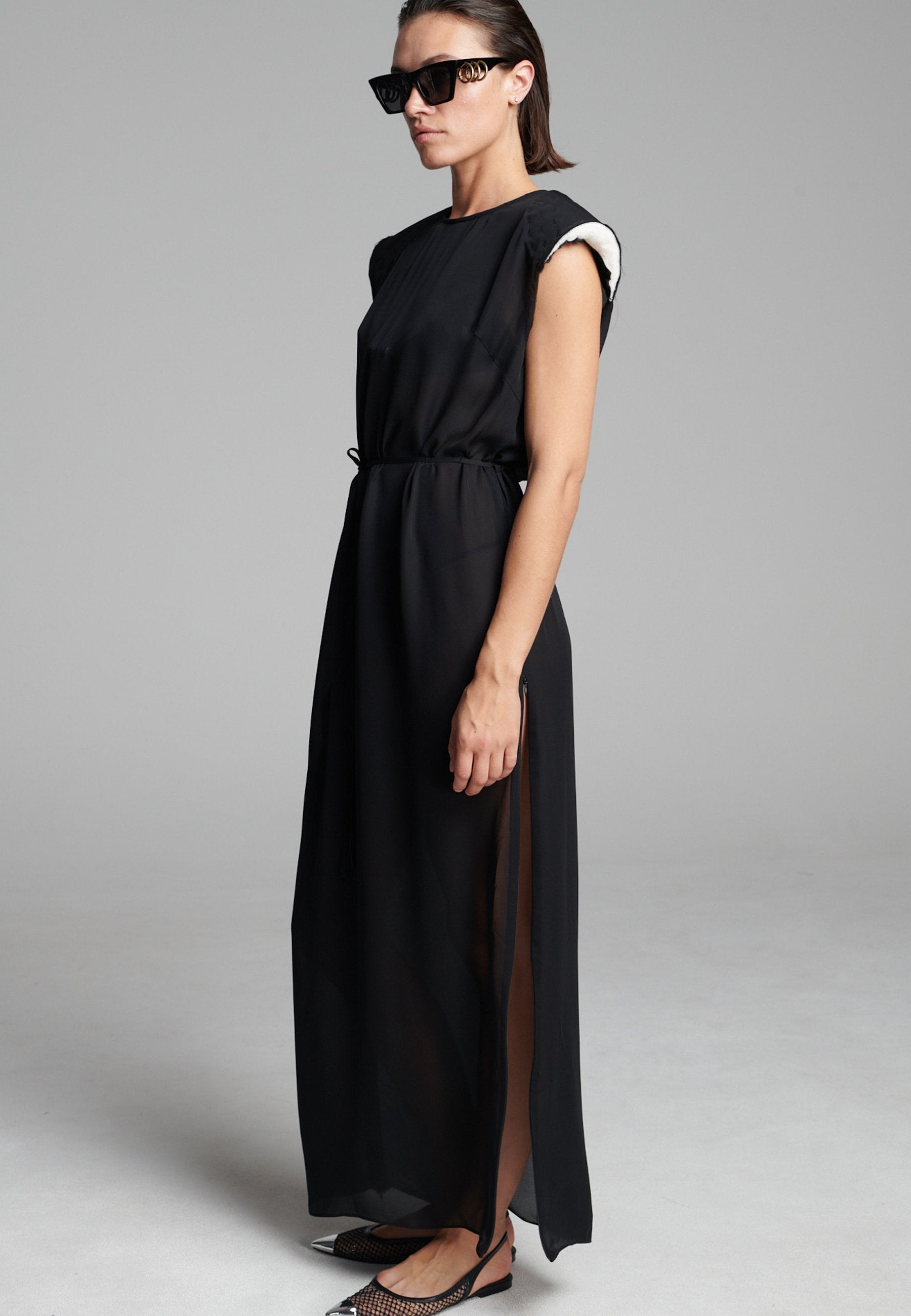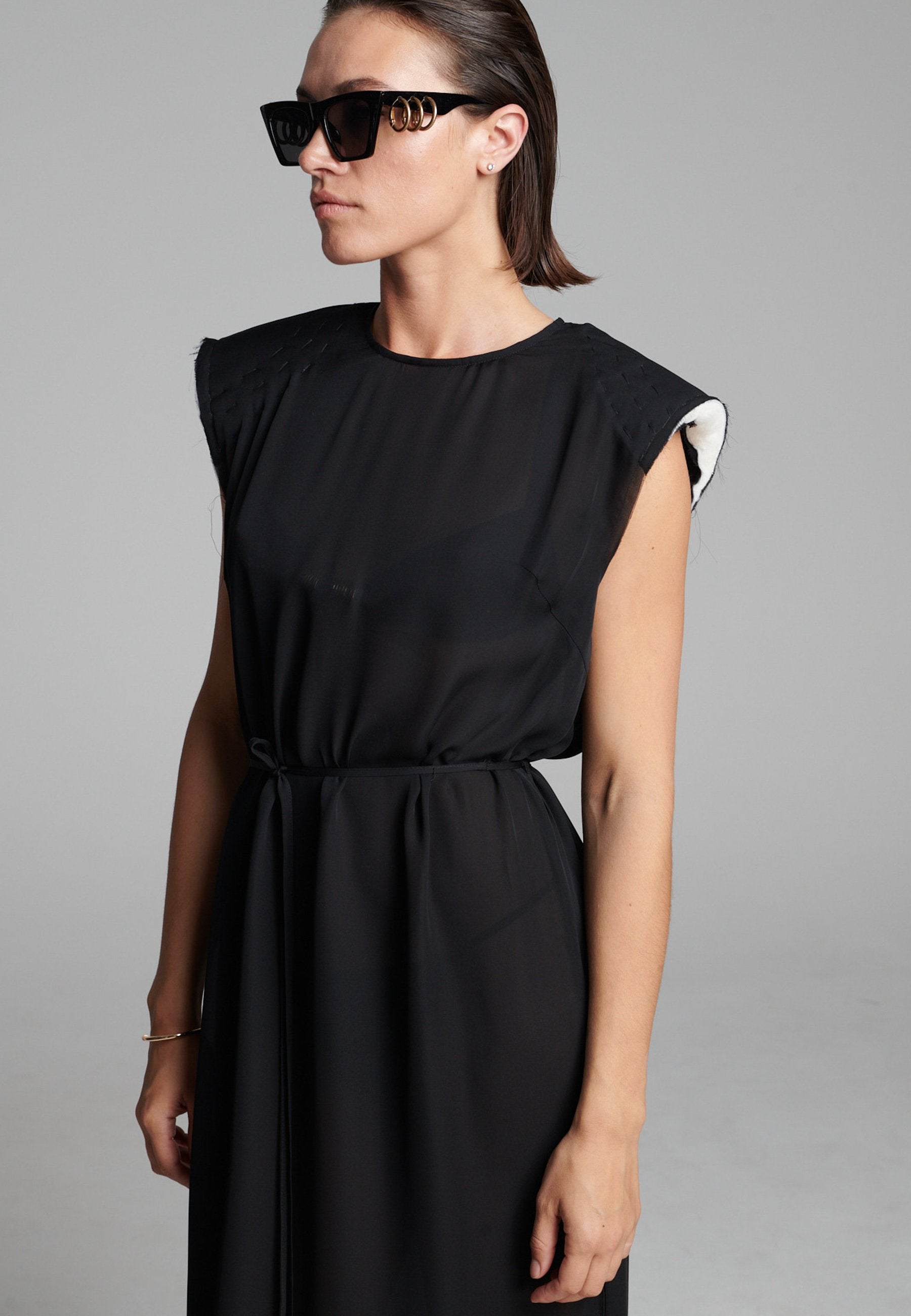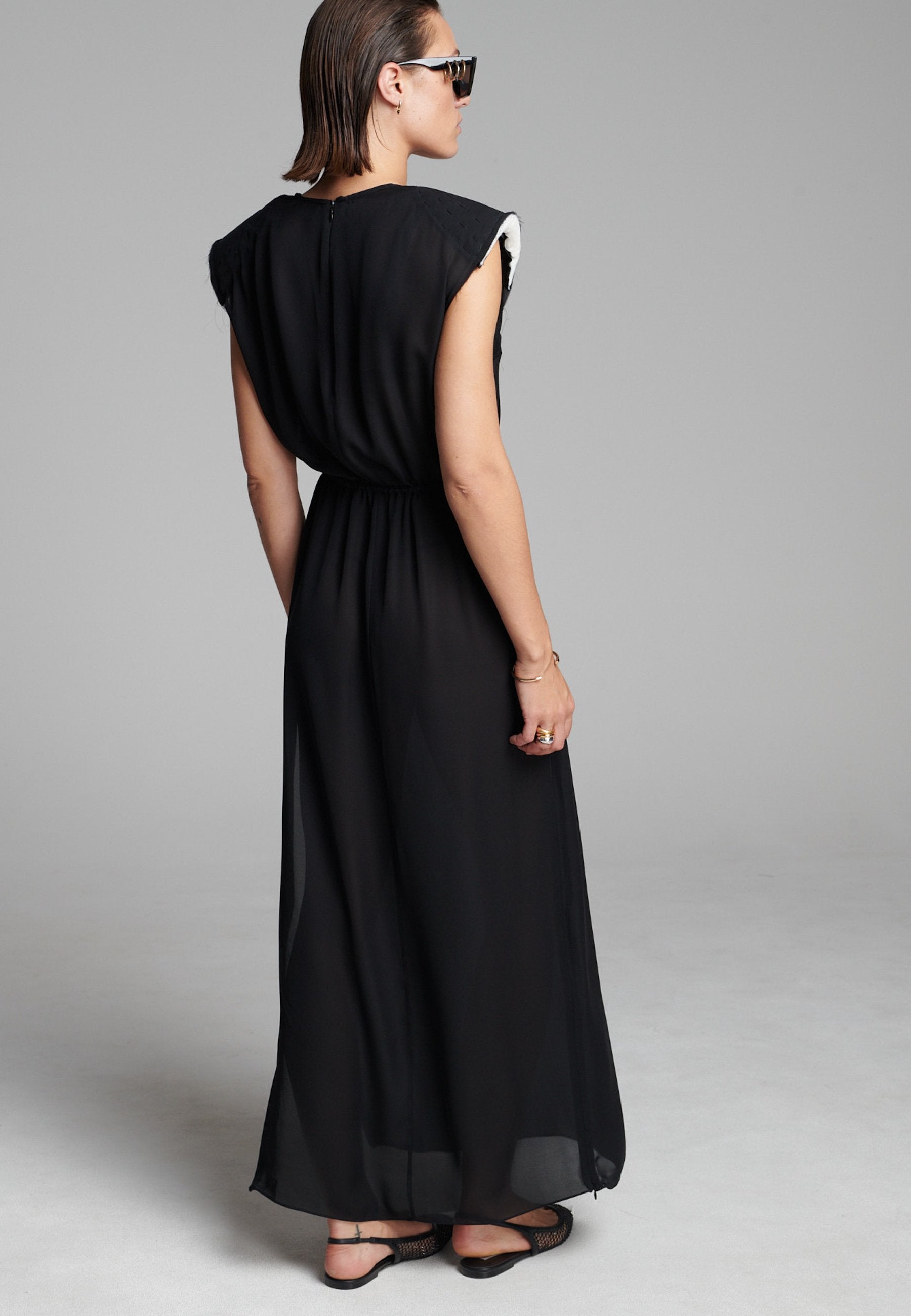 O georgette leve drapeia-se numa linha longa e fluida, com um acabamento suave e semitransparente que se move sem esforço. Os detalhes dos ombros costurados à mão acrescentam textura, enquanto a bainha interior crua confere um toque subtil e desconstruído. Um laço fino define suavemente a cintura sem quebrar a simplicidade da silhueta.