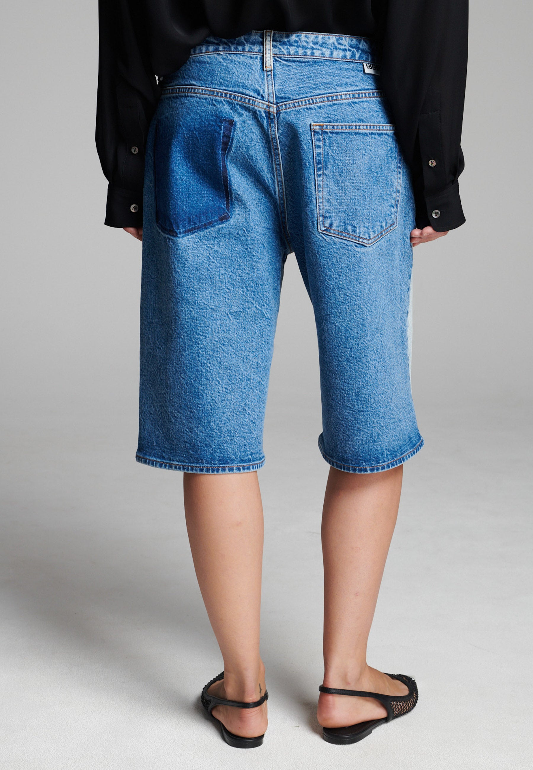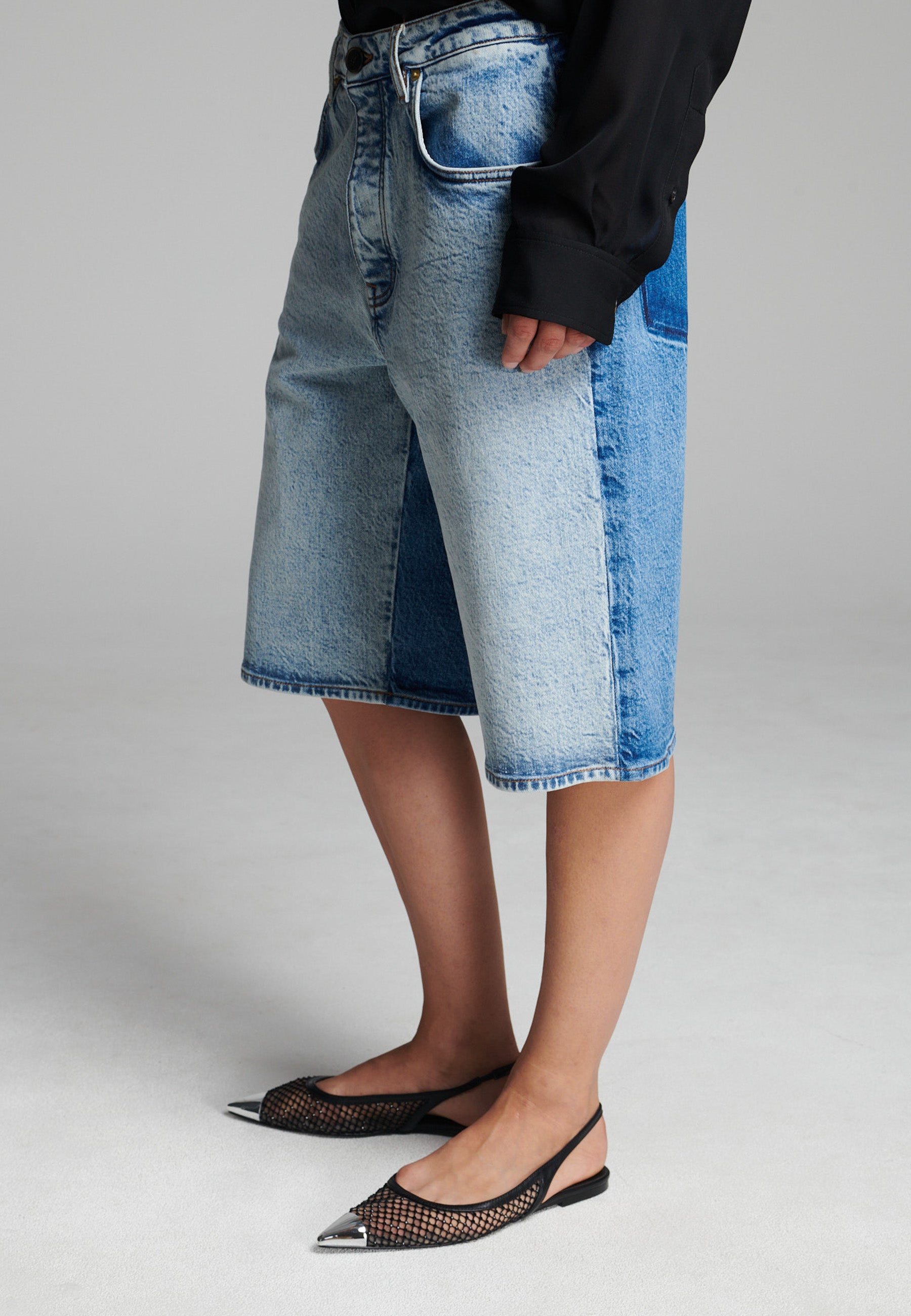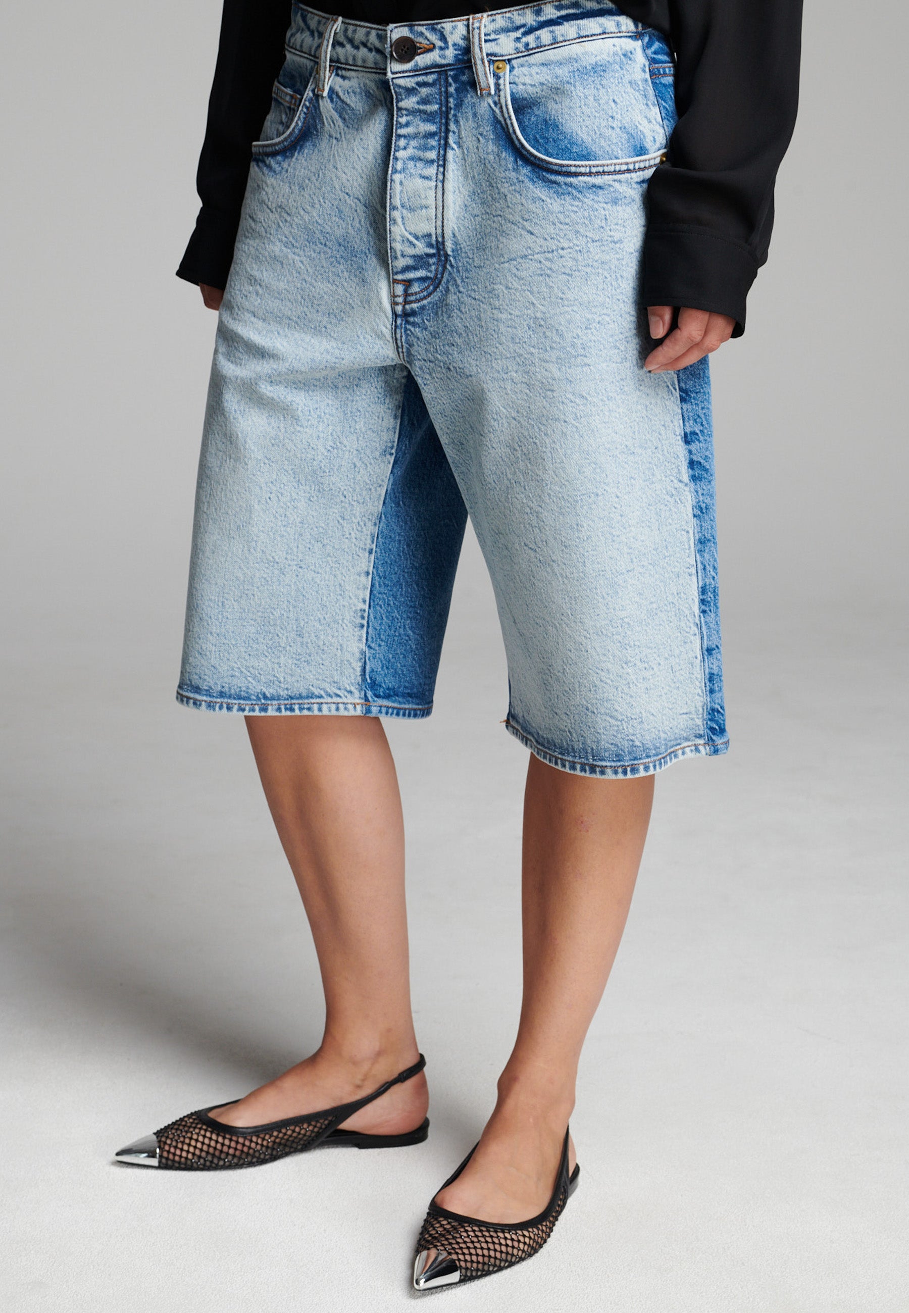 Calções de ganga bicolores com um contraste ousado que realça a sua construção em painéis. Com um corte descontraído, comprimento até ao joelho, detalhes clássicos de cinco bolsos e um toque escultural e estruturado. Uma abordagem moderna à ganga vintage que adiciona dimensão a qualquer visual casual.