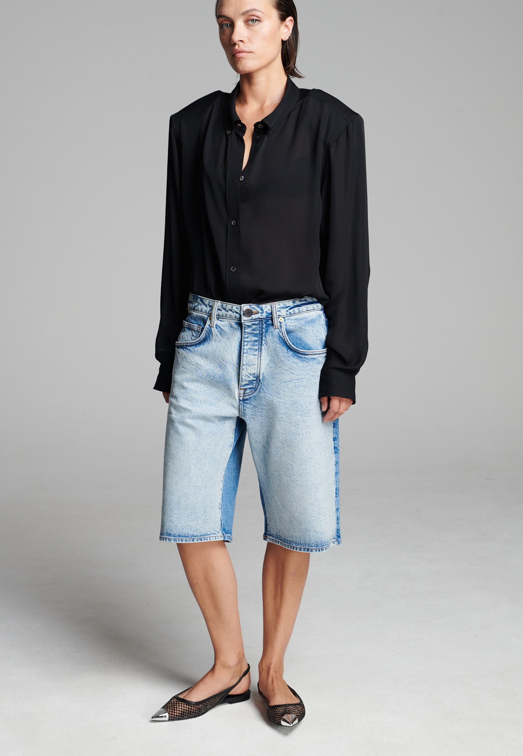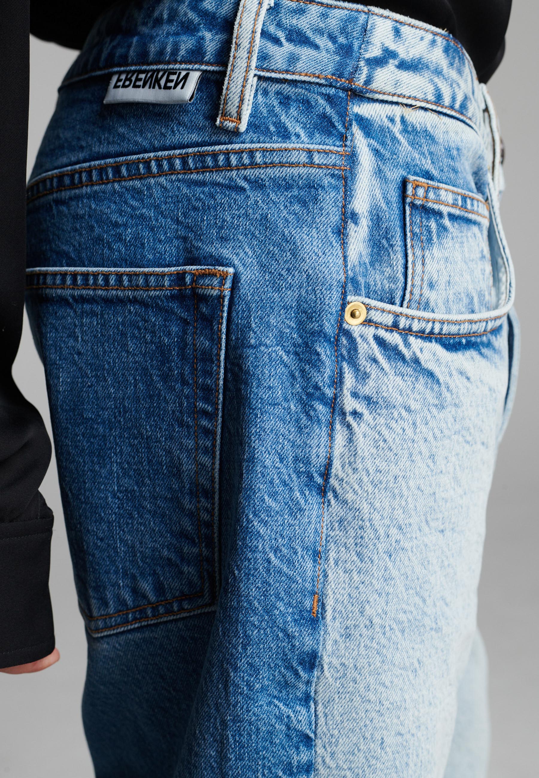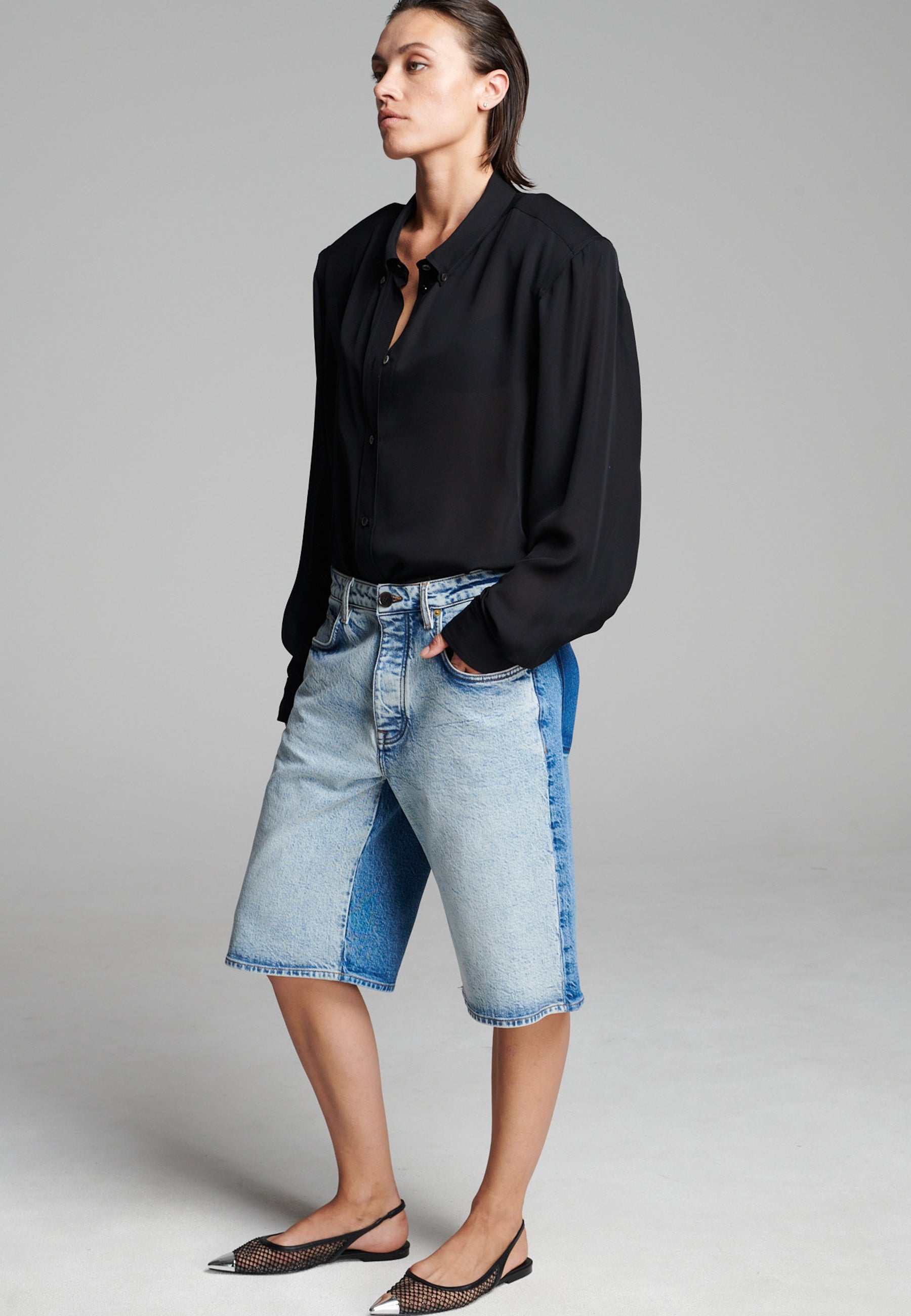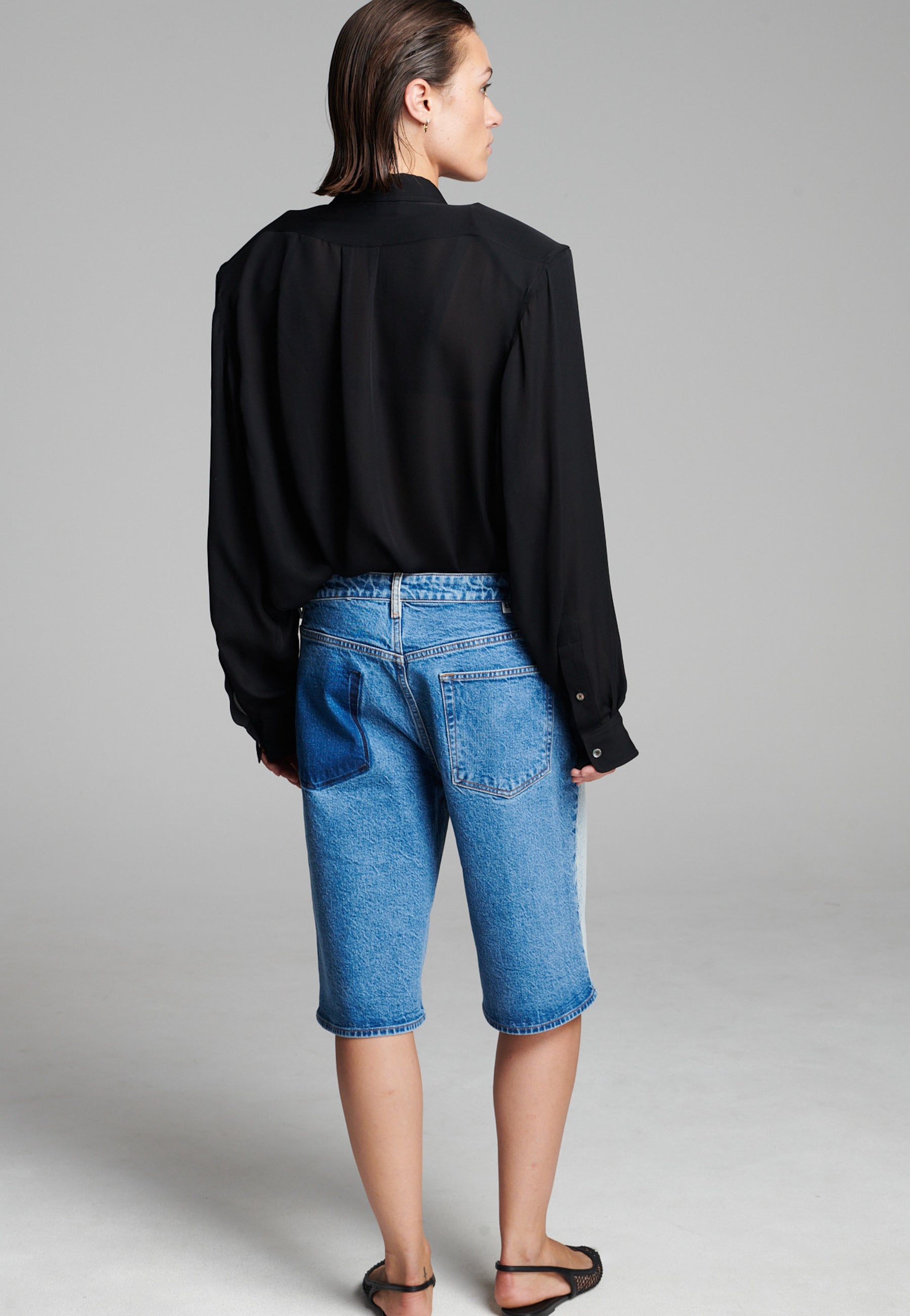 Calções de ganga bicolores com um contraste ousado que realça a sua construção em painéis. Com um corte descontraído, comprimento até ao joelho, detalhes clássicos de cinco bolsos e um toque escultural e estruturado. Uma abordagem moderna à ganga vintage que adiciona dimensão a qualquer visual casual.