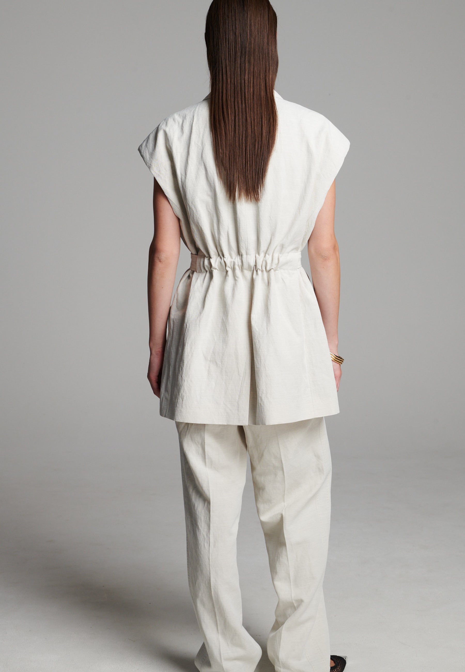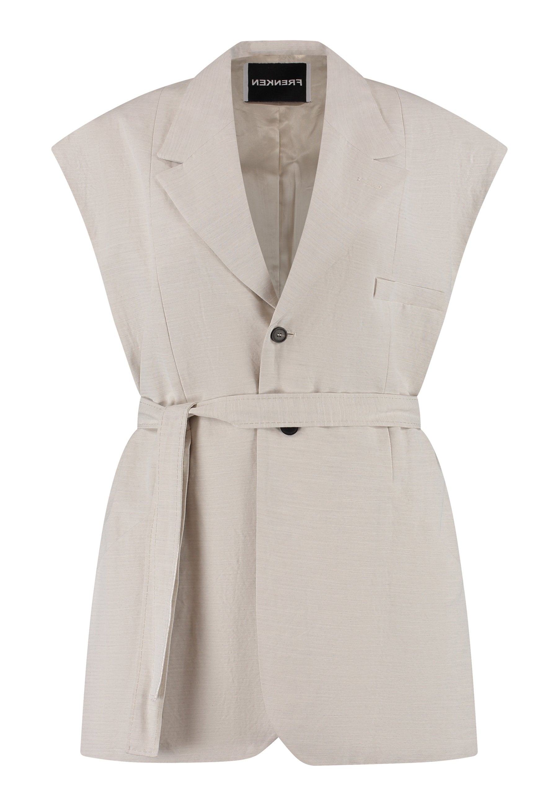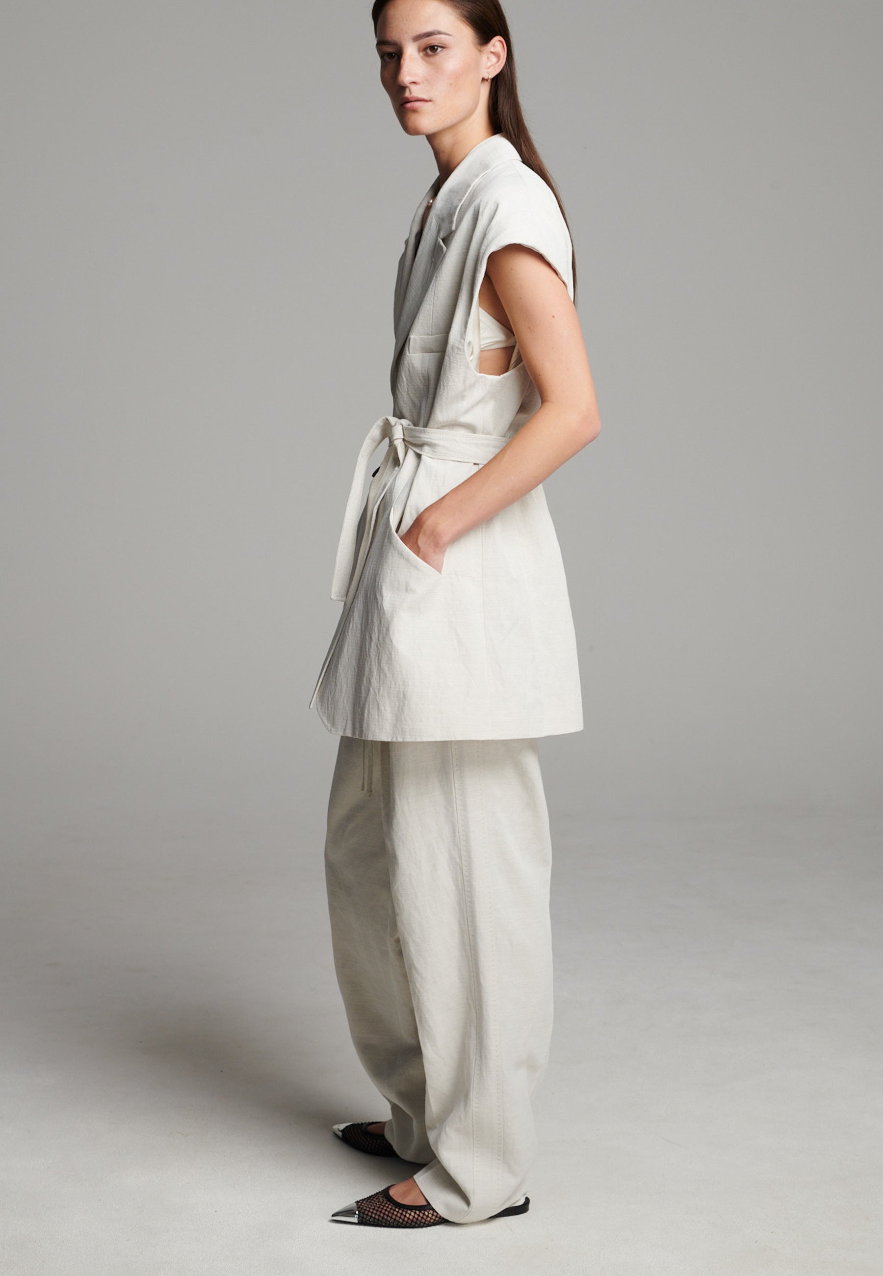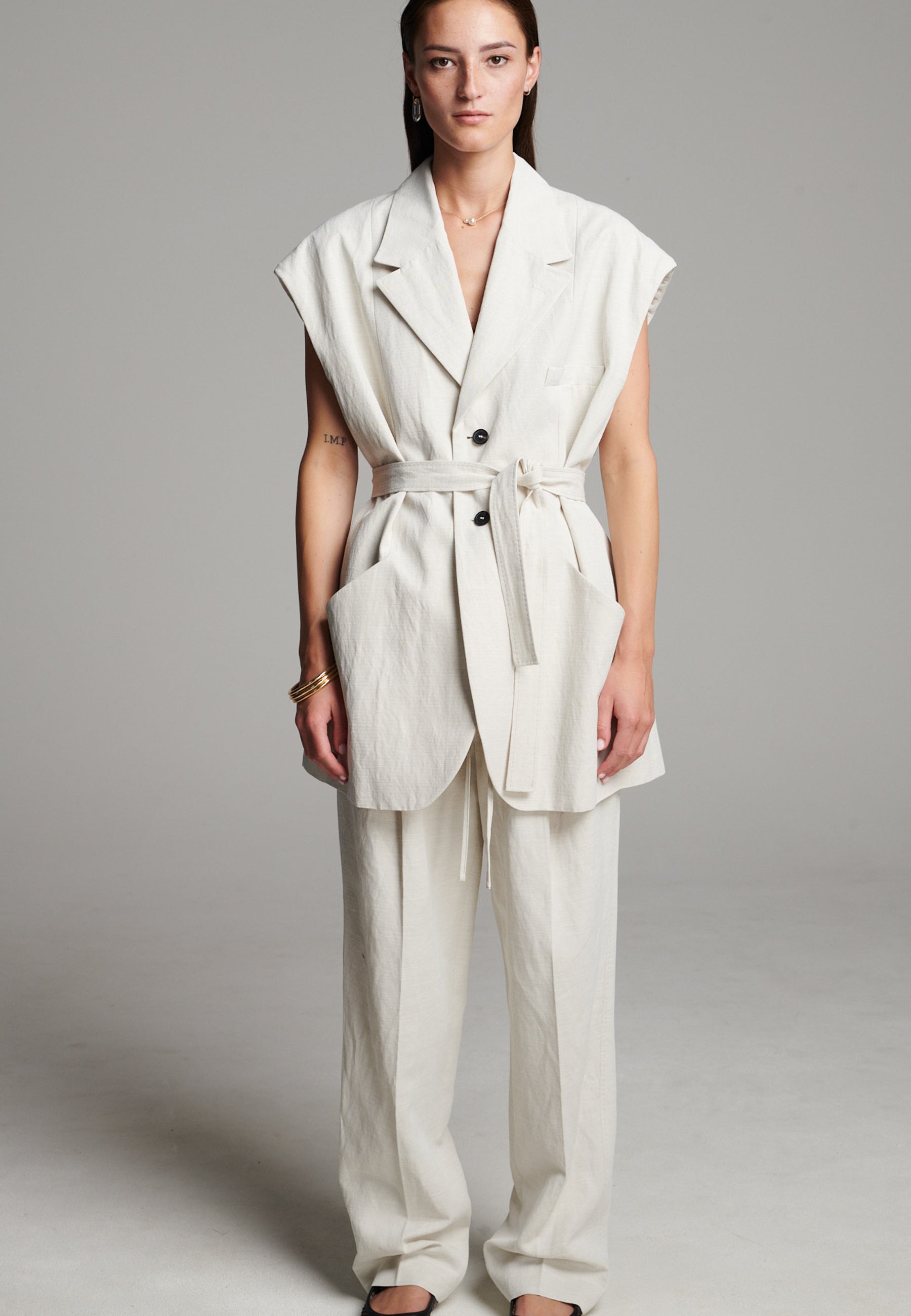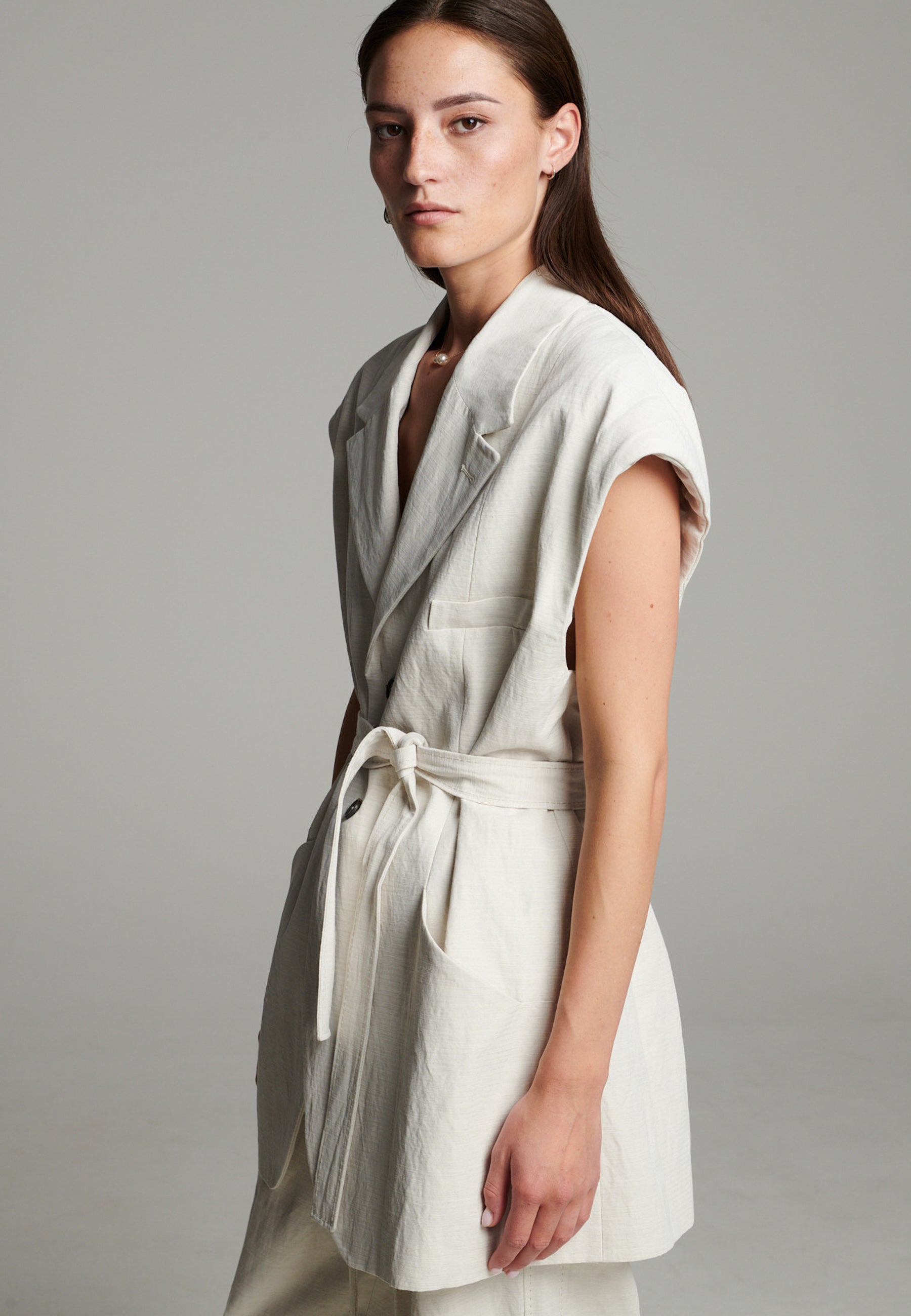 Blazer marfim nítido reimaginado num corte comprido e sem mangas, com uma silhueta descontraída mas definida. Apresenta lapela entalhada oversize, bolsos de chapa profundos e um cinto de atar macio que aperta a cintura para uma estrutura subtil. Acabamento com linhas limpas e um toque ligeiramente texturado para um look moderno e descontraído.