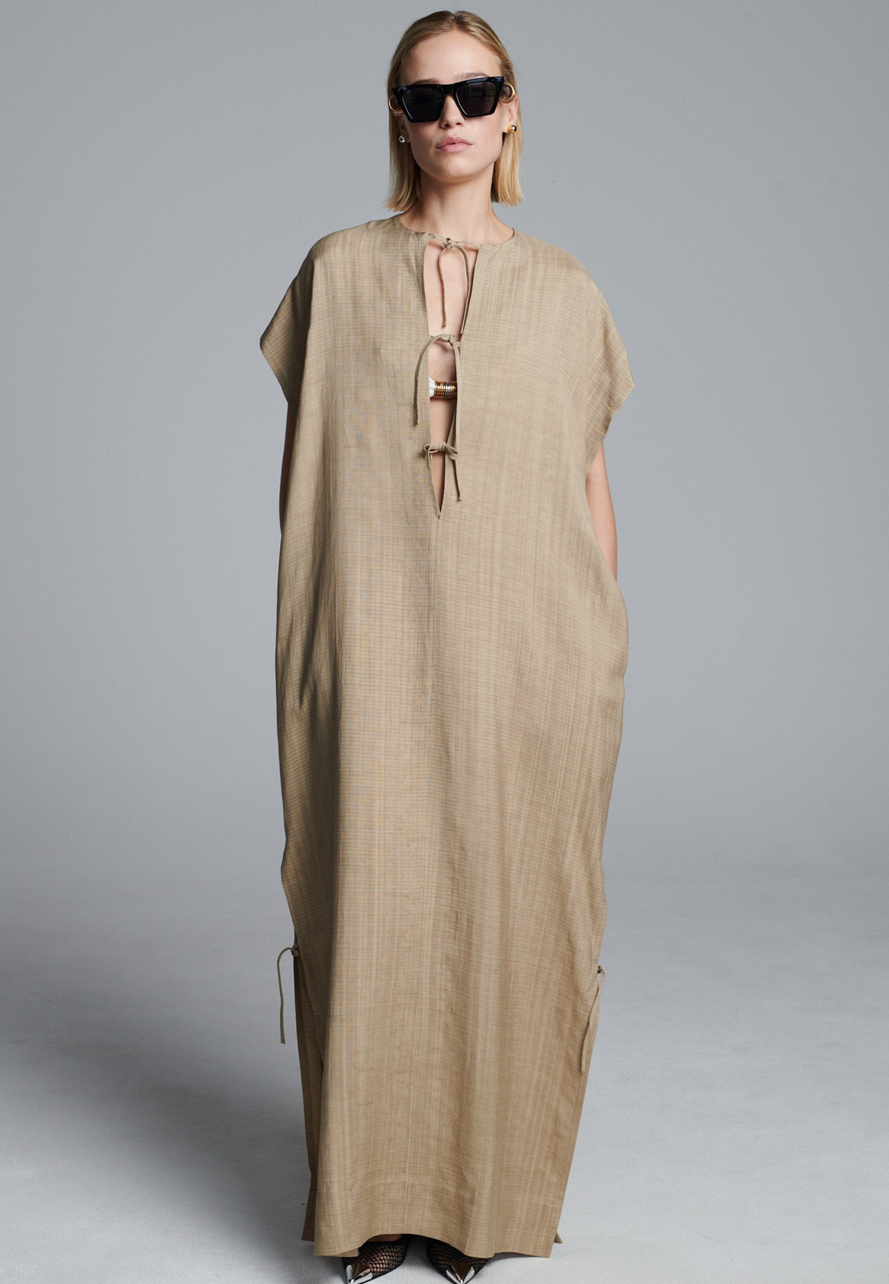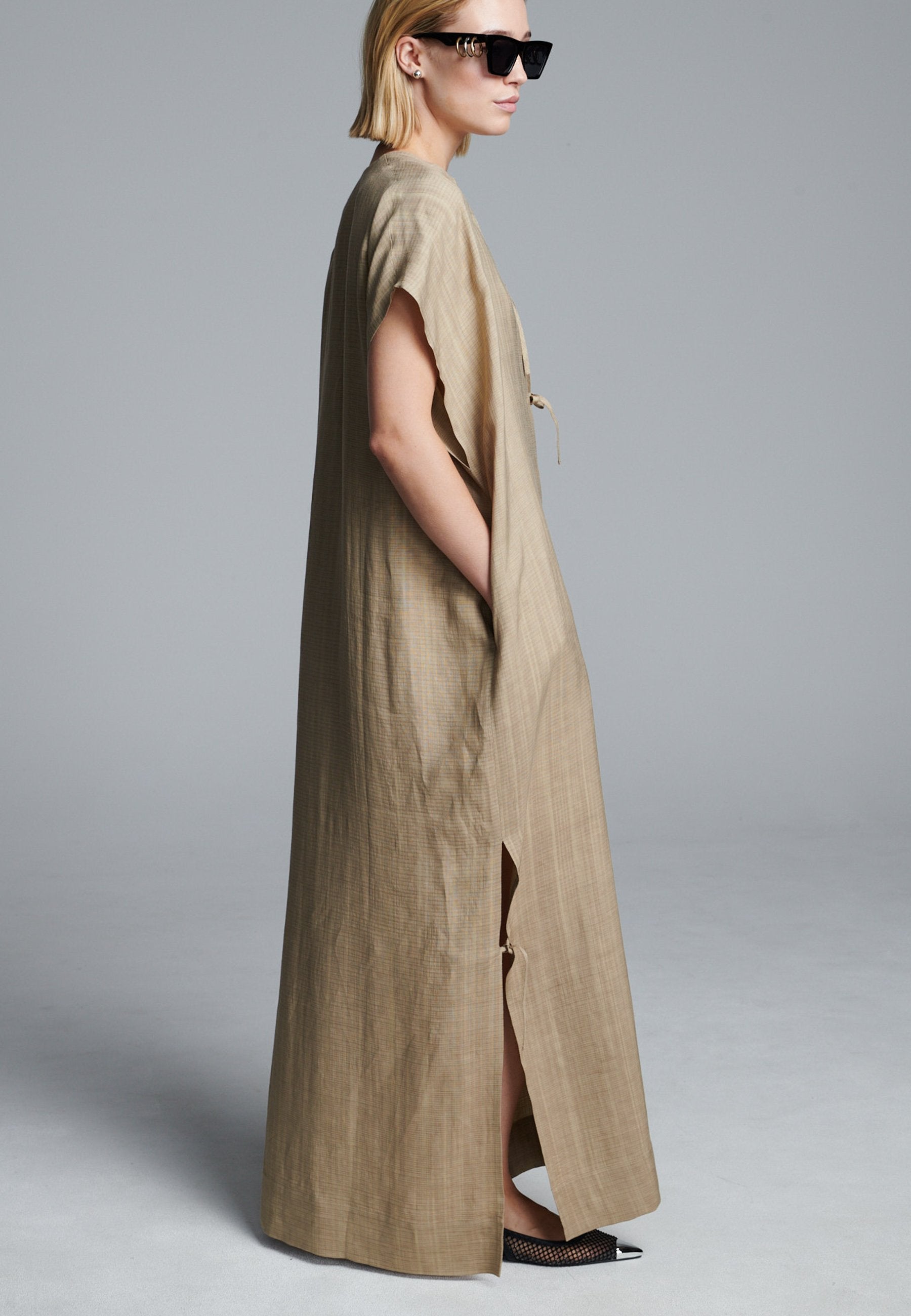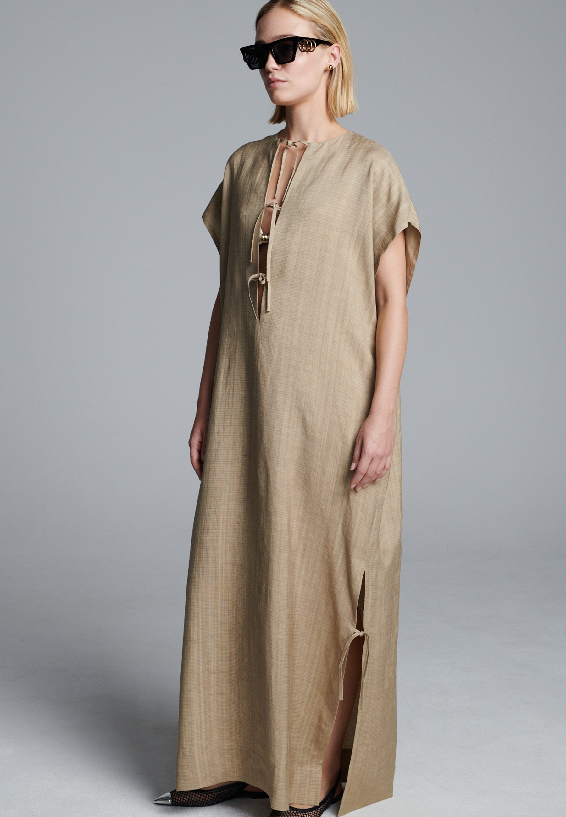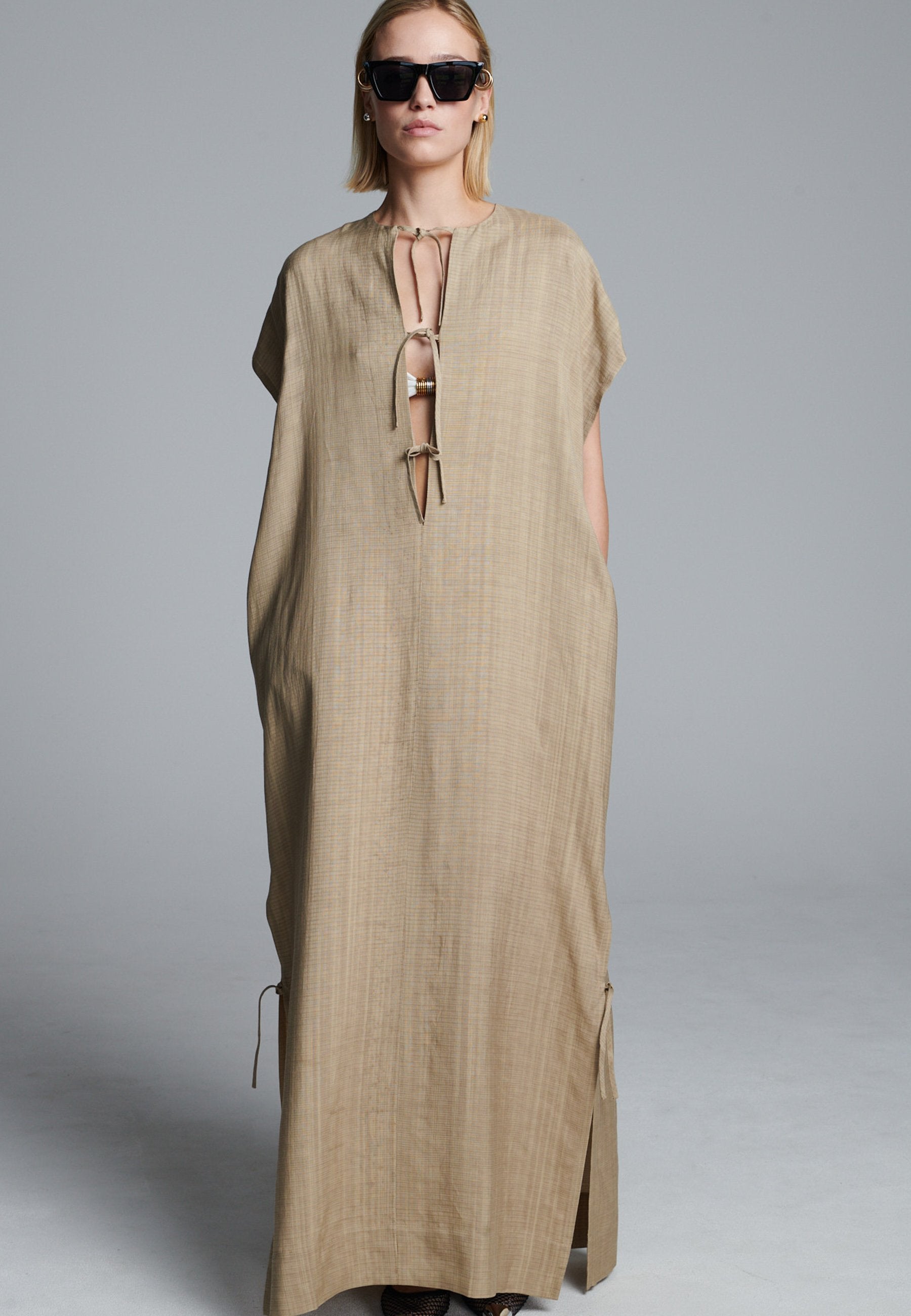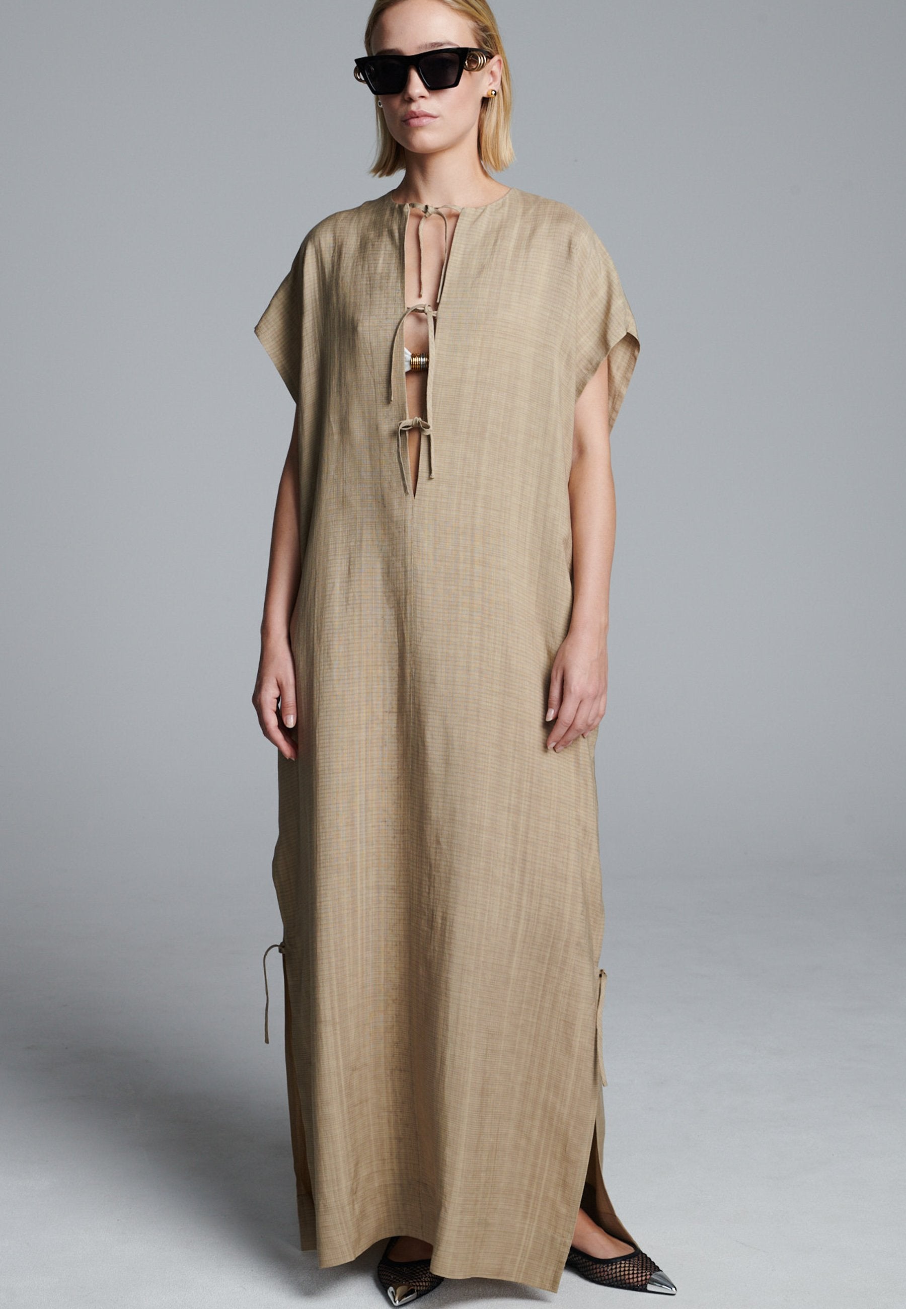 Vestido esvoaçante em ecru escuro com silhueta minimalista, apresentando uma abertura frontal profunda com laço e mangas curtas descontraídas. As fendas laterais com laços sutis adicionam movimento e um toque de estrutura, enquanto as linhas longas e limpas mantêm o visual fácil e refinado. Uma peça versátil que transita facilmente entre o conforto casual e a elegância discreta.