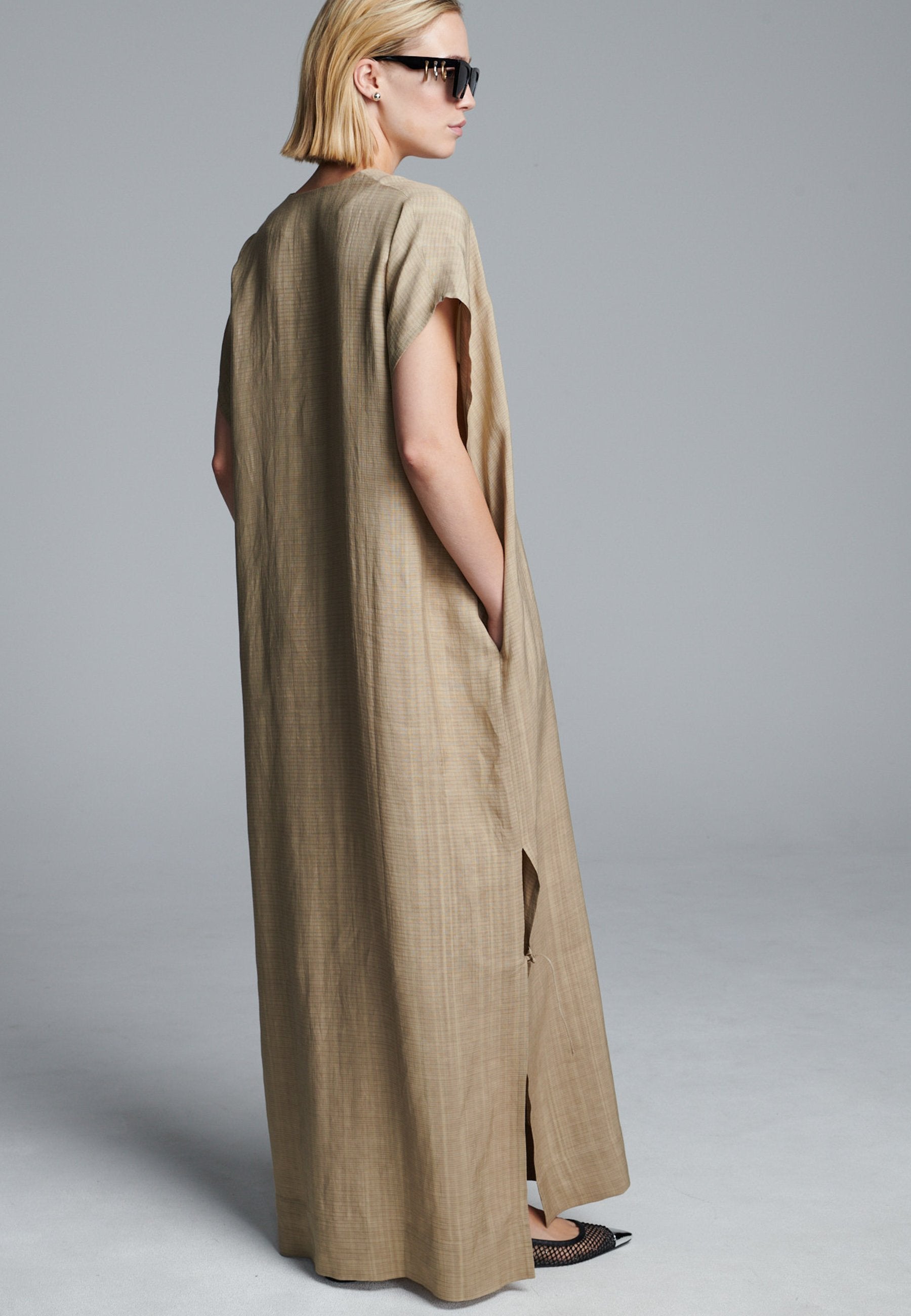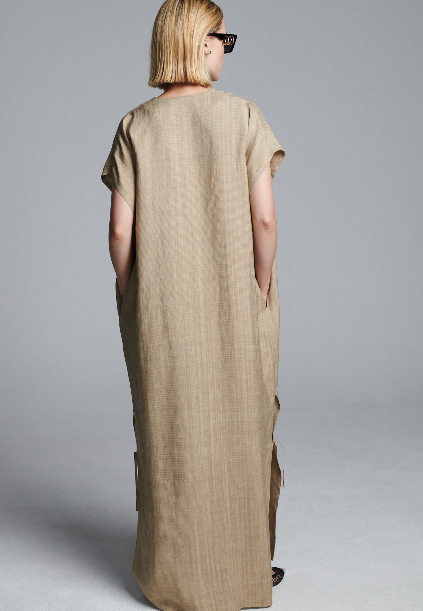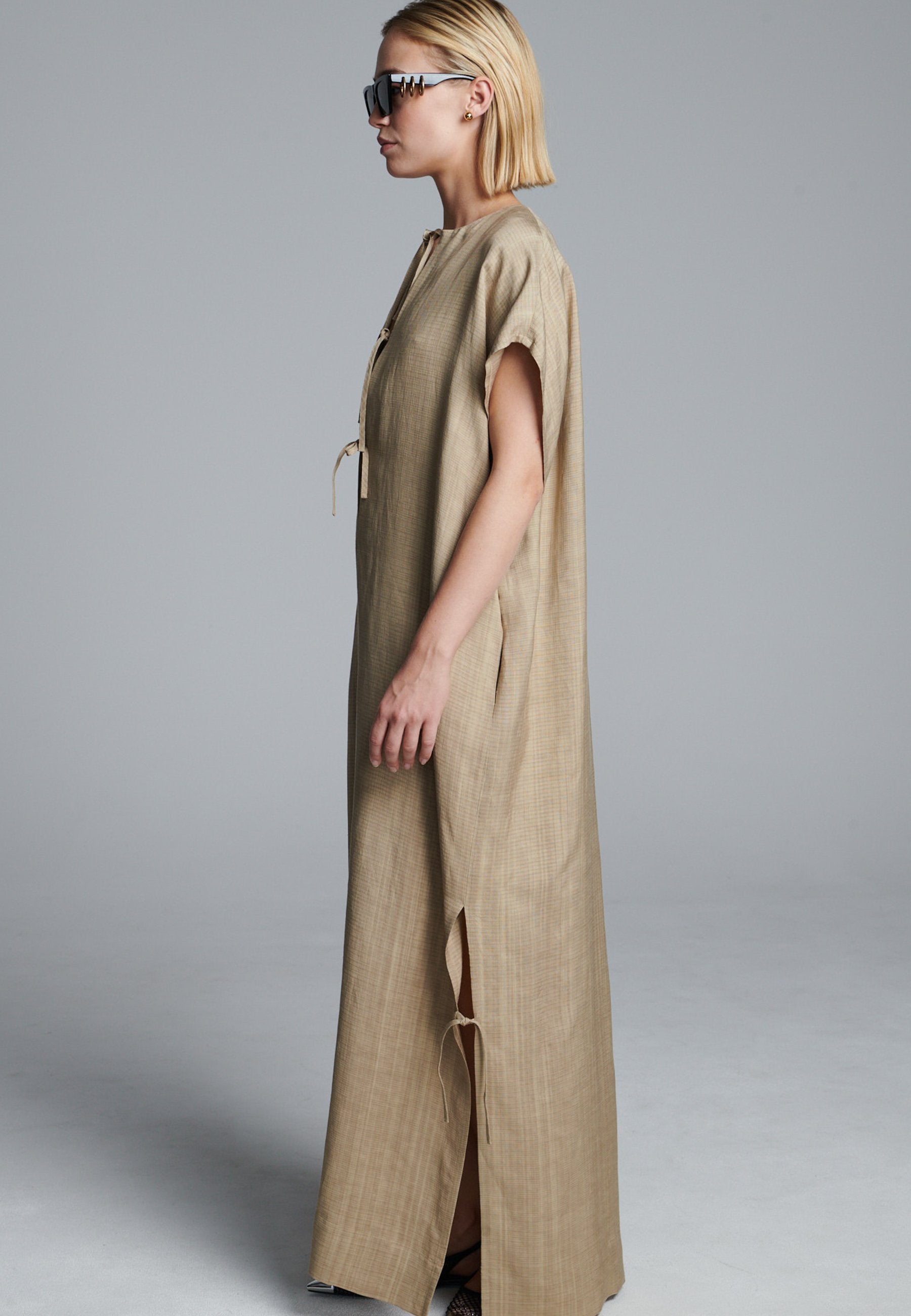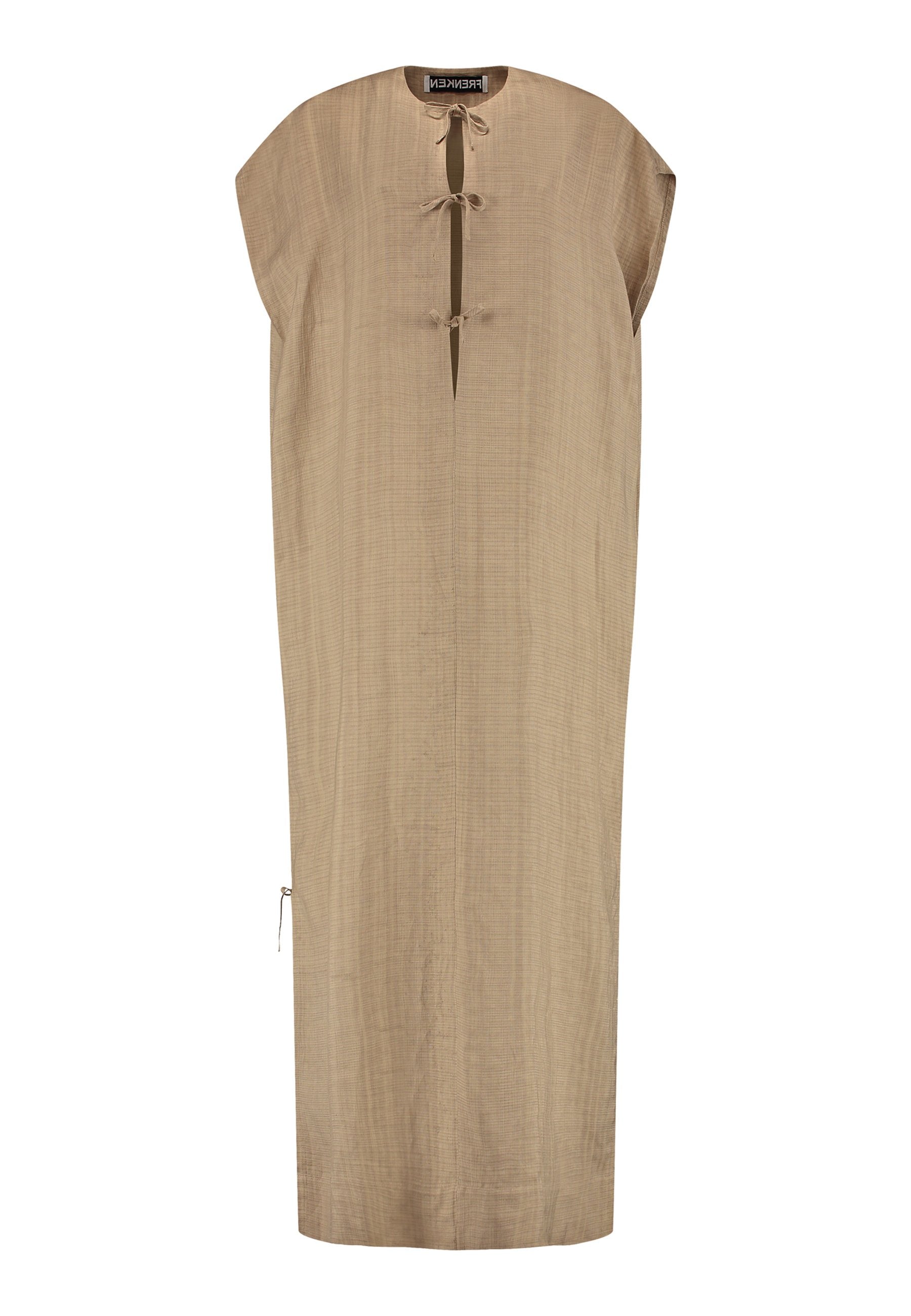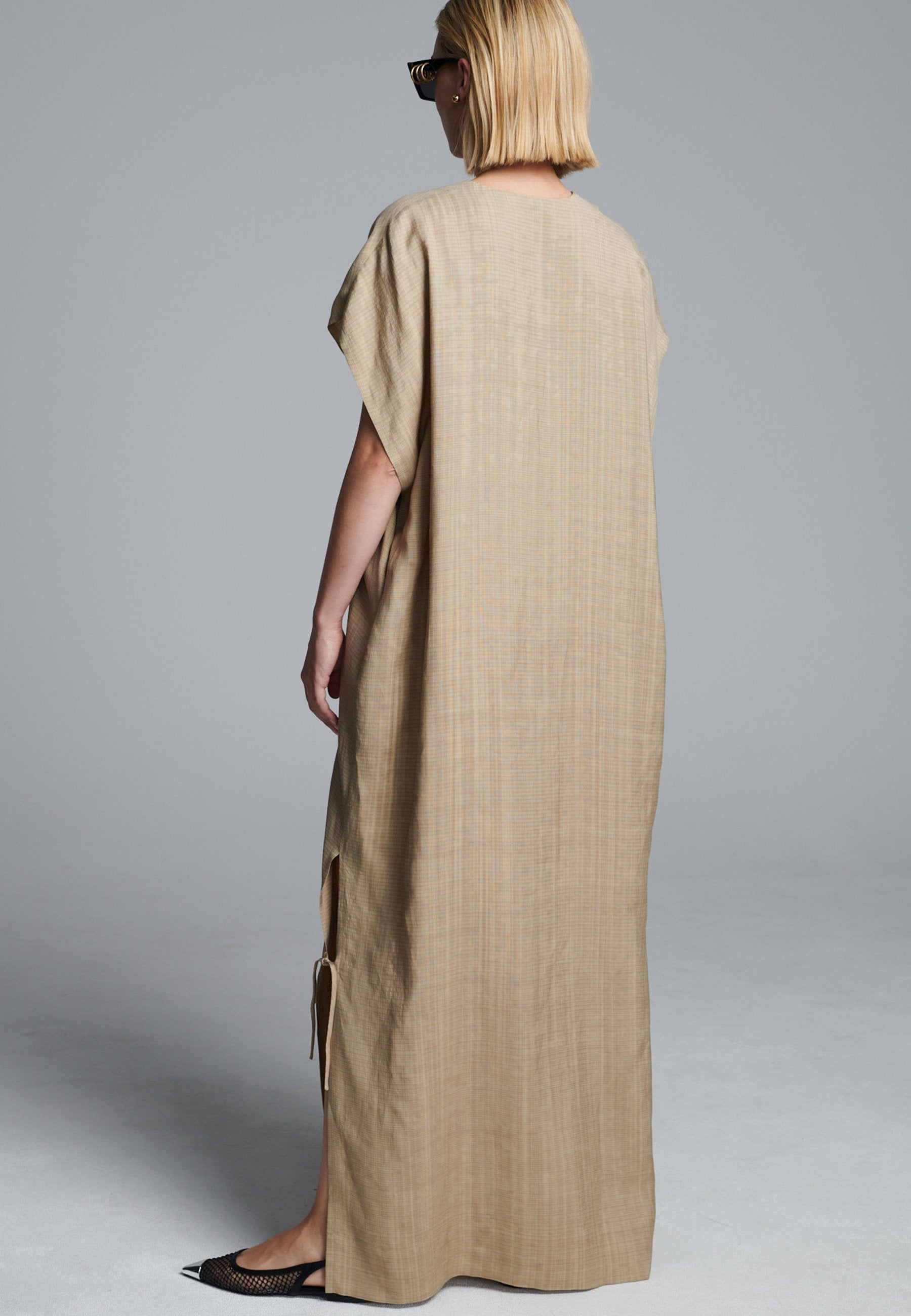 Vestido esvoaçante em ecru escuro com silhueta minimalista, apresentando uma abertura frontal profunda com laço e mangas curtas descontraídas. As fendas laterais com laços sutis adicionam movimento e um toque de estrutura, enquanto as linhas longas e limpas mantêm o visual fácil e refinado. Uma peça versátil que transita facilmente entre o conforto casual e a elegância discreta.